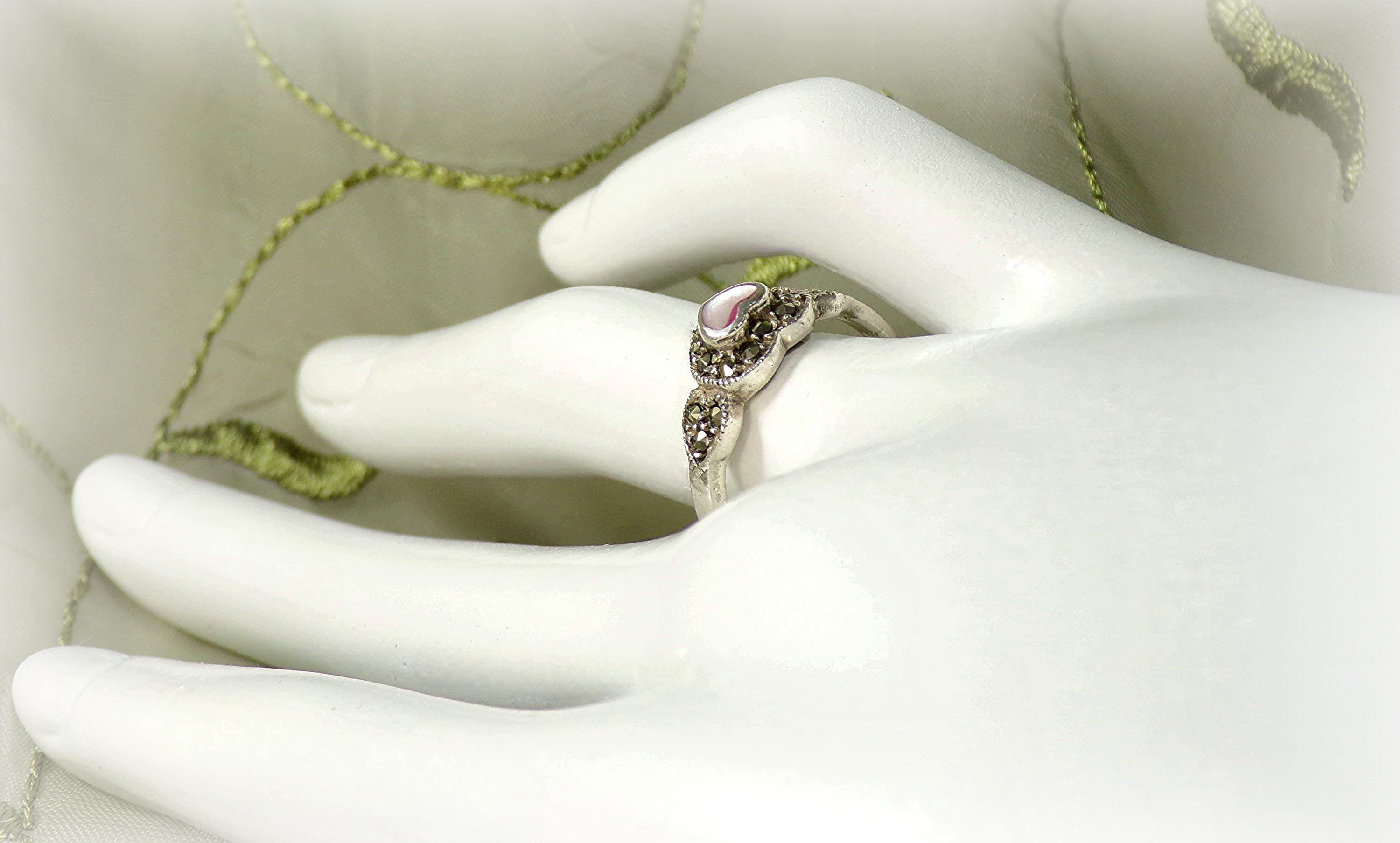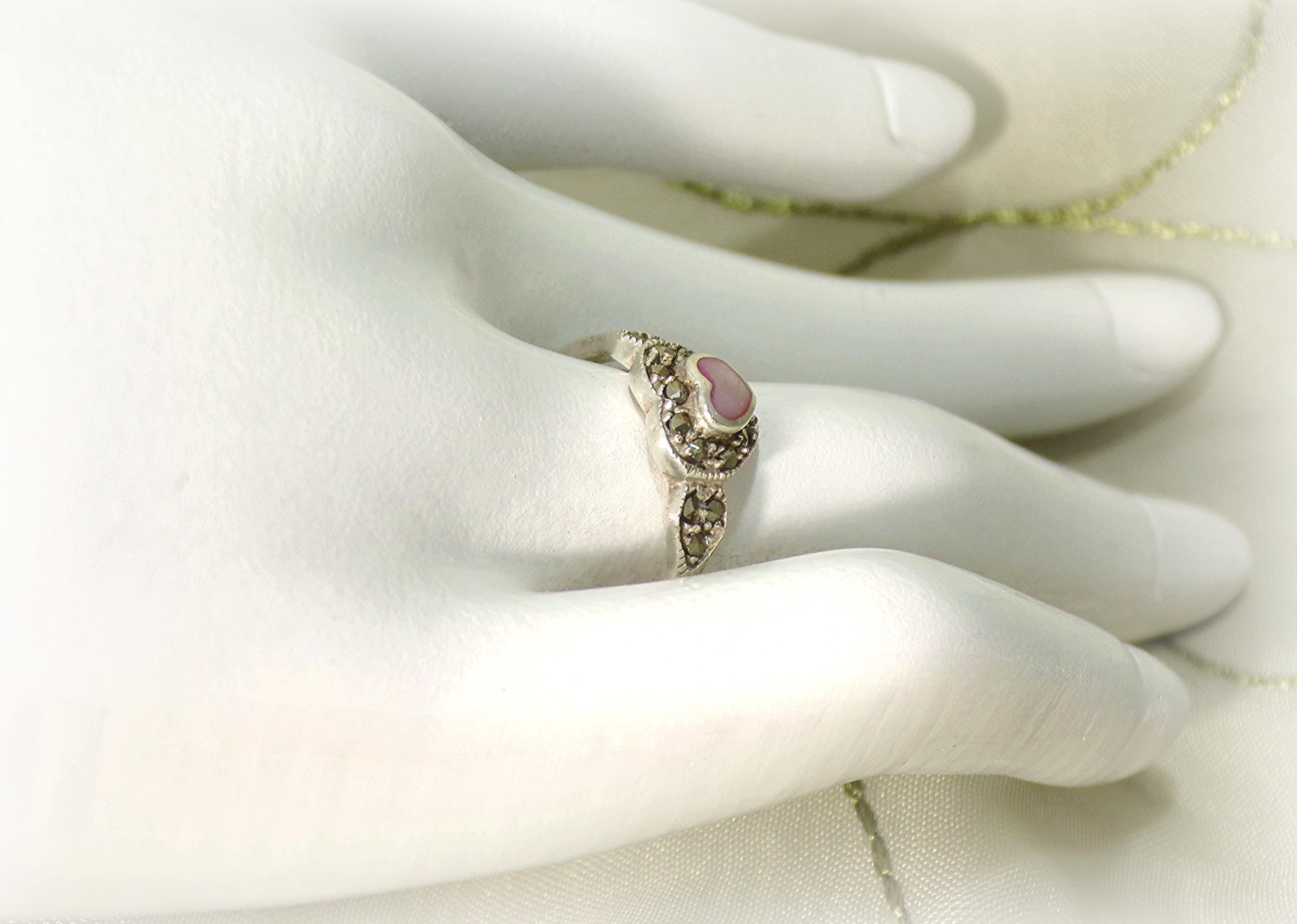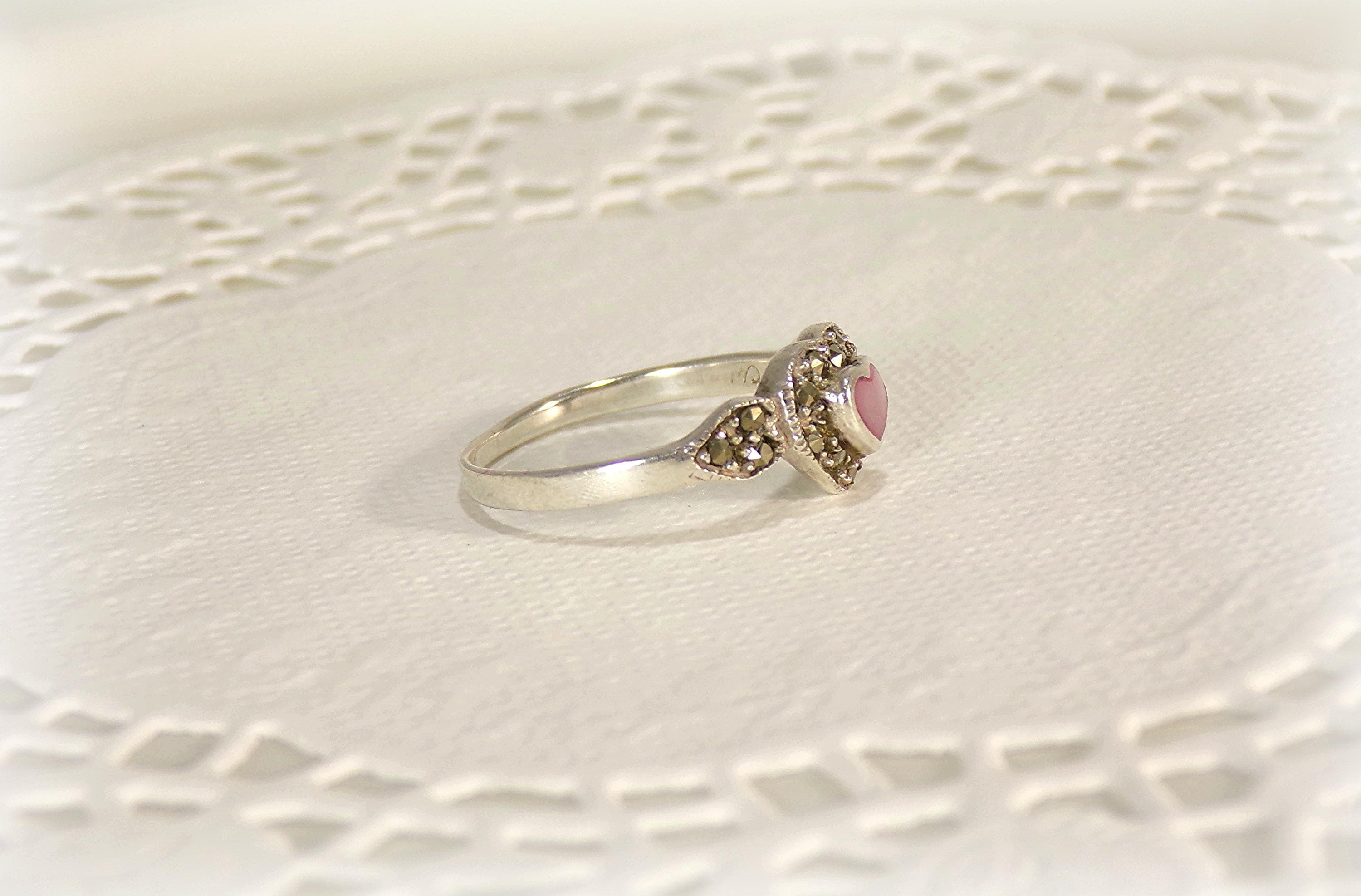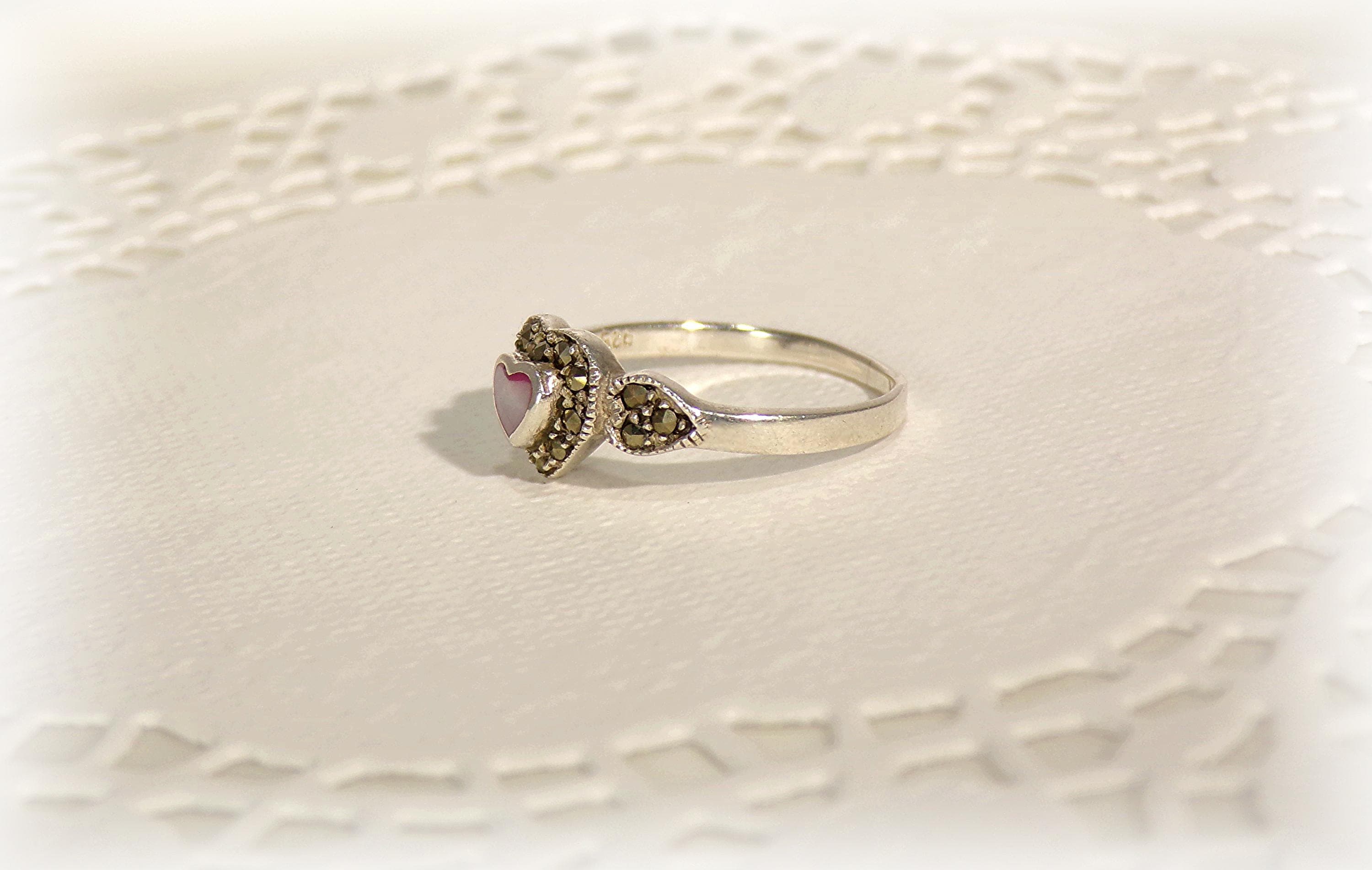 Pink Heart-Shaped Mother of Pearl with Marcasite Ring – 925 Sterling Silver- Vintage