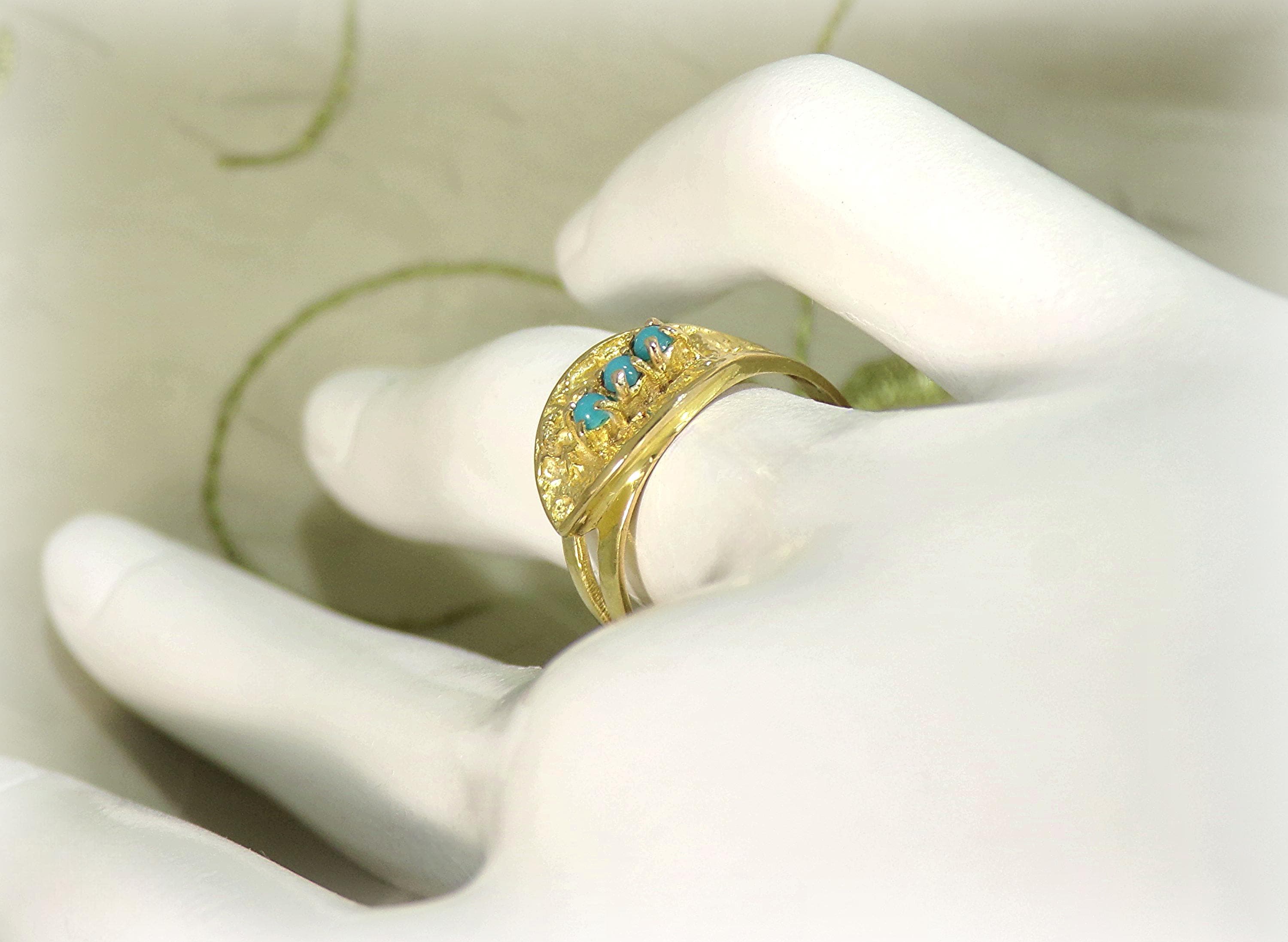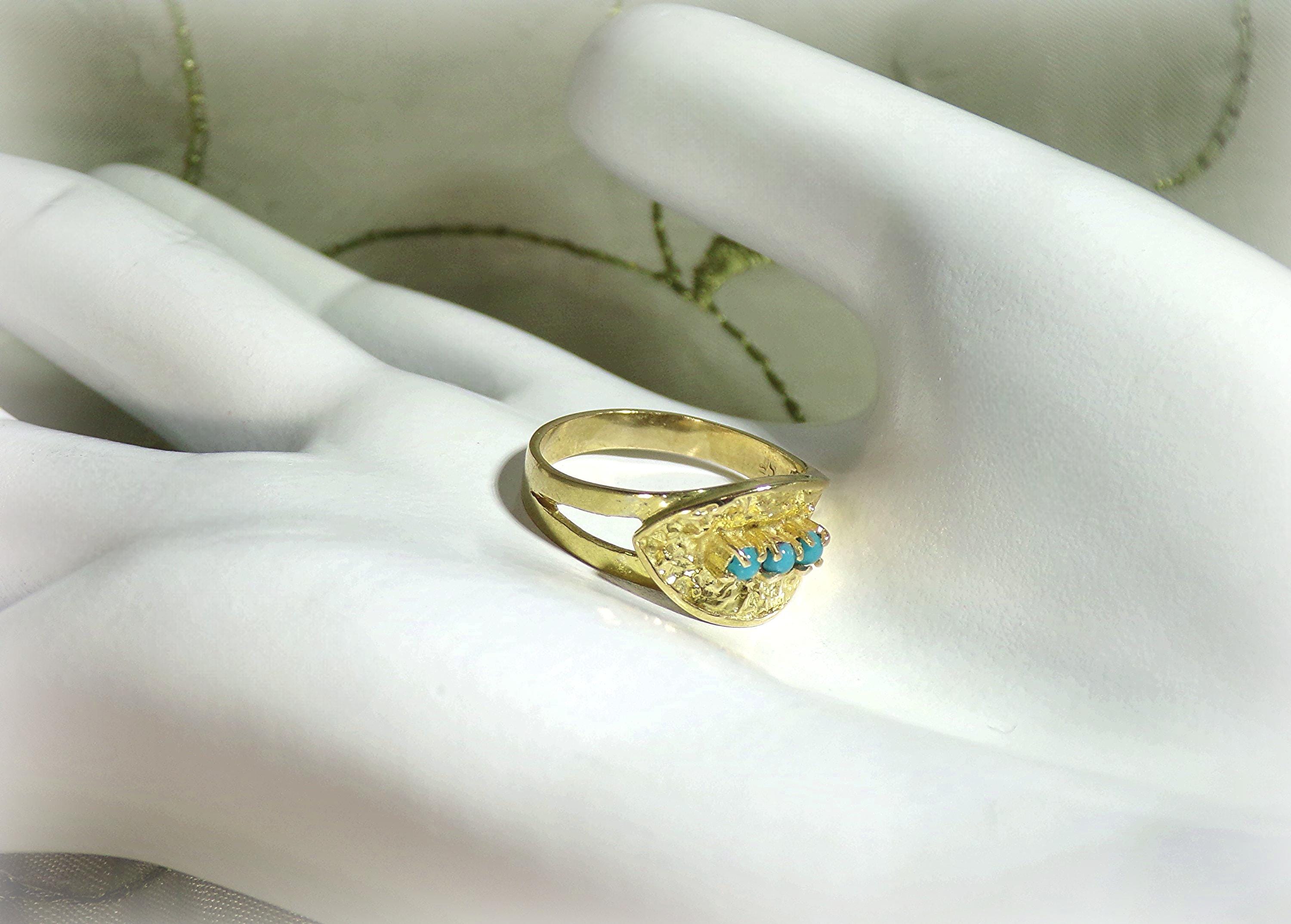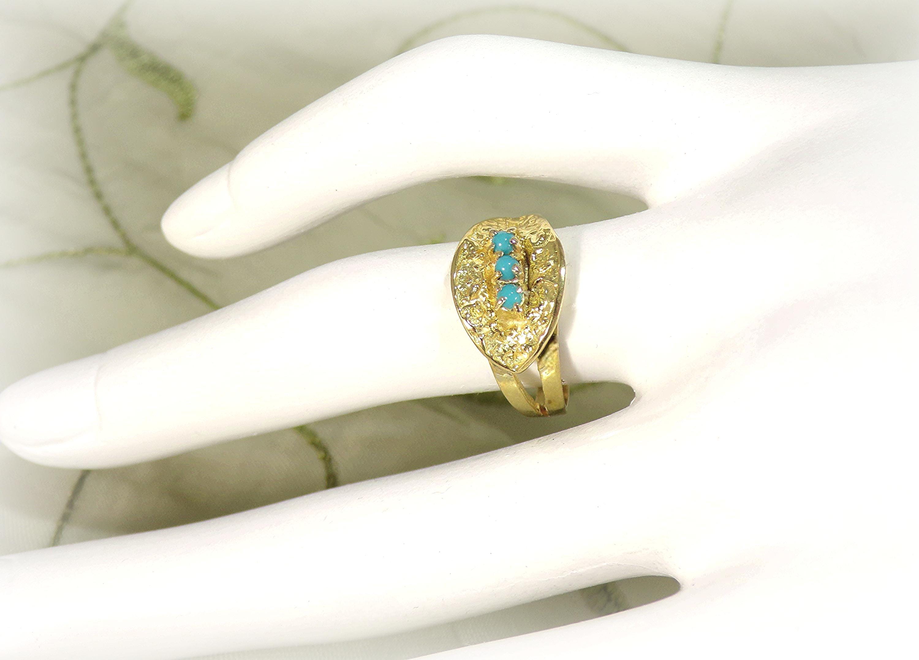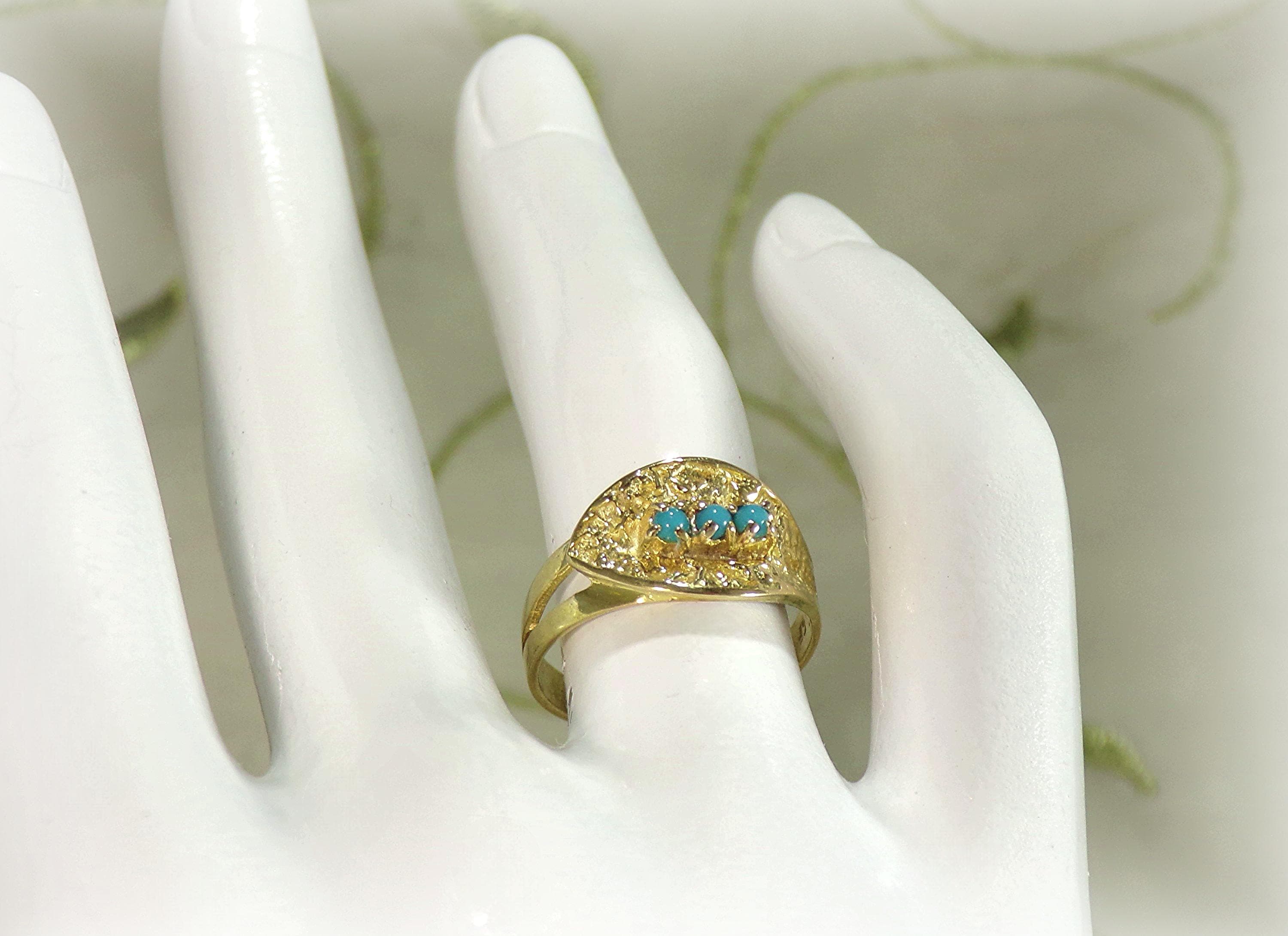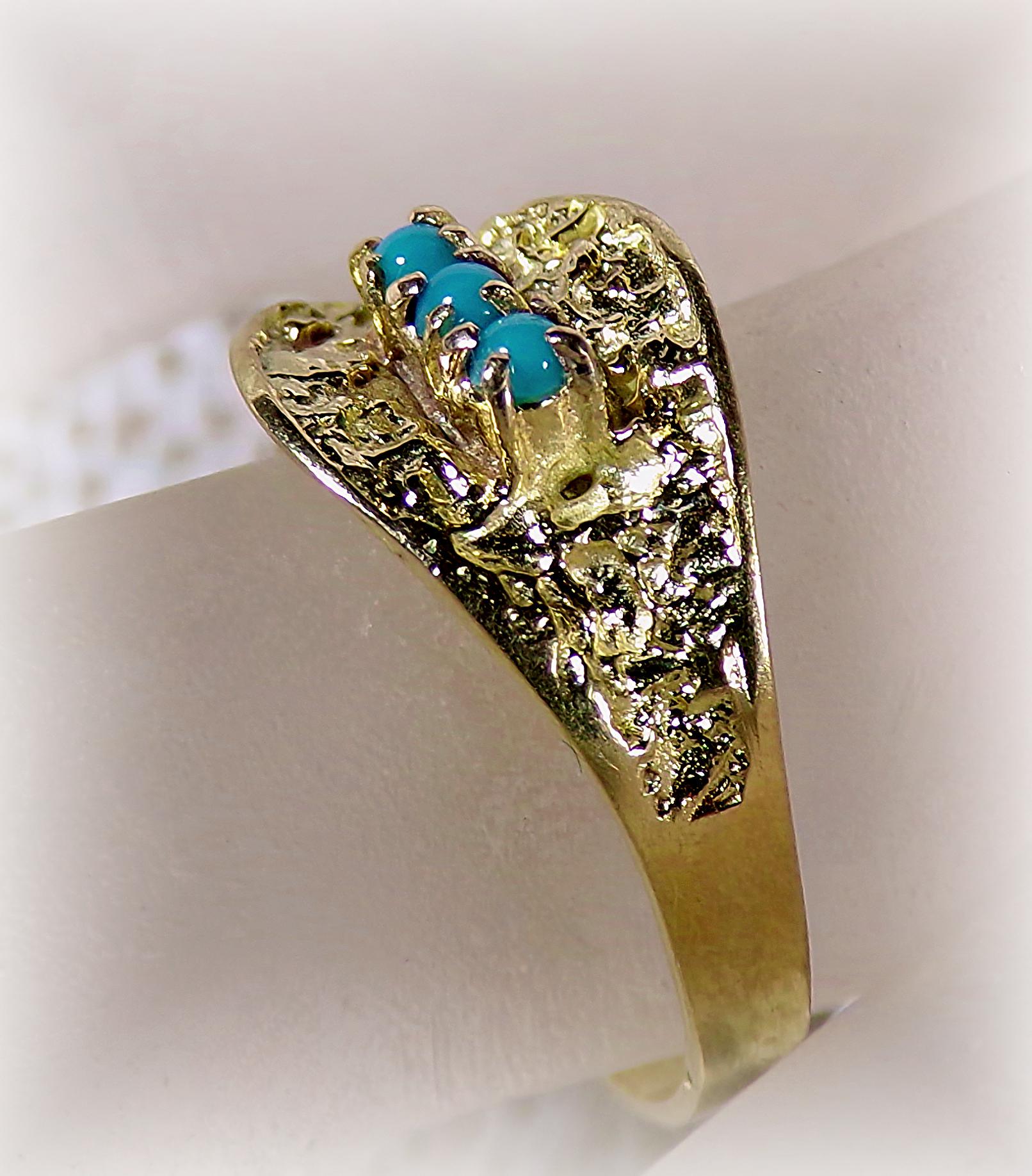 A gorgeous Turquoise Ring in 18K Yellow Gold is rich in nature inspired details. Three Turquoise gems are nestled within an Oblique Leaf of textured organic raw gold. The artistry and subtly of this jewelry, with its nod to nature, is absolutely unique in its presentation and crafting.