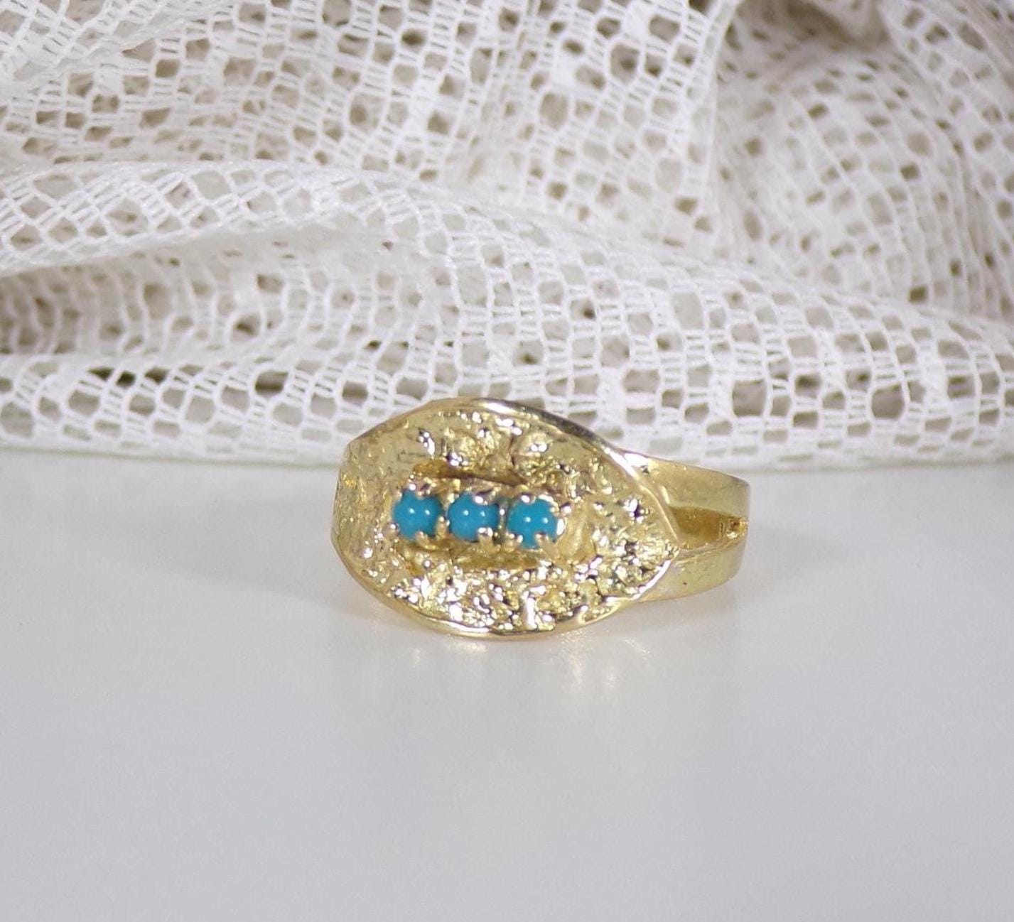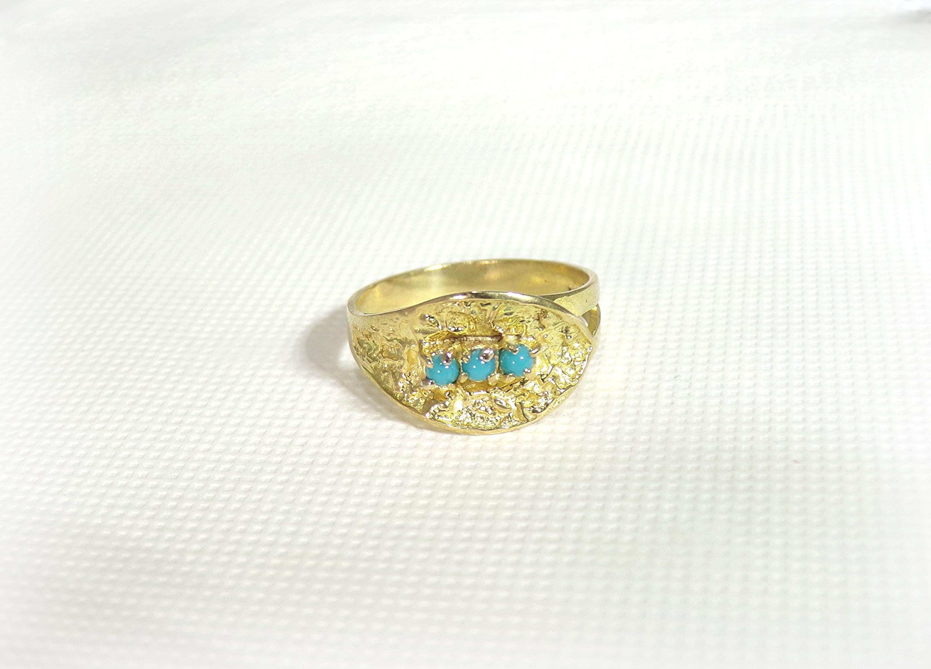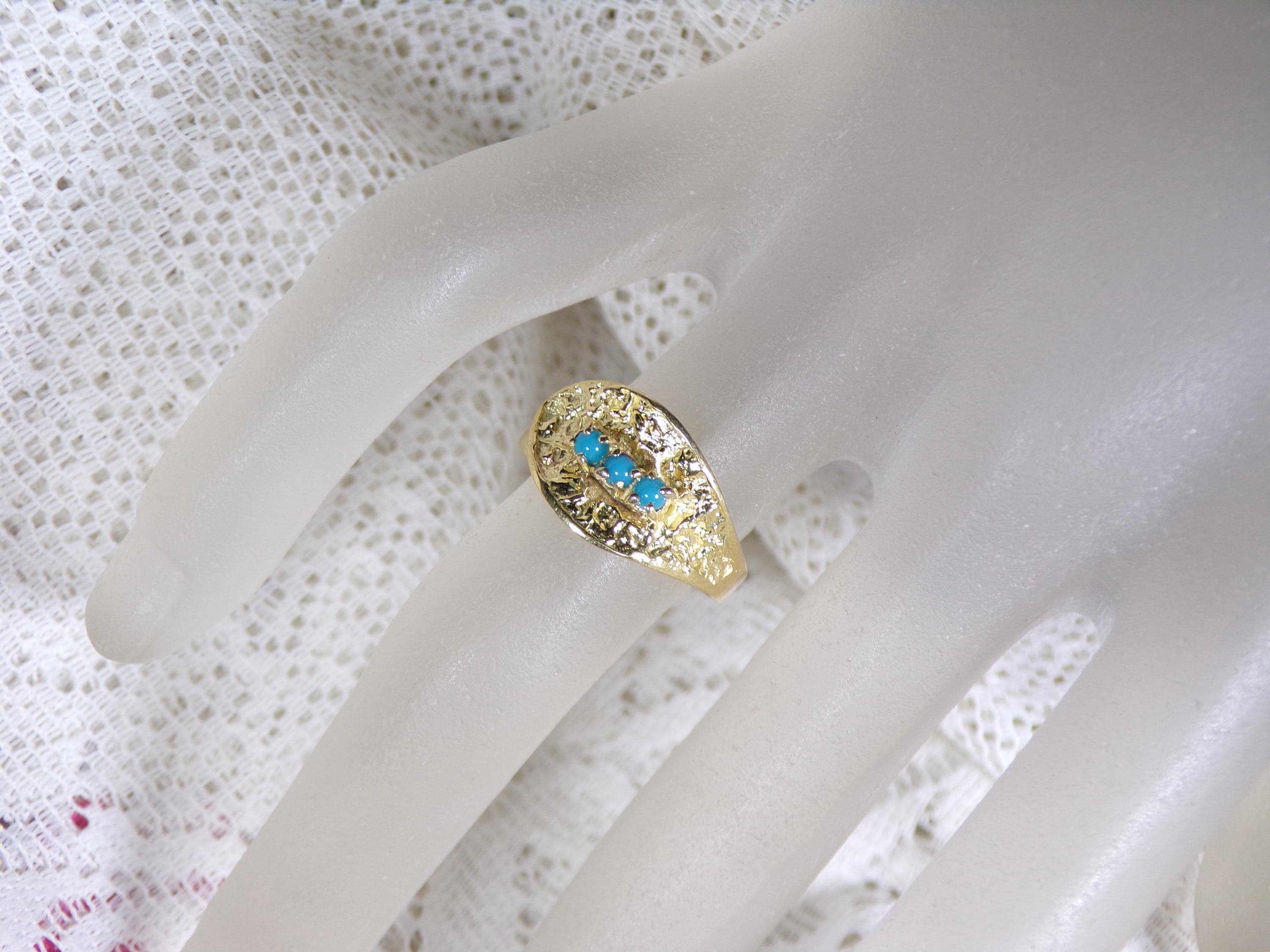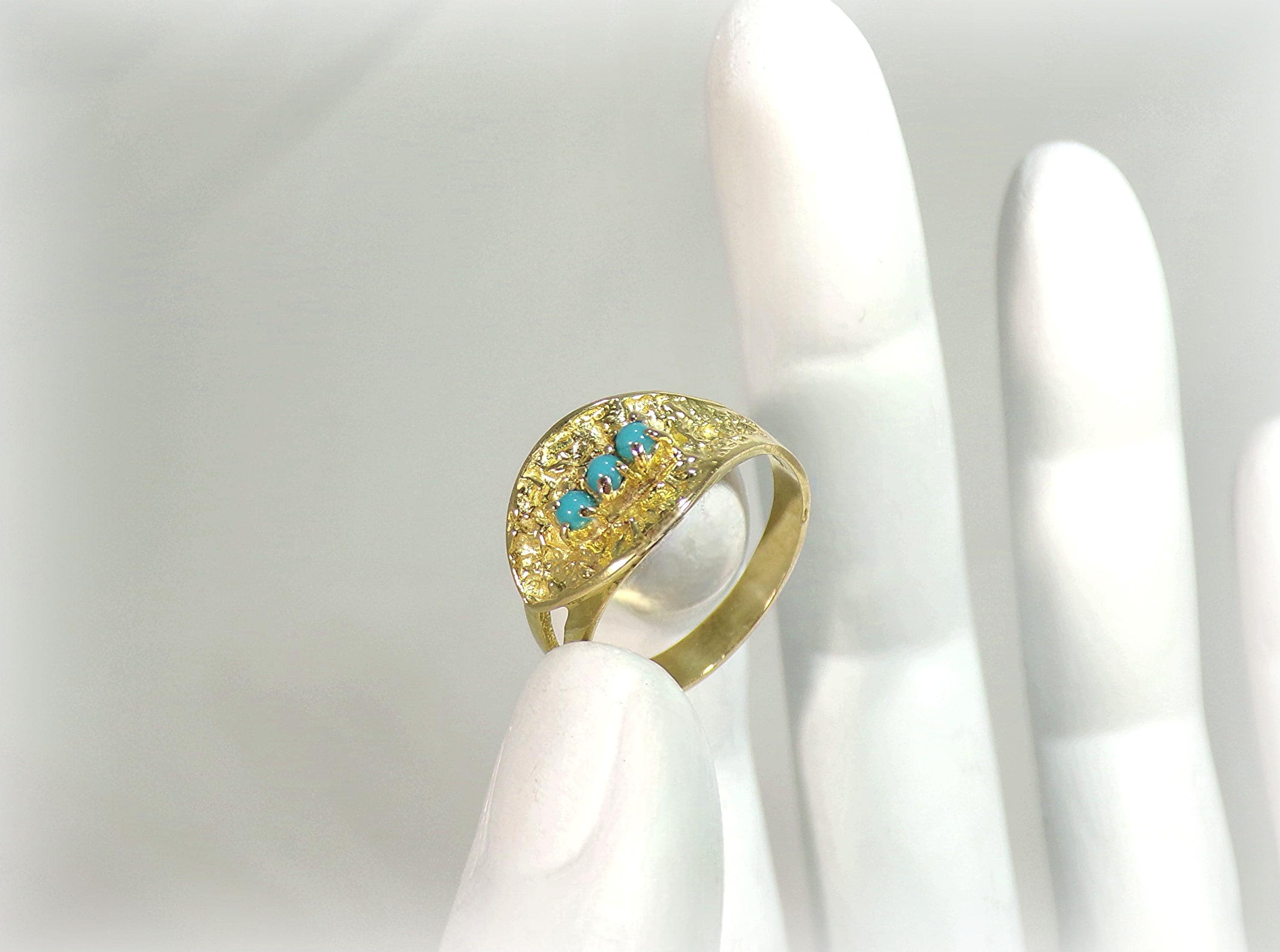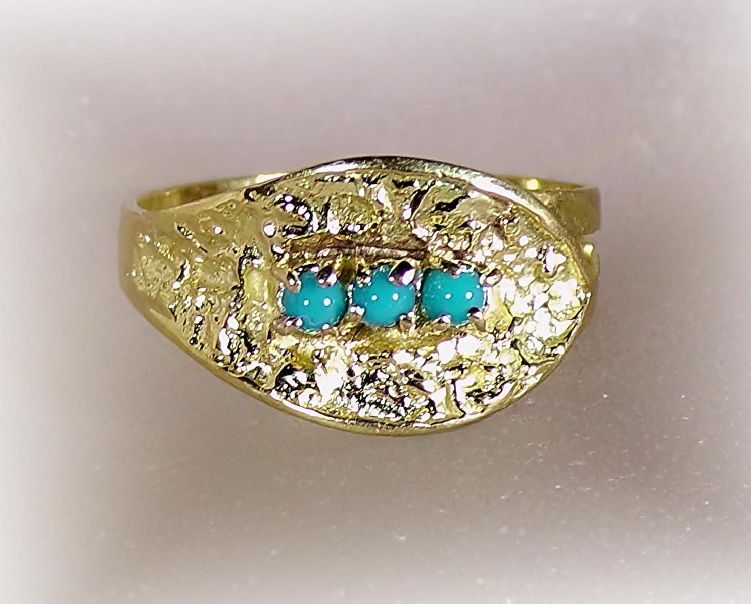 A gorgeous Turquoise Ring in 18K Yellow Gold is rich in nature inspired details. Three Turquoise gems are nestled within an Oblique Leaf of textured organic raw gold. The artistry and subtly of this jewelry, with its nod to nature, is absolutely unique in its presentation and crafting.