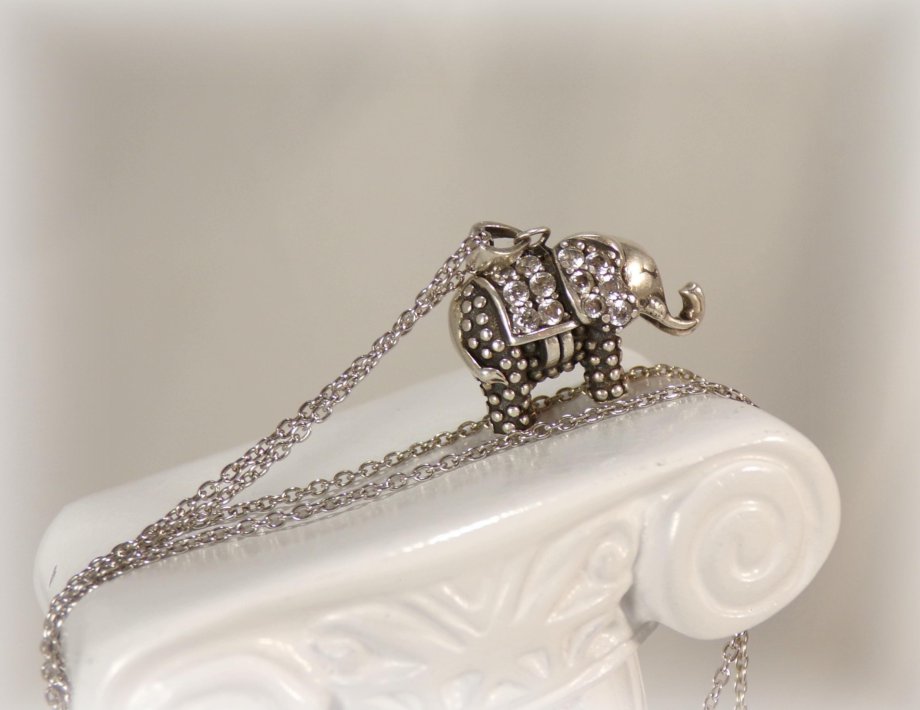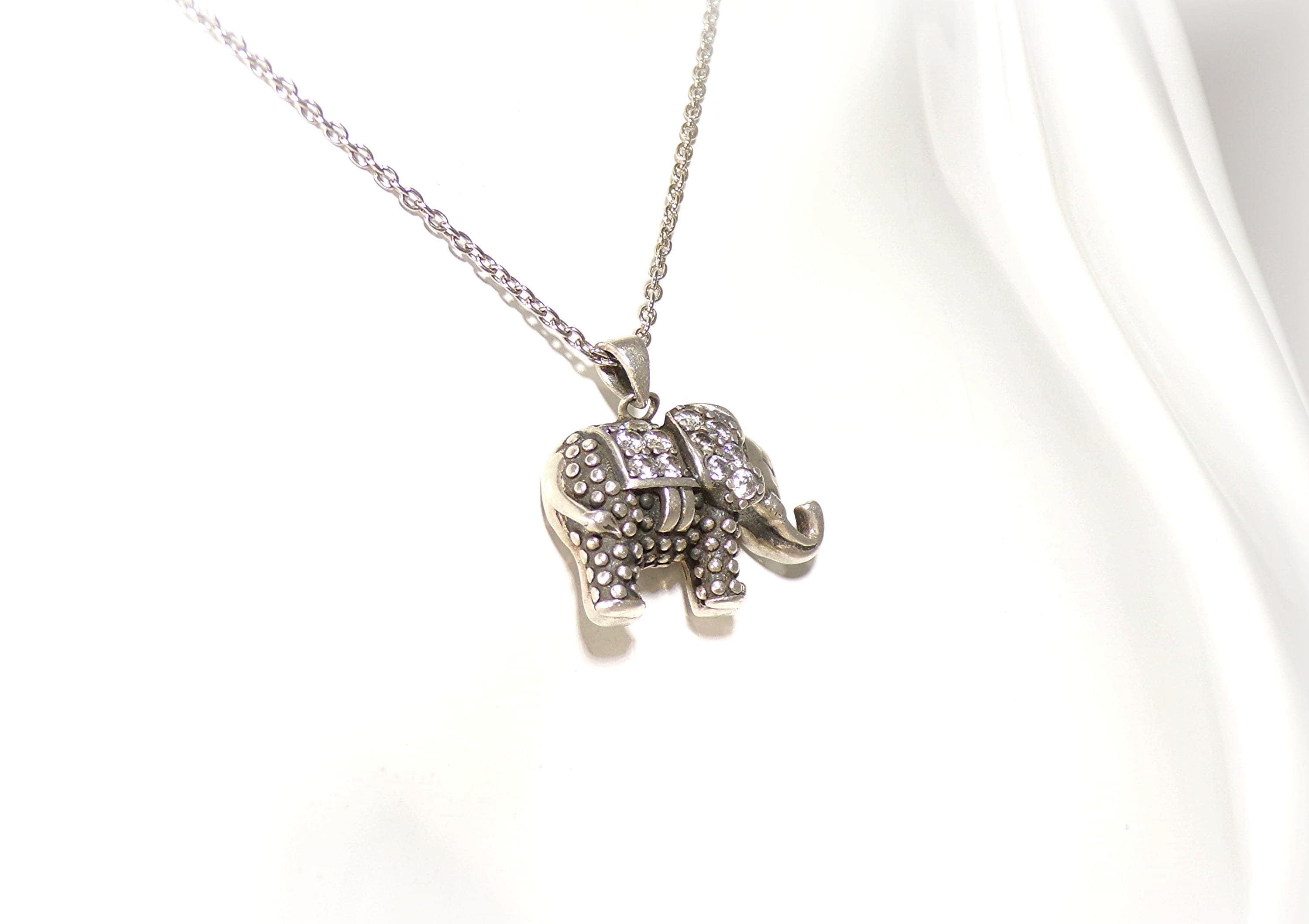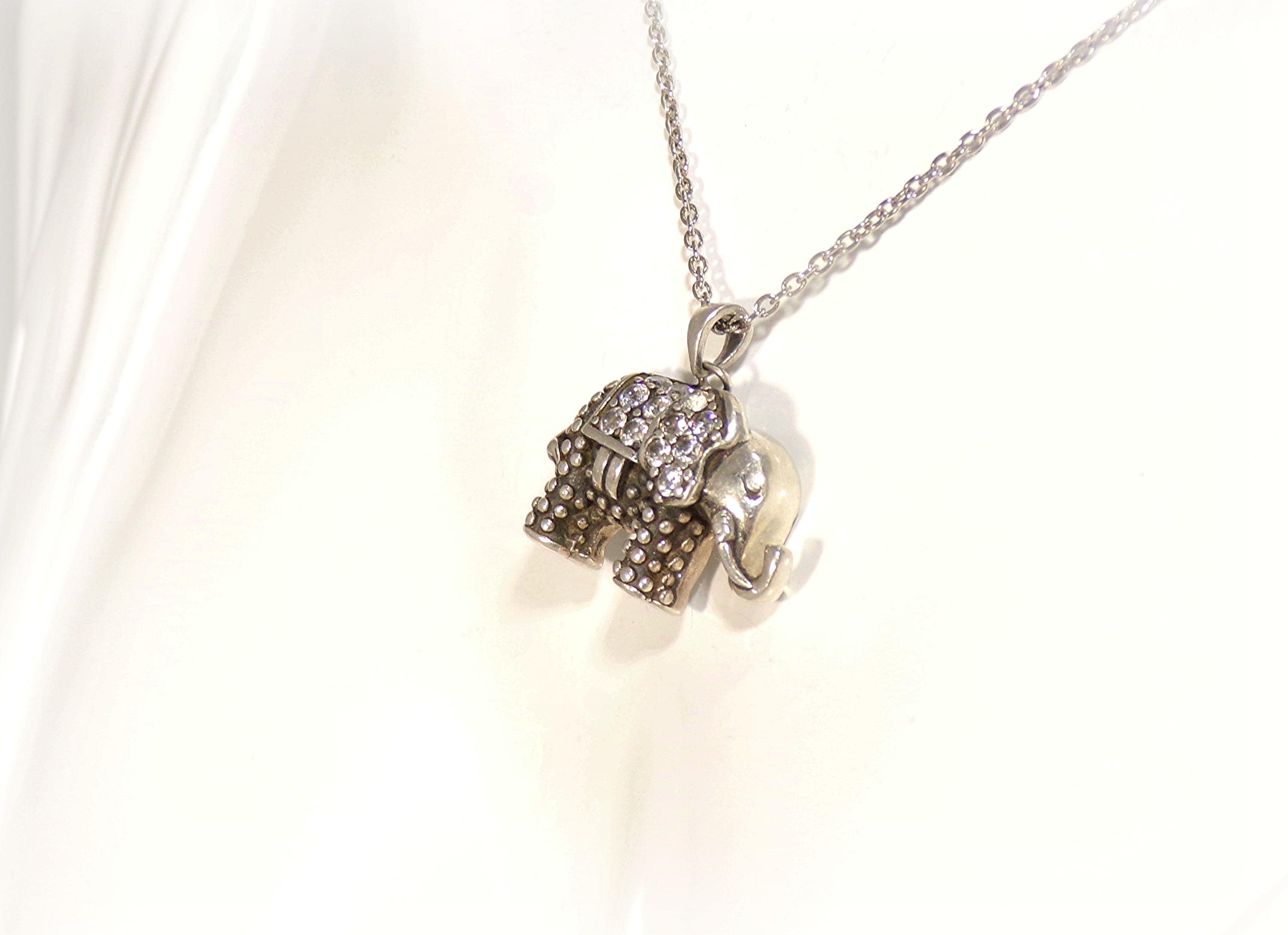 Necklace – Good Luck Upraised Trunk Elephant – Cubic Zirconia - 925 Sterling Silver - Vintage