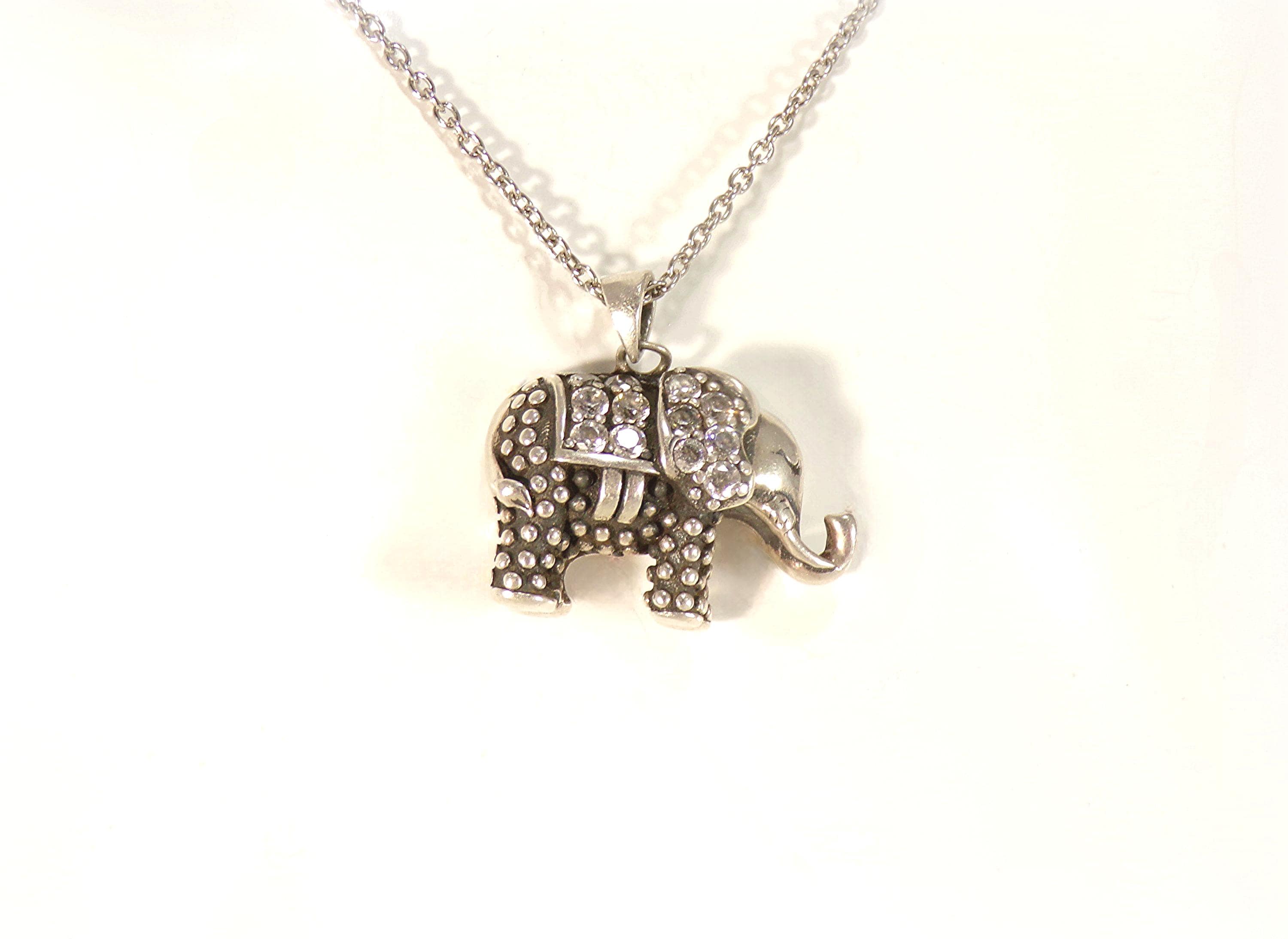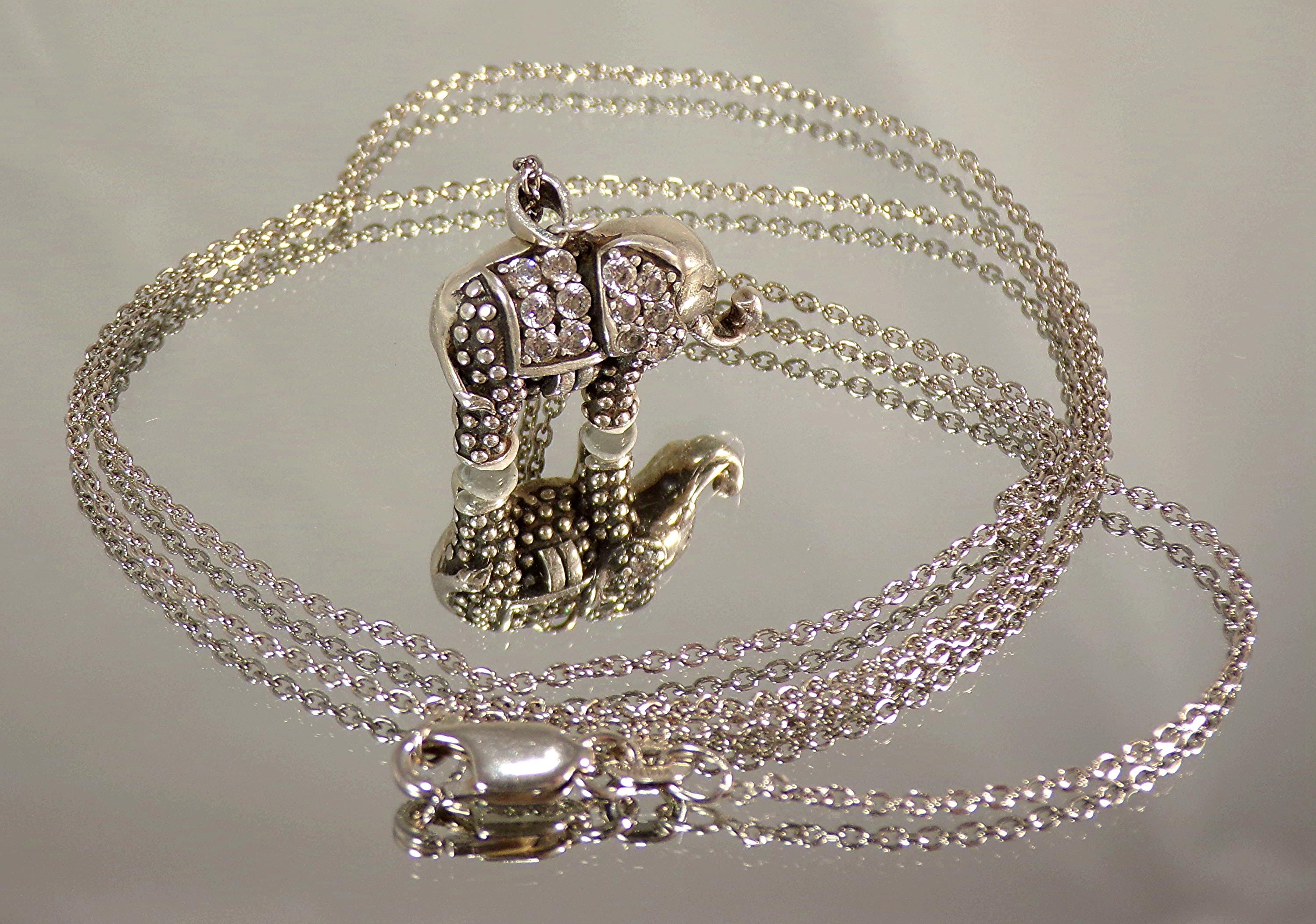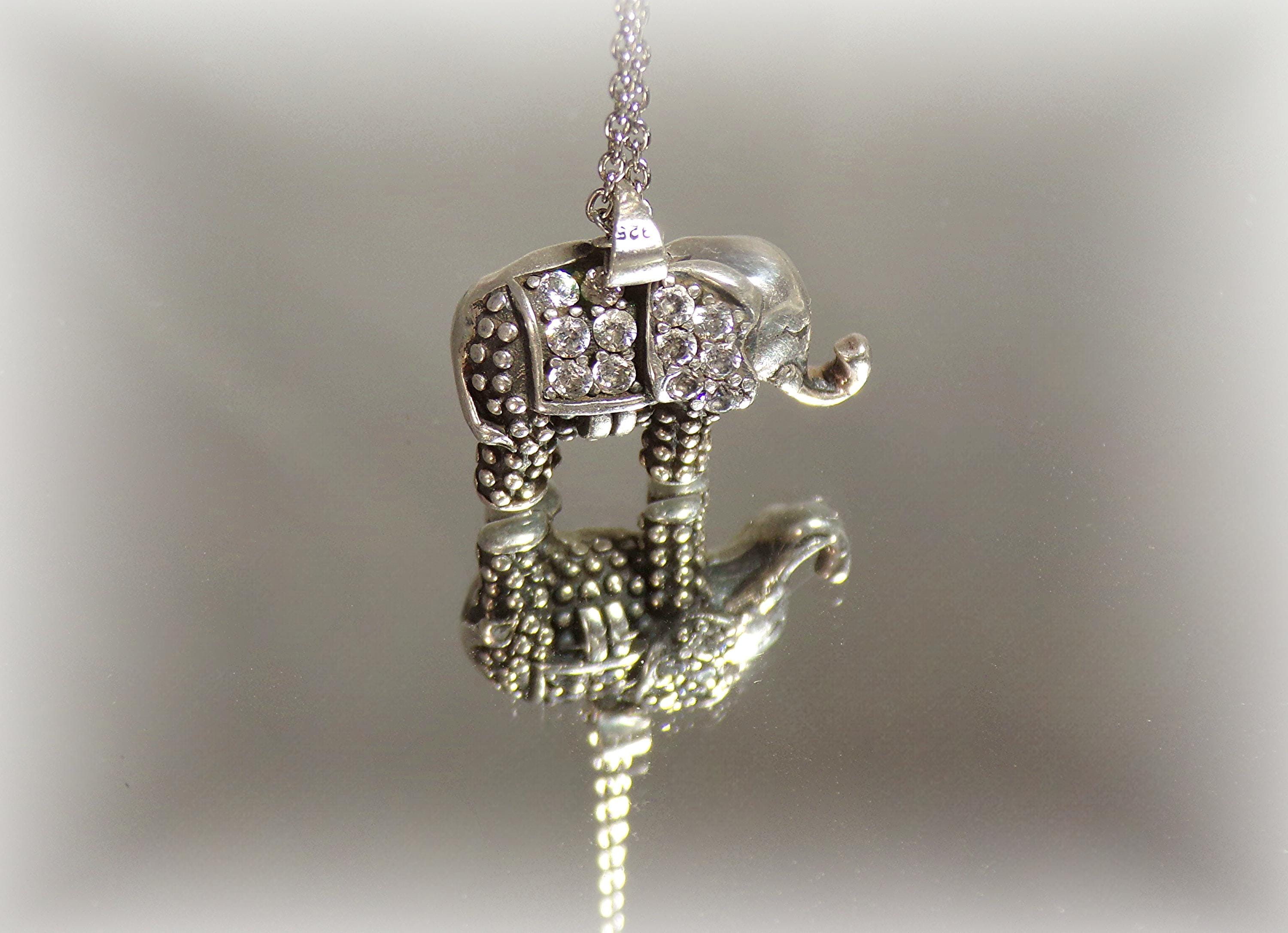 Necklace – Good Luck Upraised Trunk Elephant – Cubic Zirconia - 925 Sterling Silver - Vintage