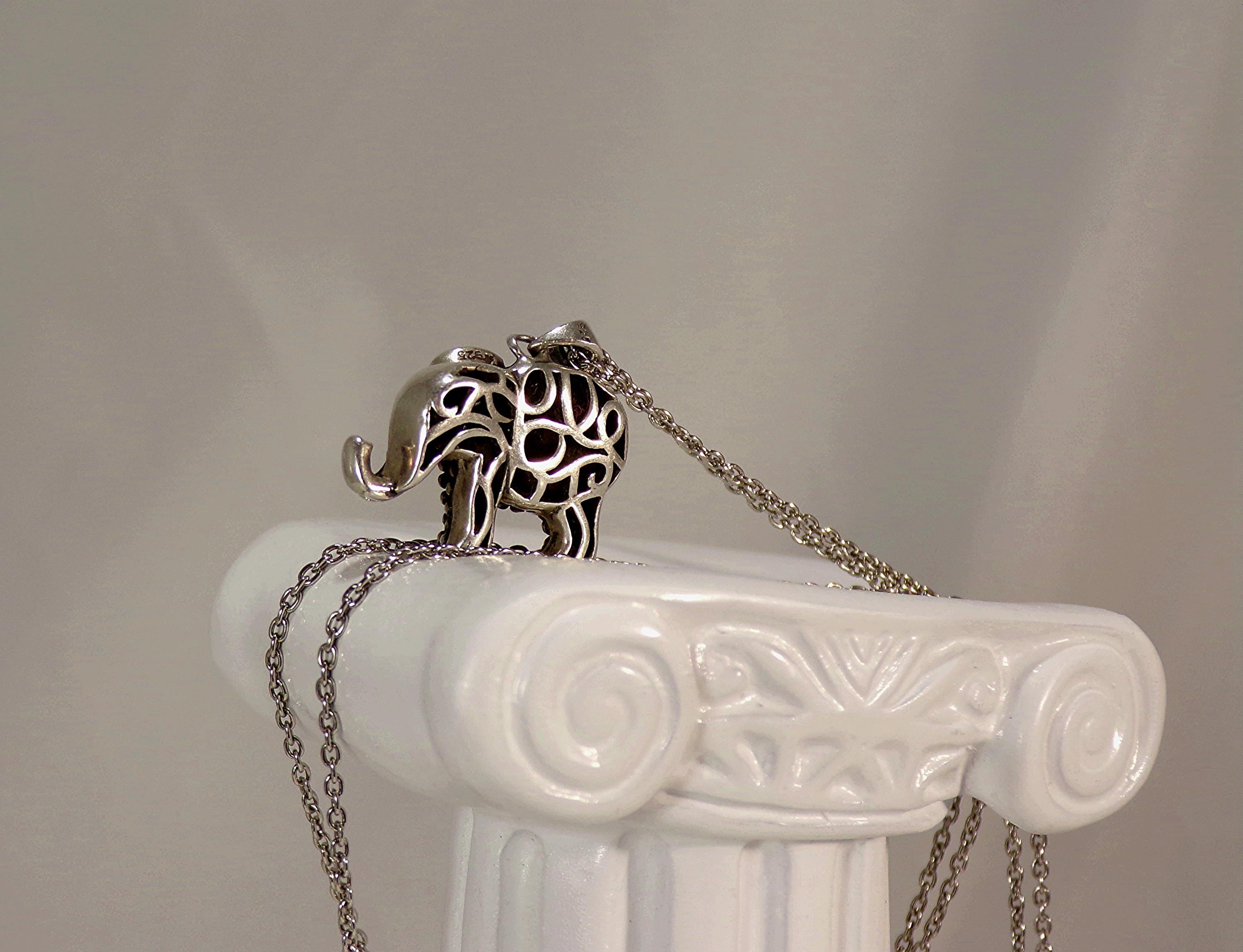 This Sterling Silver Necklace has a Pendant of an Upraised Trunk Elephant with twelve 1.5mm Cubic Zirconia gems. With an oxidized patina to get those details to pop, a decorative swirly backside, and a closed eye sereneness, this bejeweled elephant will surely bring all the positivity of the luck, prosperity, and joy it symbolizes. The gentleness depicted in the crafting of this elephant pendant is not often found in jewelry and sets it apart from others.
