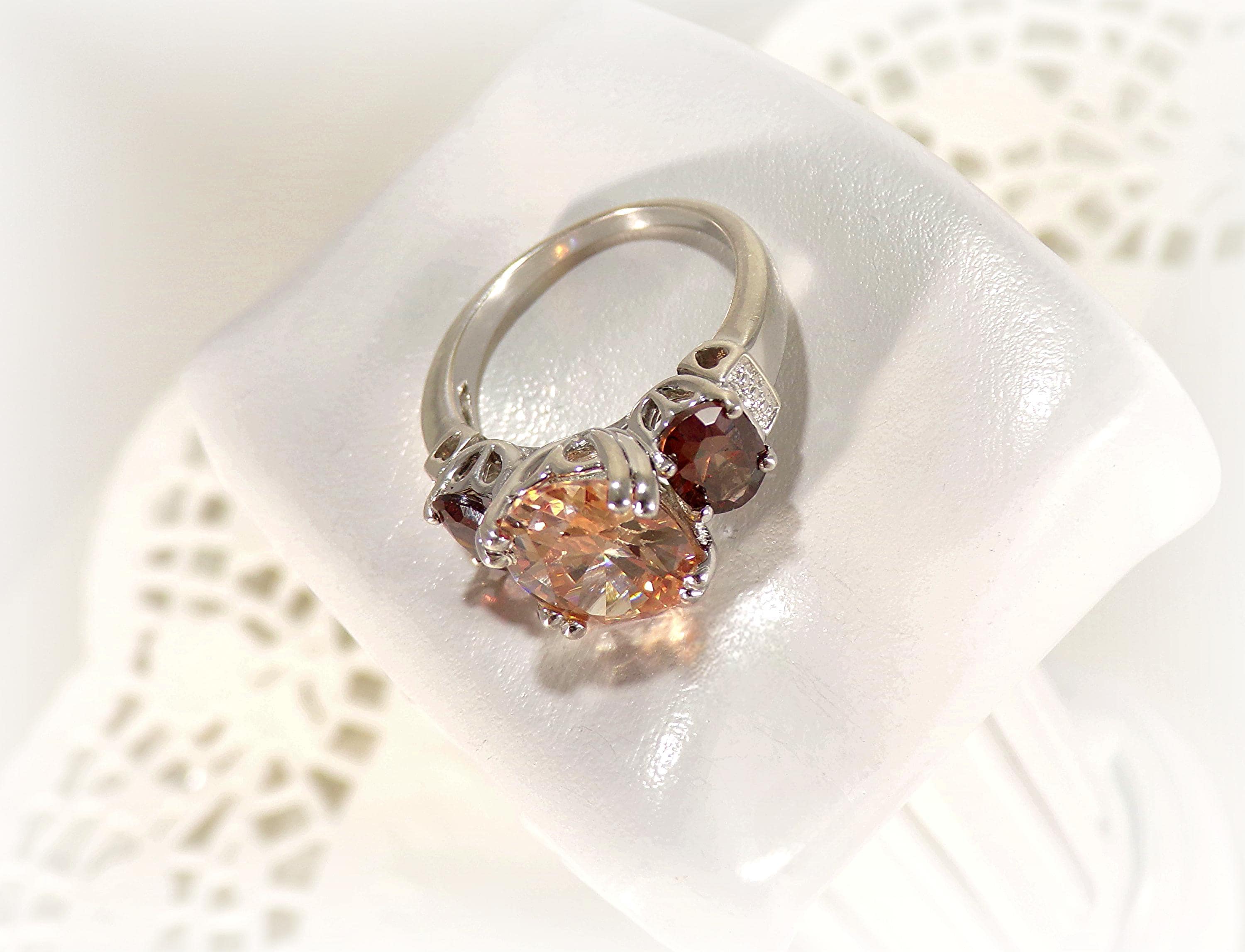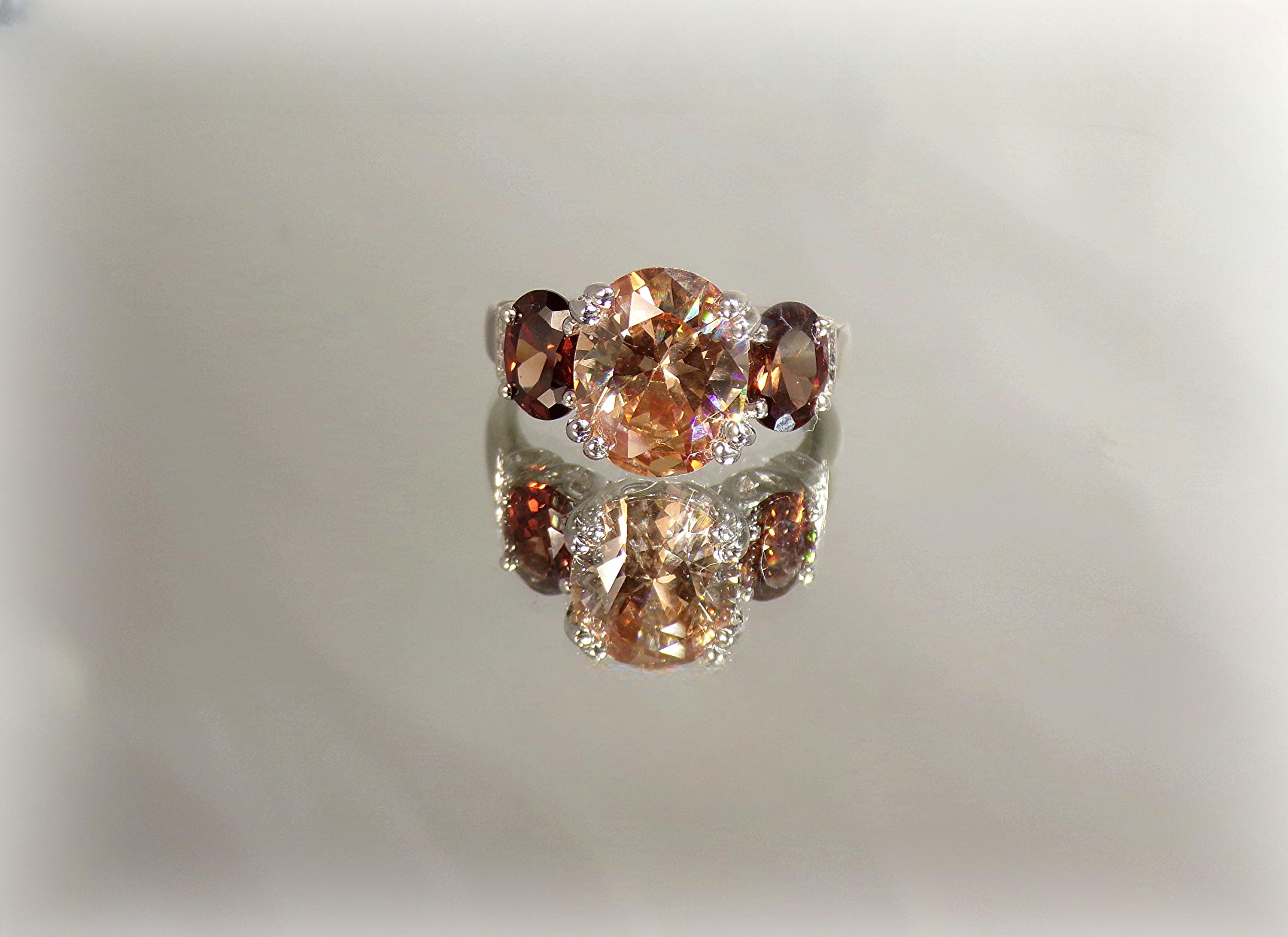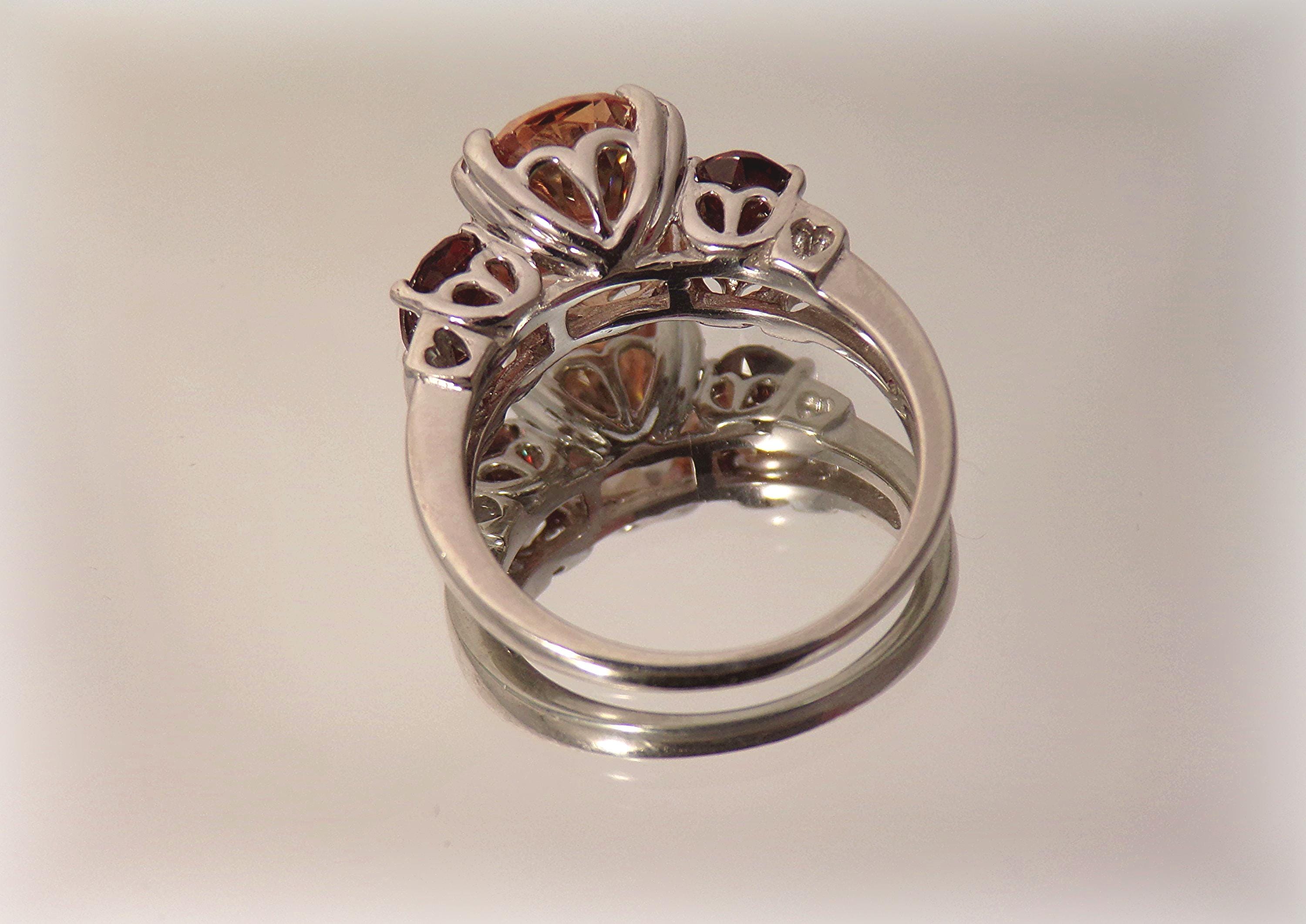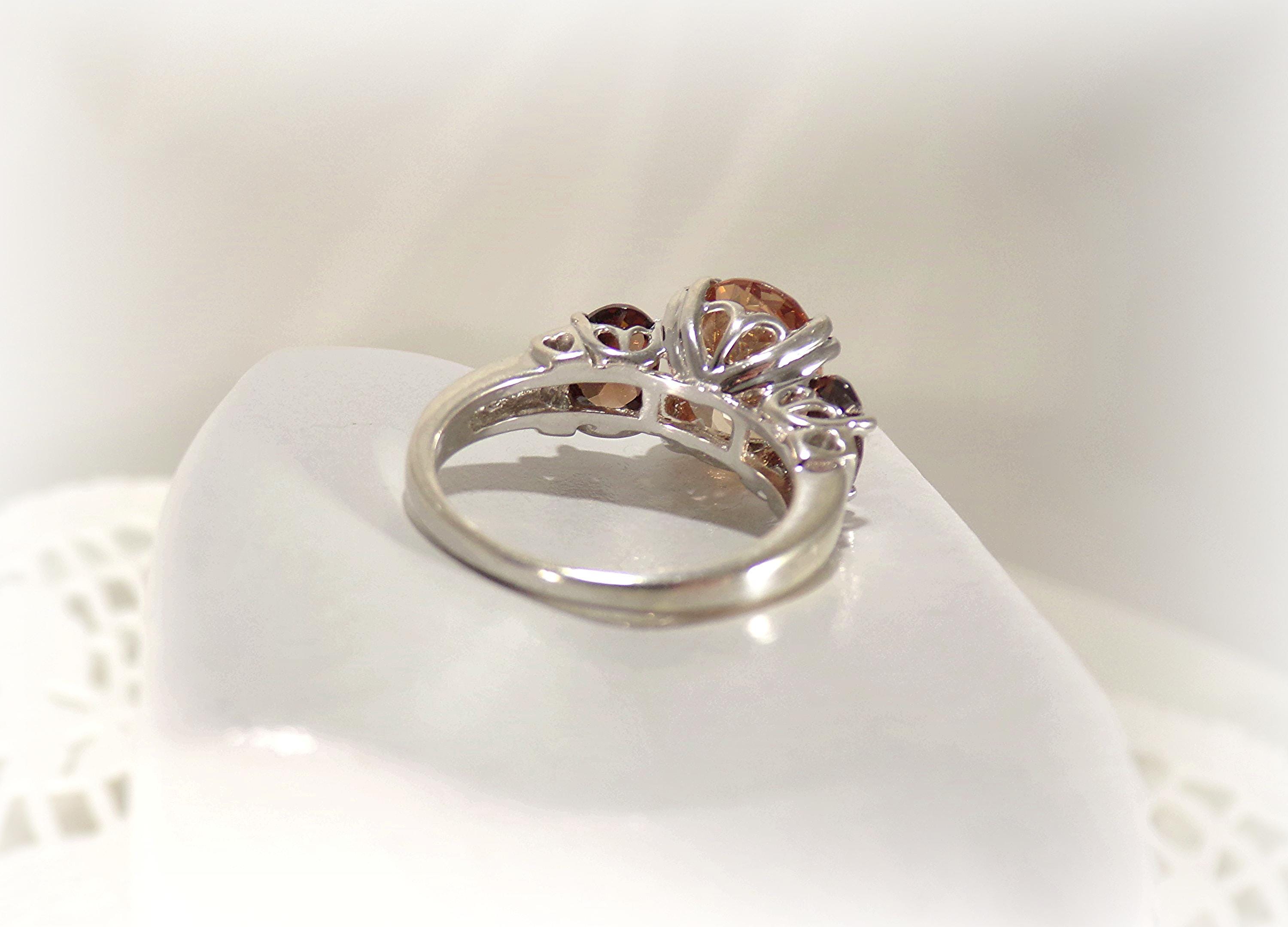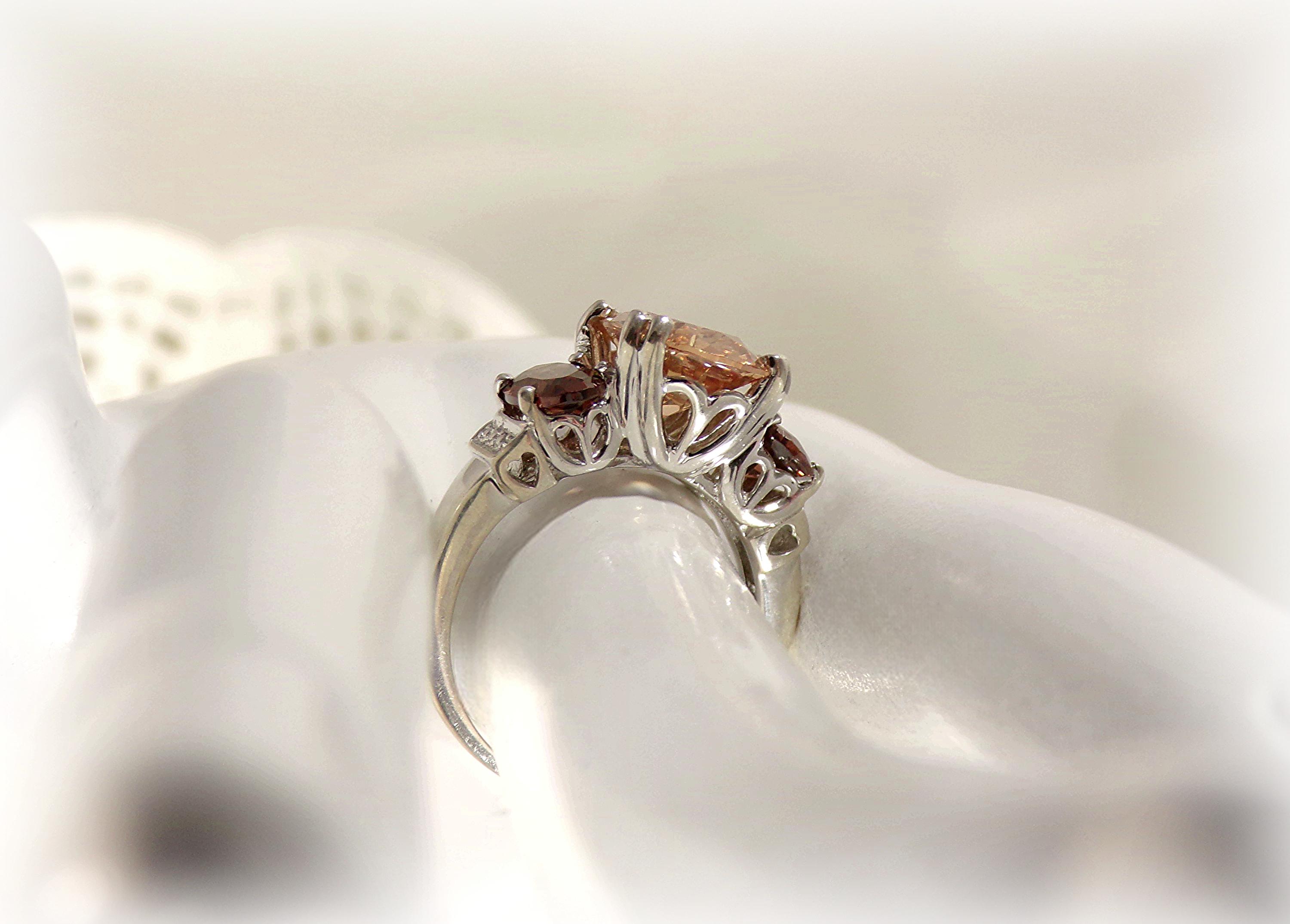 This is a stunning faceted Ring bestowing Tourmaline gemstones with the larger center gem in Peach and a smaller Root Beer gem on either side of the center stone, in a setting of quaint hearts. This is an exquisite ring that captures and reflects the light beautifully.