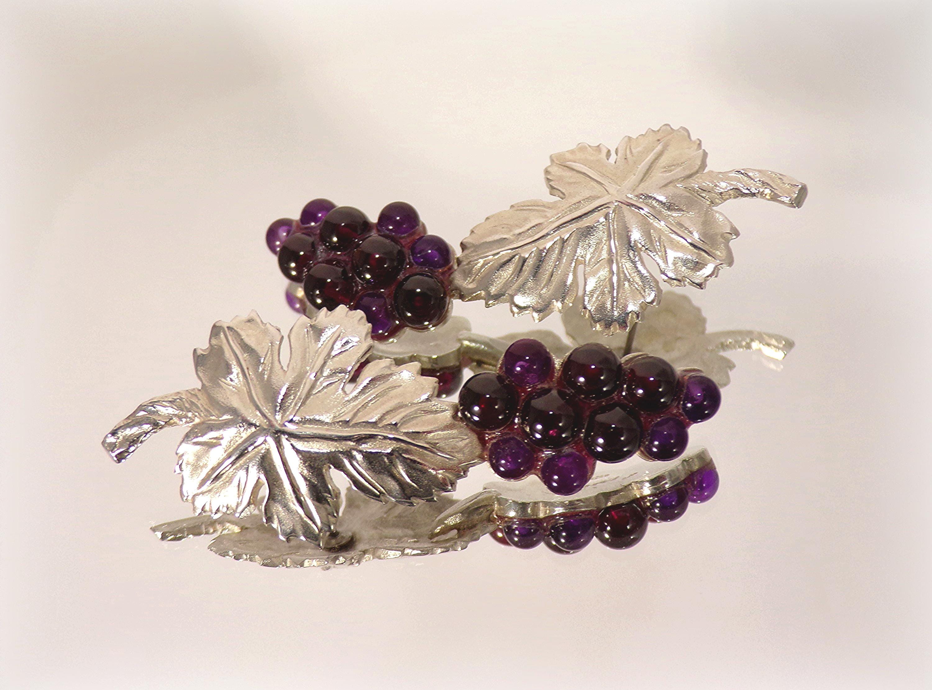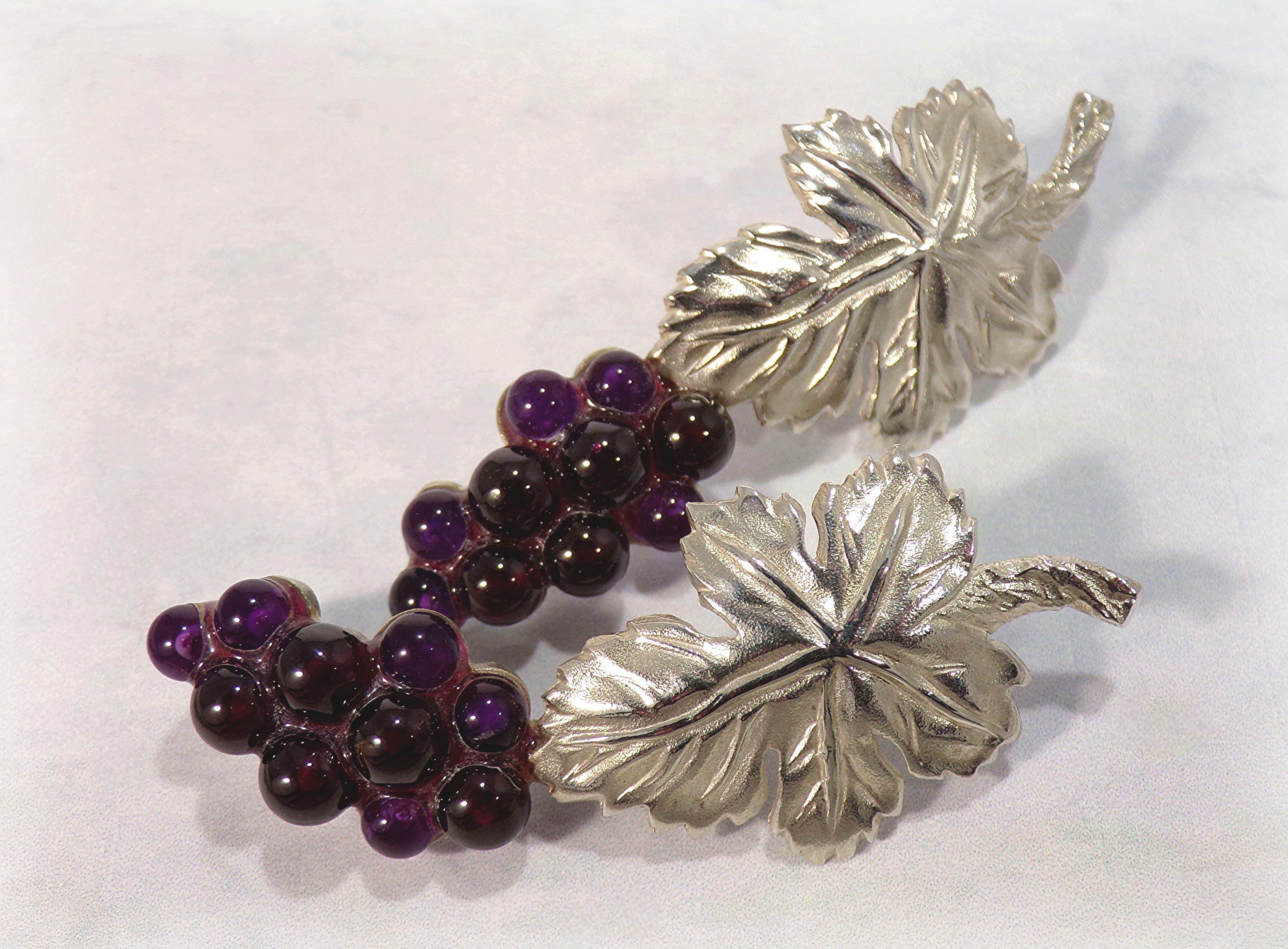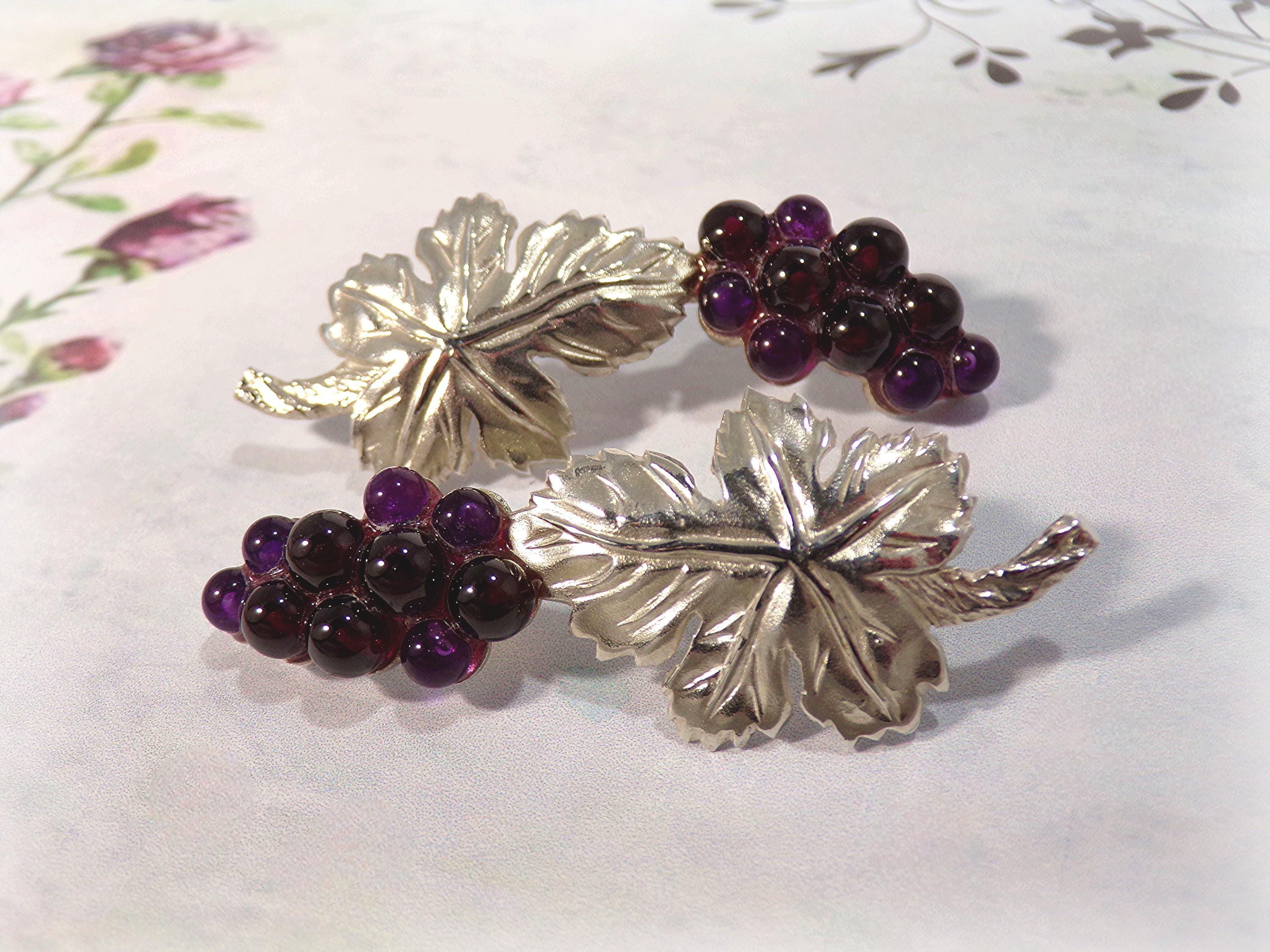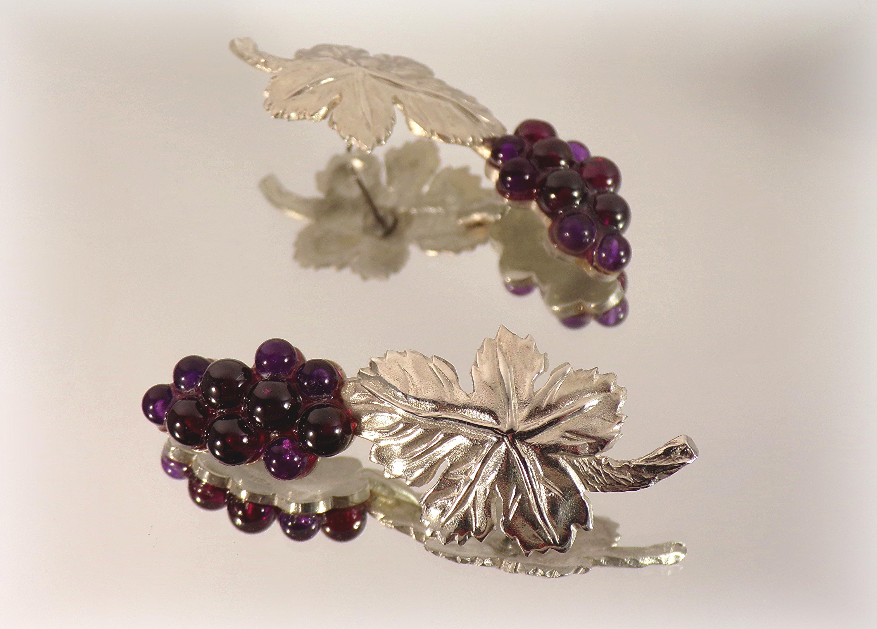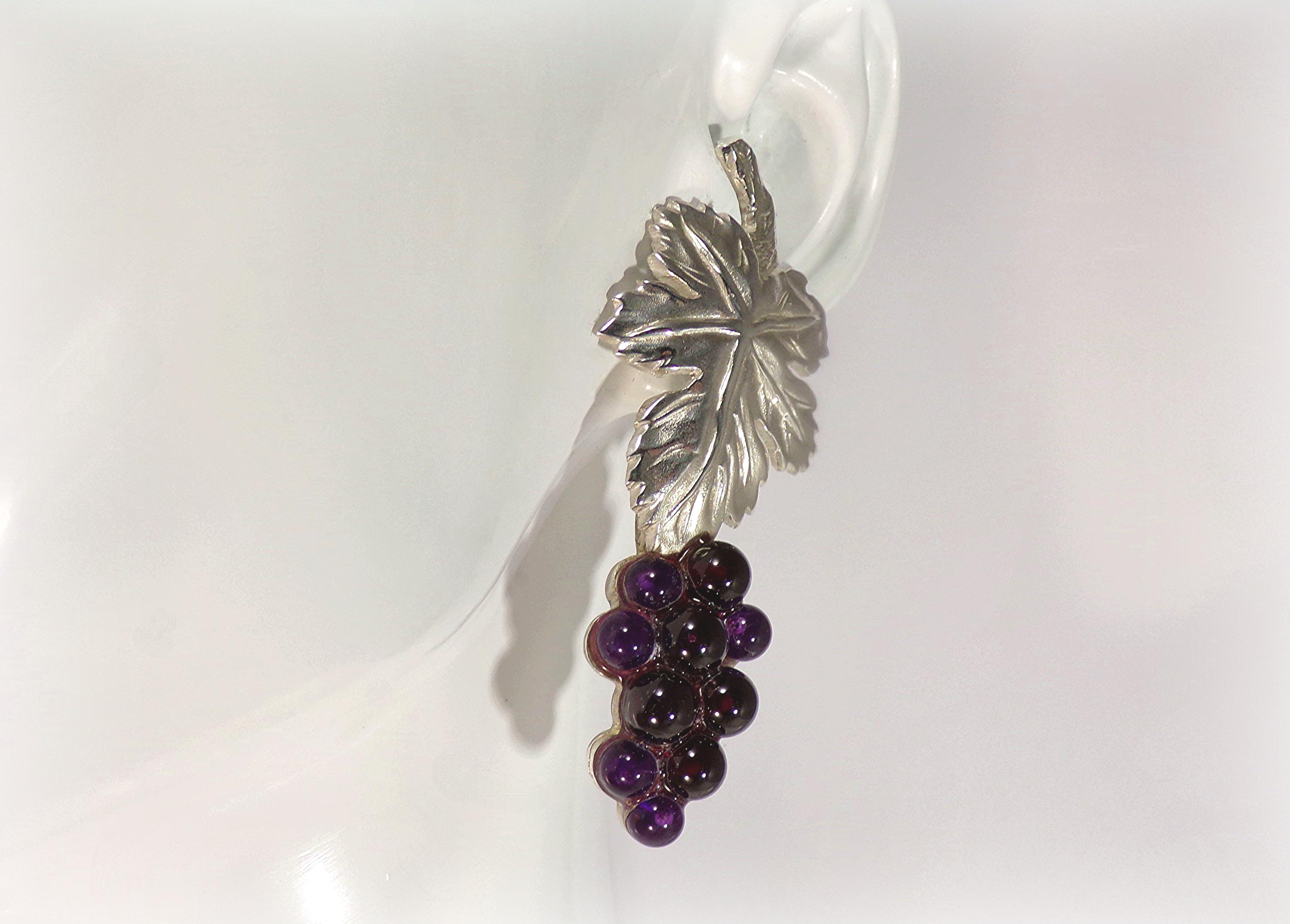 The stunning craftsmaship of these Amethyst Earrings cleverly depict a Cluster of Grapes with an intricately detailed 925 Sterling Silver Leaf. This extraordinary Art Nouveau design beautifully makes a statement, with the multi-toned purples of the Amethyst in the varied sized grapes, against the stark silver of the sophisticated leaf. The artistic details of these earrings are exquisite.