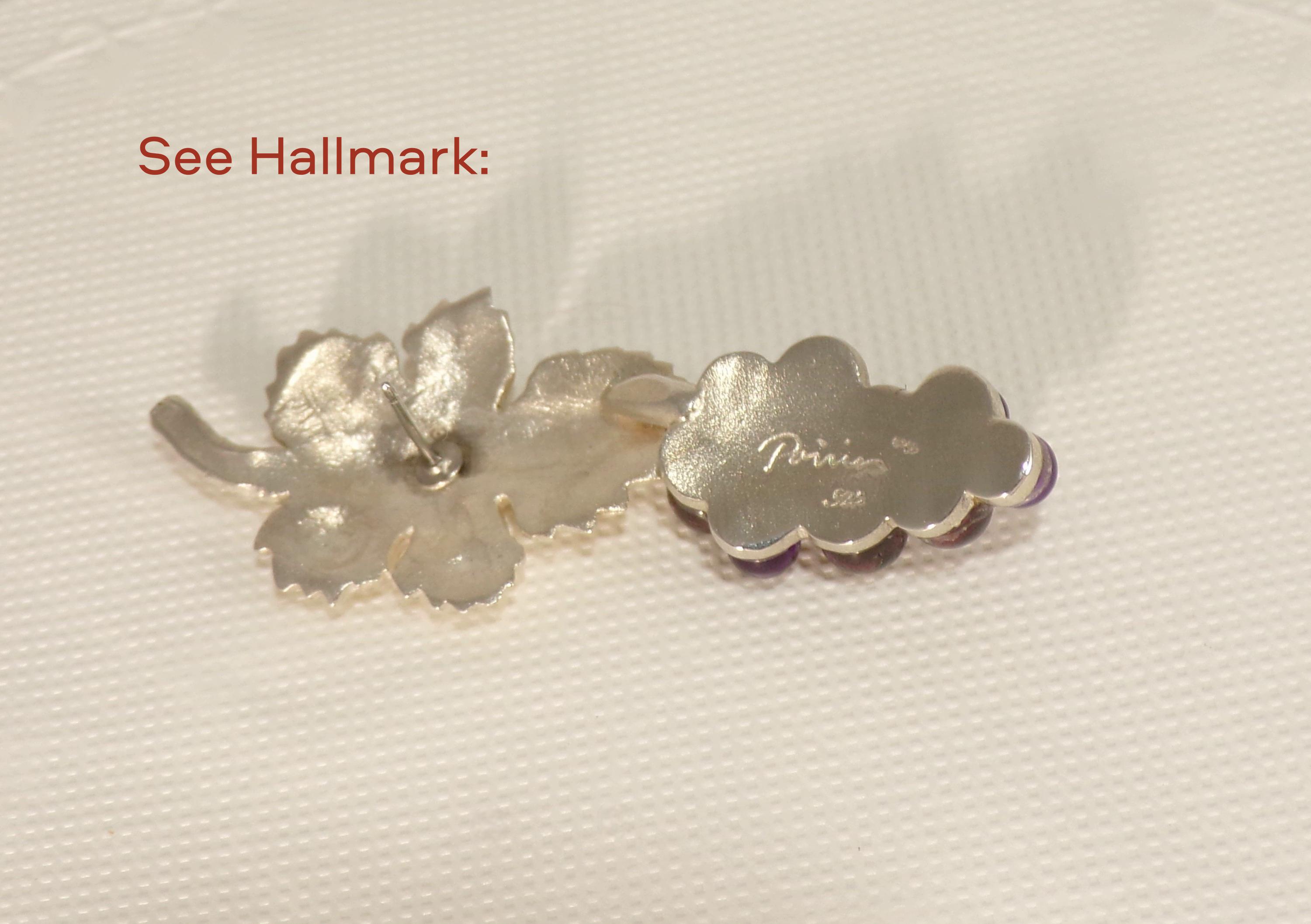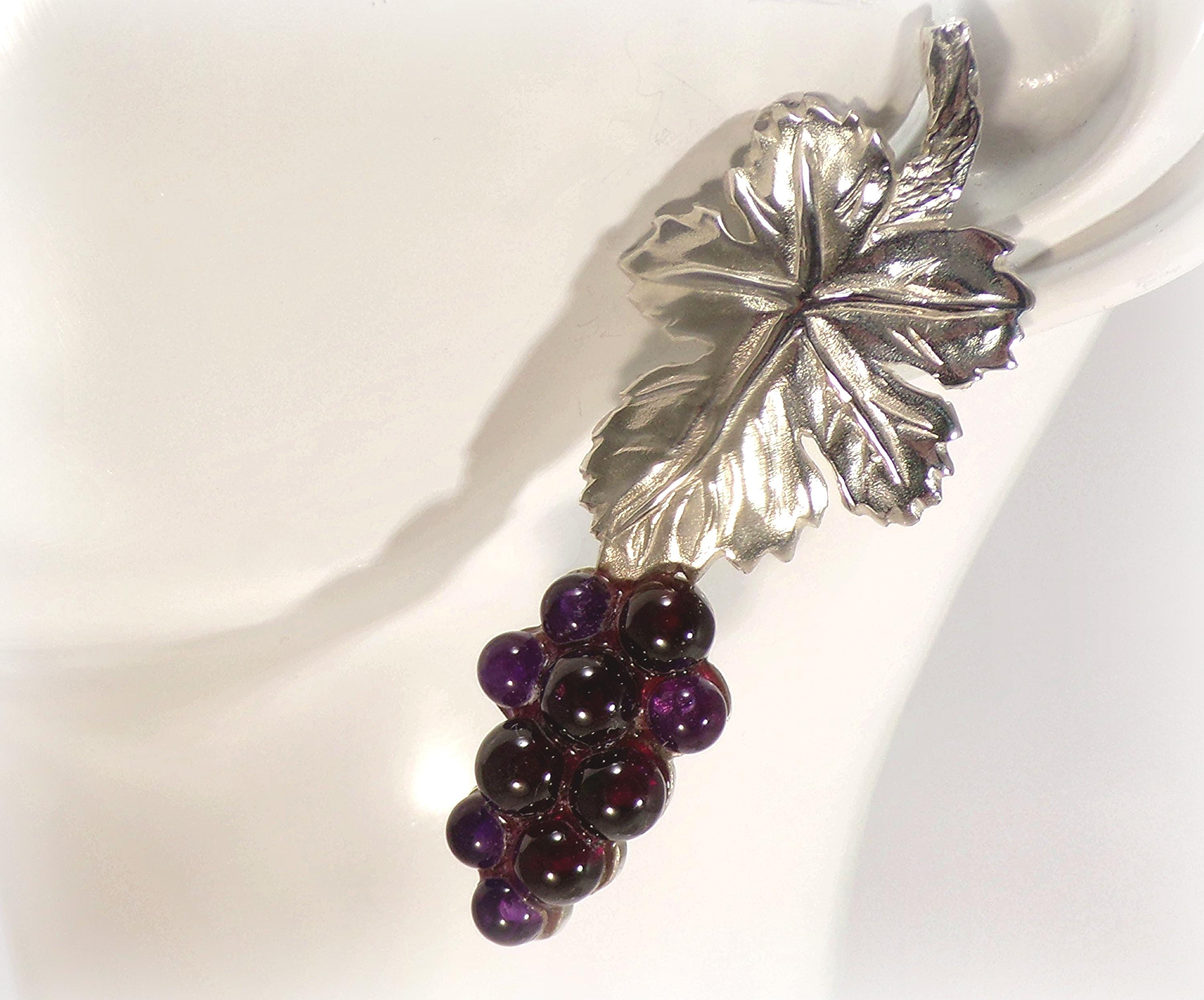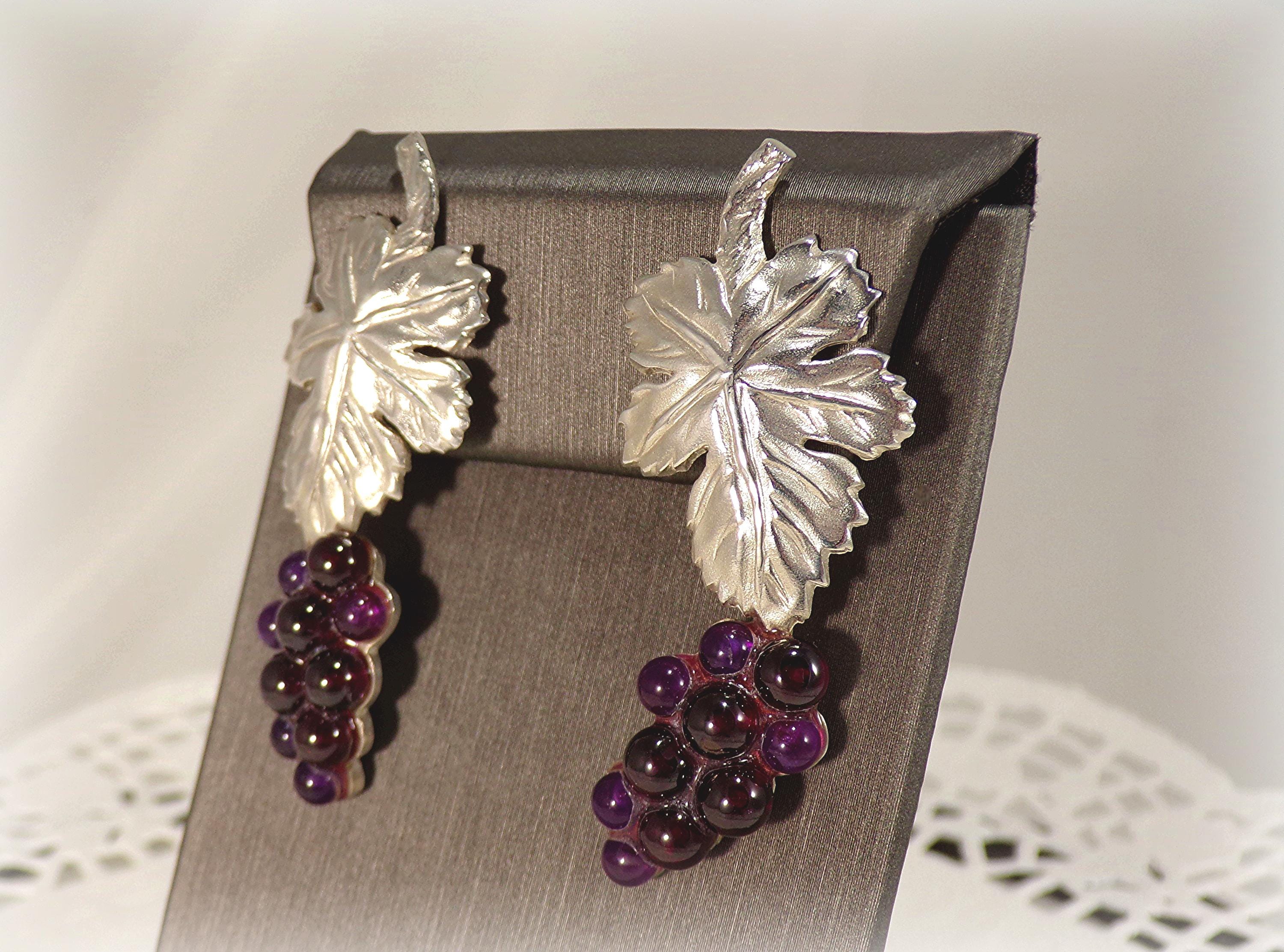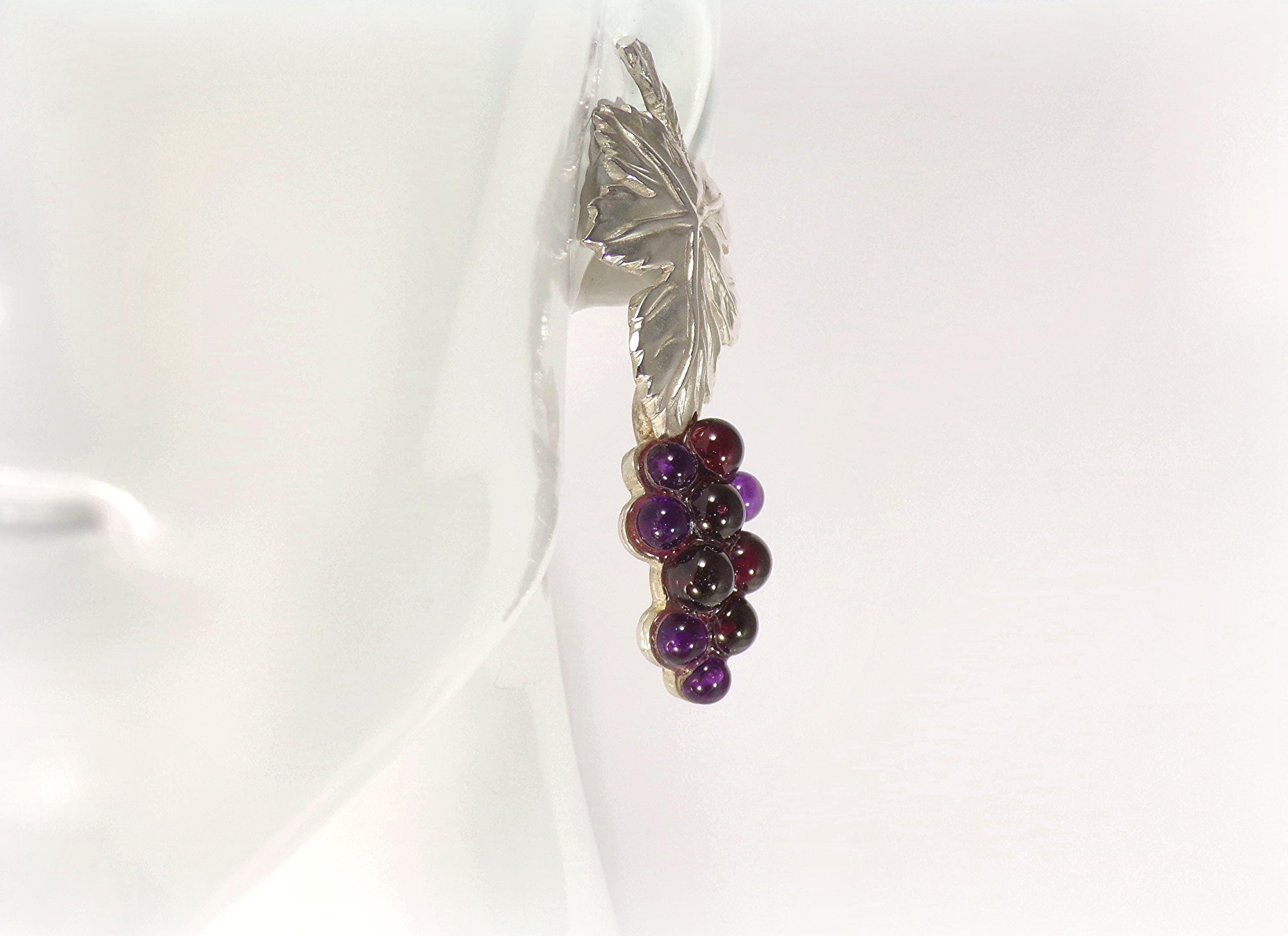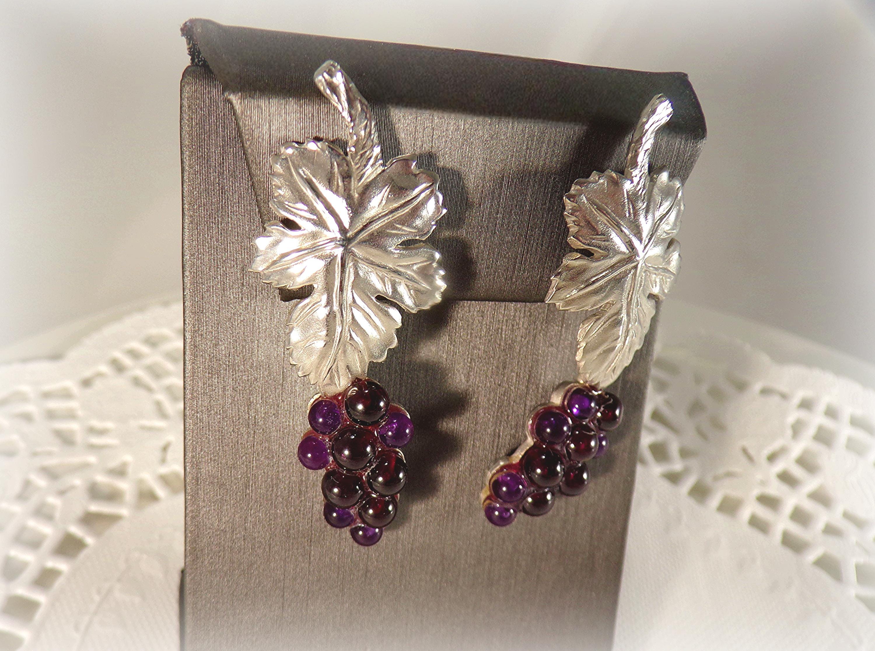 Earrings – Grapes and Leaf – Amethyst – 925 Sterling Silver – Vintage