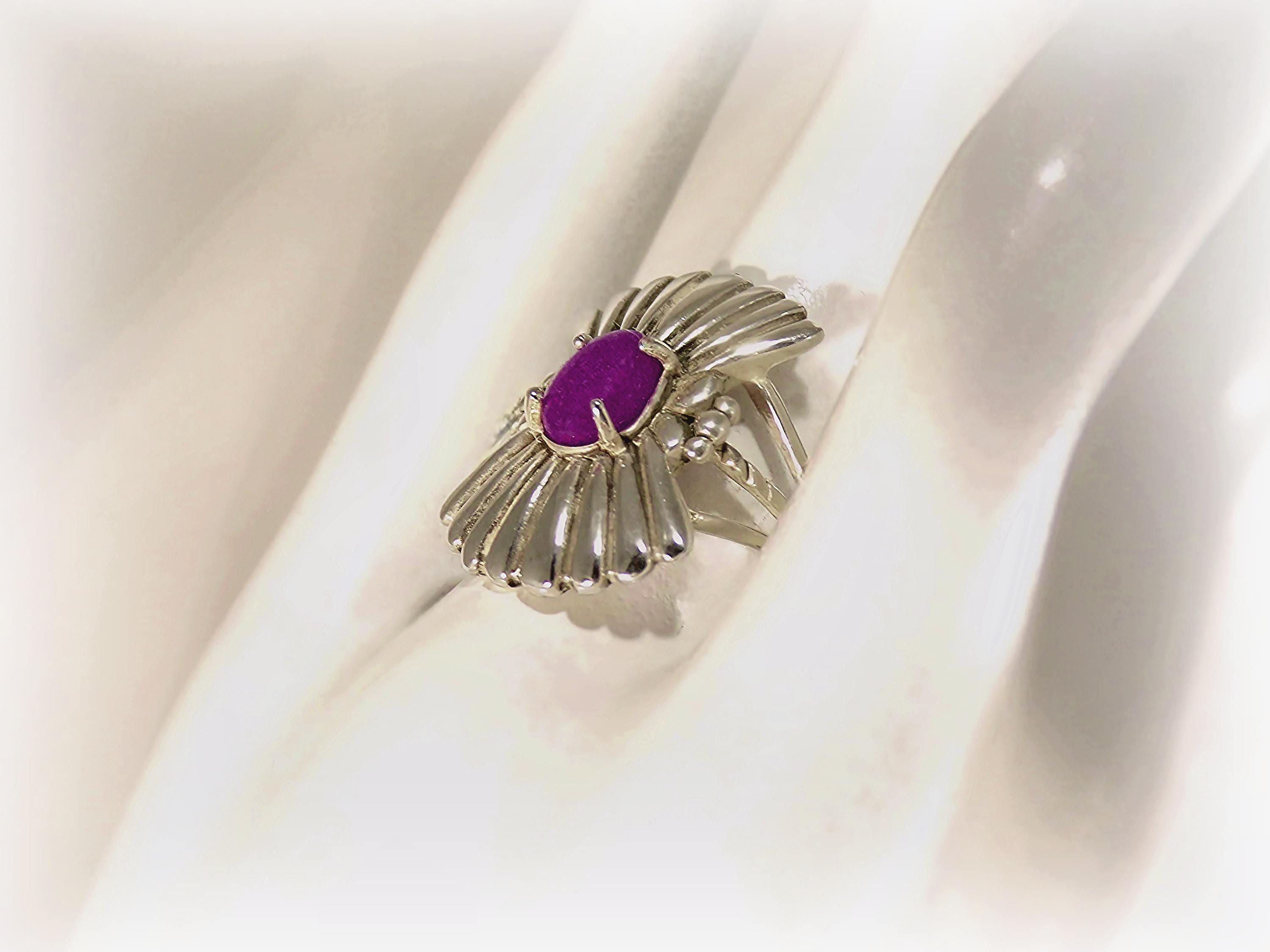 An unusual and unique Shield Ring with a Violet Jadeite Gemstone in Sterling Silver. The Violet Jadeite represents growth, promotes calmness and harmony, and inspires creativity. The craftsman of this statement ring put a meaningful artistic flair to the design, showcasing the beautiful purple of the gemstone.