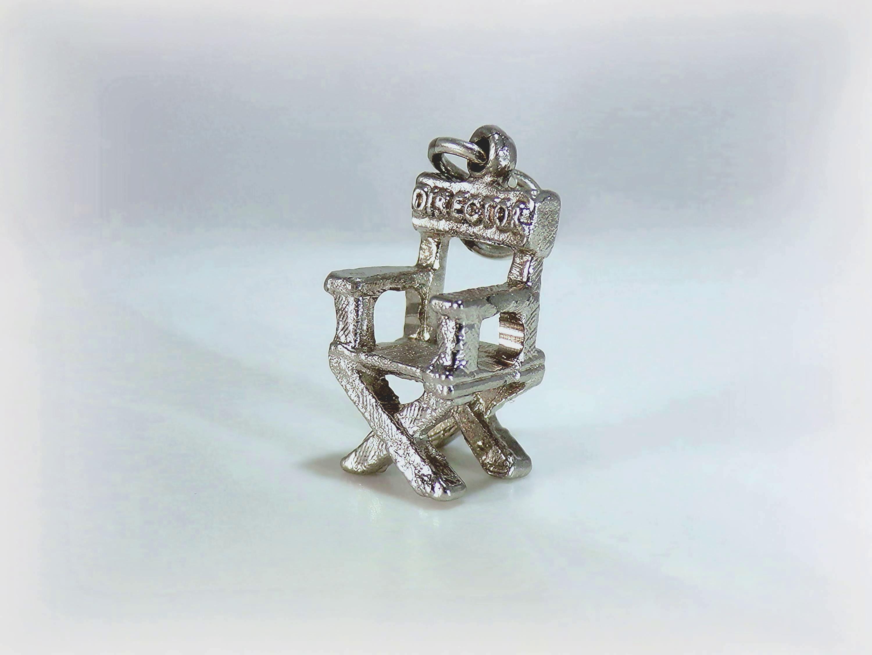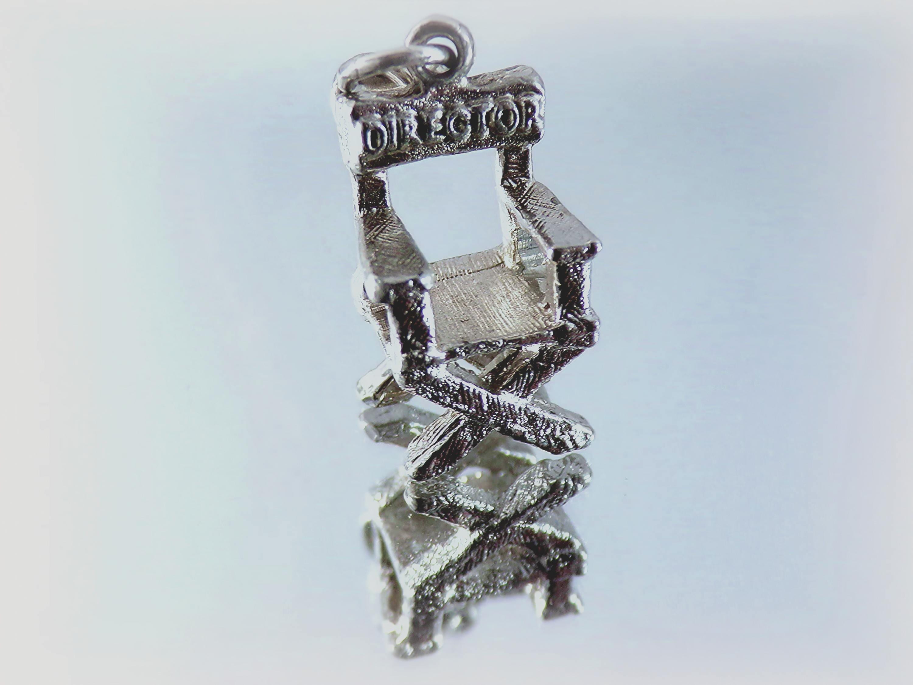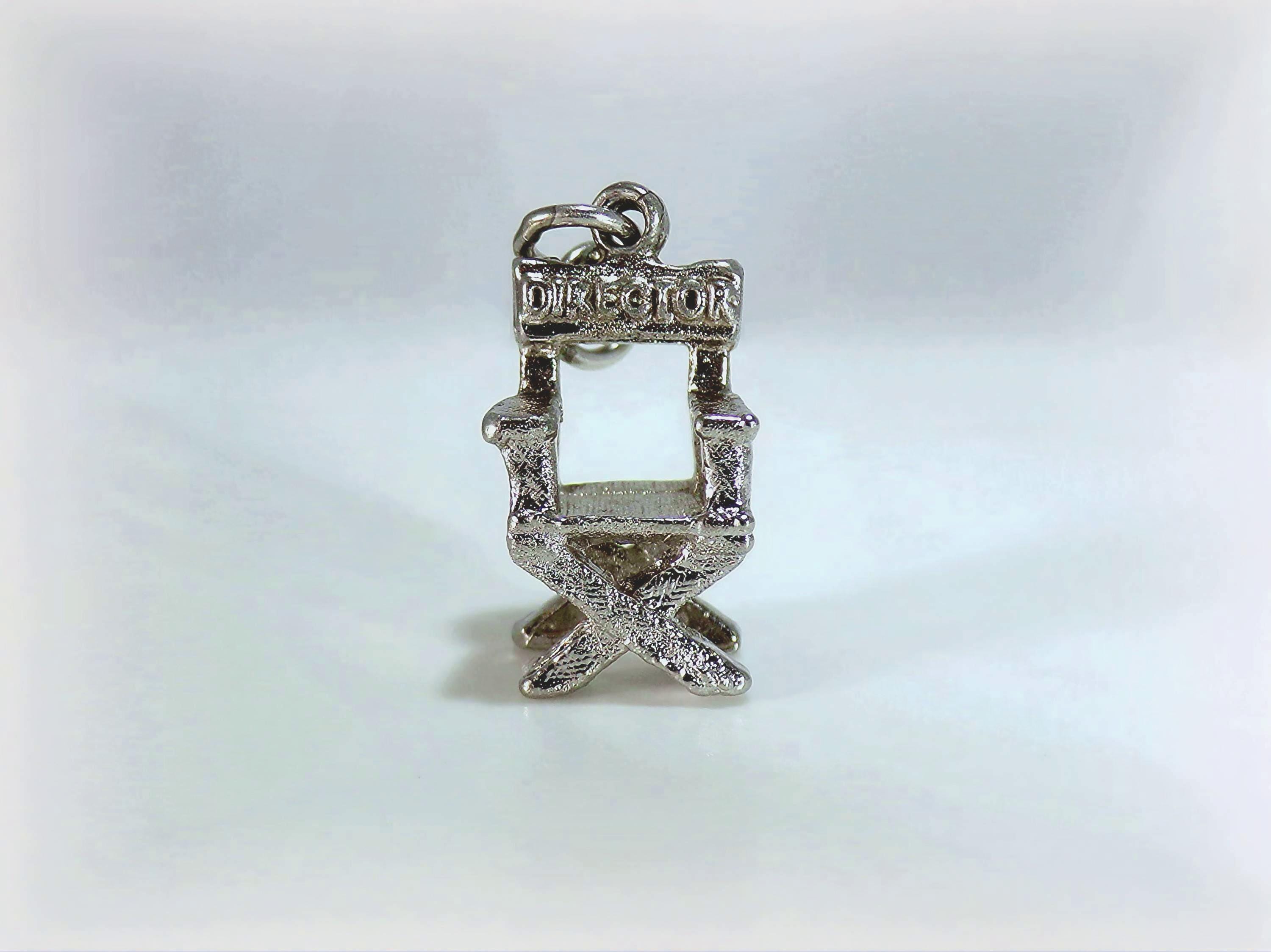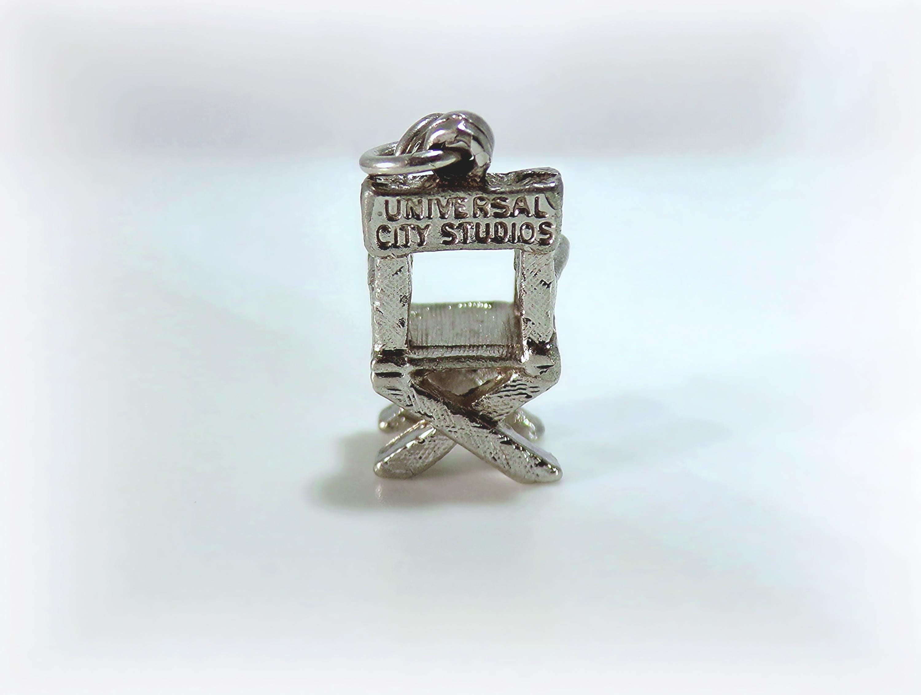 This Universal City Studios Director Chair Charm in Sterling Silver is light enough to be attached to a bracelet, yet hefty enough as a stand-alone pendant on a necklace. The quality craftsmanship with thoughtful details including etching along the legs, arms, and seat of the chair is unmatched in the current marketplace of this vintage piece. Shaped in the classic movie director's chair, this is an impressive gift for the fan of Hollywood, and the lover of movie and film-making.