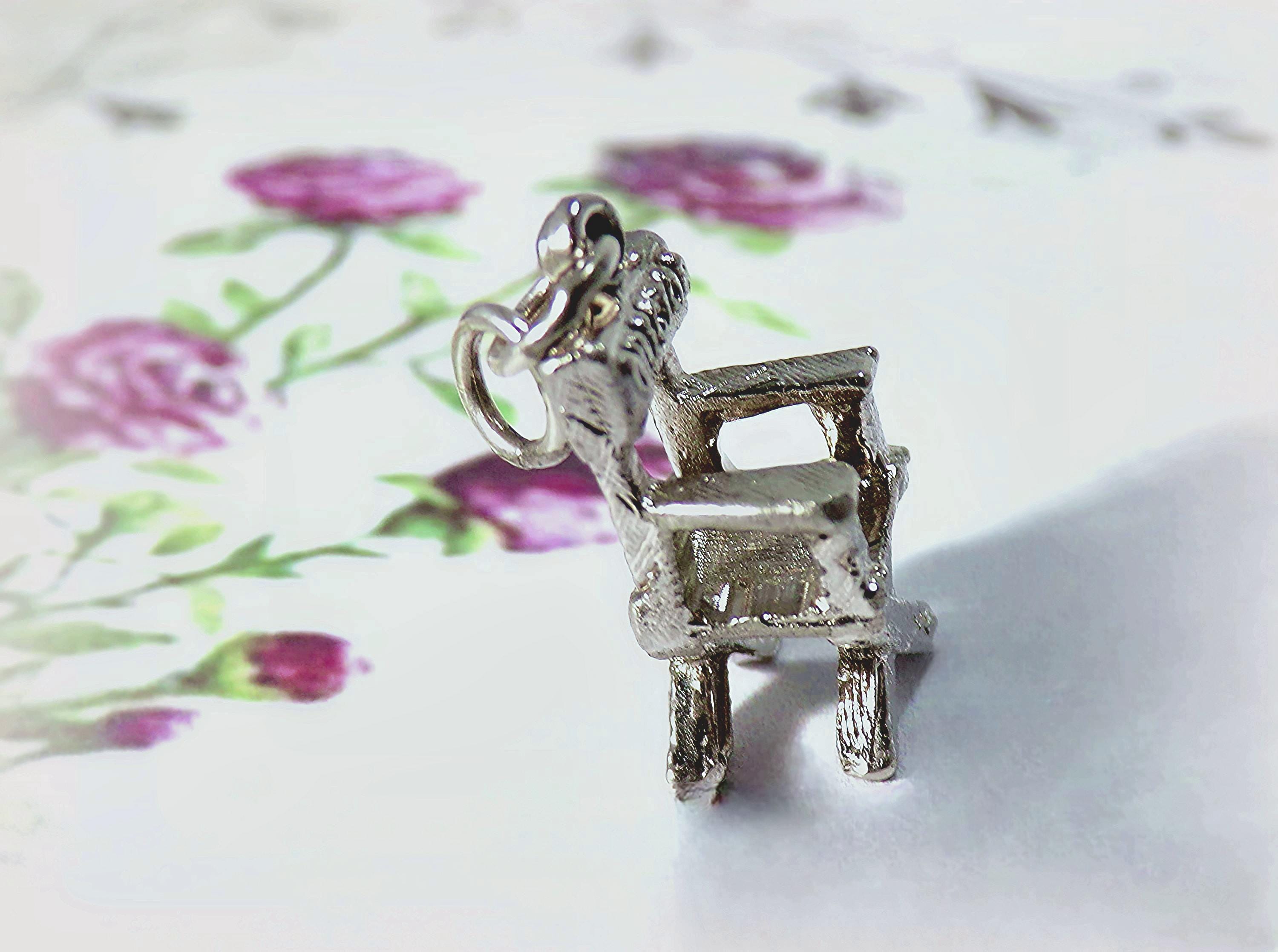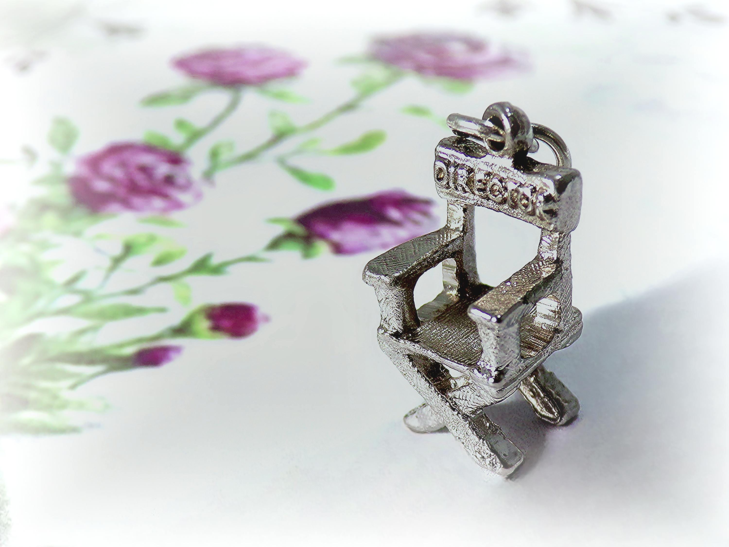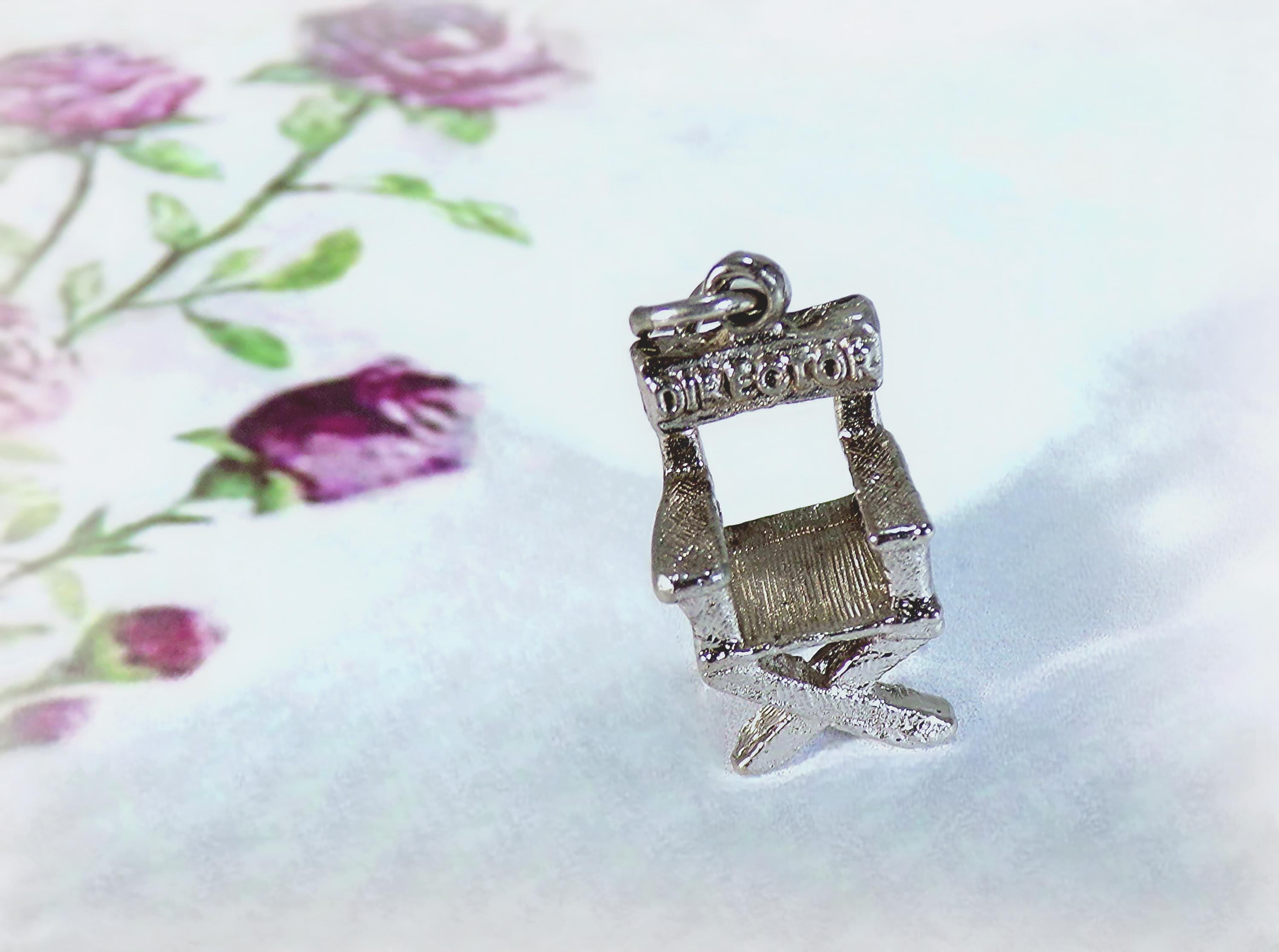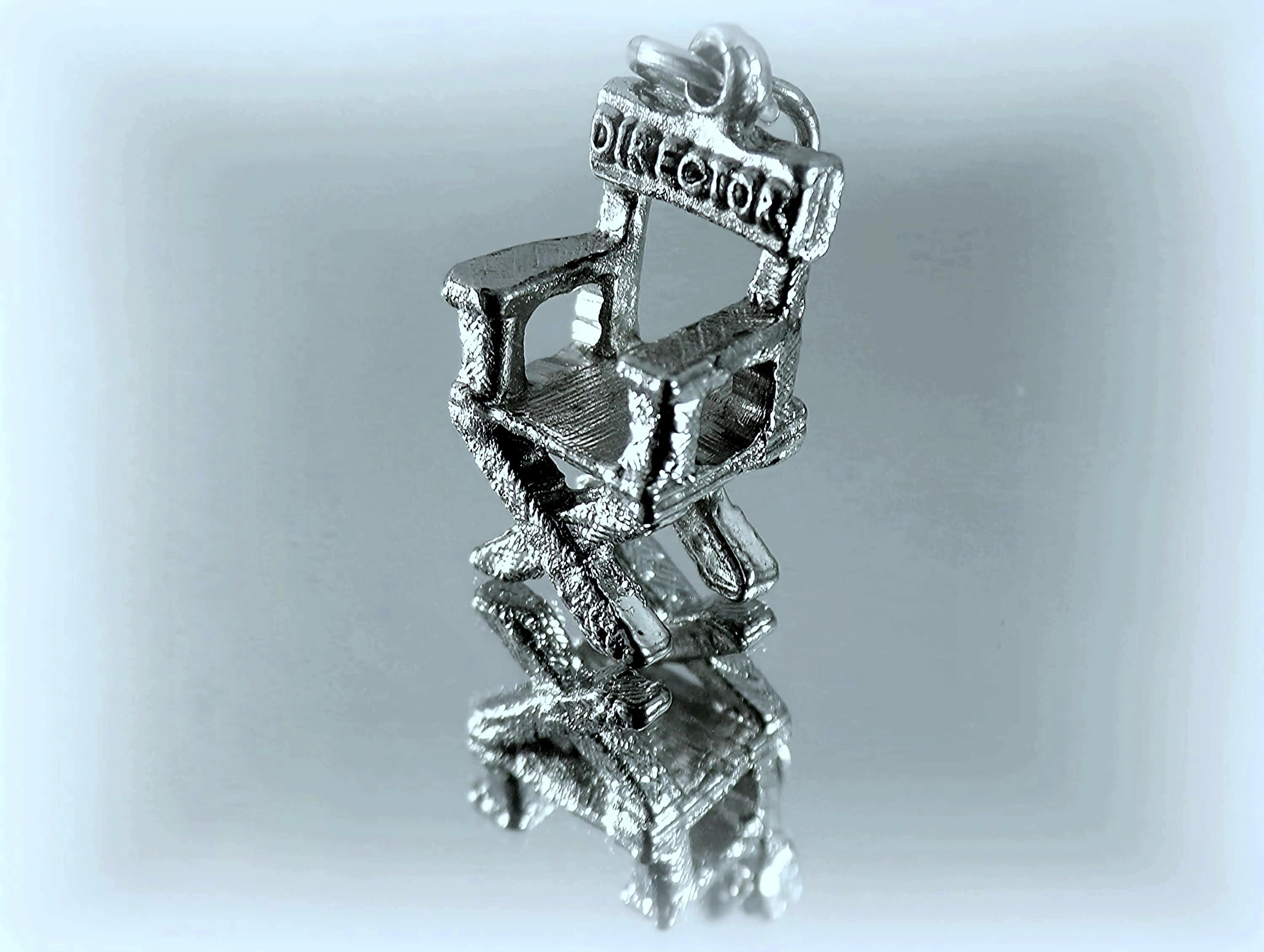 This Universal City Studios Director Chair Charm in Sterling Silver is light enough to be attached to a bracelet, yet hefty enough as a stand-alone pendant on a necklace. The quality craftsmanship with thoughtful details including etching along the legs, arms, and seat of the chair is unmatched in the current marketplace of this vintage piece. Shaped in the classic movie director's chair, this is an impressive gift for the fan of Hollywood, and the lover of movie and film-making.