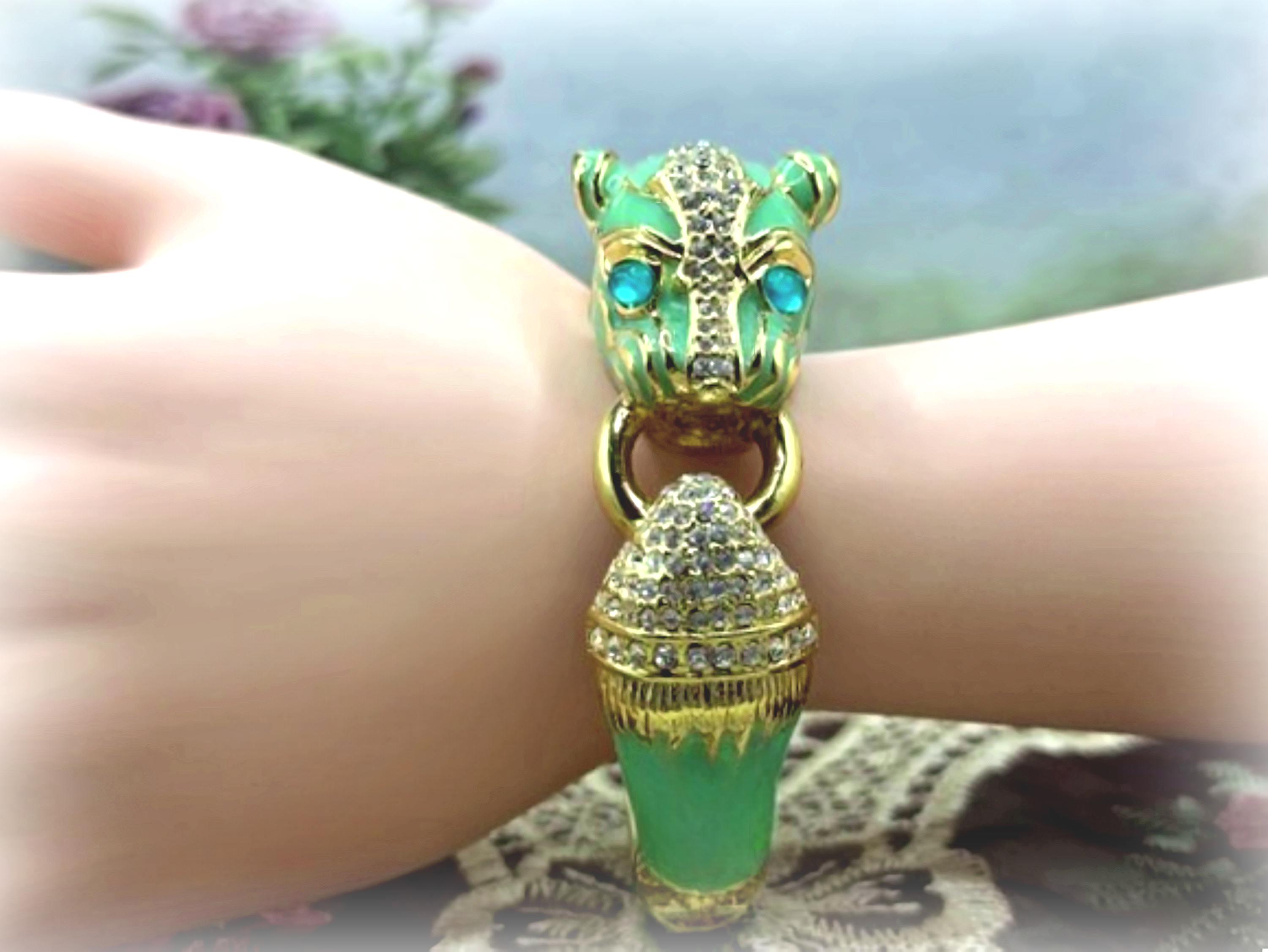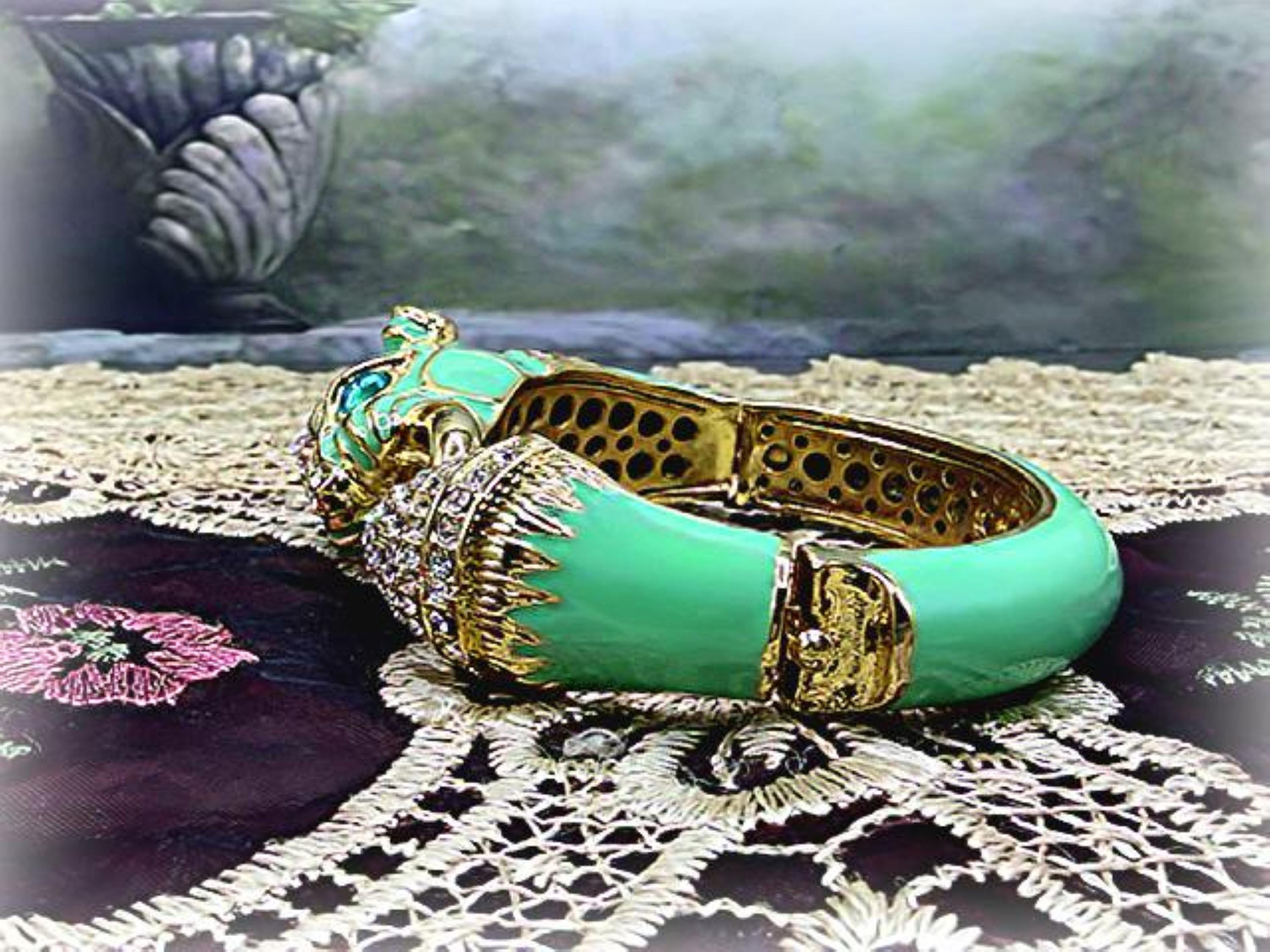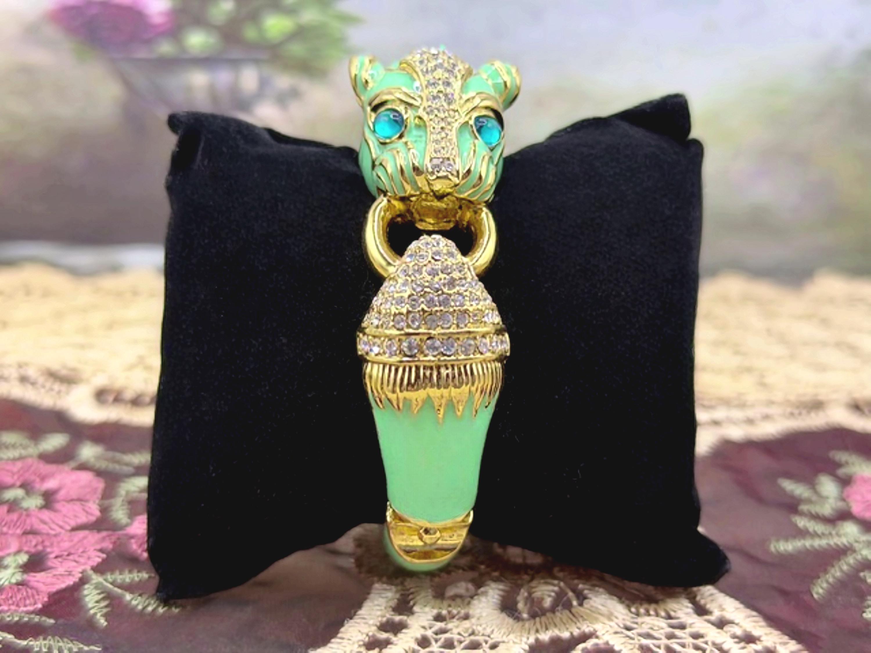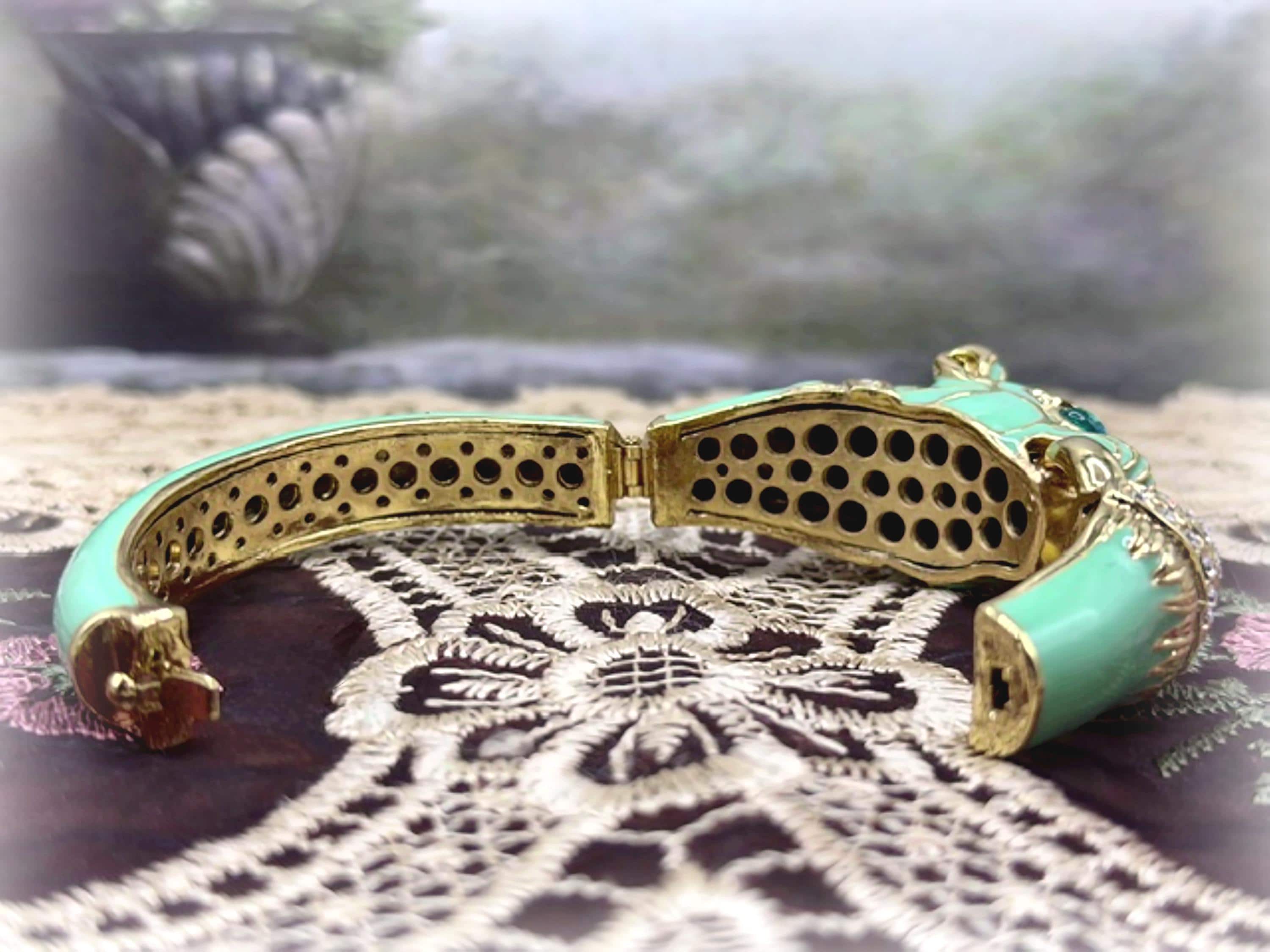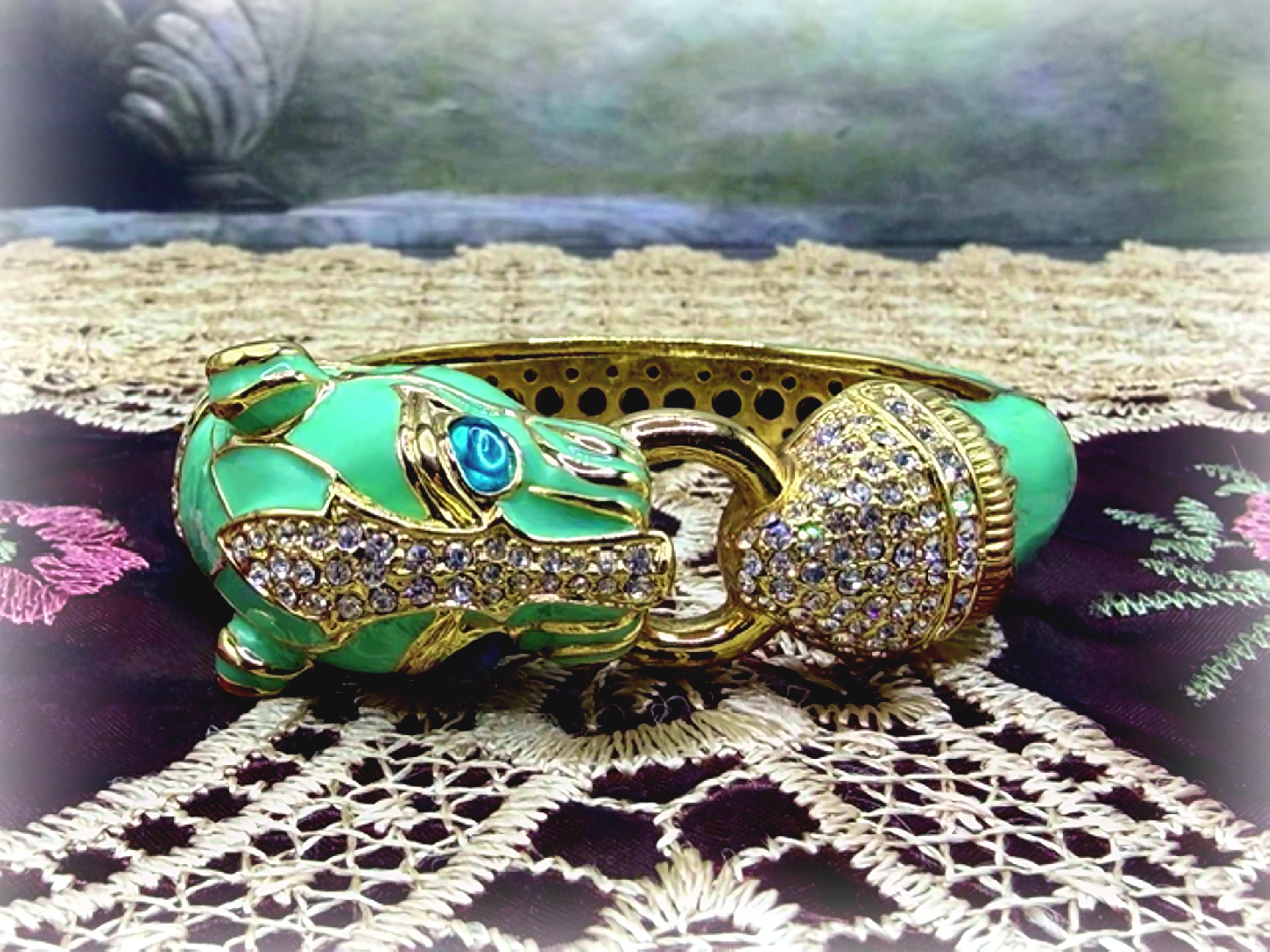 What a fabulous Bracelet!! This is a rhinestone encrusted bracelet that has gold detailing and trim. The inside of the bangle is also detailed in a gold medal. On the outside of the bangle is a truly beautiful color Turquoise enameling. The Turquoise Enamel is smooth, rich and vibrant! And then we have the rhinestone detailing throughout the face and between the eyes and onto the other side of the gold ring that is being held by the cat’s mouth. The eyes are stunning blue glass and the Cloisonne gold trim detail is wonderful. Love this bracelet, it is so retro-cool!! This is a hinged bangle that is easy to open and close and it is surprisingly a pretty comfortable wear.