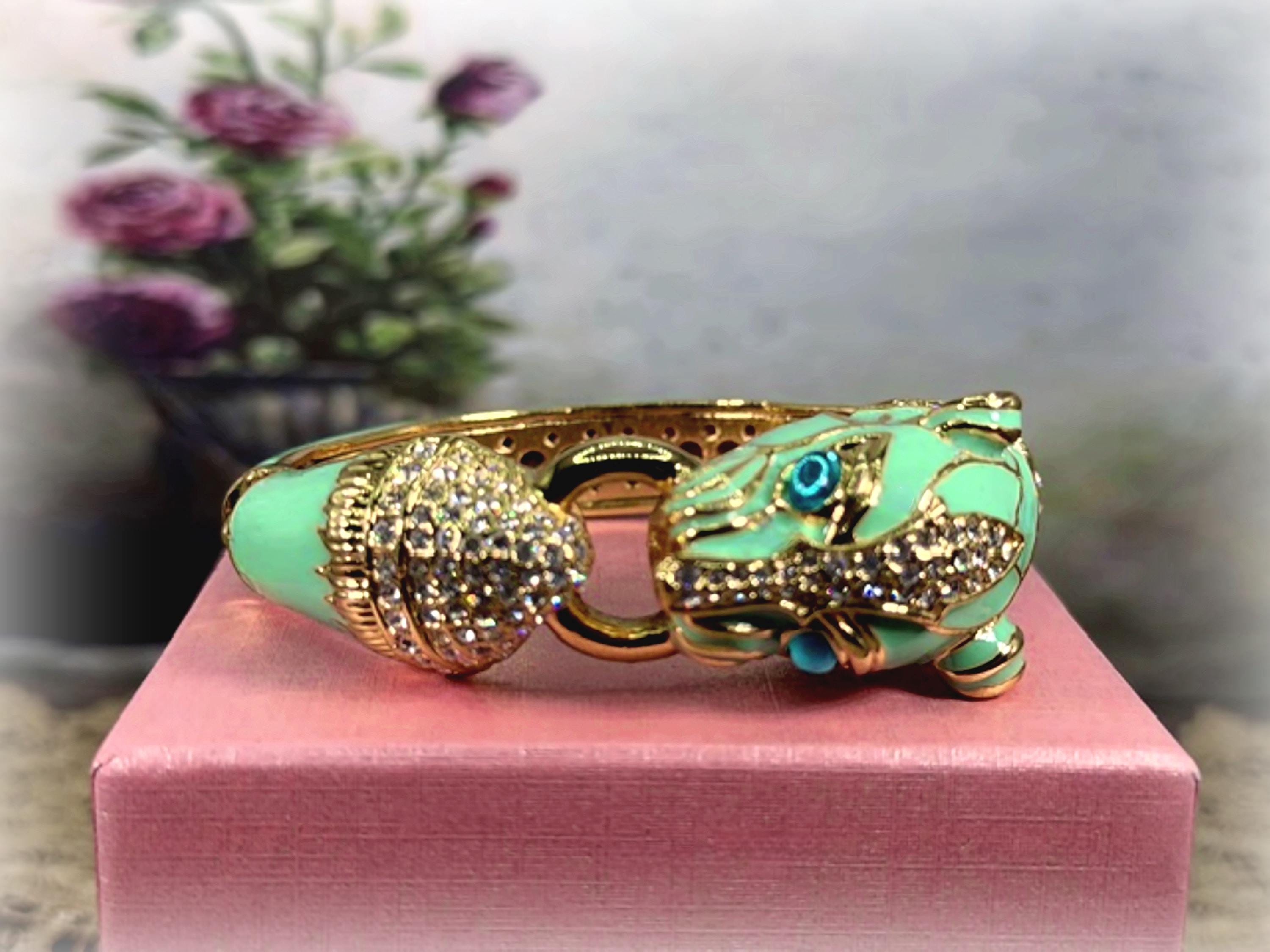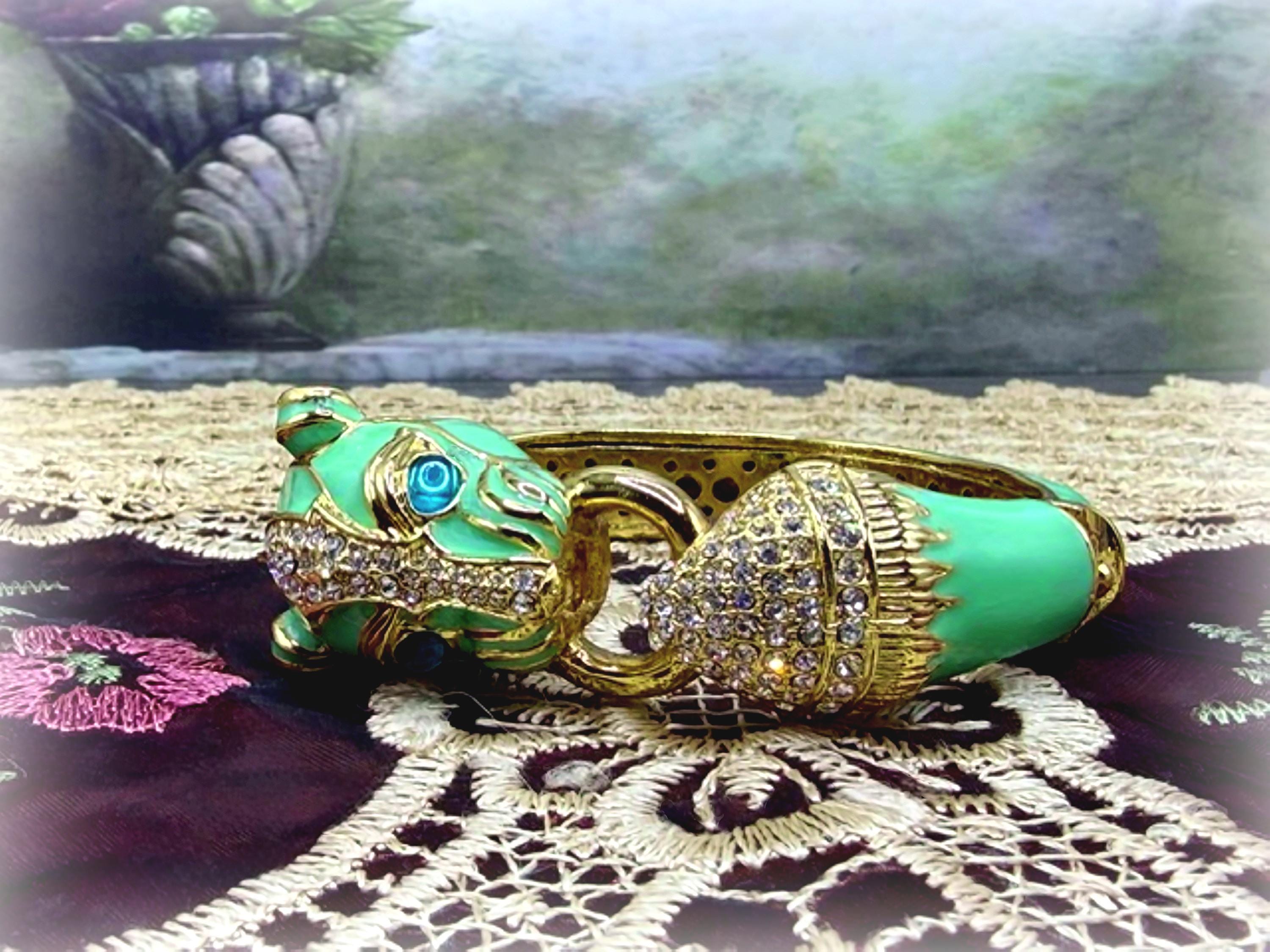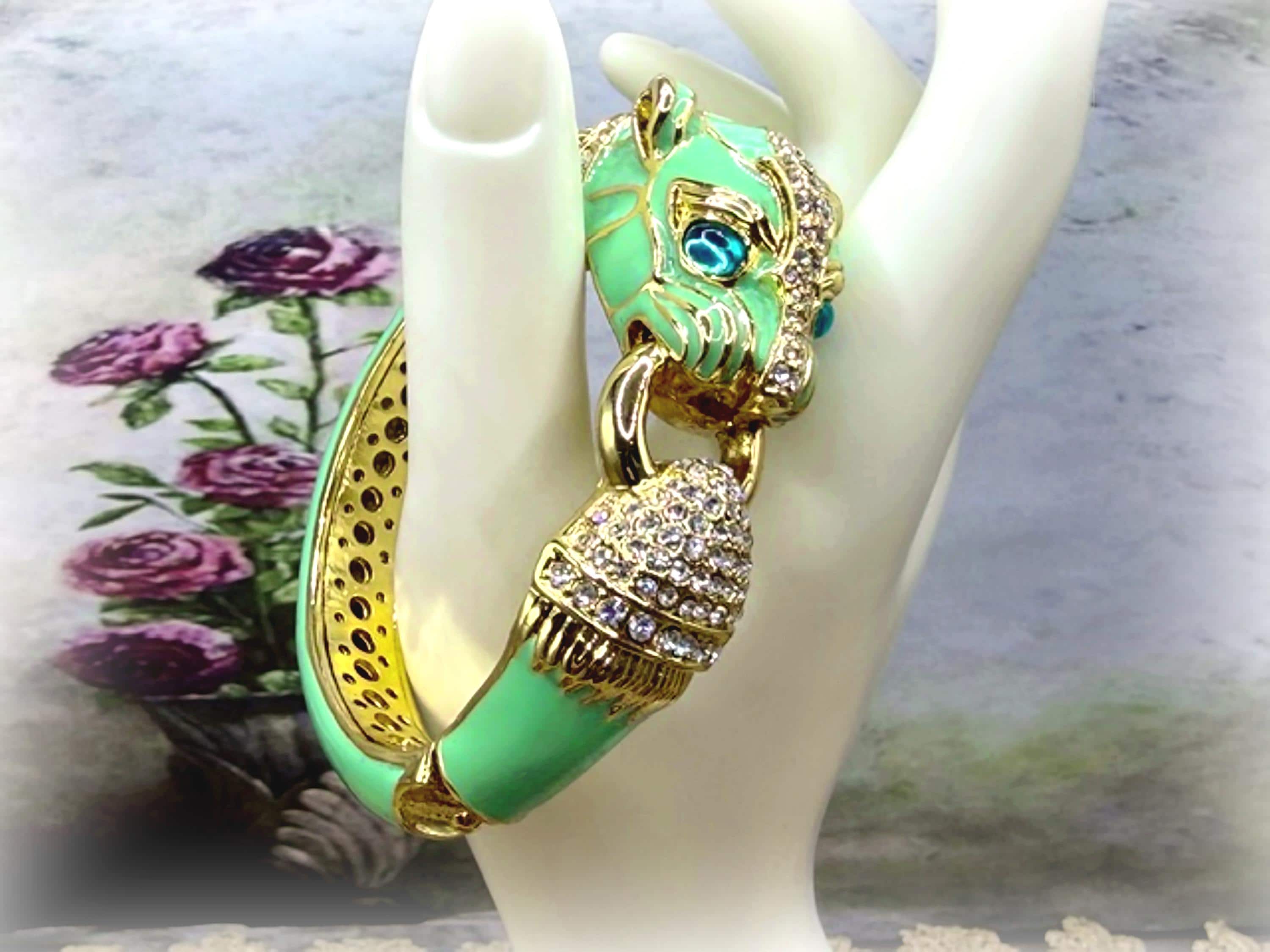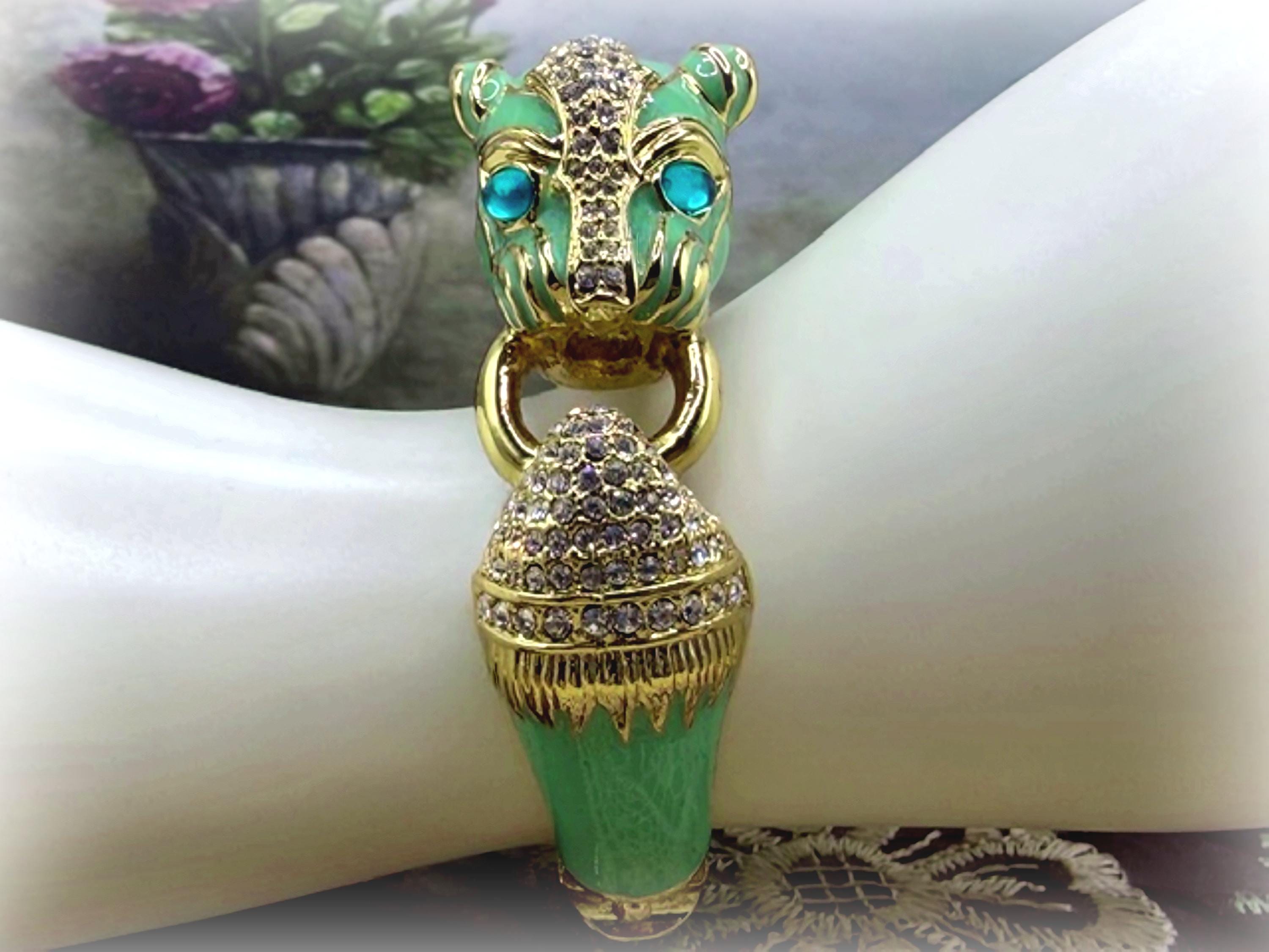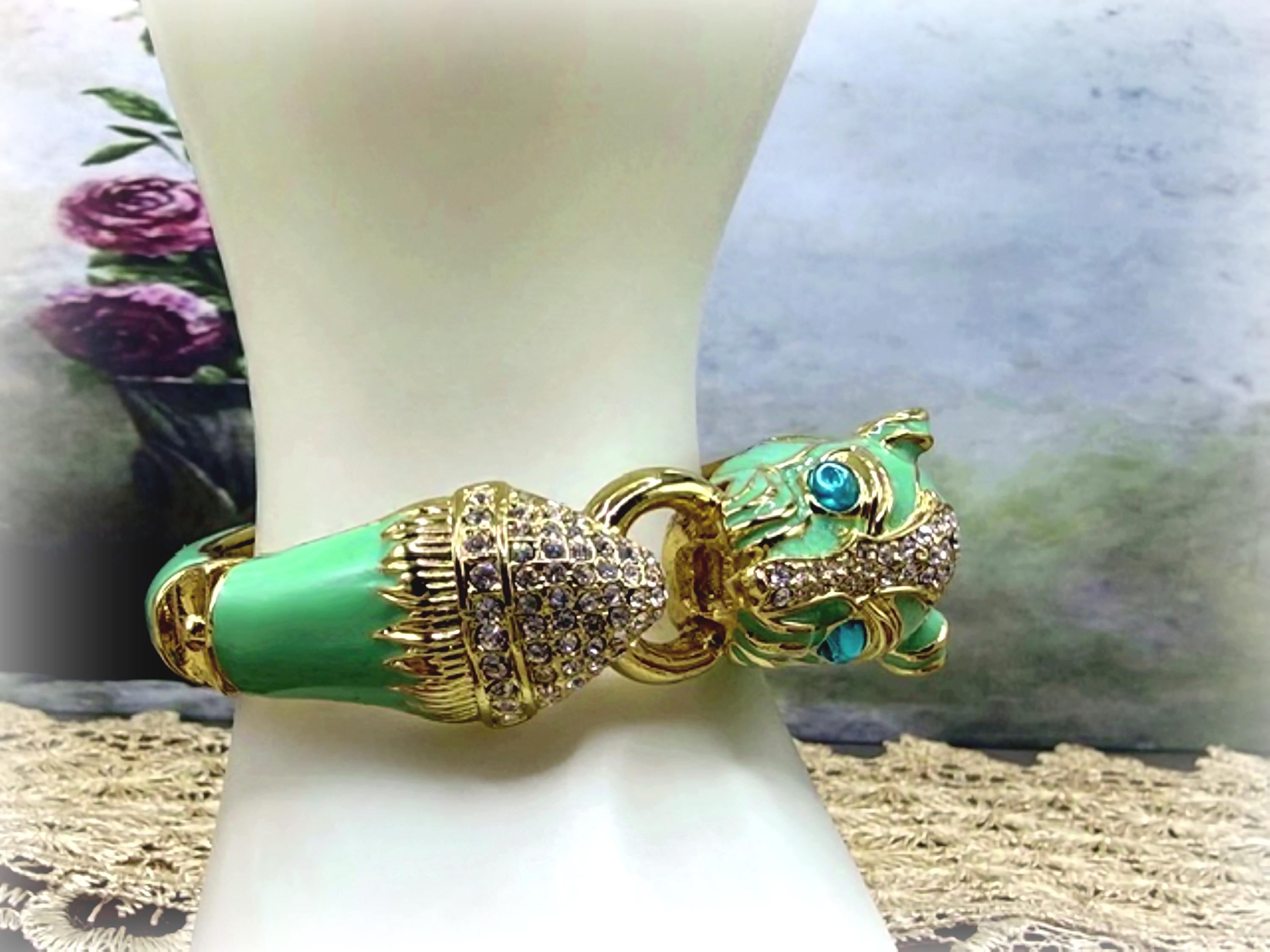 What a fabulous Bracelet!! This is a rhinestone encrusted bracelet that has gold detailing and trim. The inside of the bangle is also detailed in a gold medal. On the outside of the bangle is a truly beautiful color Turquoise enameling. The Turquoise Enamel is smooth, rich and vibrant! And then we have the rhinestone detailing throughout the face and between the eyes and onto the other side of the gold ring that is being held by the cat’s mouth. The eyes are stunning blue glass and the Cloisonne gold trim detail is wonderful. Love this bracelet, it is so retro-cool!! This is a hinged bangle that is easy to open and close and it is surprisingly a pretty comfortable wear.