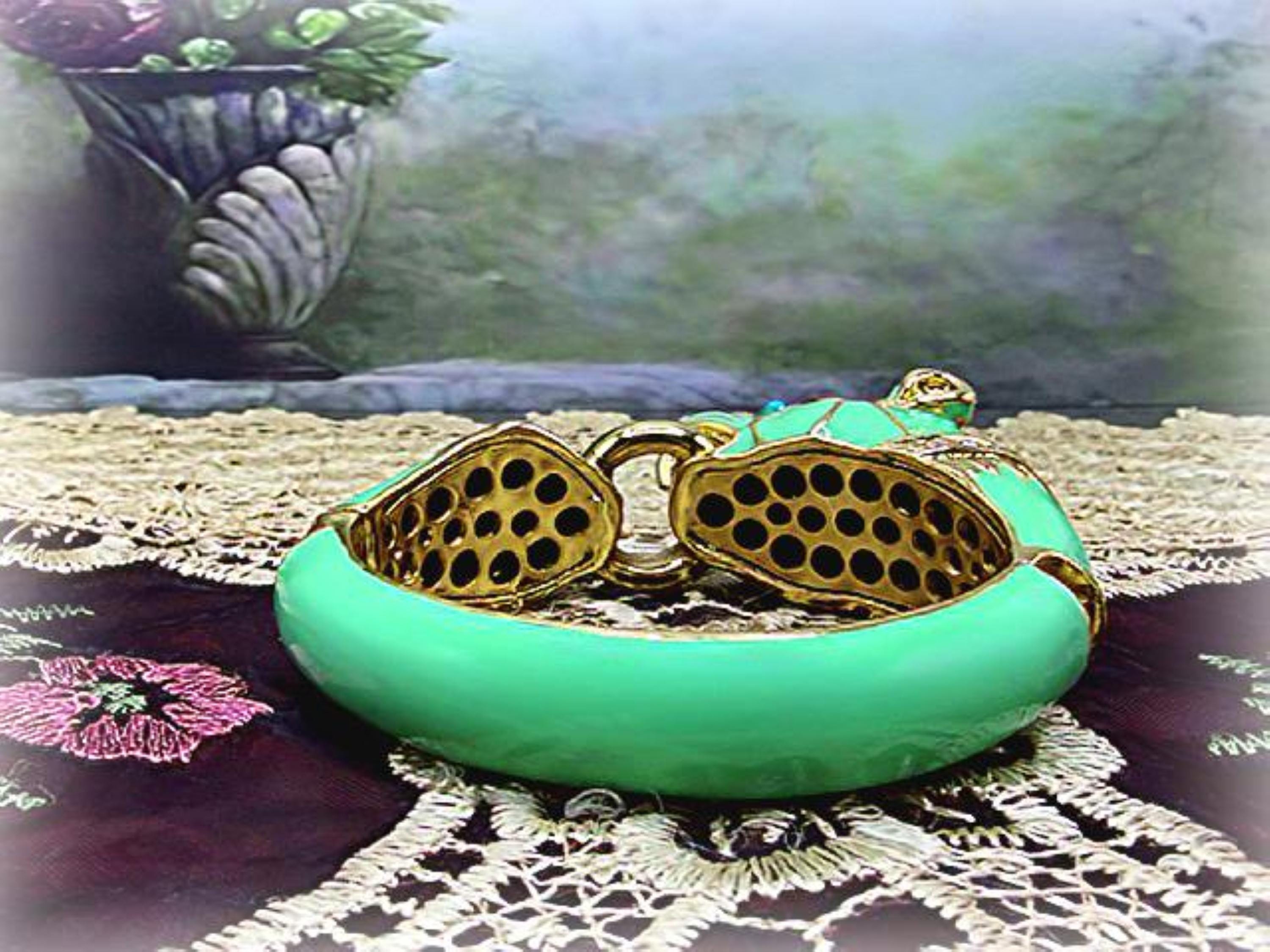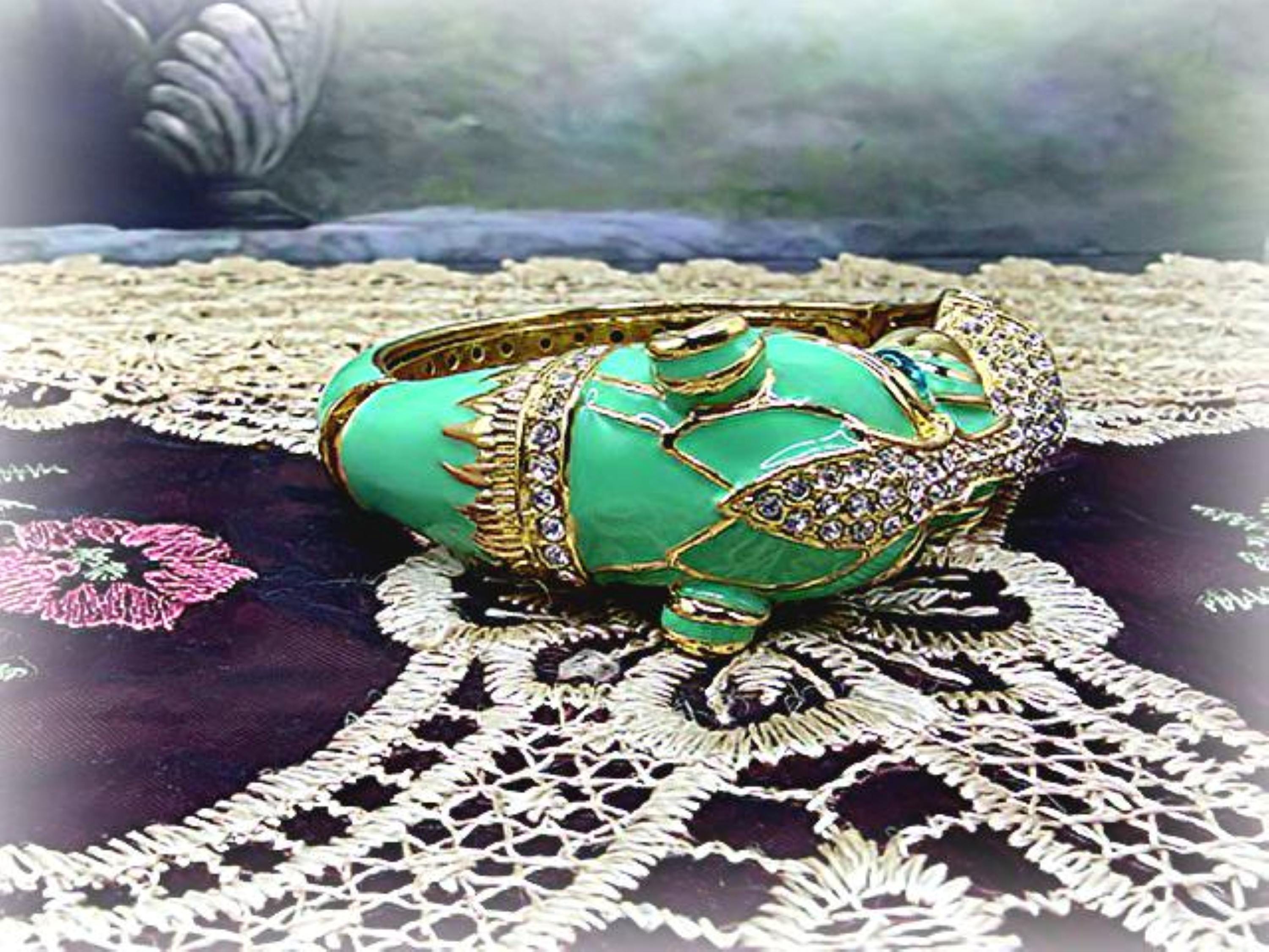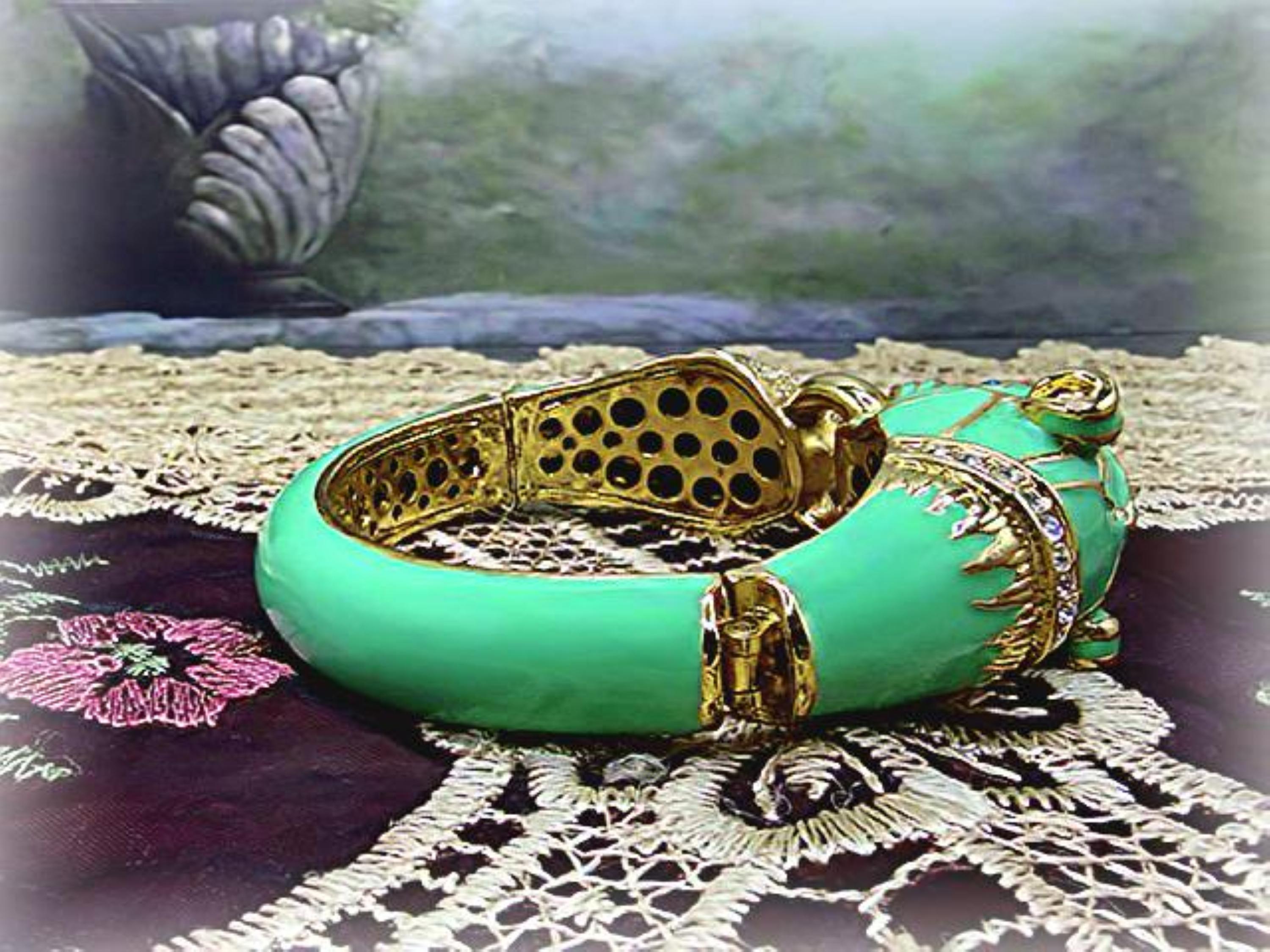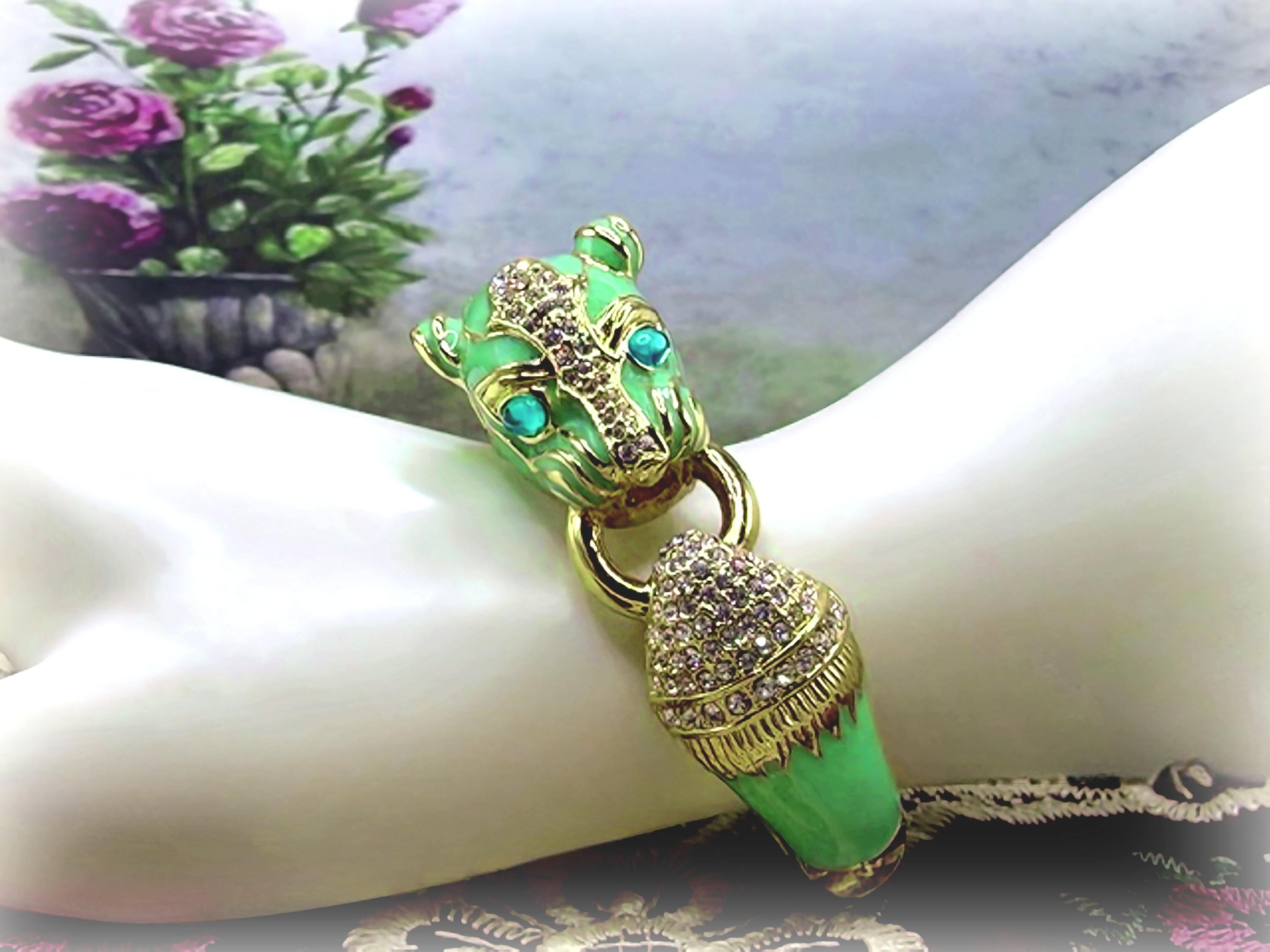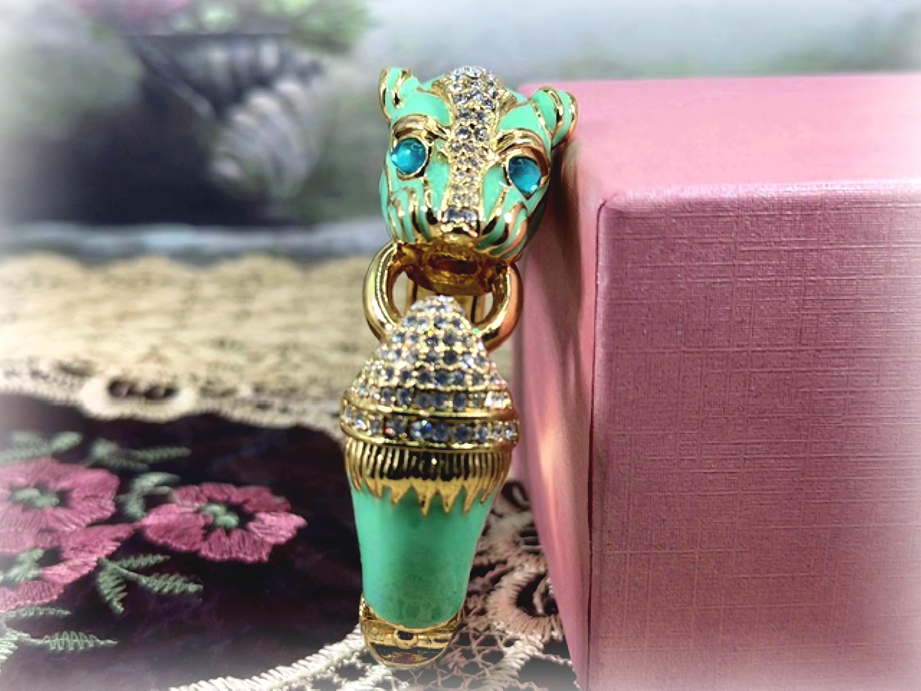 What a fabulous Bracelet!! This is a rhinestone encrusted bracelet that has gold detailing and trim. The inside of the bangle is also detailed in a gold medal. On the outside of the bangle is a truly beautiful color Turquoise enameling. The Turquoise Enamel is smooth, rich and vibrant! And then we have the rhinestone detailing throughout the face and between the eyes and onto the other side of the gold ring that is being held by the cat’s mouth. The eyes are stunning blue glass and the Cloisonne gold trim detail is wonderful. Love this bracelet, it is so retro-cool!! This is a hinged bangle that is easy to open and close and it is surprisingly a pretty comfortable wear.