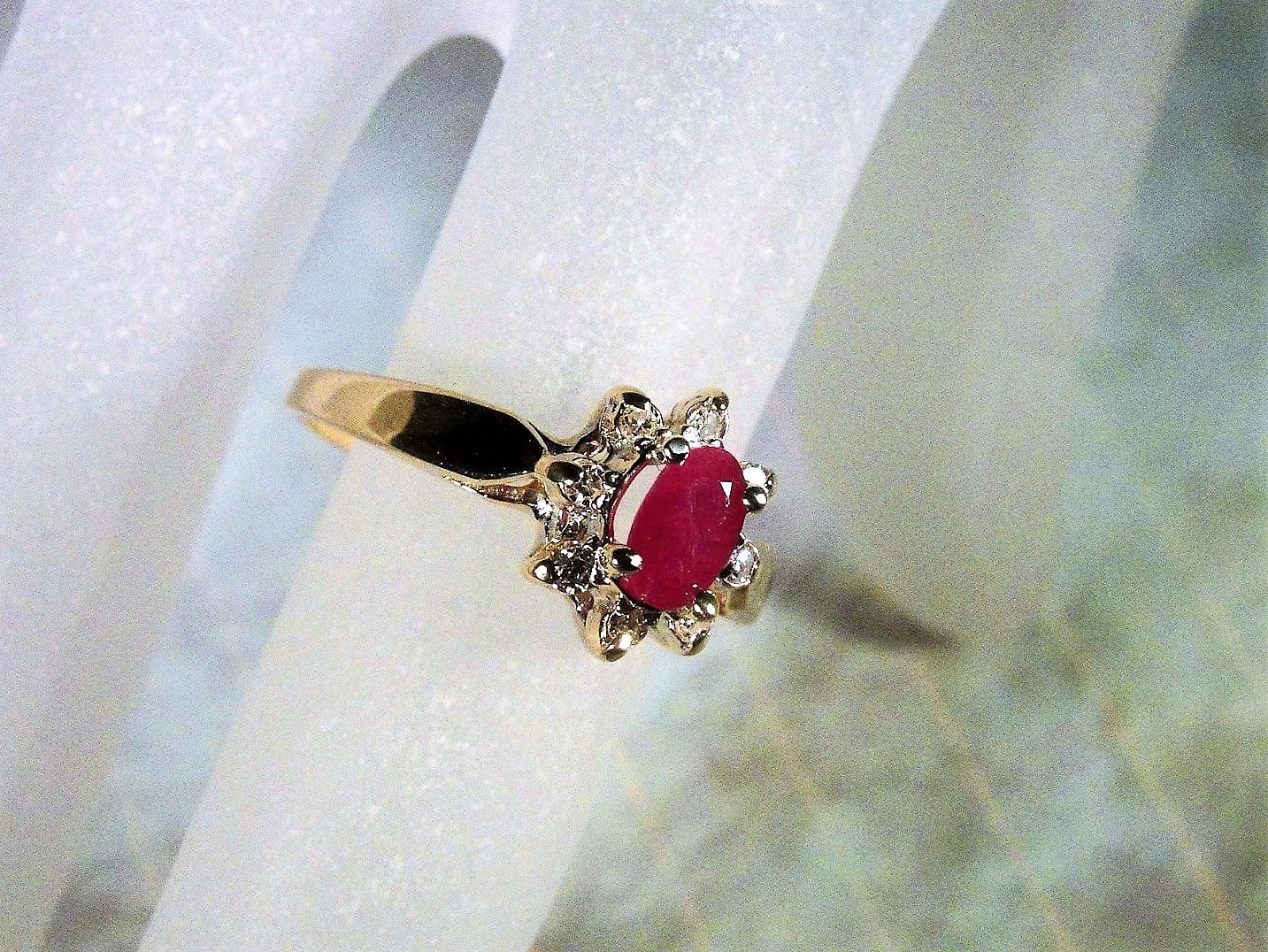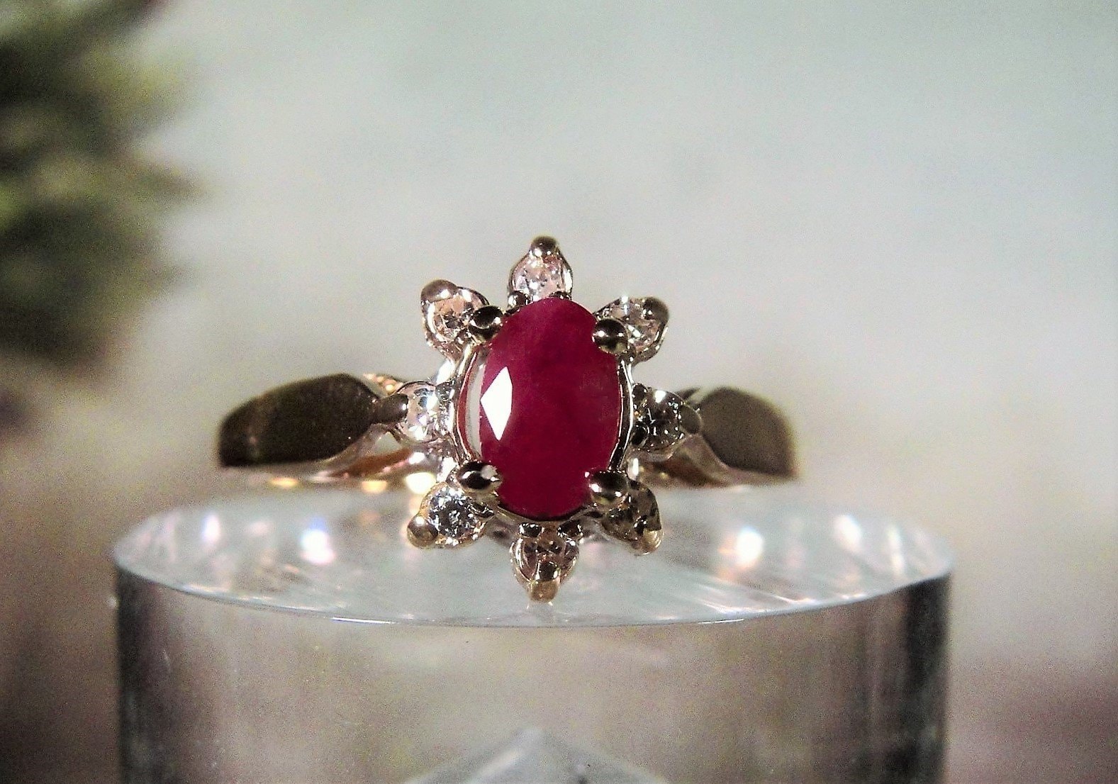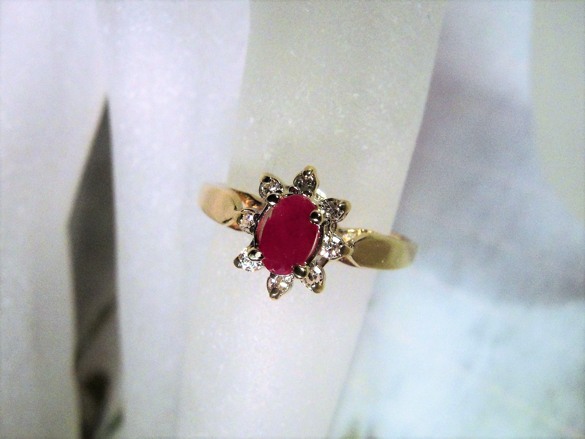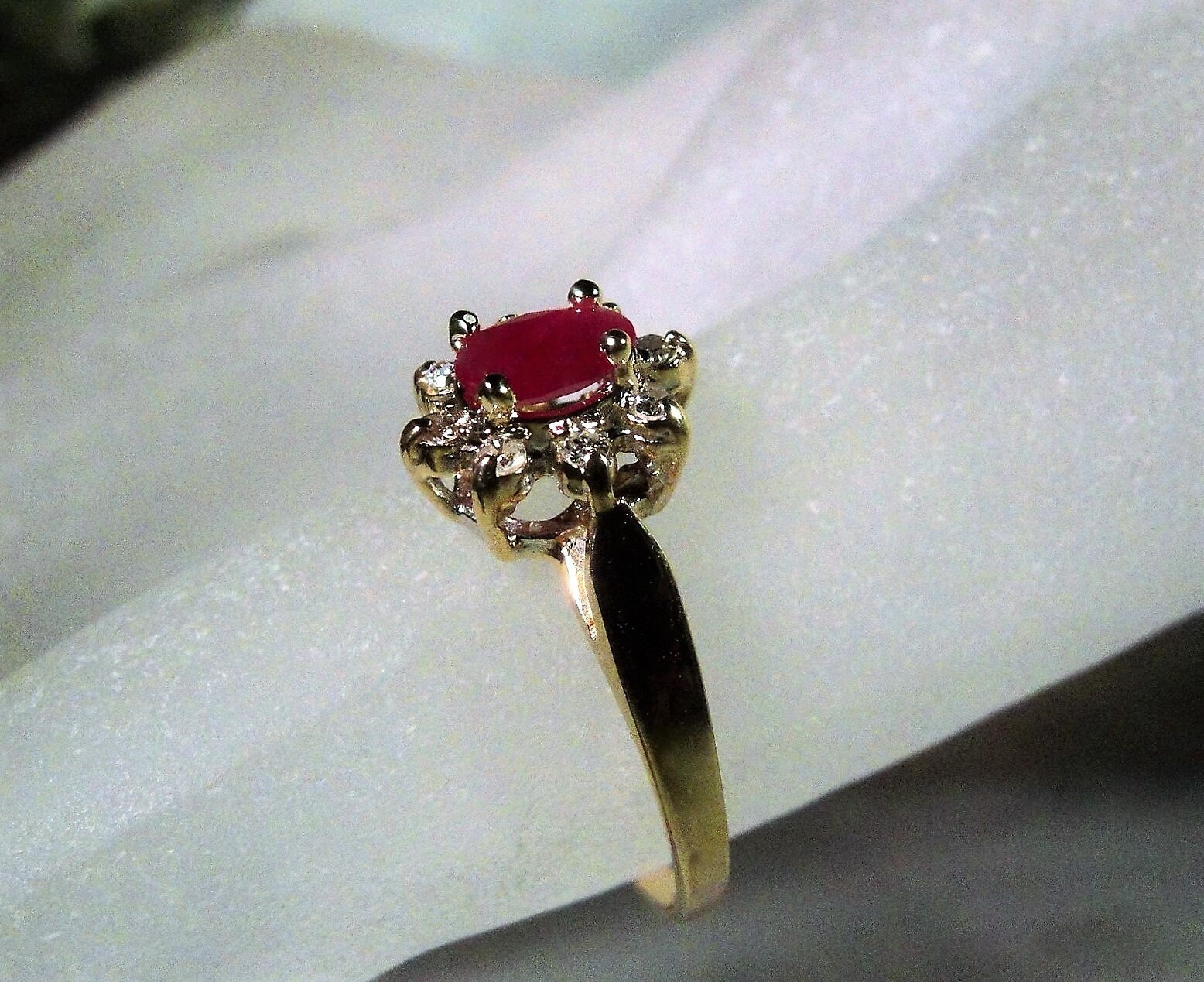 This is the cutest Ruby Red ring with Diamond Accents. The ruby is an oval cut genuine, natural ruby center stone. I just had it set by my jeweler into this 1960s ring. The diamonds are single cut genuine, natural diamonds and are better than eye clean. They are very sparkly and of good size for this ring. The ring is 10K yellow gold with the setting and prongs done in white gold. All gems are prong set. This ring gives a beautiful presentation and can be paired off with stacking rings as well. So cute!