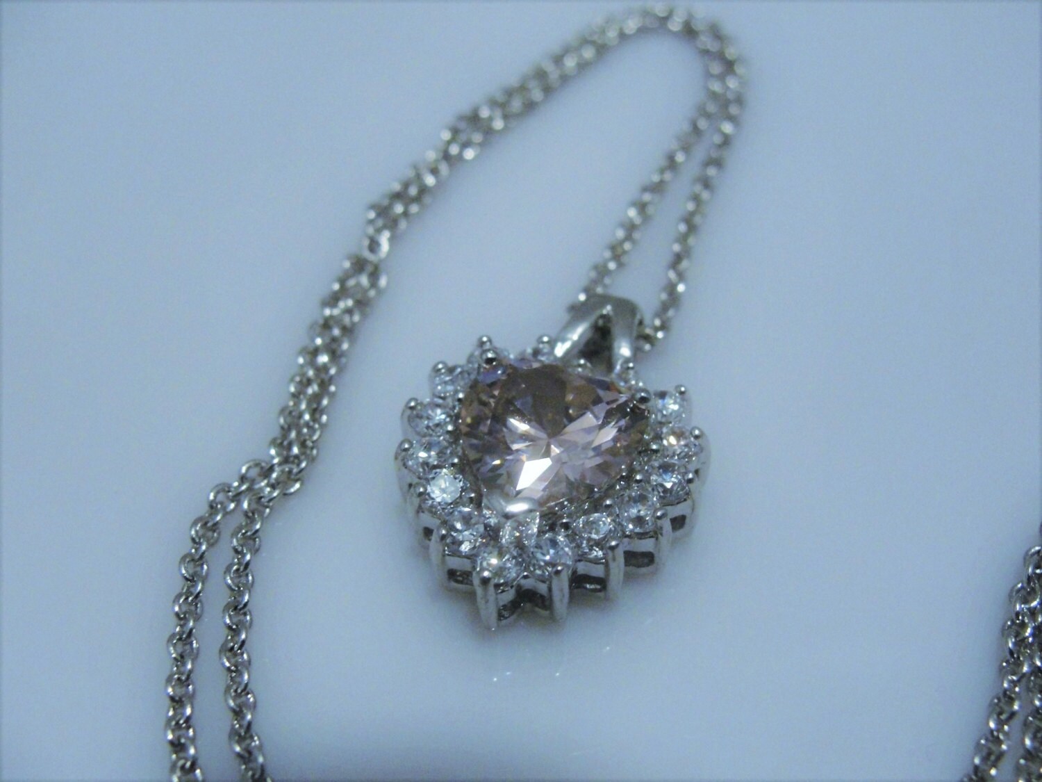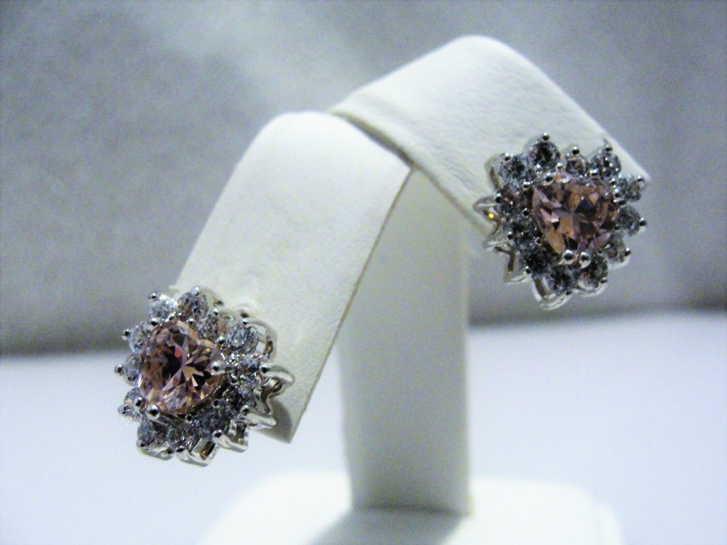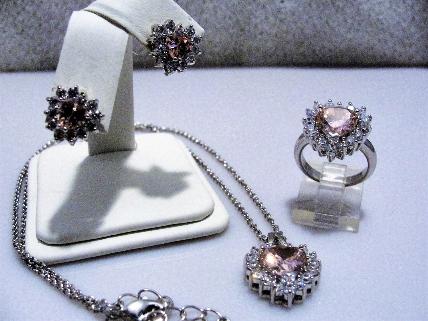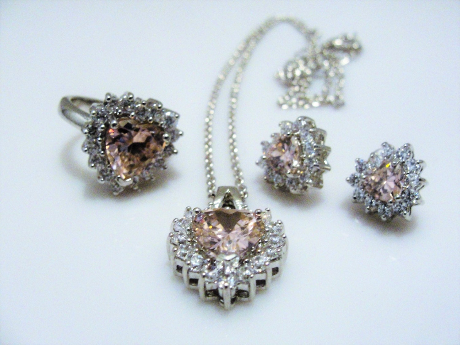 This is a very pretty and feminine Icy Pink Heart Jewelry Set. The set consists of a necklace, pendant style, Pierced Stud Earrings and a lovely heart shaped Ring. The set is a pale pink, but not pale enough that the color pink doesn’t come through. It really is a perfect light pink. Each piece has one pink heart with clear round crystals surrounding it. Each piece has a very nice sized heart, they are not petite, but more towards medium and not overly done. But good sized. A beautiful set done in a silver tone metal.