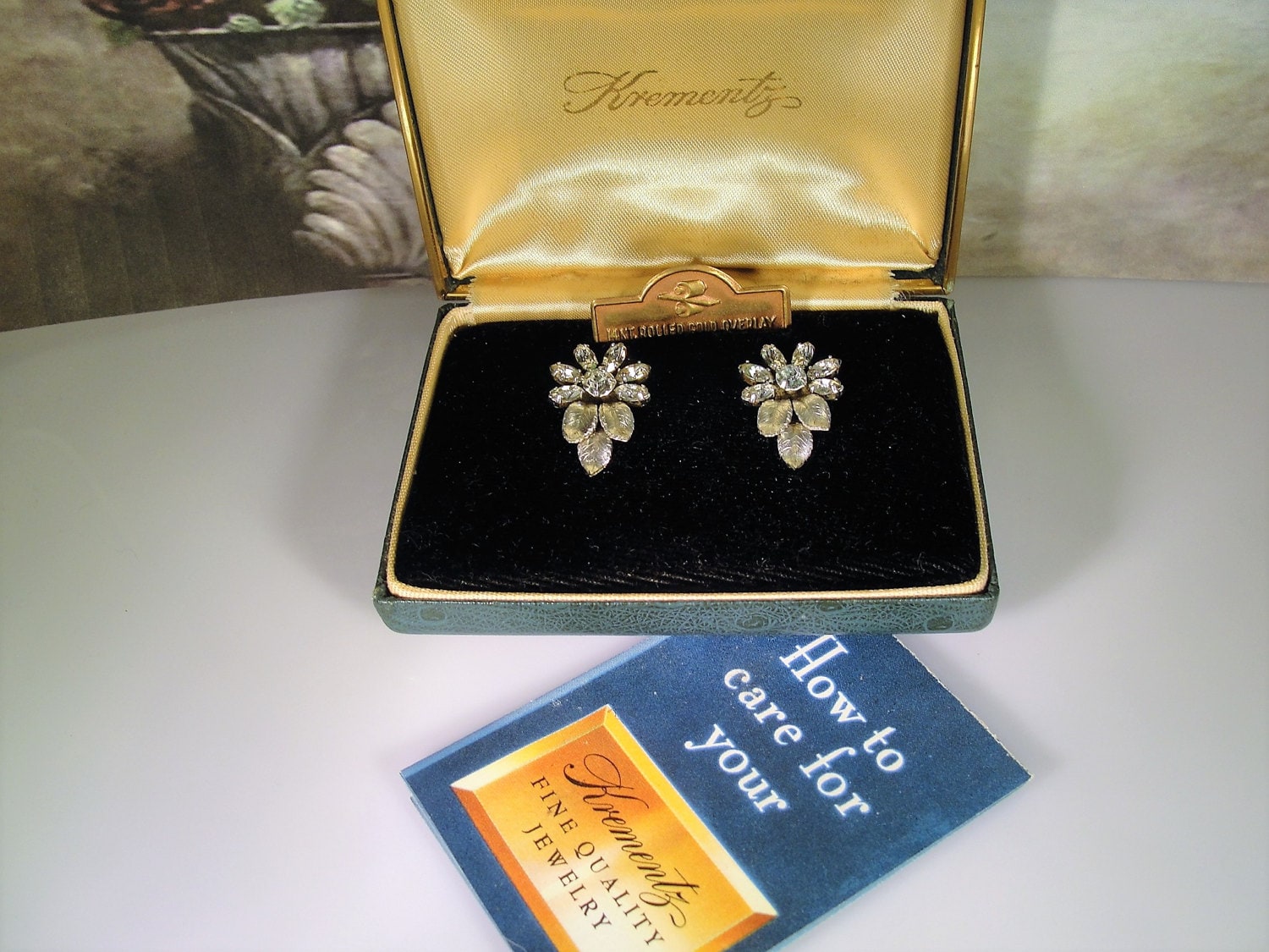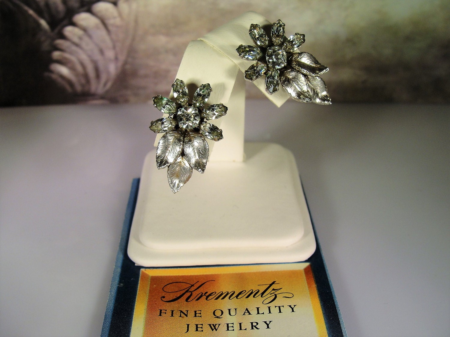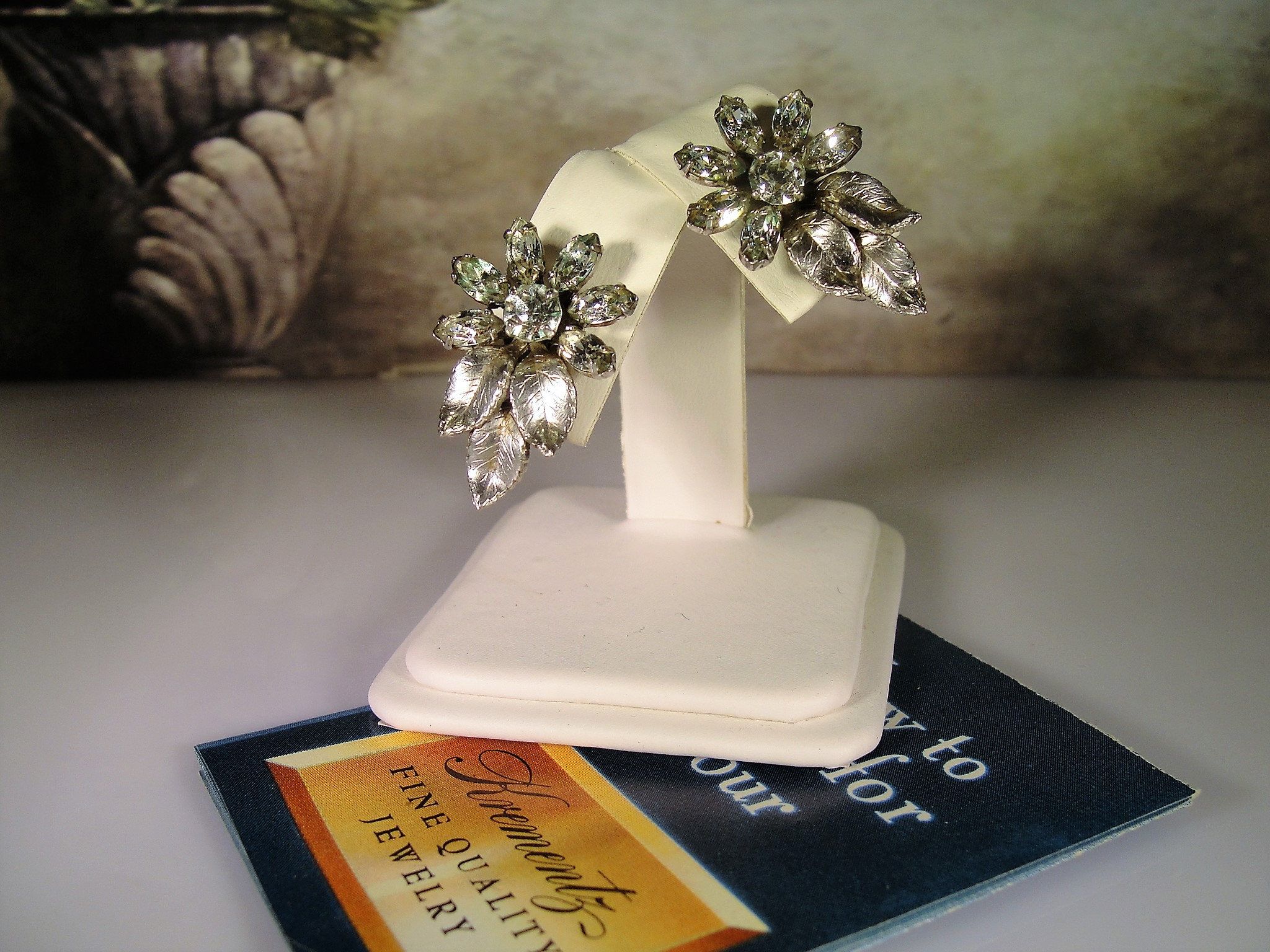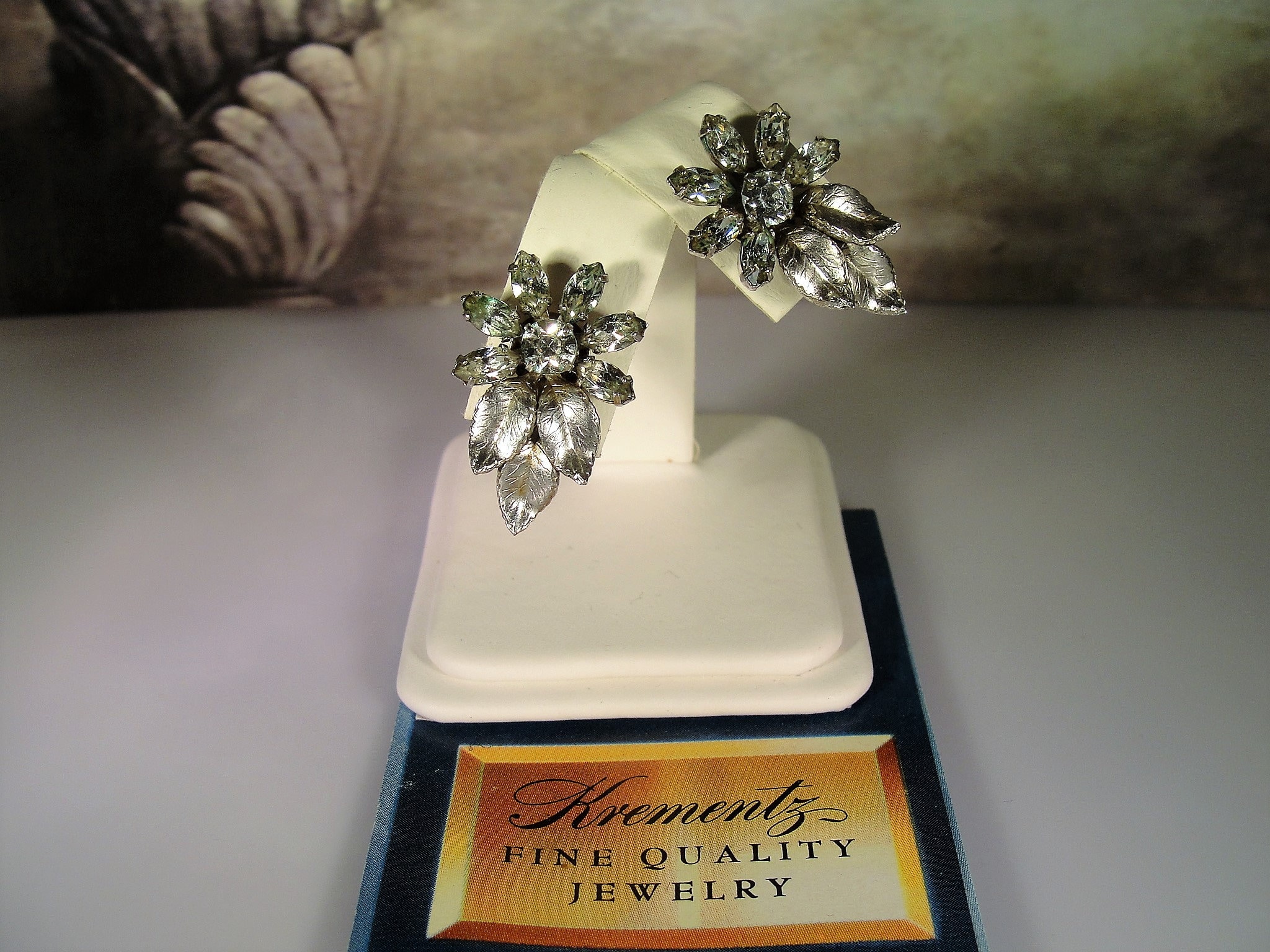 This is a beautiful pair of KREMENTZ Screw Back Earrings that is made from 14KT White Rolled Gold Overlay. The earrings have a rhinestone flower motif and are silver in color. The rhinestones are marquise and round rhinestones, all very shiny and clear.