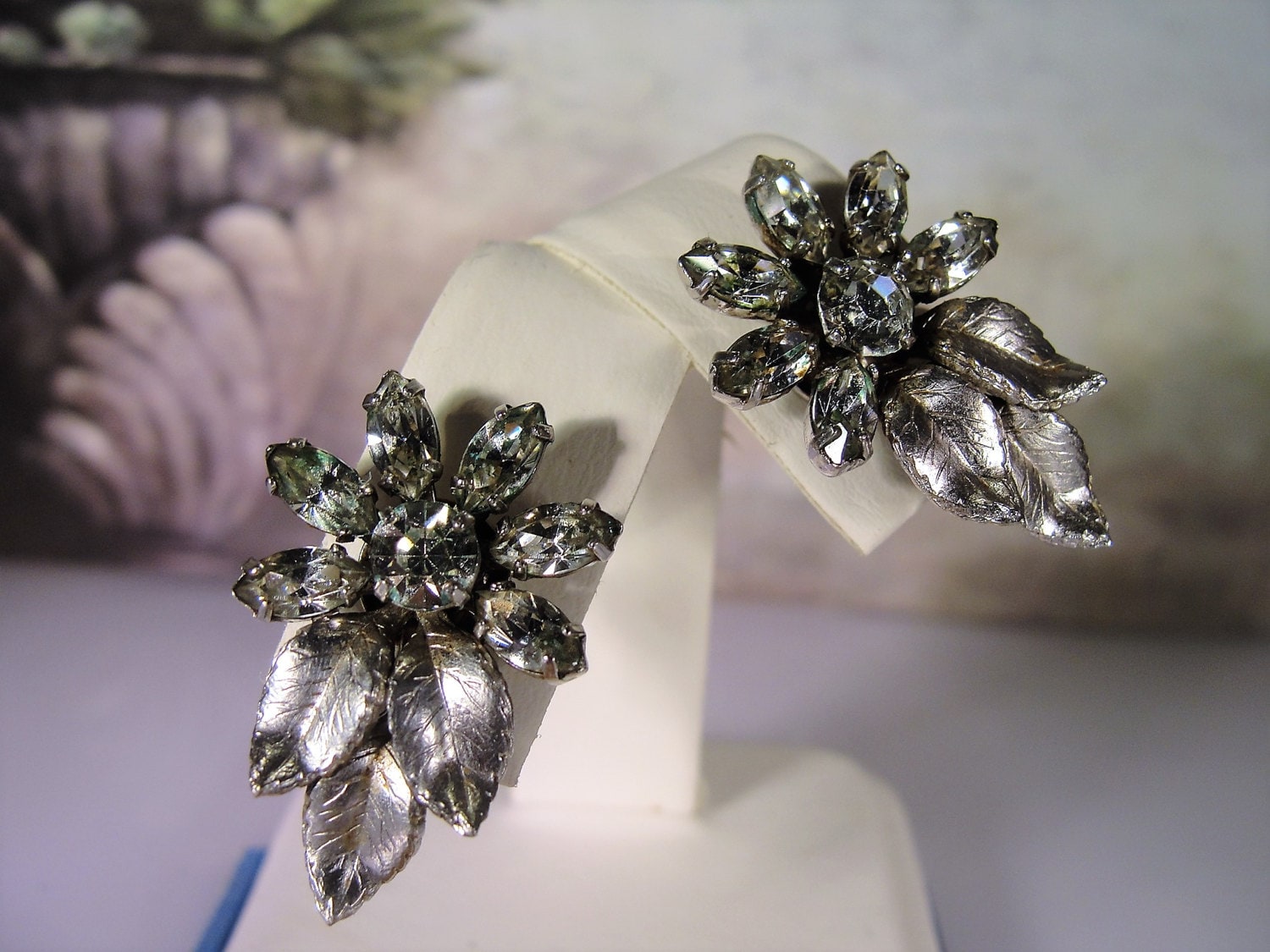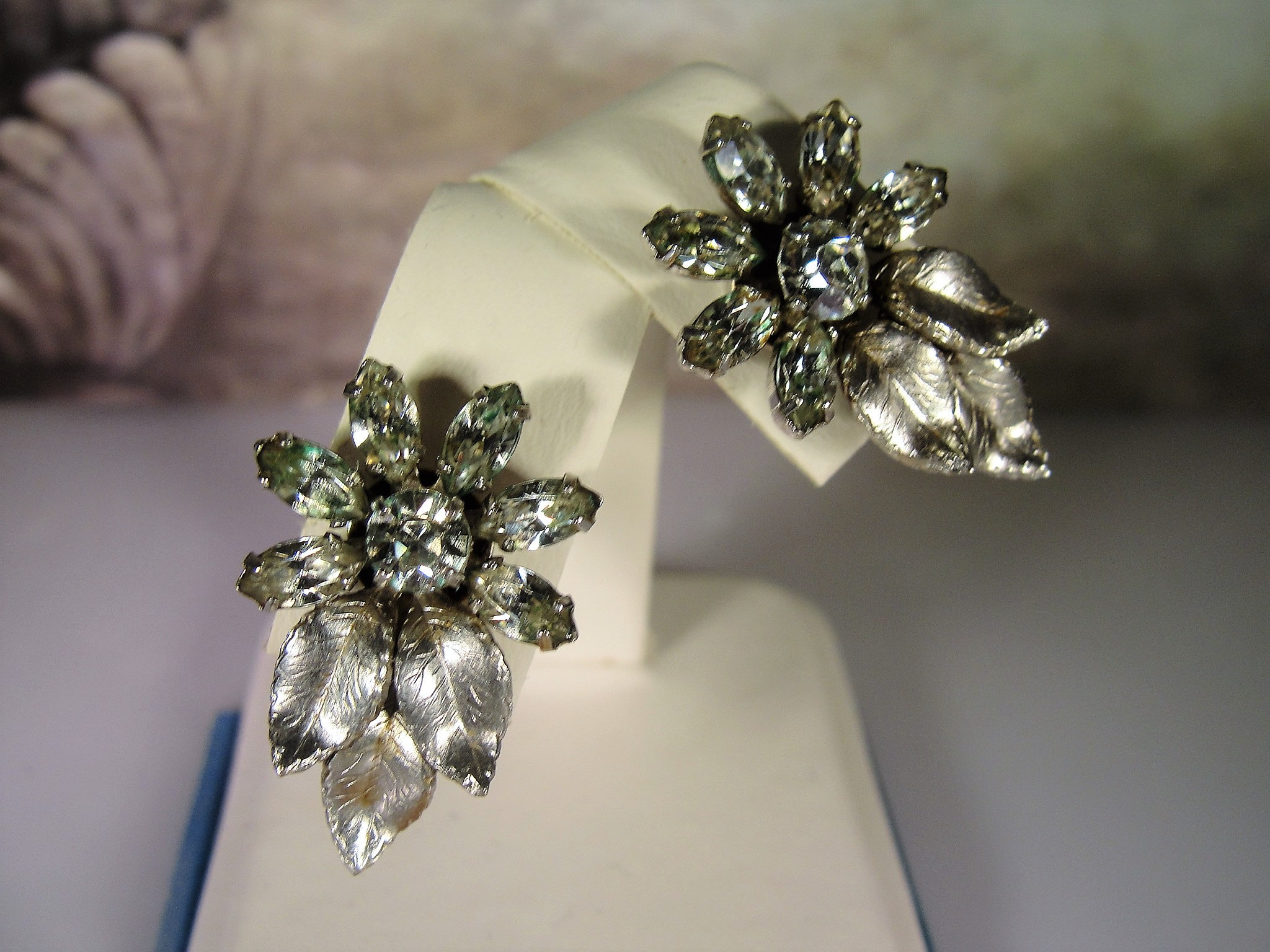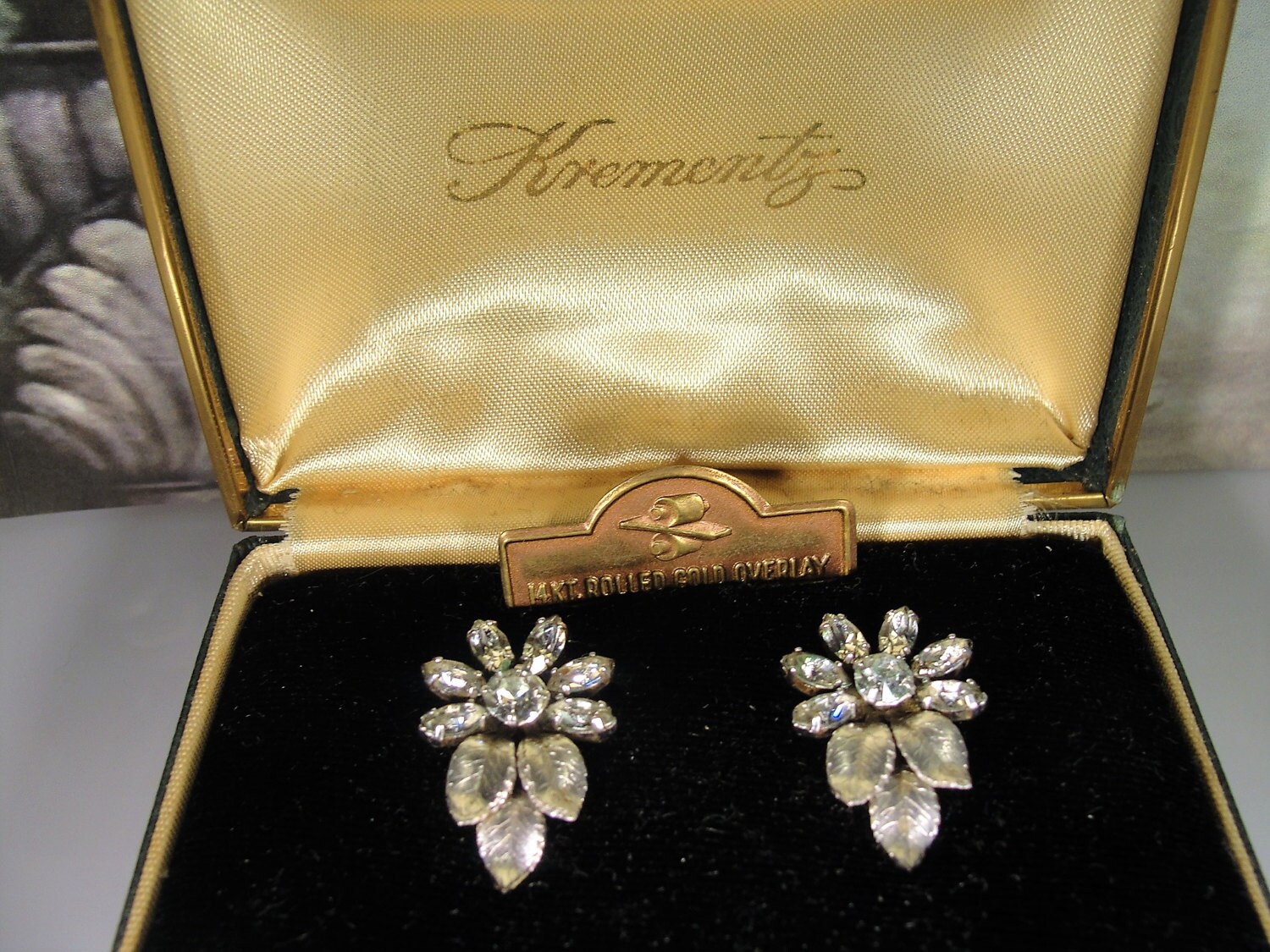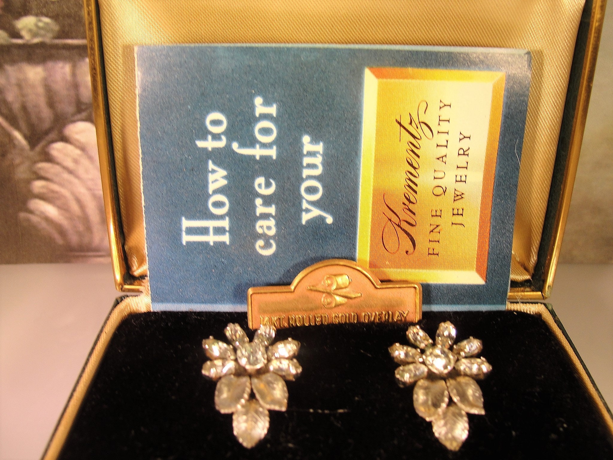 This is a beautiful pair of KREMENTZ Screw Back Earrings that is made from 14KT White Rolled Gold Overlay. The earrings have a rhinestone flower motif and are silver in color. The rhinestones are marquise and round rhinestones, all very shiny and clear.