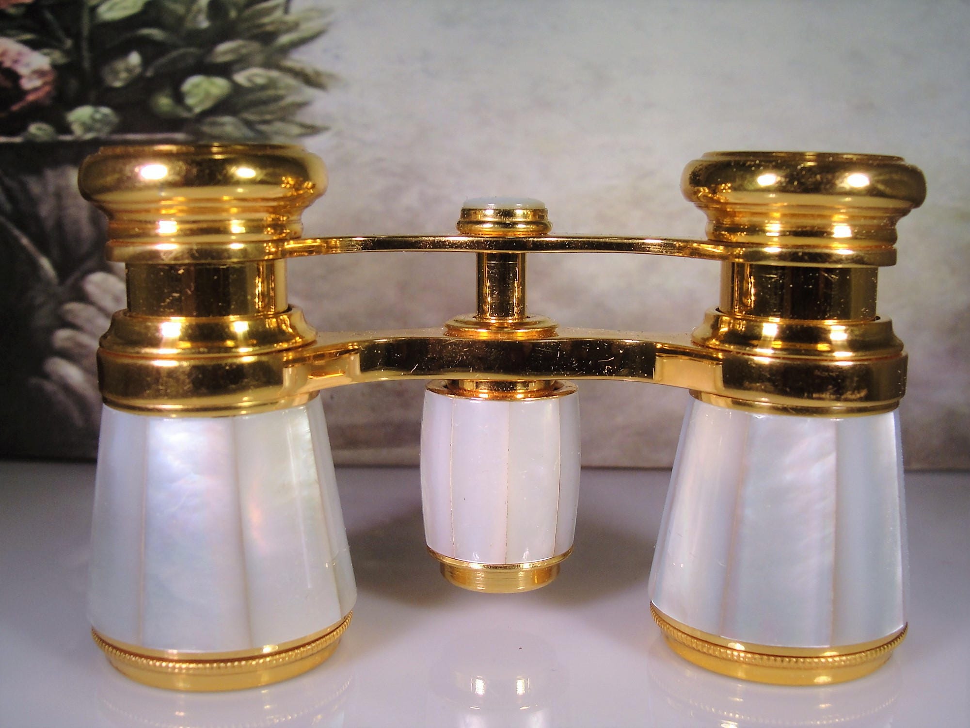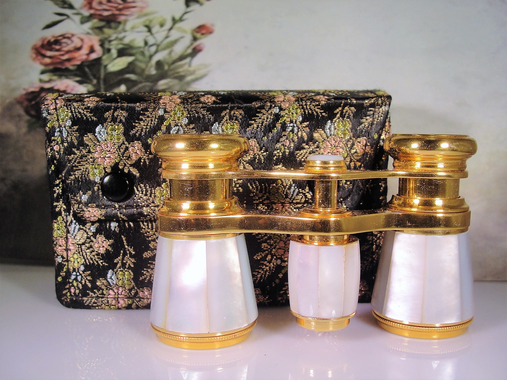 These opera glasses are in amazing condition and they have a wonderful brocade case that snaps shut with two snaps, one on each side. The opera glasses have gold trim around the tops, middle and bottom of the binoculars. The mother of pearl is inlaid panels that wrap all the way around each tube. In the center is a mother of pearl twist mechanism that turns nicely to expand and contract the lenses. These opera glasses are simply stunning in every way, so beautifully made and so beautifully kept. I’m guessing that they were kept in a drawer perhaps in a box with plastic covering it beccause the case has no loss of color and the glasses are just showroom perfect!!