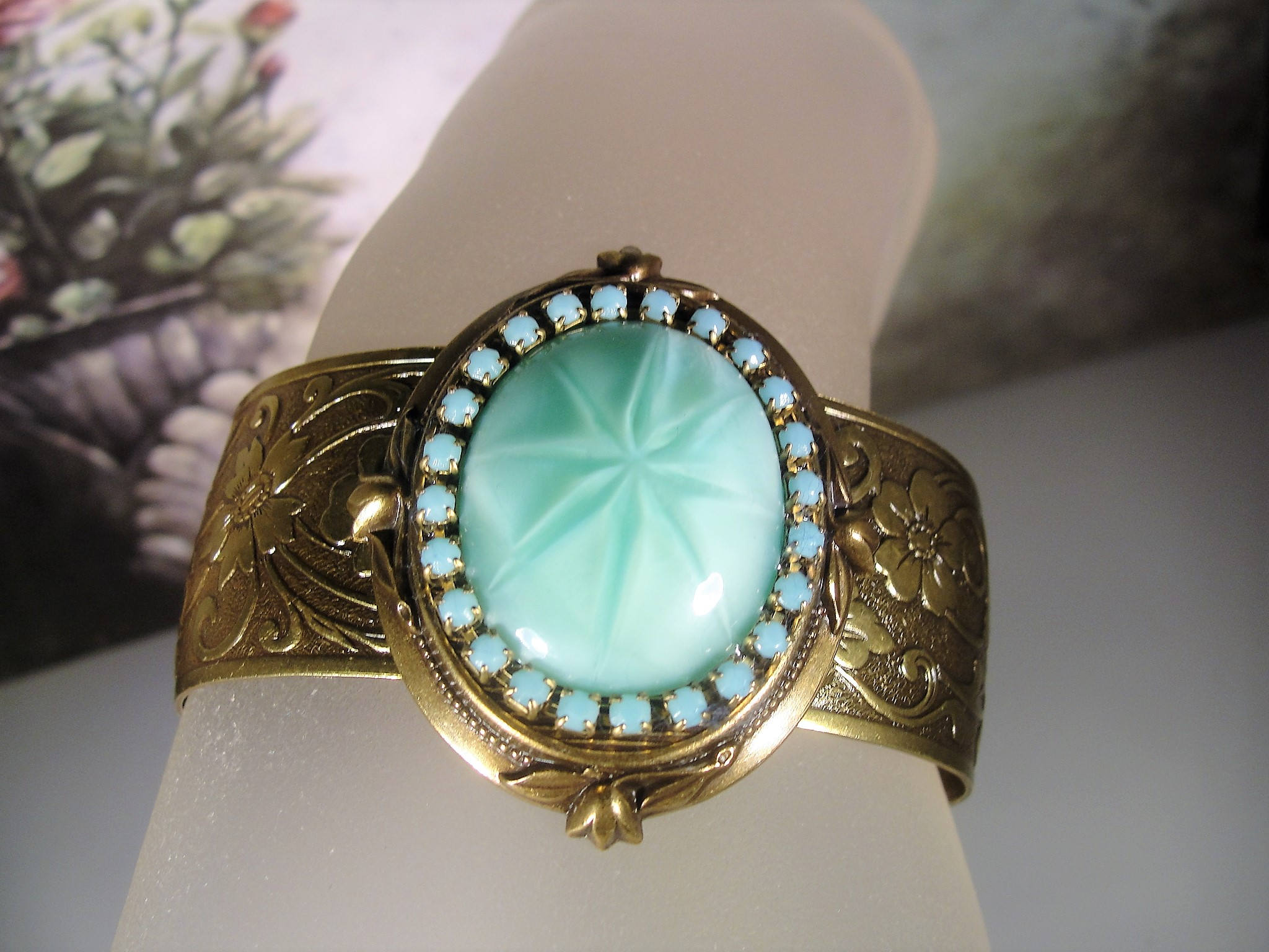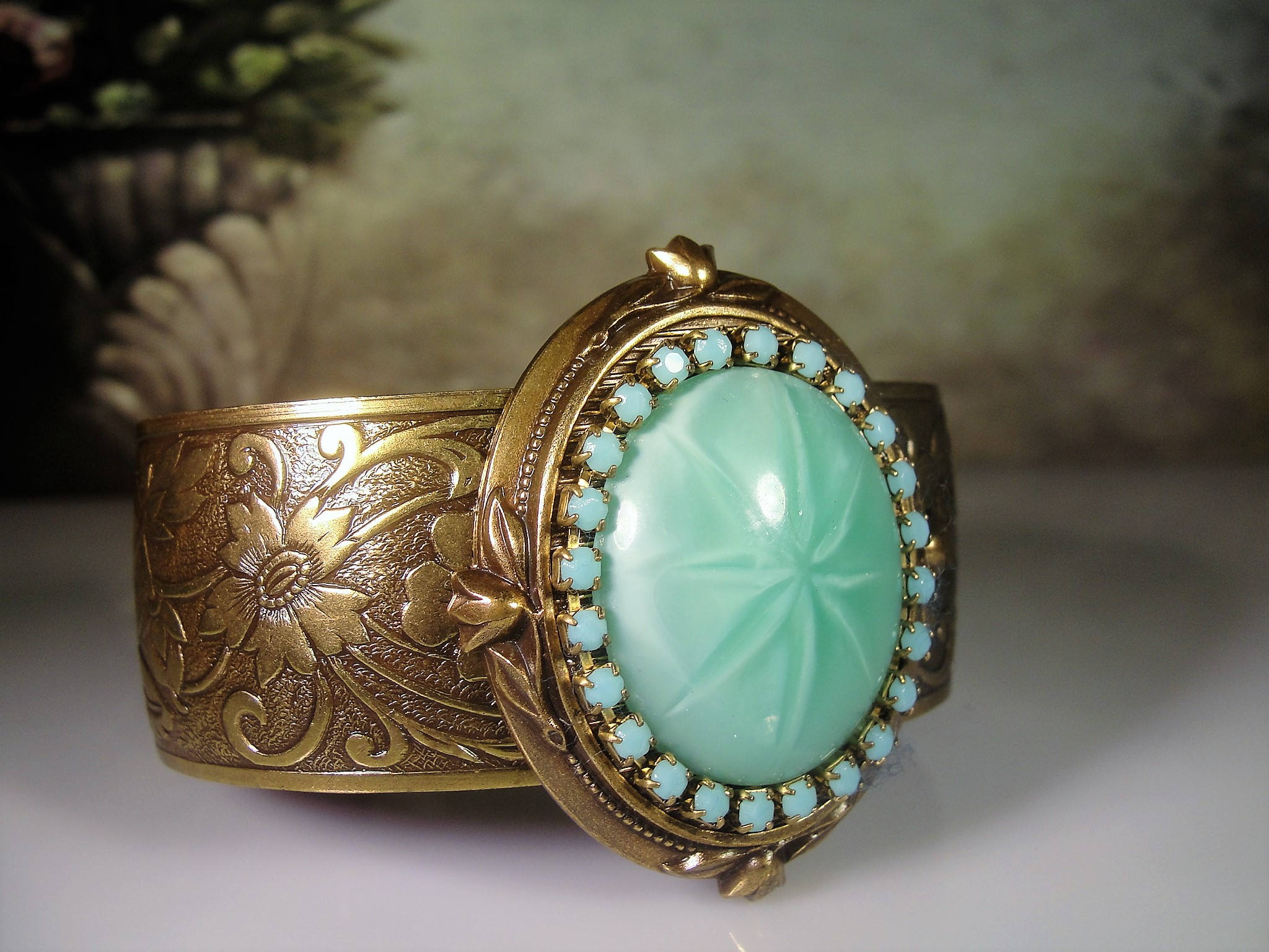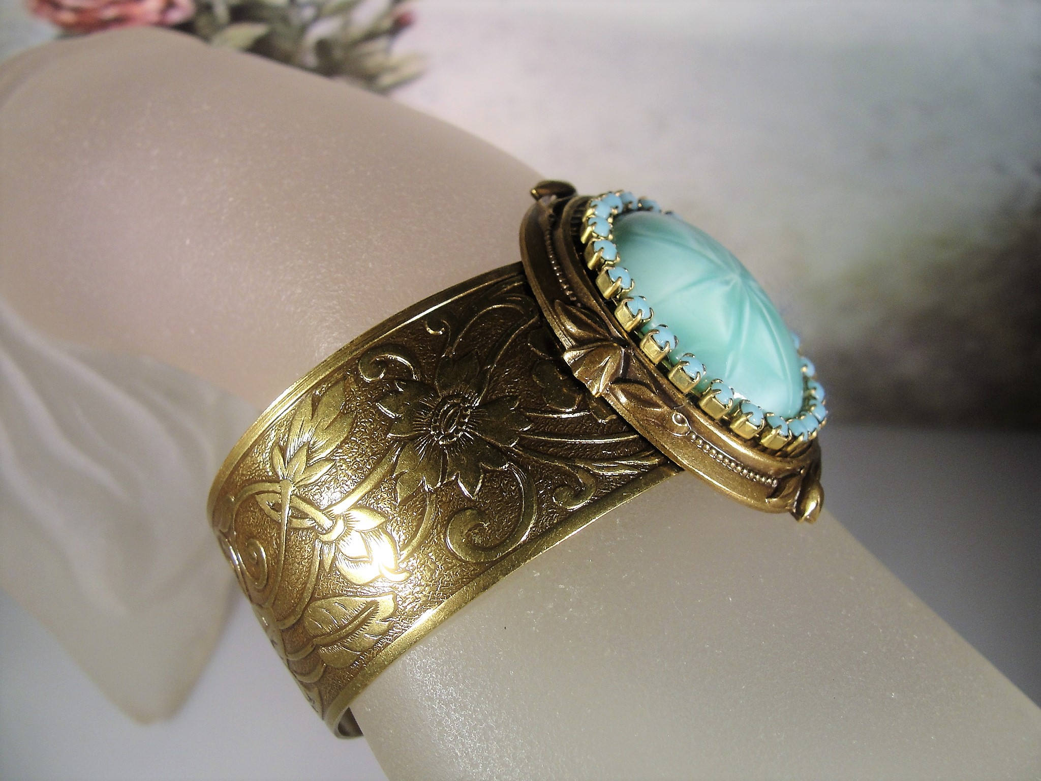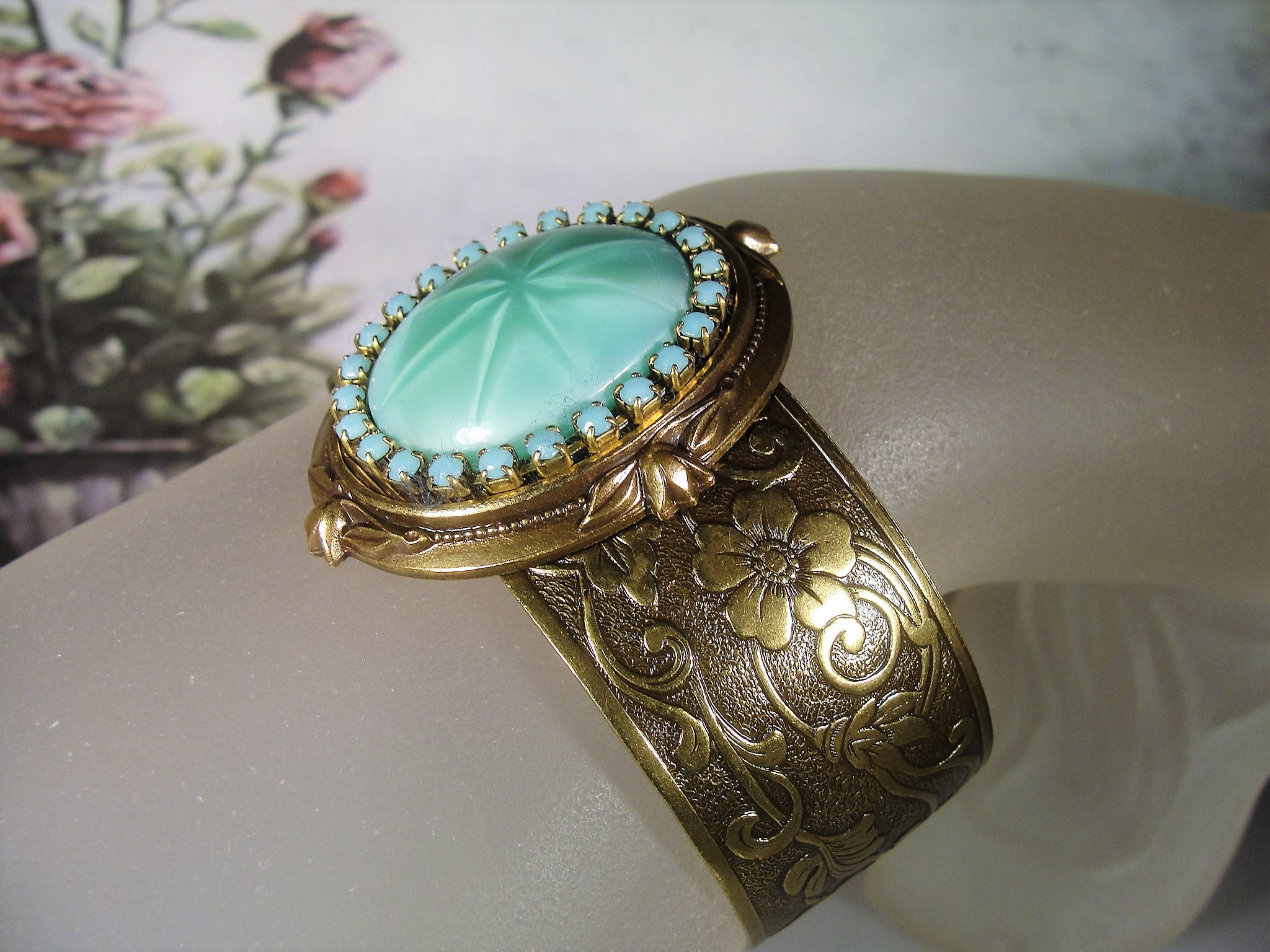 This is a beautiful brass bracelet with a floral engraved design throughout and a lovely large Lucite light Teal Cabochon placed in the center of the bracelet with matching Lucite rhinestones surrounding it. This is a wide bracelet that is open on the back so that it can be easily slid on and off of your wrist. It should also accommodate many different size wrists as well. This bracelet is beautifully done and provides a very nice and interesting presentation. I believe that this bracelet is leaning towards the Southwestern style… very pretty!