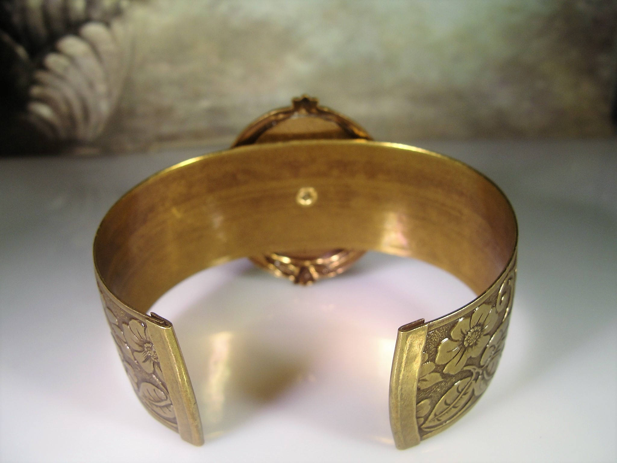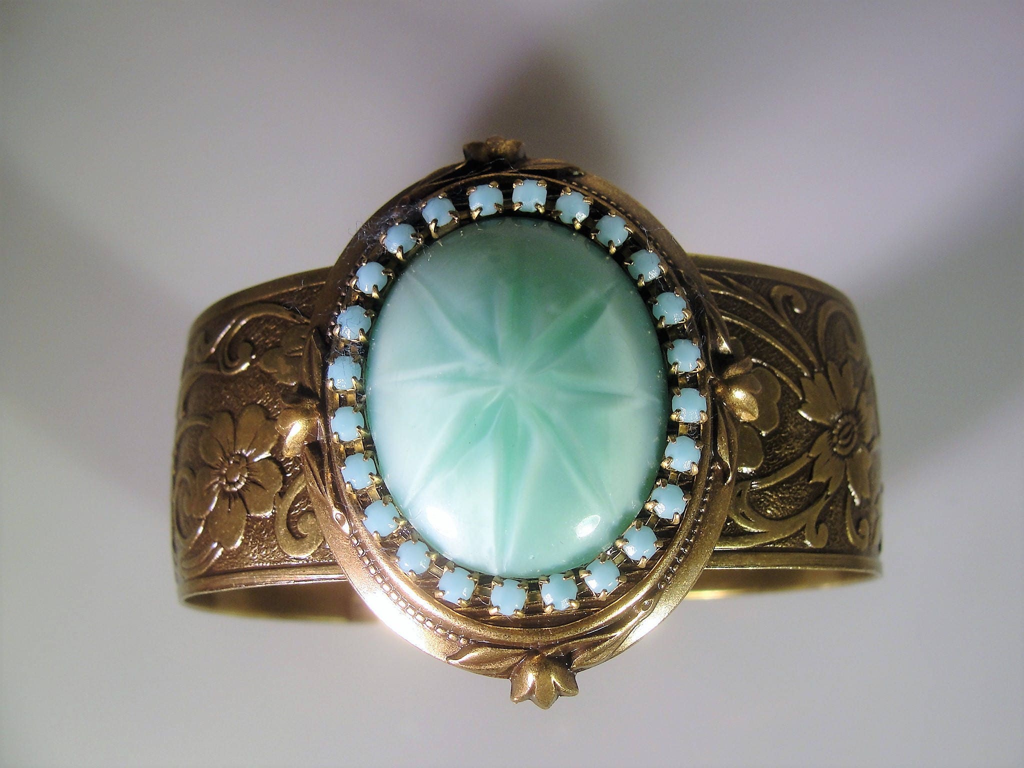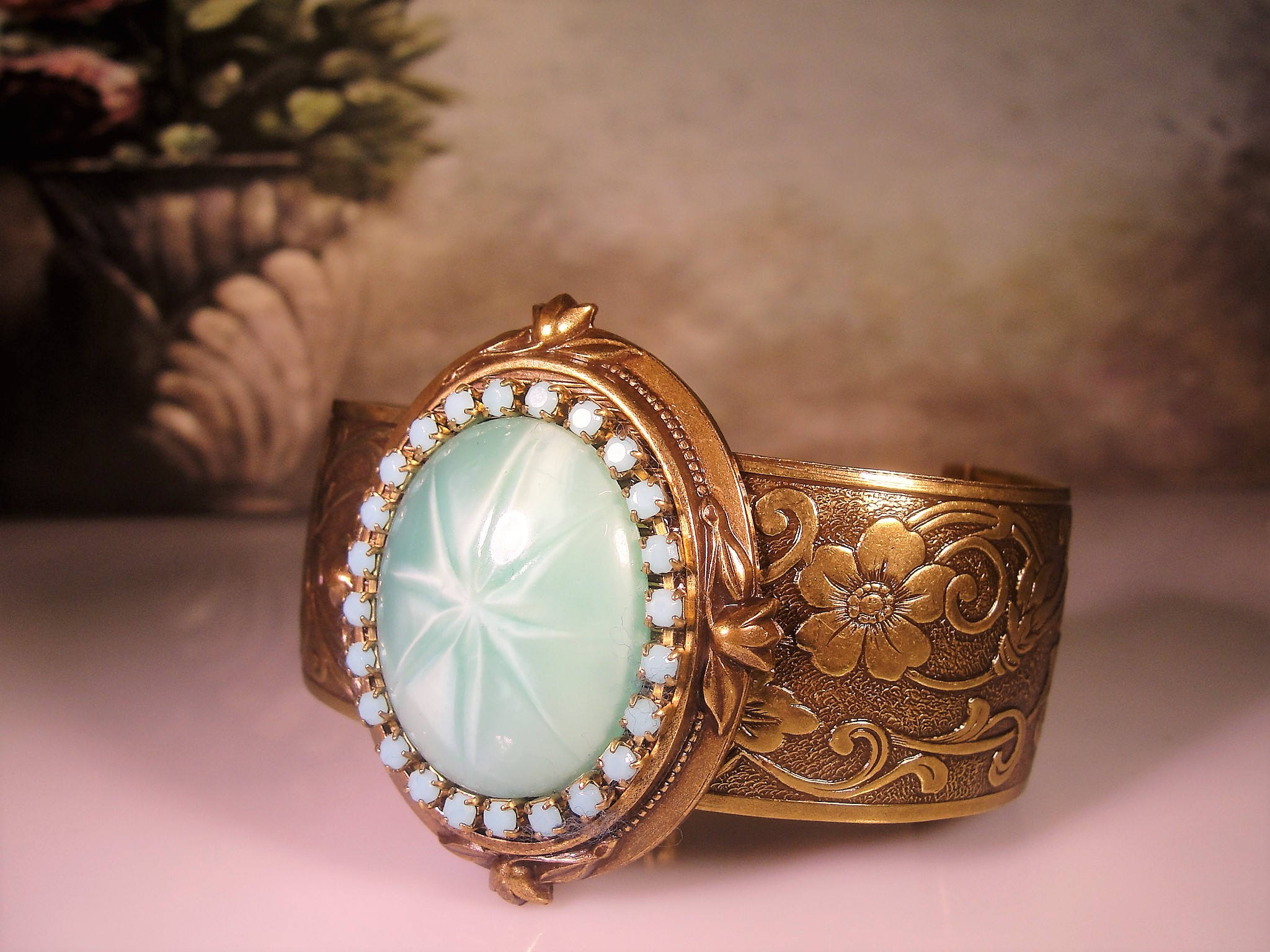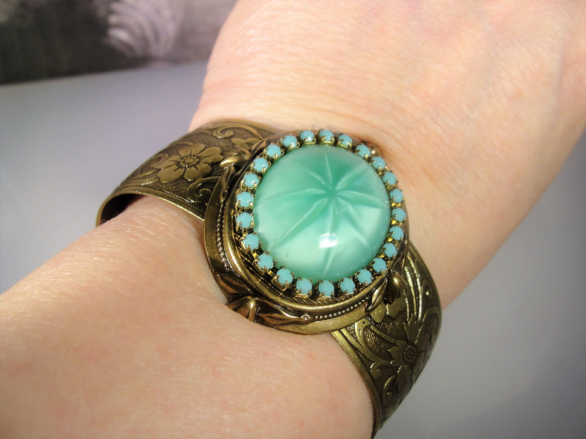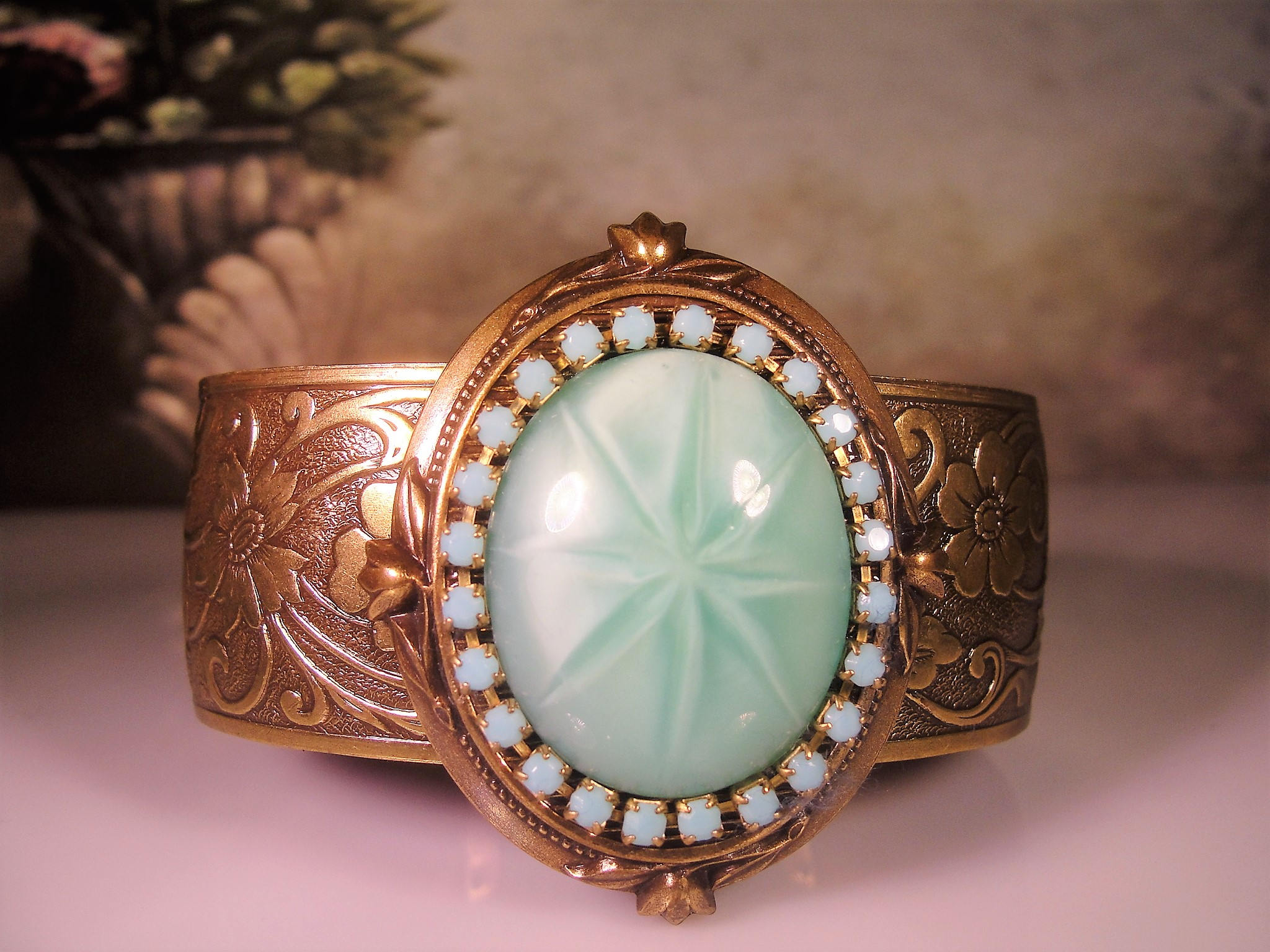 This is a beautiful brass bracelet with a floral engraved design throughout and a lovely large Lucite light Teal Cabochon placed in the center of the bracelet with matching Lucite rhinestones surrounding it. This is a wide bracelet that is open on the back so that it can be easily slid on and off of your wrist. It should also accommodate many different size wrists as well. This bracelet is beautifully done and provides a very nice and interesting presentation. I believe that this bracelet is leaning towards the Southwestern style… very pretty!