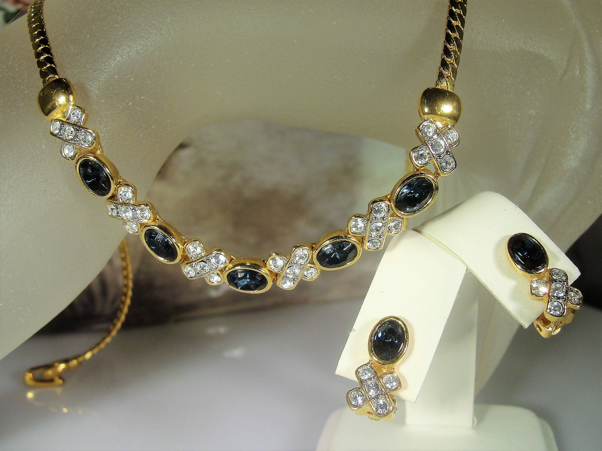 This is a gorgeous Blue Sapphire Crystals and Clear Rhinestone Jewelry Set. This set consists of a necklace that has a flat herringbone chain and cute clip on earrings.