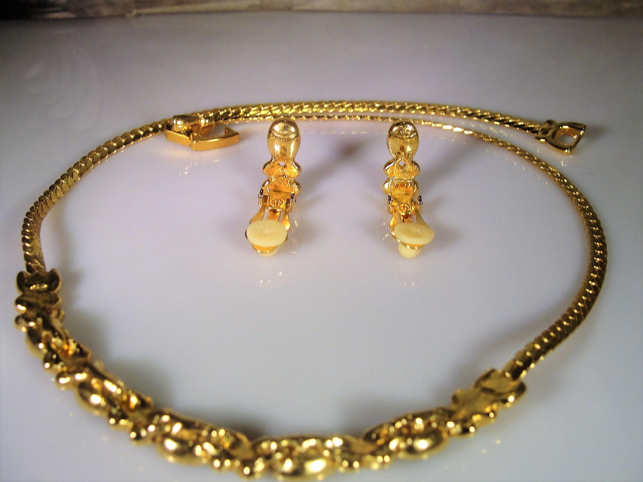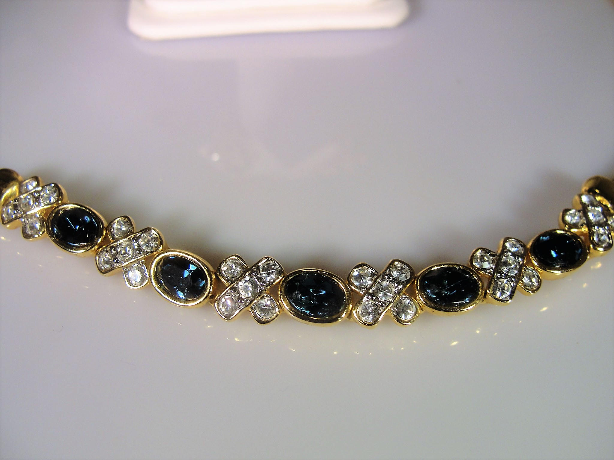 The necklace has a Hugs and Kisses motif with the sapphires being the Hugs and the white rhinestones being the Kisses. This alternating design spans across the front part of the necklace which sits slightly lower than the neckline. The rest of the necklace is an electroplated herringbone chain that has a very nice thickness and looks as it if were never worn. The front part of the necklace measures 3.5 inches in length and the entire necklace measures 15 inches in length. Thickness is ¼ of an inch on the front where the sapphires and rhinestones reside and 1/8 of an inch wide for the herringbone chain. The necklace has a folding clasp that snaps shut tightly.