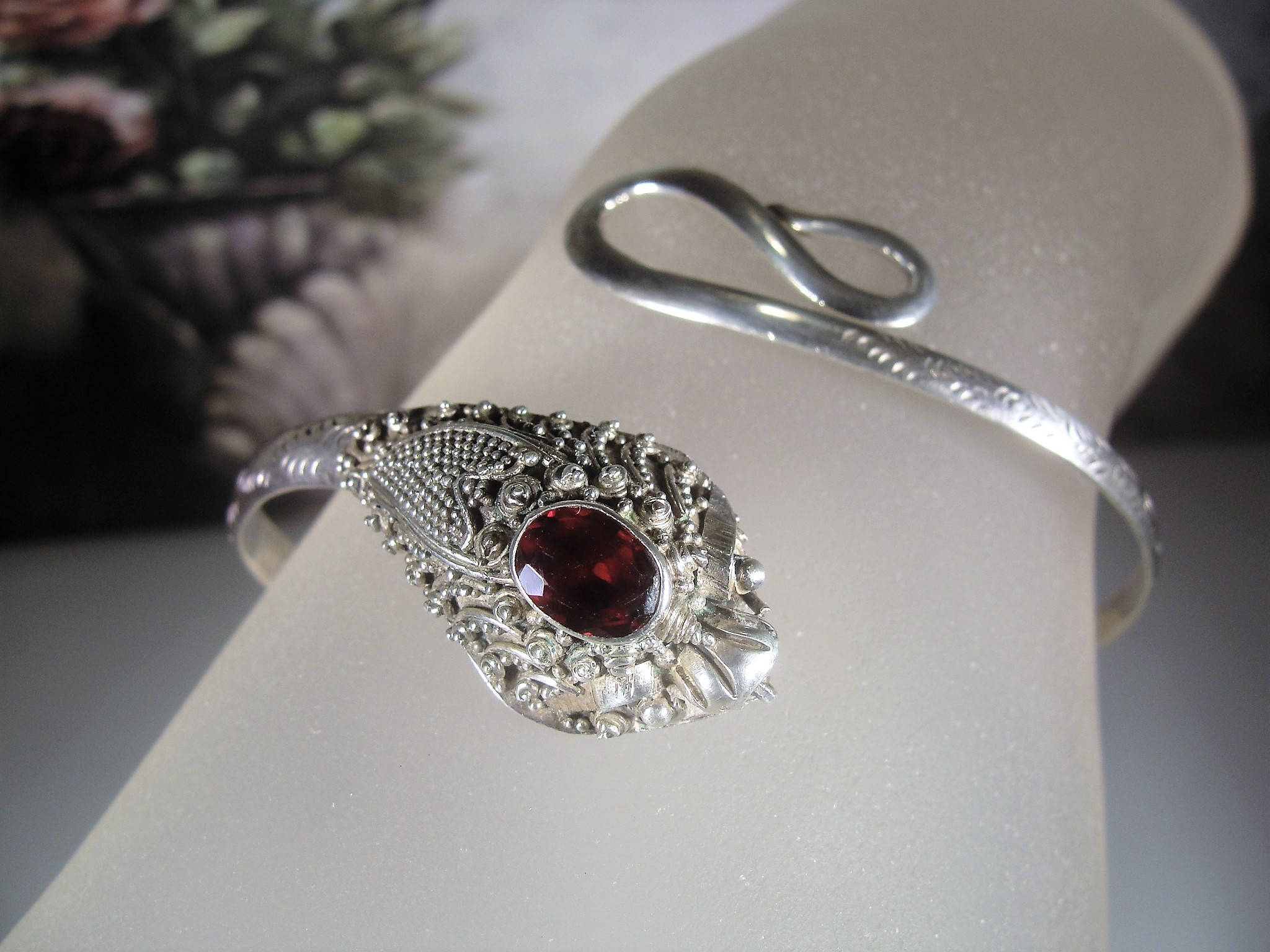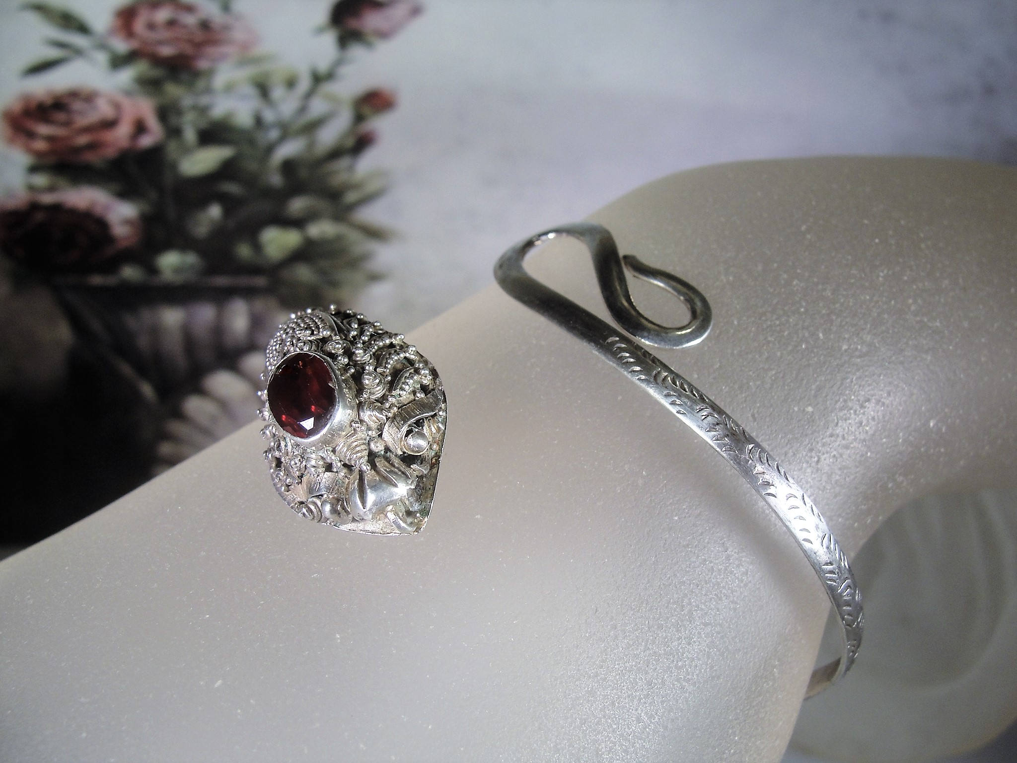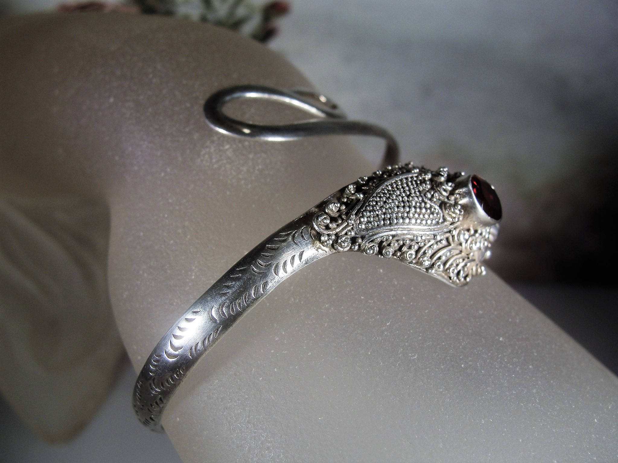 This is an amazingly detailed Cobra Head Snake Bracelet that is done is Sterling Silver. The body of the snake or bracelet has delicately etched design work throughout, which brings the eye up to the Bezel Set Genuine Garnet and the very detailed Cobra Head that is incredibly life like. The Cobra Head of this bracelet is shaped in the common form of a Cobra and it looks every bit as menacing!! This bracelet is very cool and will no doubt be a conversation starter whenever worn. This bracelet is just a very neat piece to add to your jewelry collection!