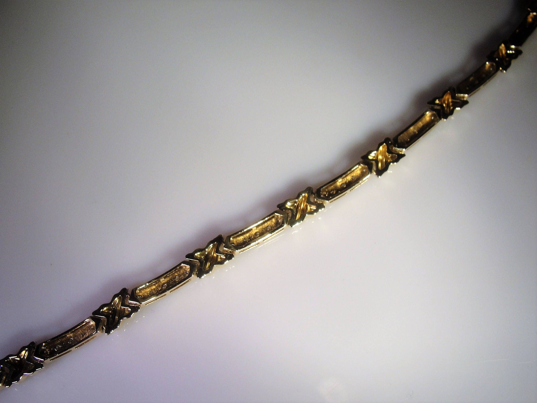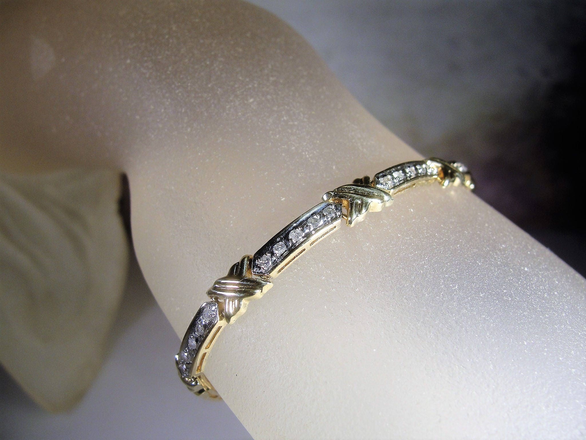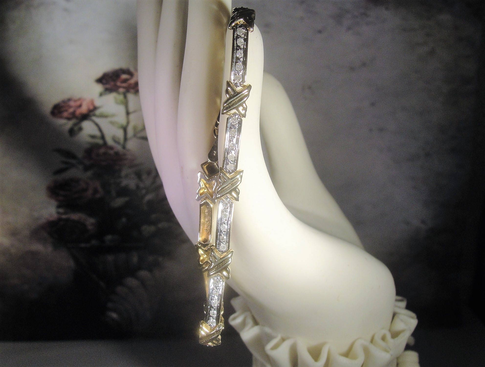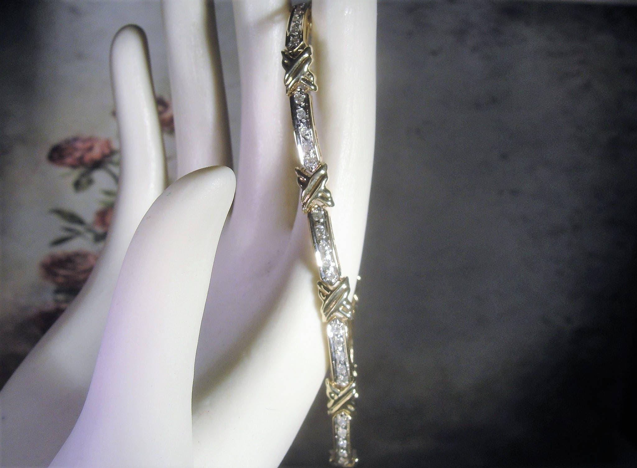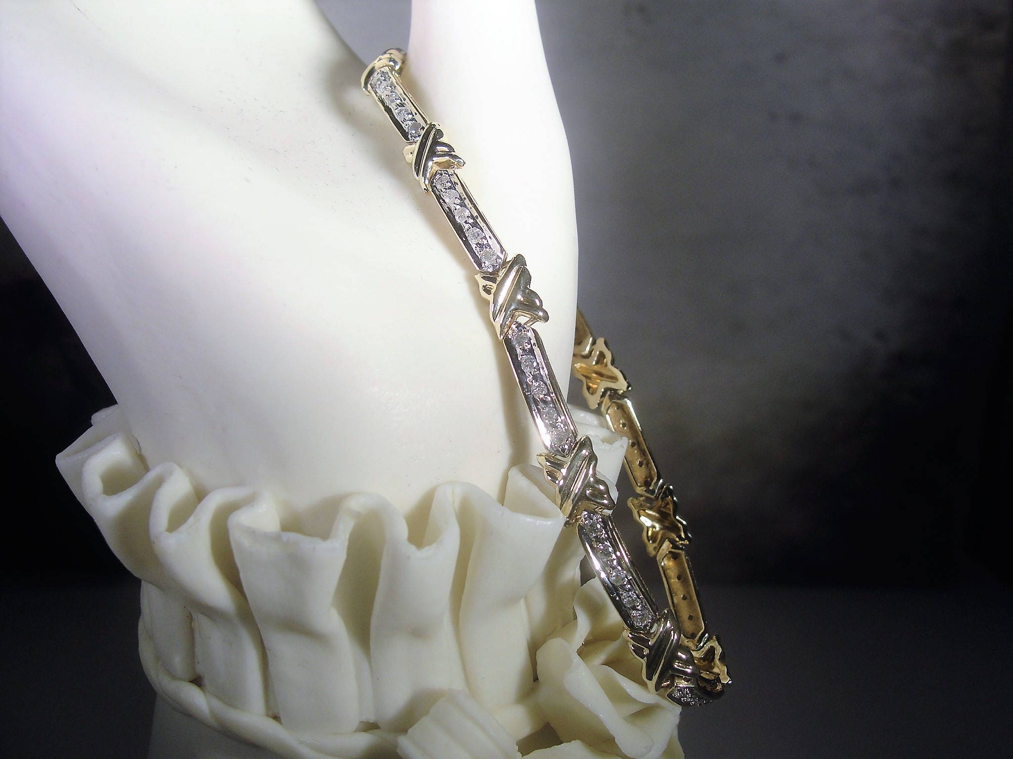 This is beautiful diamond tennis bracelet that is done in a mix of yellow gold and white gold. The gold metal is 10K gold. There are 8 long links that has 5 diamonds each. The top section of the links are done in white gold with a yellow gold “X” or kiss in between each link. If you turn the bracelet over, you will see that the entire back is done in yellow gold. The white gold is where the diamonds reside and they are all prong set. This allows the diamonds to refract beautifully with the white gold. This bracelet is so very nicely done and it is circa 1980s.