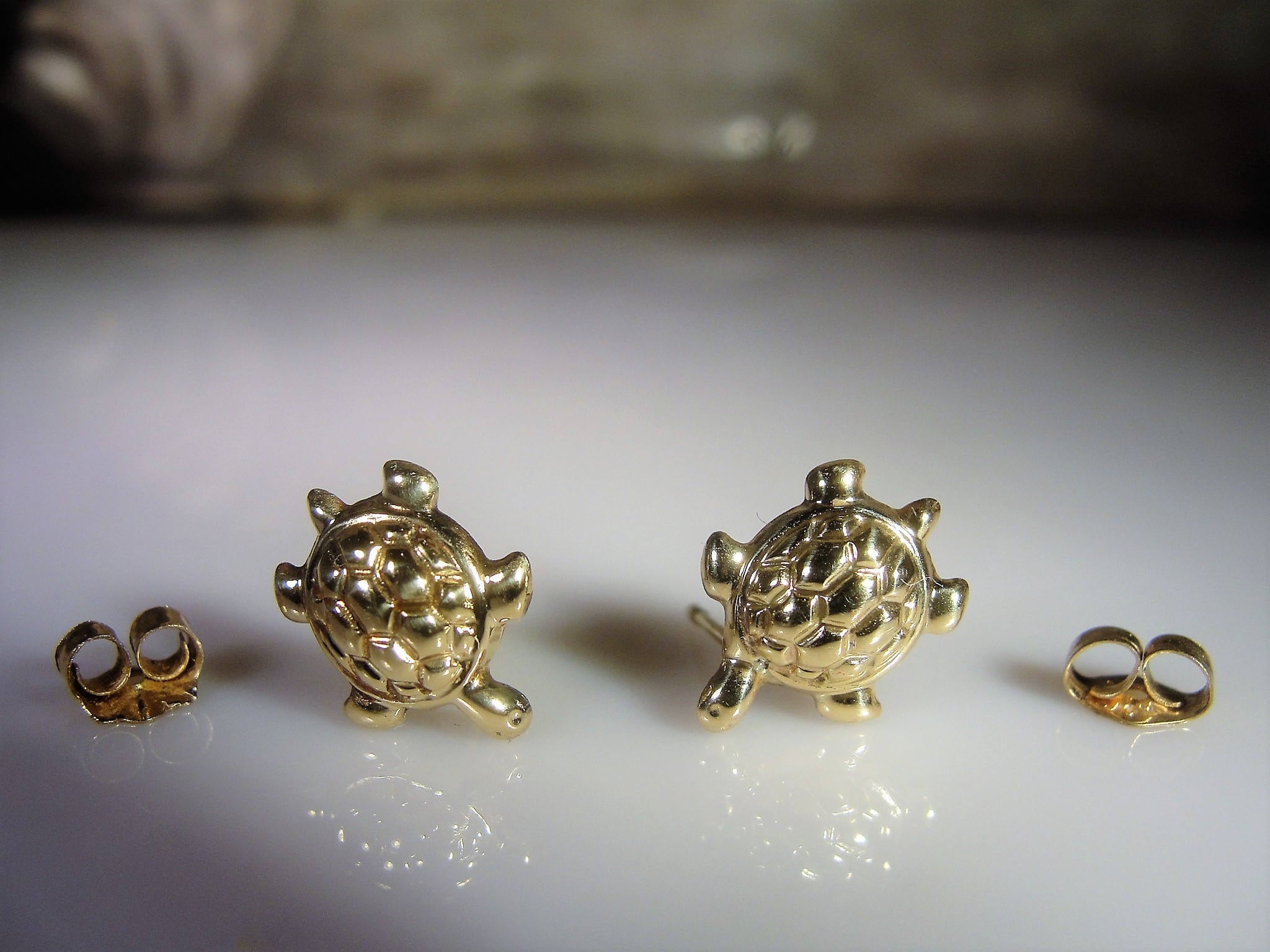 These turtles are made from 10K yellow gold. There is no enamel work or gems on these turtle earrings, they are just pure gold and will match with any other accessory!! Although these earrings are small, you will see that they have quite a bit of detail on them and will be so very cute when wearing them!!