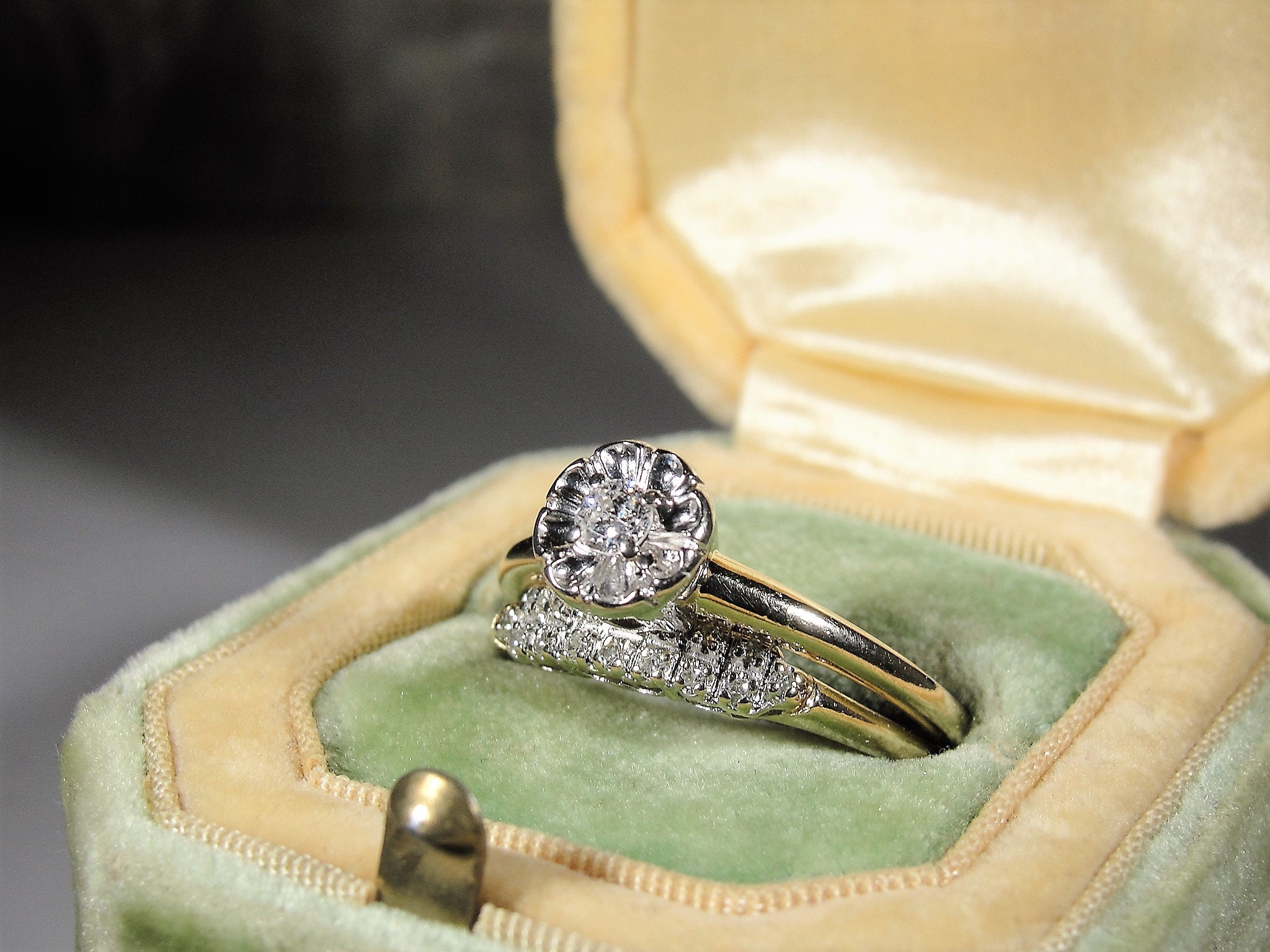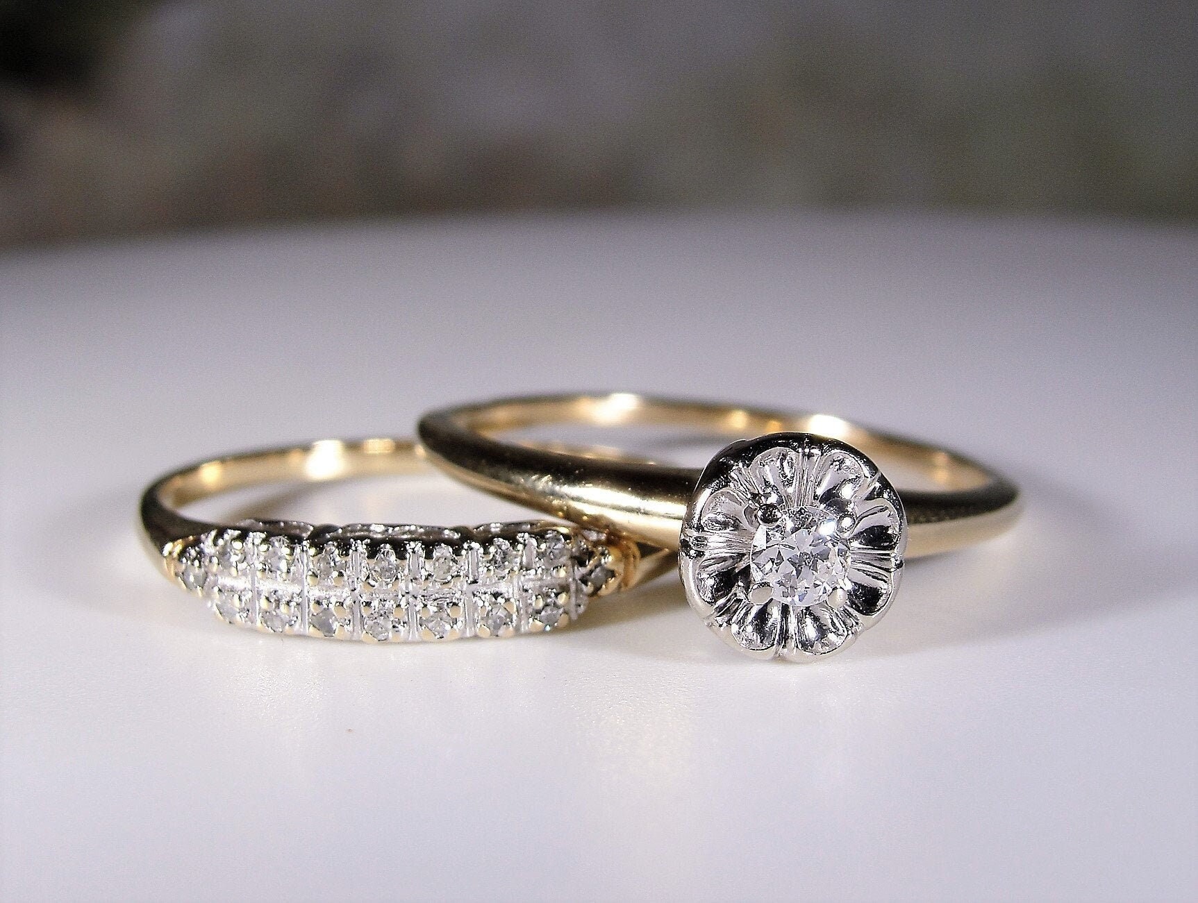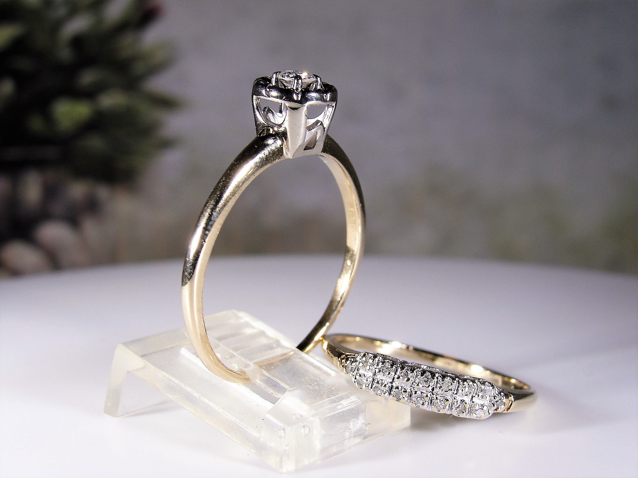 Bridal Ring Set, 14K Gold Diamond Engagement Ring and Diamond Wedding Band, Wedding Rings, Vintage Rings, Size 8.5, FREE SIZING!!