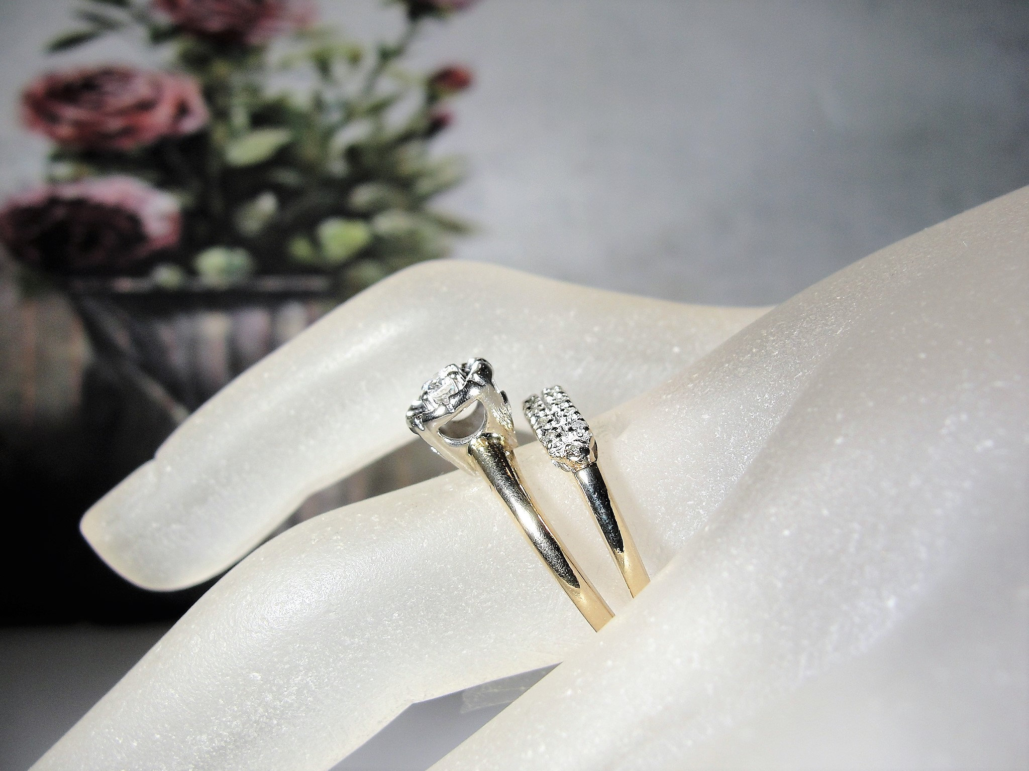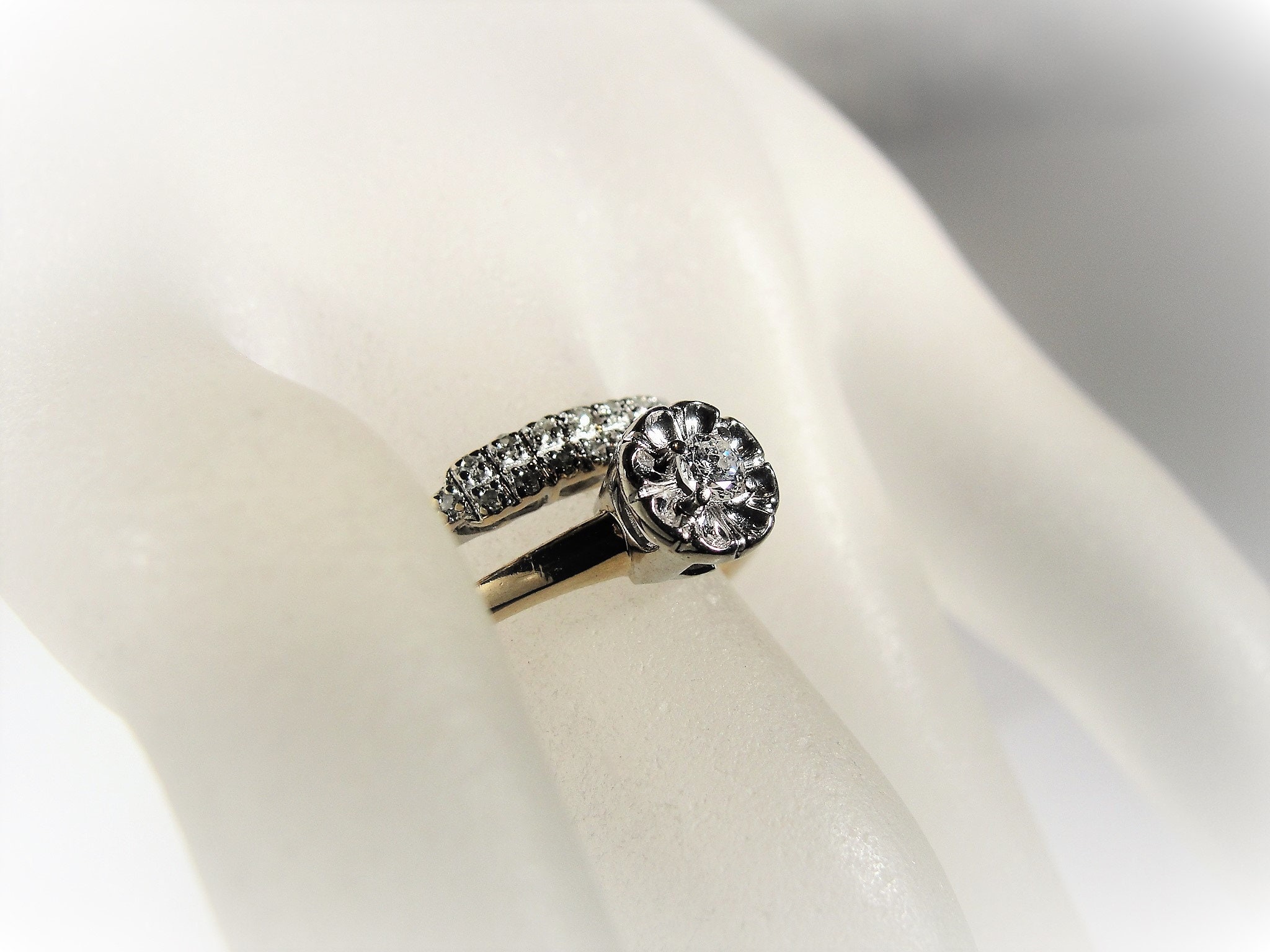 This is a beautiful Diamond Engagement Ring and Diamond Wedding Band. The Engagement Ring is a solitary diamond that is set is a beautiful white gold flower mounting, very unusual! The Wedding Band has 24 single point diamonds where there are two rows of 12 diamonds each. The mounting is also white gold and the bands are yellow gold. Just a lovely unique set that is so feminine and it provides a nice delicate look!!