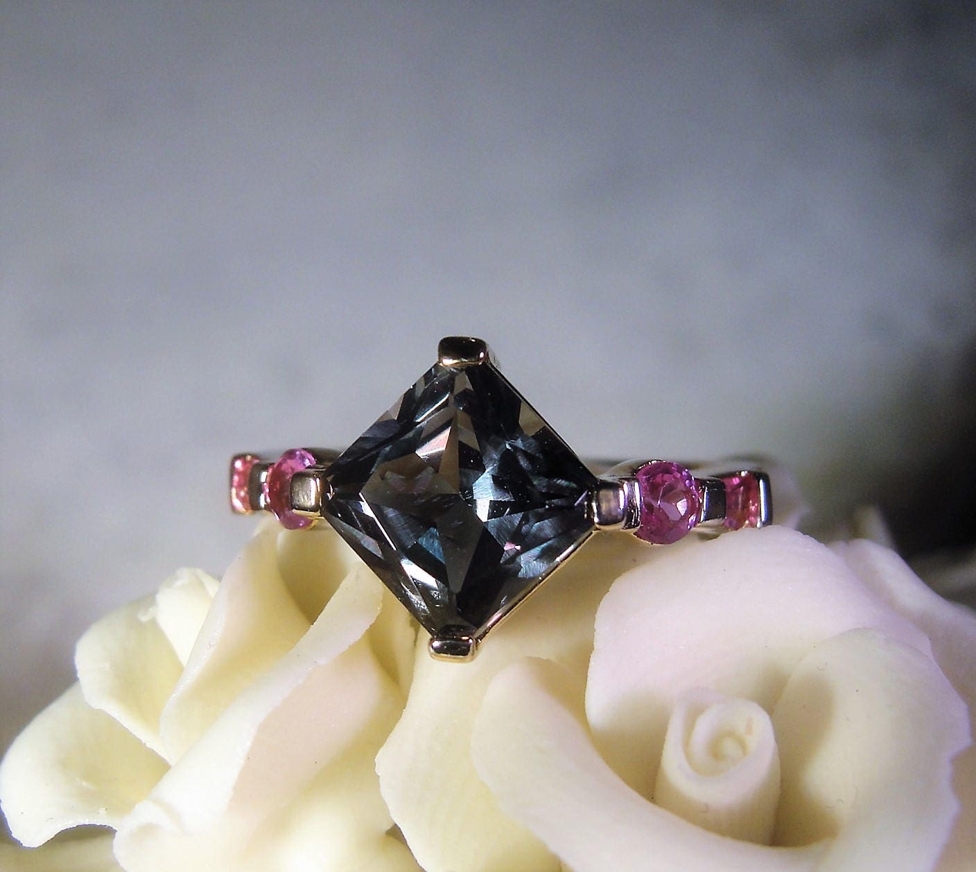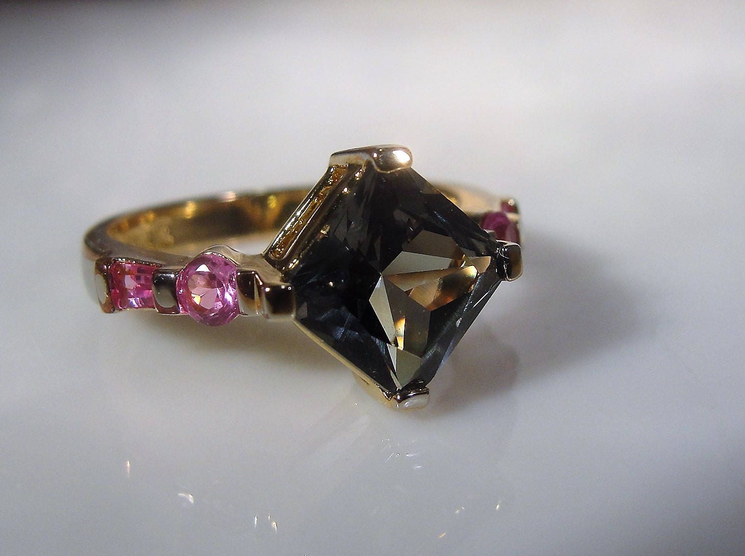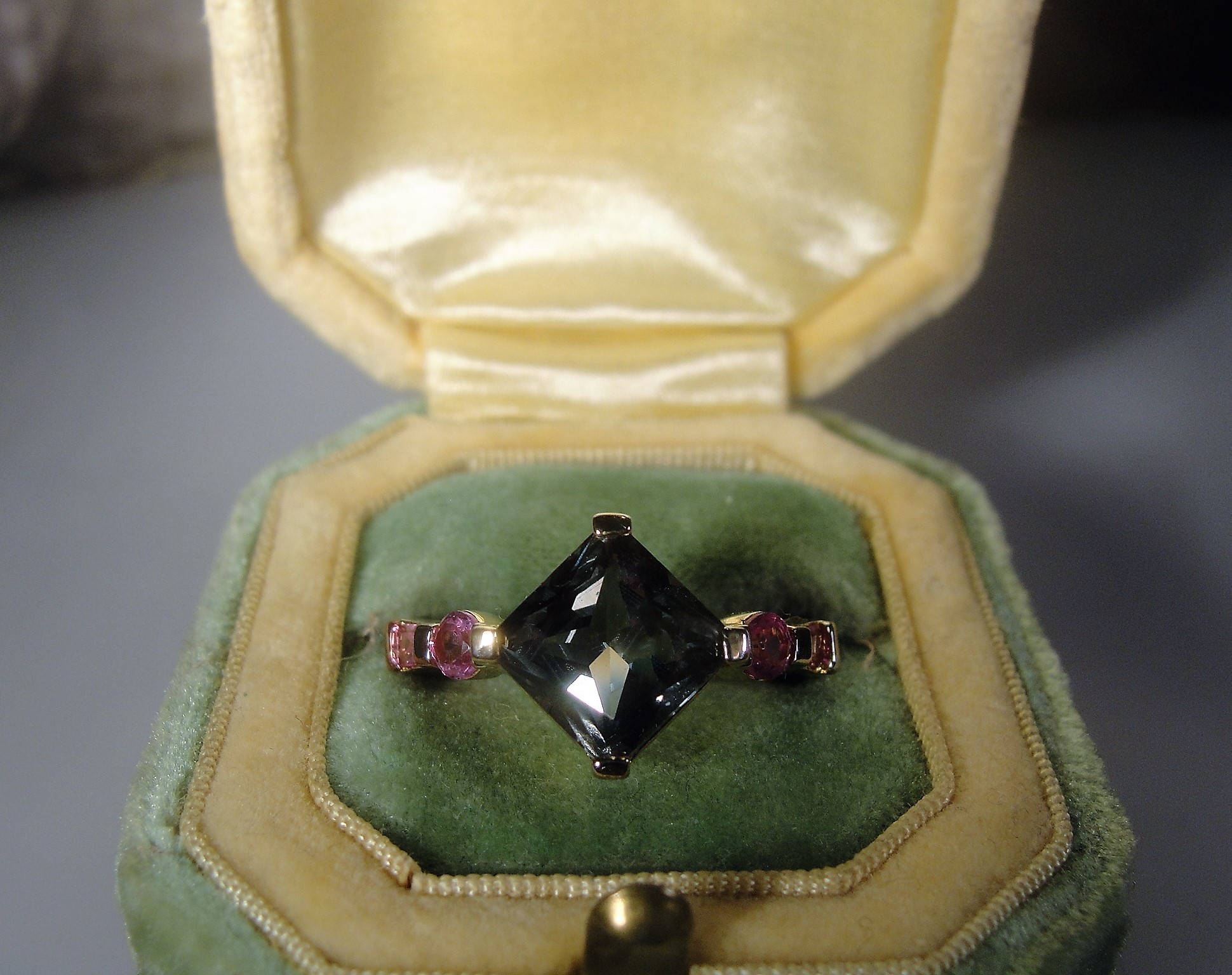 This is a beautiful rich color Green Topaz that is set in the shape of a diamond in the ring and there are two pink sapphire stones flanking each side of the center stone. One of the pink gems is round and the second one is a baguette. Truly a beautiful ring that presents so very nicely when worn. This is a gold vermeil ring on the top section and it has a heavy gold coating. The band is sterling silver and probably rhodium plated. The center topaz gem measures 8mm squared, which is approximately 3 carats in size. Just a wonderful combination of colors and a beautifully made right hand ring!