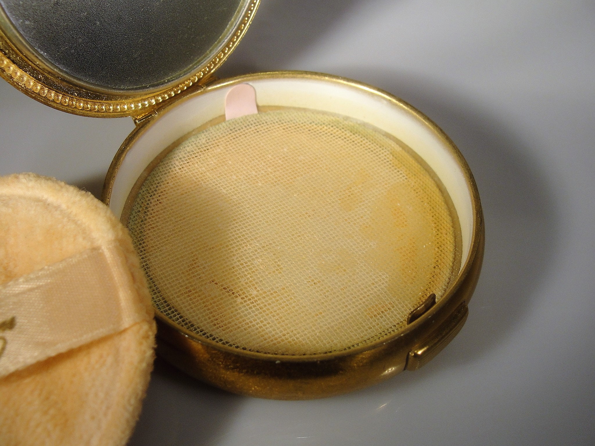 The floral design, I believe to be a transfer print with a clear enamel coating so there is no wear on the top of the compact. It has a caviar beaded design all around the picture and the underside is a nice rich gold color.