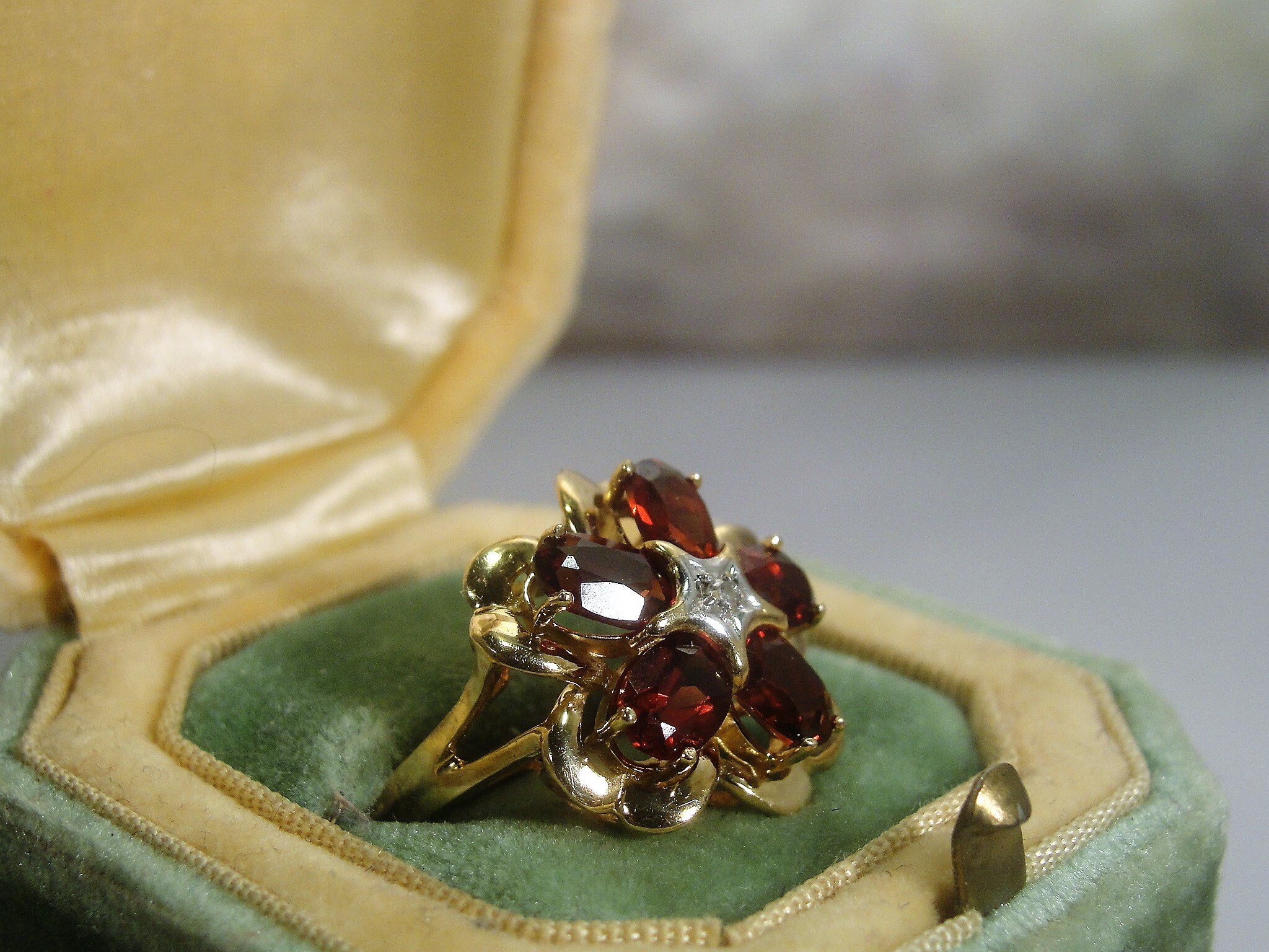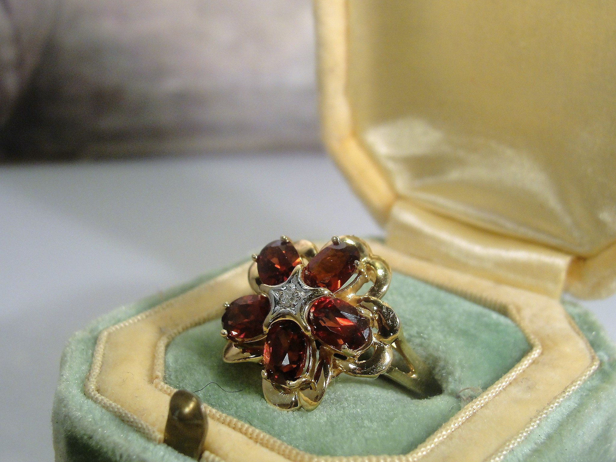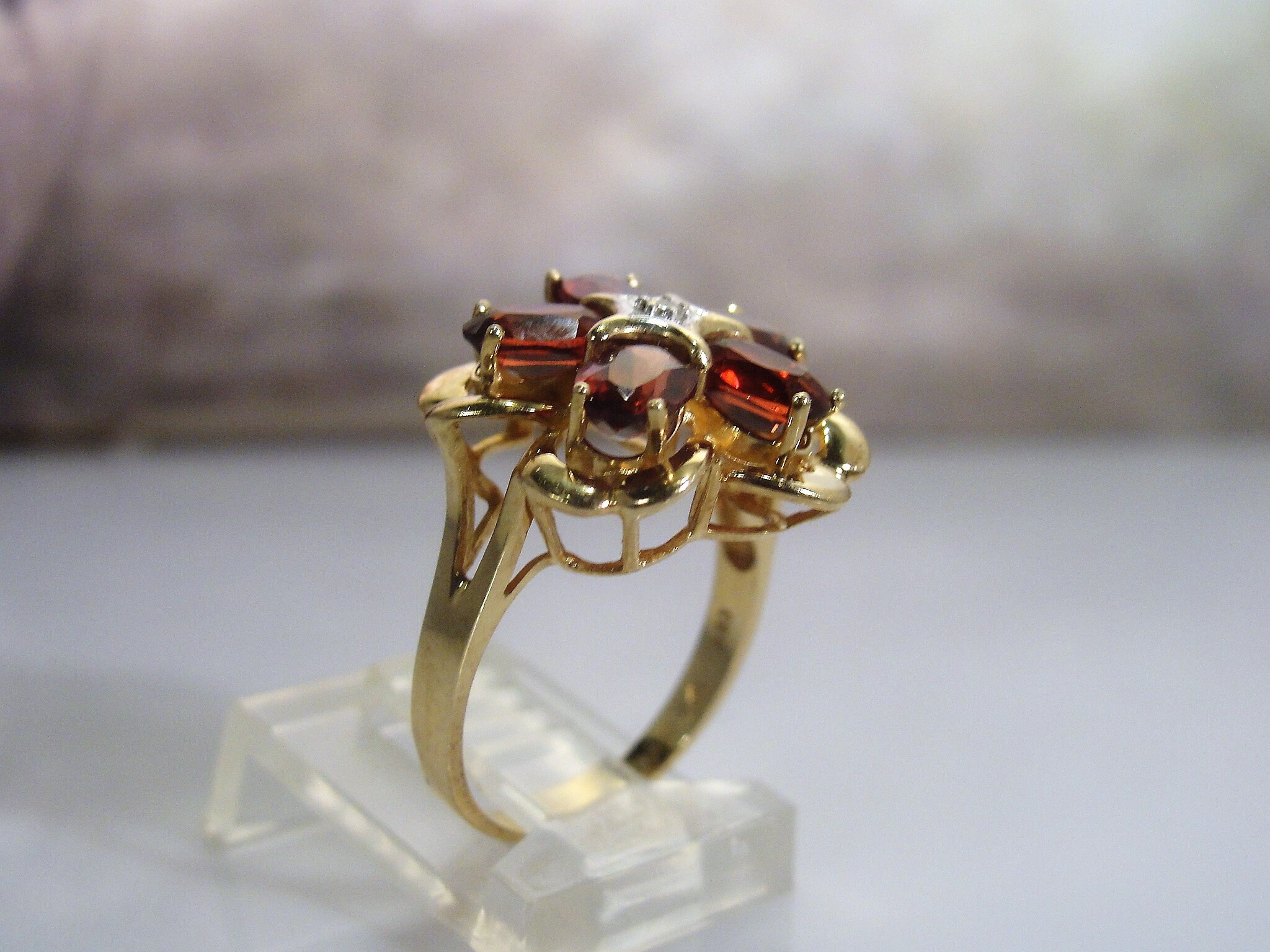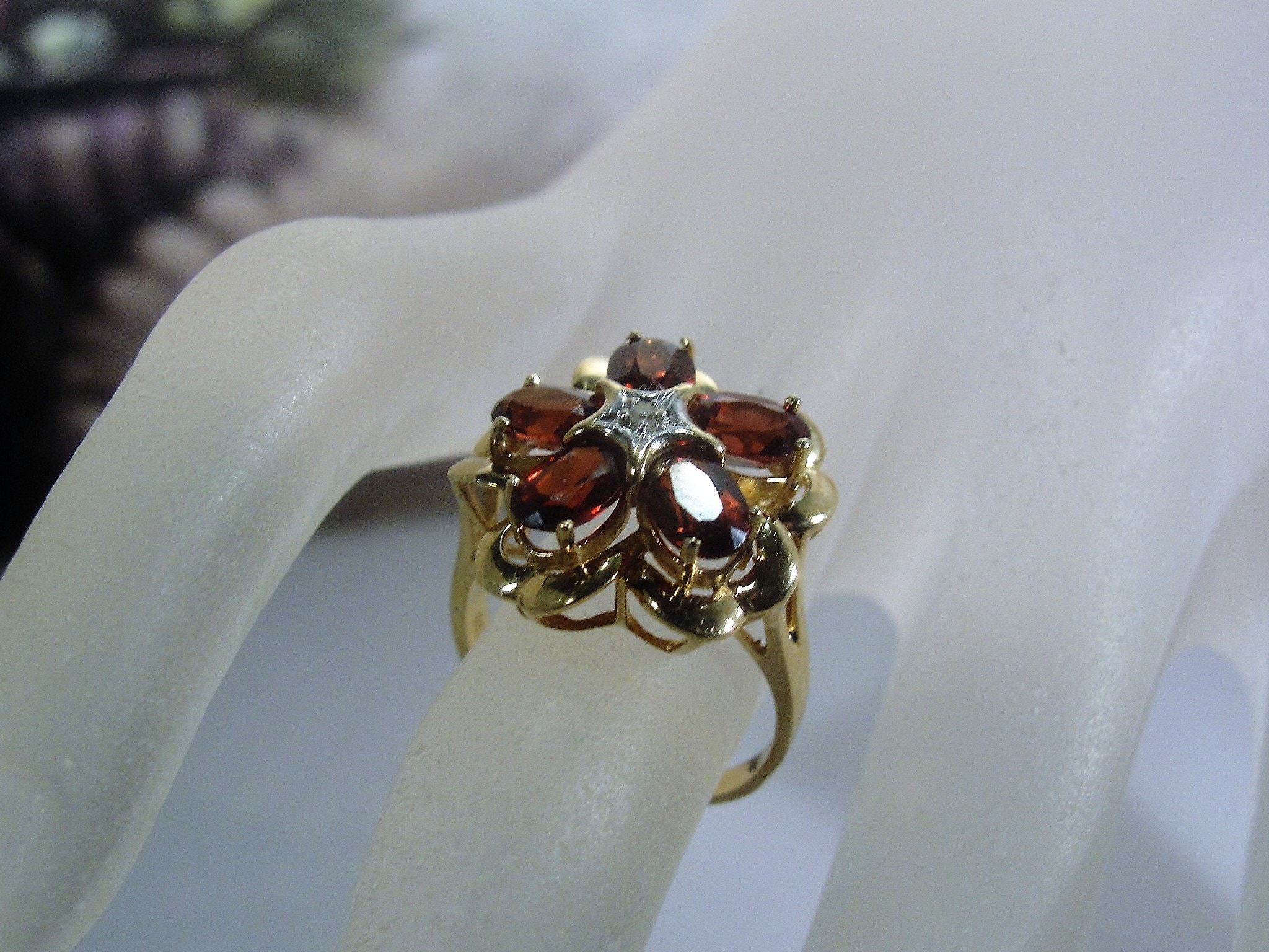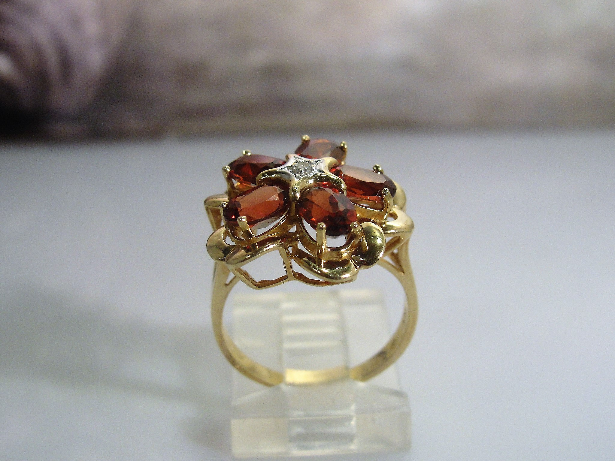 • Gem Information: There are 5 genuine garnet gems that measure 6mm x 4mm for a total of 2.5 Carats; these gems are oval cut and are faceted; the diamond is a 2.0mm single cut diamond set in the center of the ring