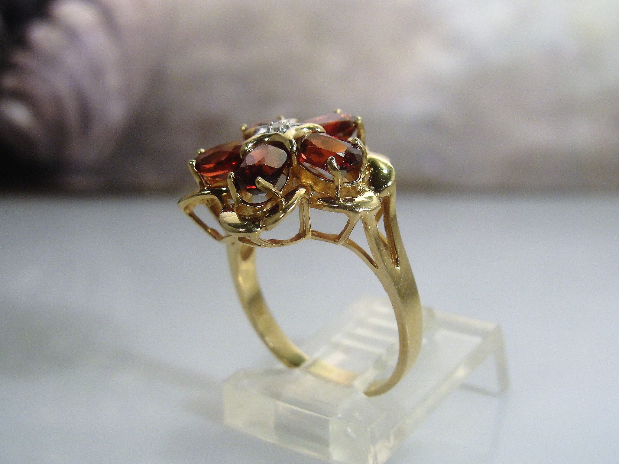This is a lovely 10K Garnet and Diamond Ring that is done in a Flower Motif. The contrast between the dark Red and the Yellow Gold that surrounds each petal is simply striking. The star in the center is done in 10K White gold to easily present the center of the flower with one single cut diamond. The edges of the center or star in the flower also acts as a curved prong to hold the petals securely in place. Simply a beautifully made ring that presents so femininely and beautifully.