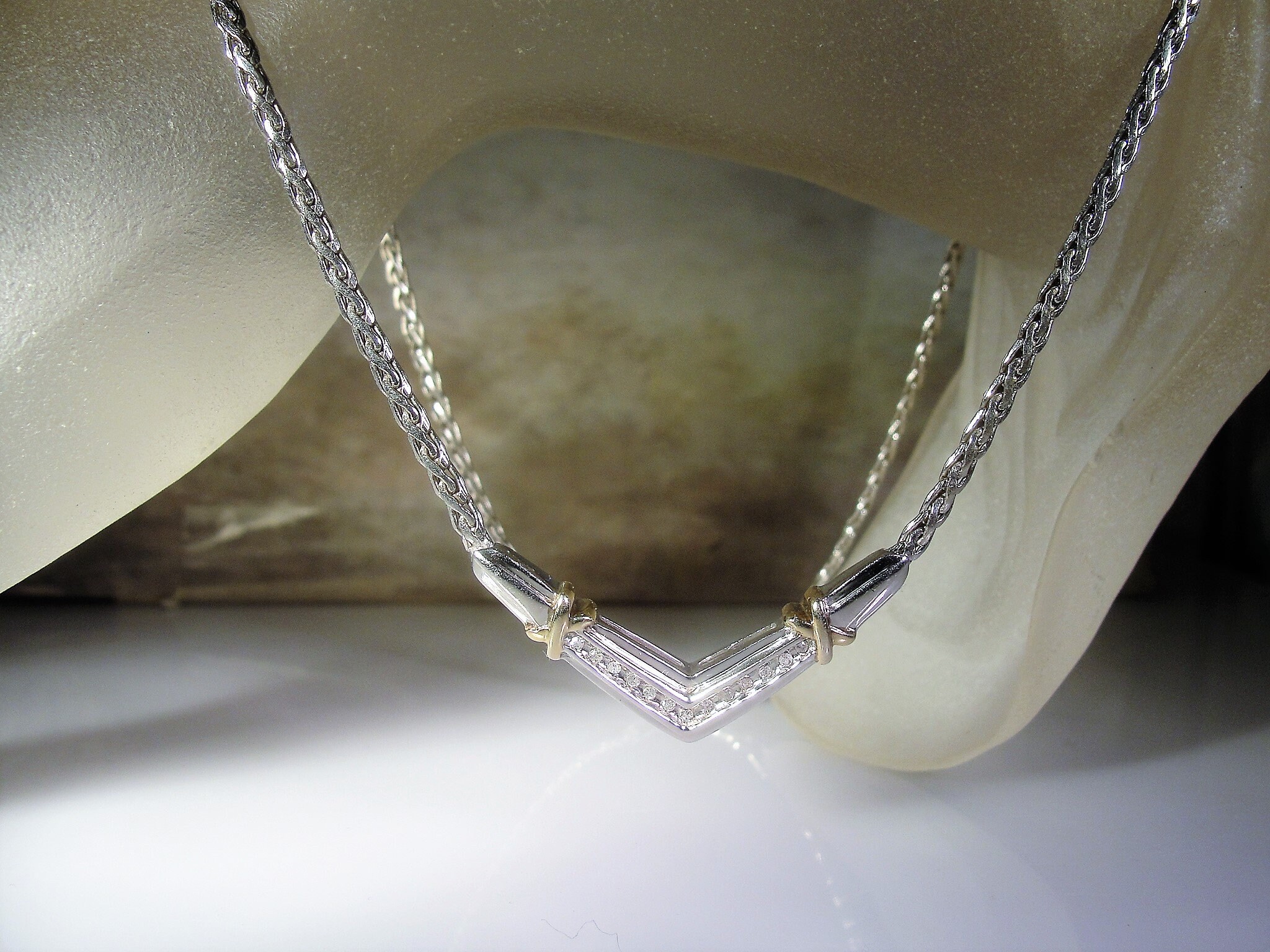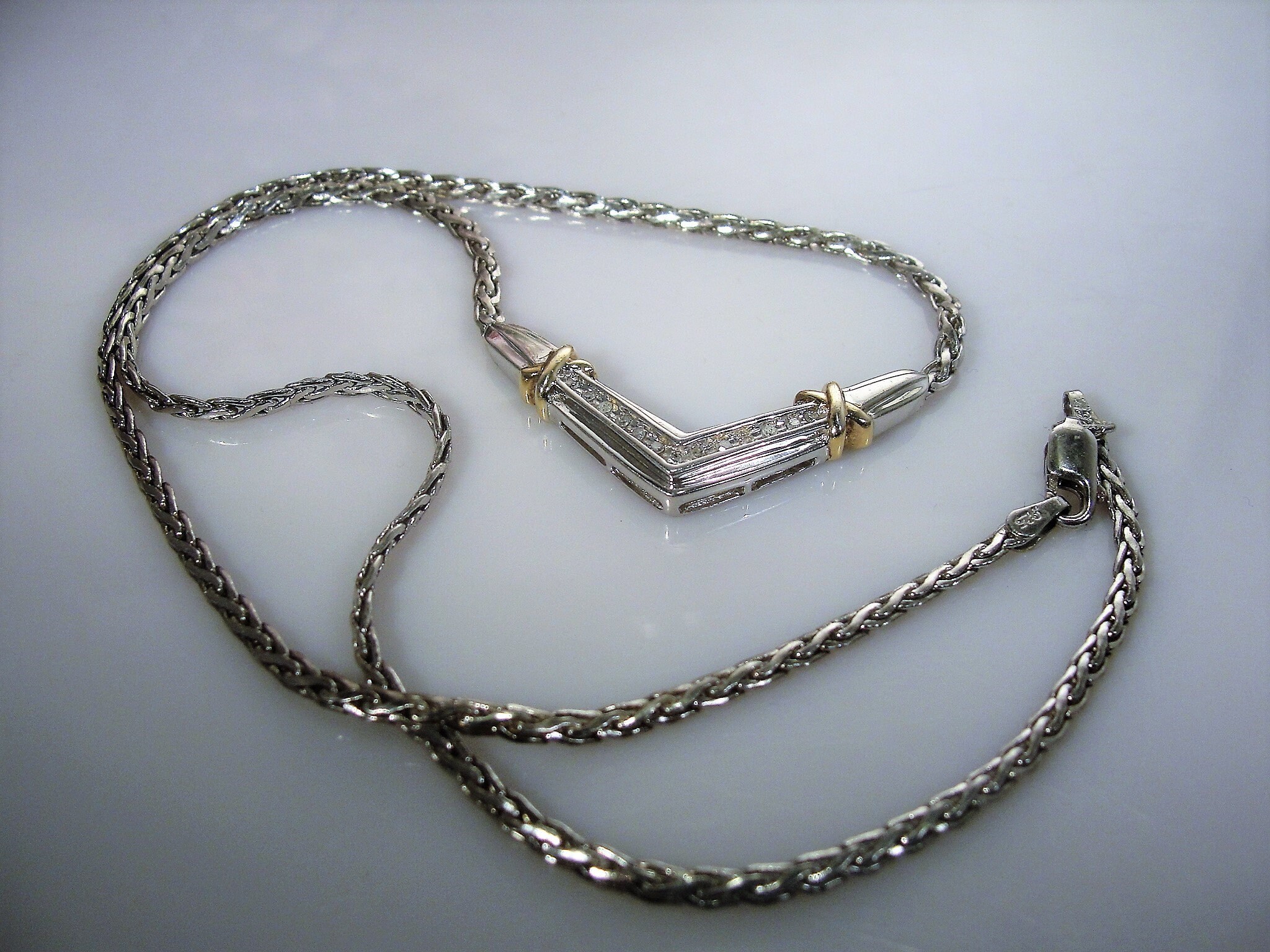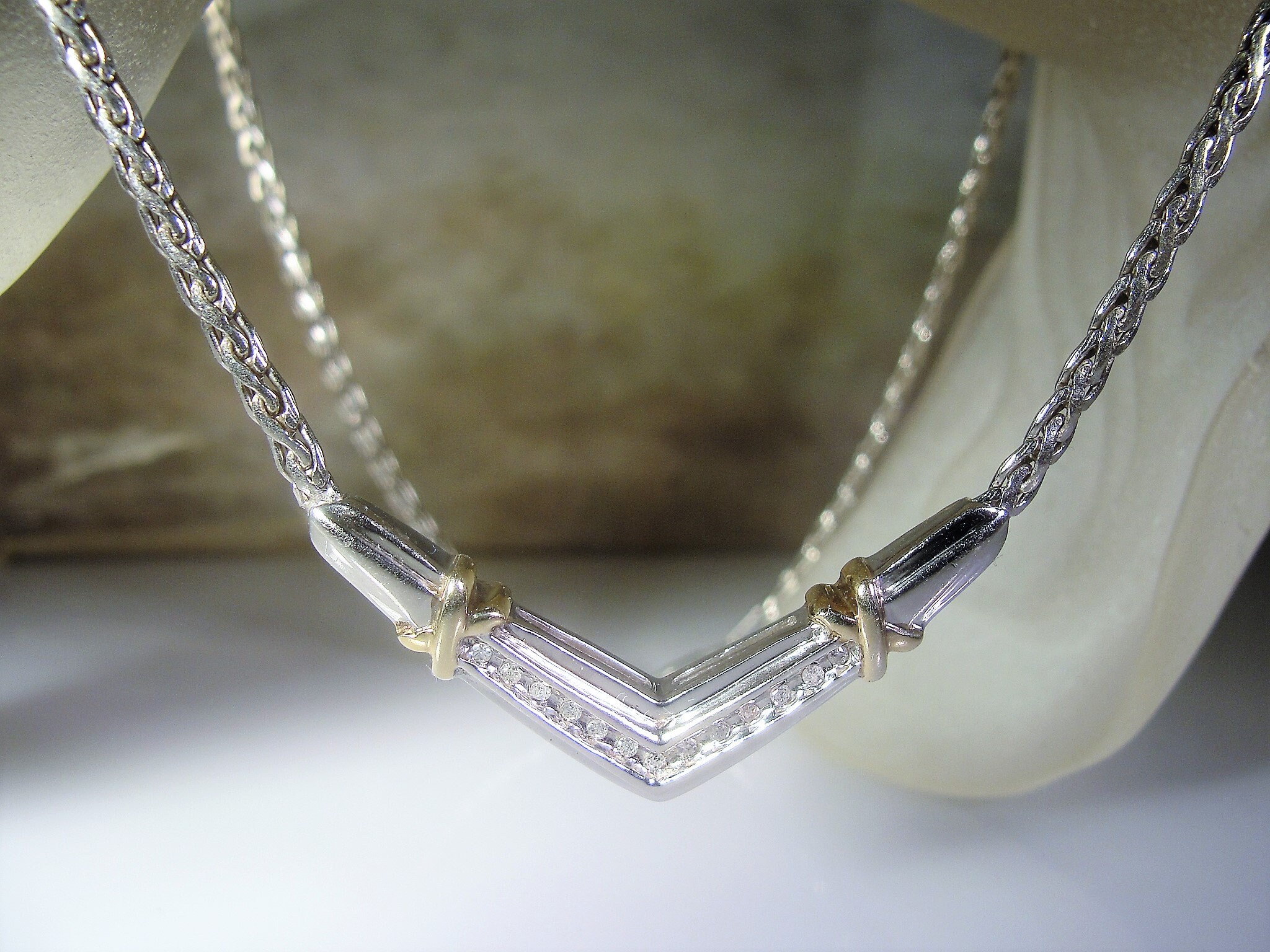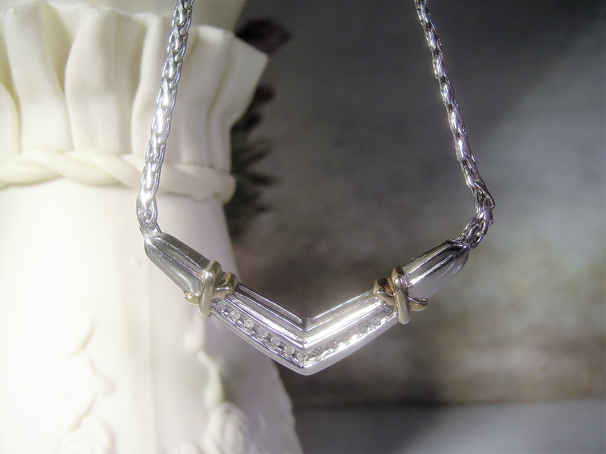 This is a lovely Sterling Silver Necklace with Genuine Diamonds that are channel set in a Chevron Style Pendant. The chain is a beautiful Byzantine Style chain that is beautifully crafted. This necklace has a nice flat lobster clasp and it locks securely. This necklace has 13 genuine round diamonds and are approximately 1.0mm each for a total carat weight of .13 carats. The Pendant also has two gold “X”s with one on each side of the pendant at the end of the row of diamonds… a kiss on both sides of the necklace! If you are looking for a neutral color necklace with a touch of bling that is also great for every day wear, then stop and consider this necklace as your choice!