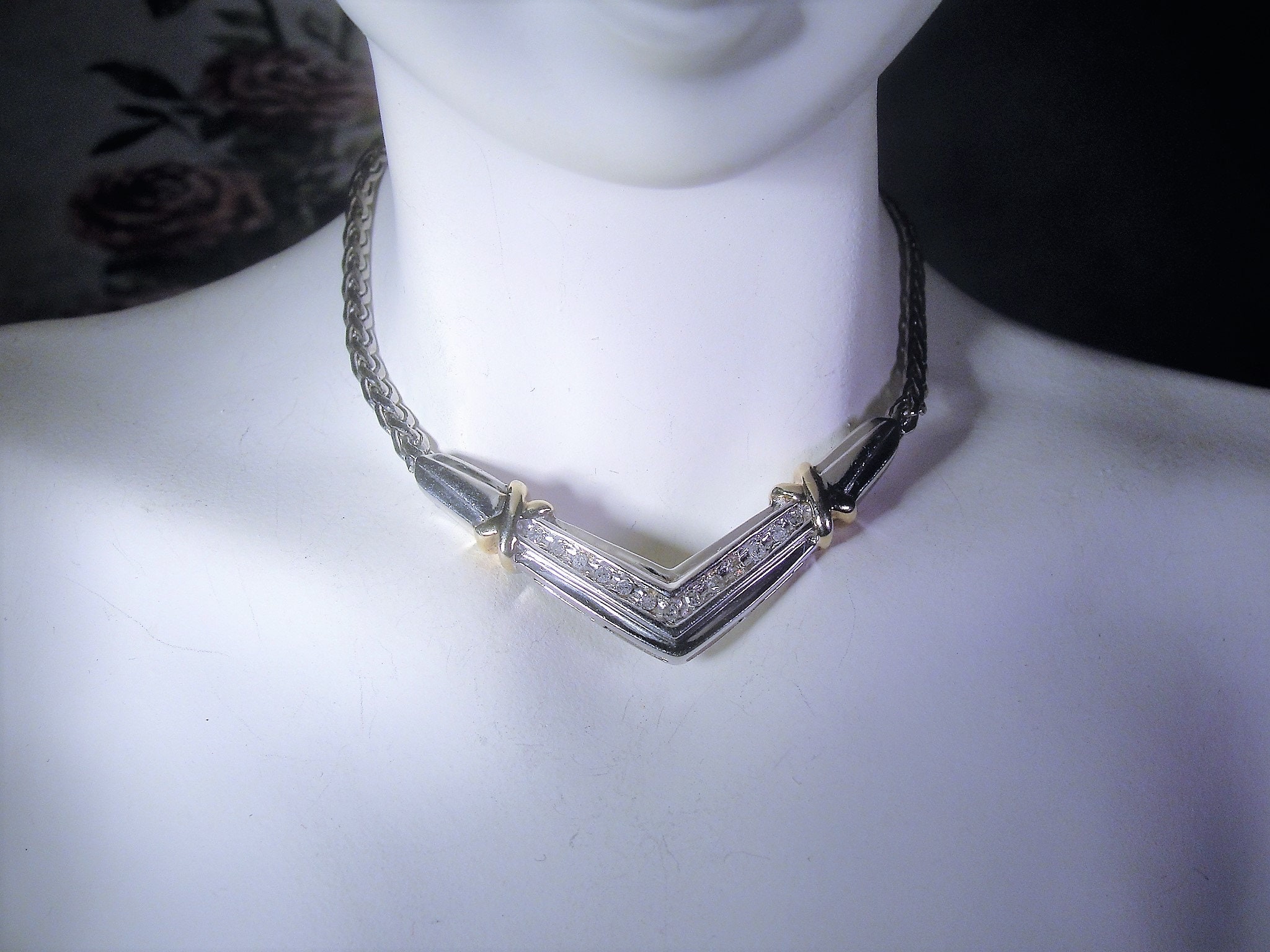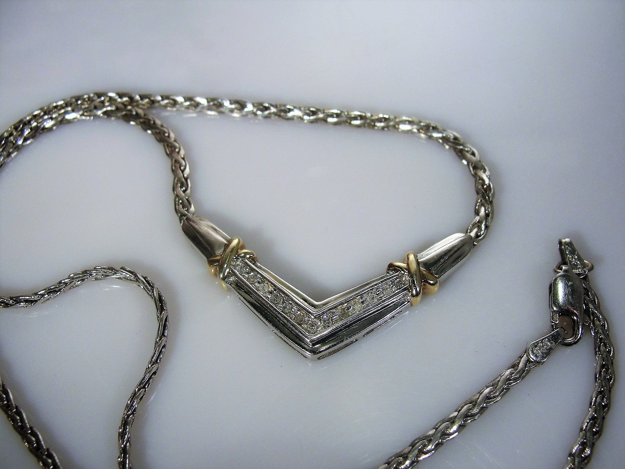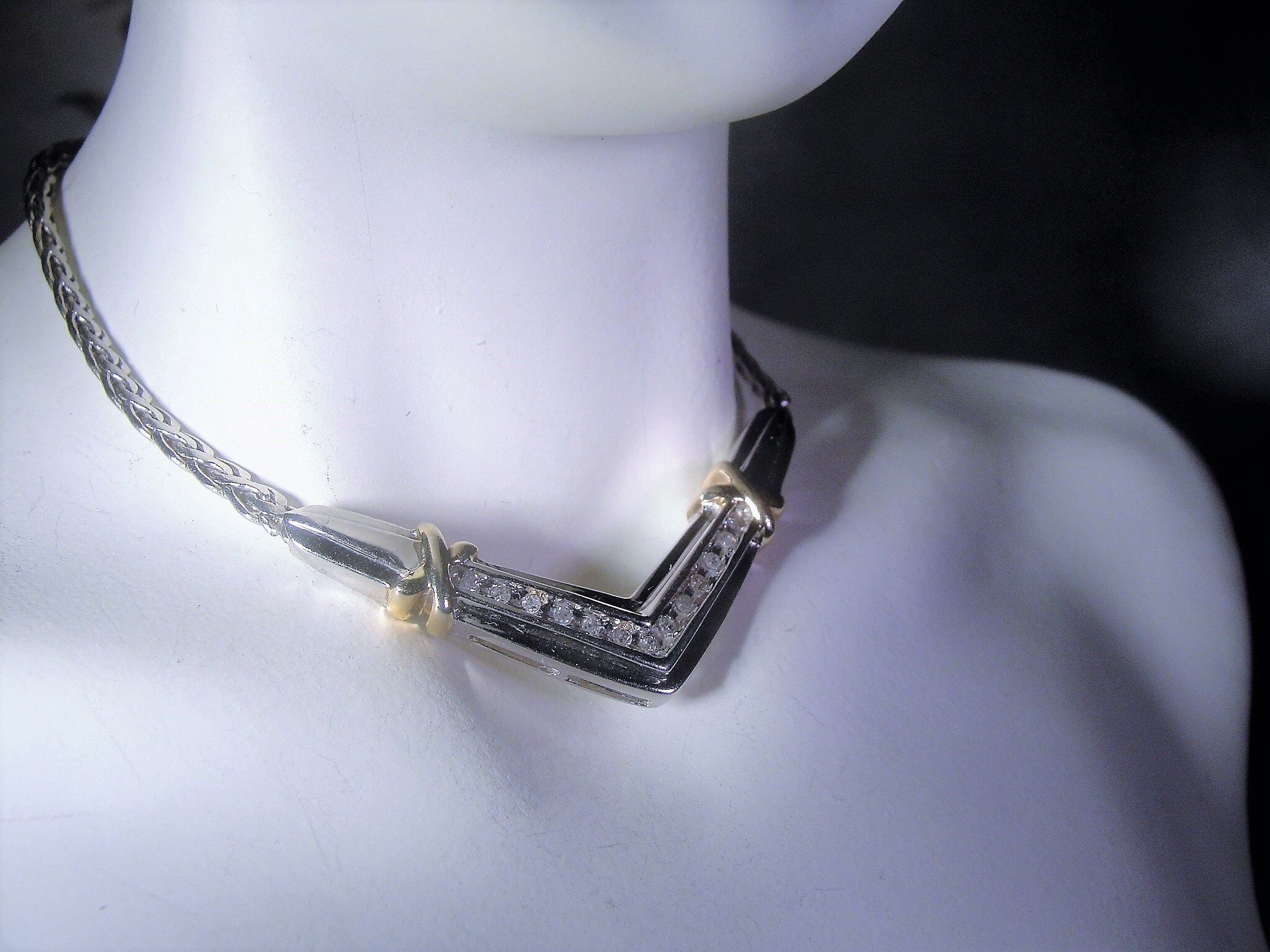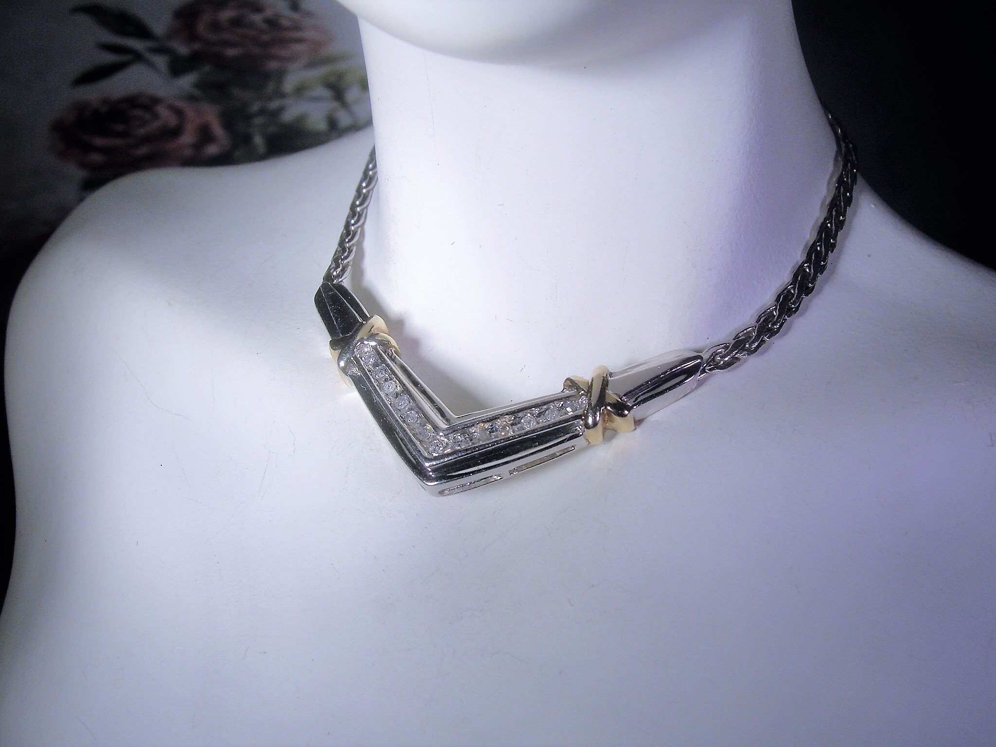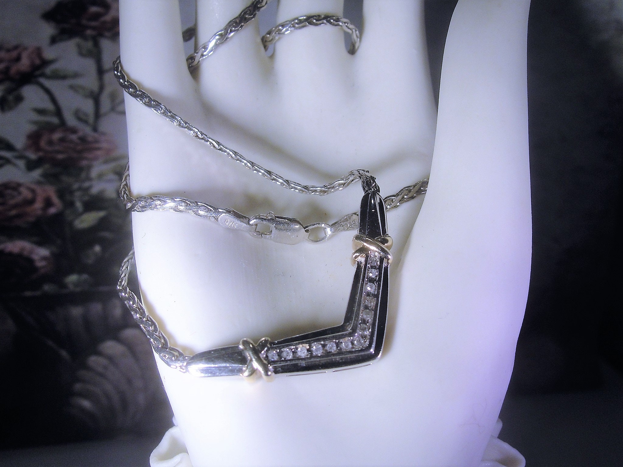 This is a lovely Sterling Silver Necklace with Genuine Diamonds that are channel set in a Chevron Style Pendant. The chain is a beautiful Byzantine Style chain that is beautifully crafted. This necklace has a nice flat lobster clasp and it locks securely. This necklace has 13 genuine round diamonds and are approximately 1.0mm each for a total carat weight of .13 carats. The Pendant also has two gold “X”s with one on each side of the pendant at the end of the row of diamonds… a kiss on both sides of the necklace! If you are looking for a neutral color necklace with a touch of bling that is also great for every day wear, then stop and consider this necklace as your choice!