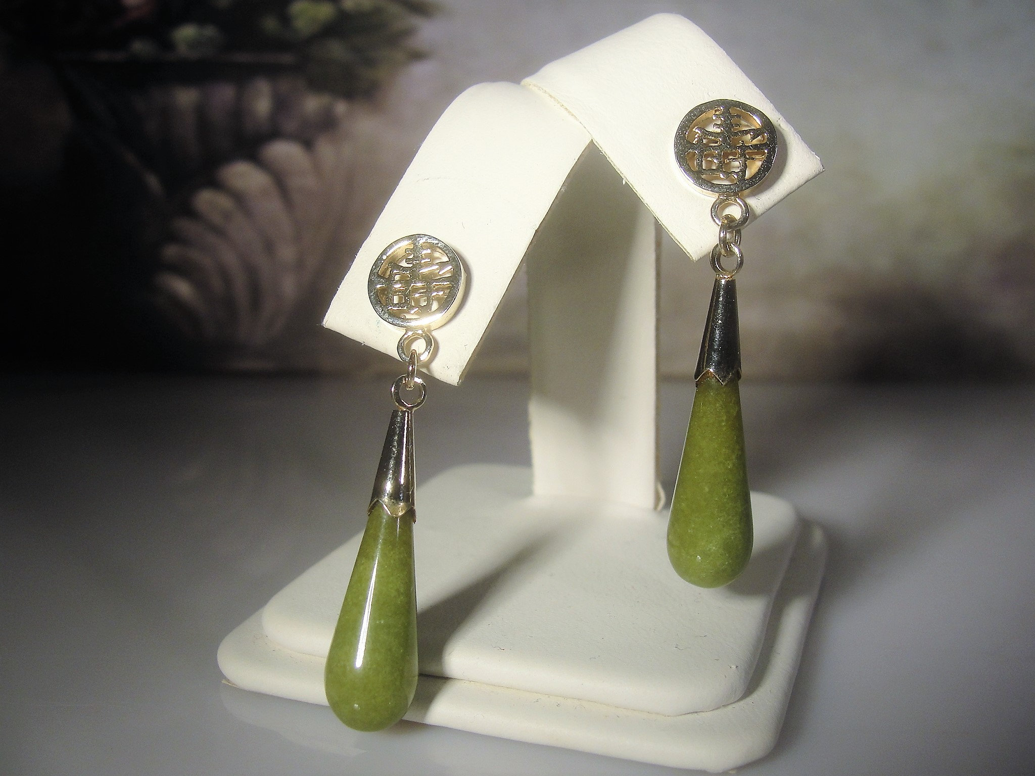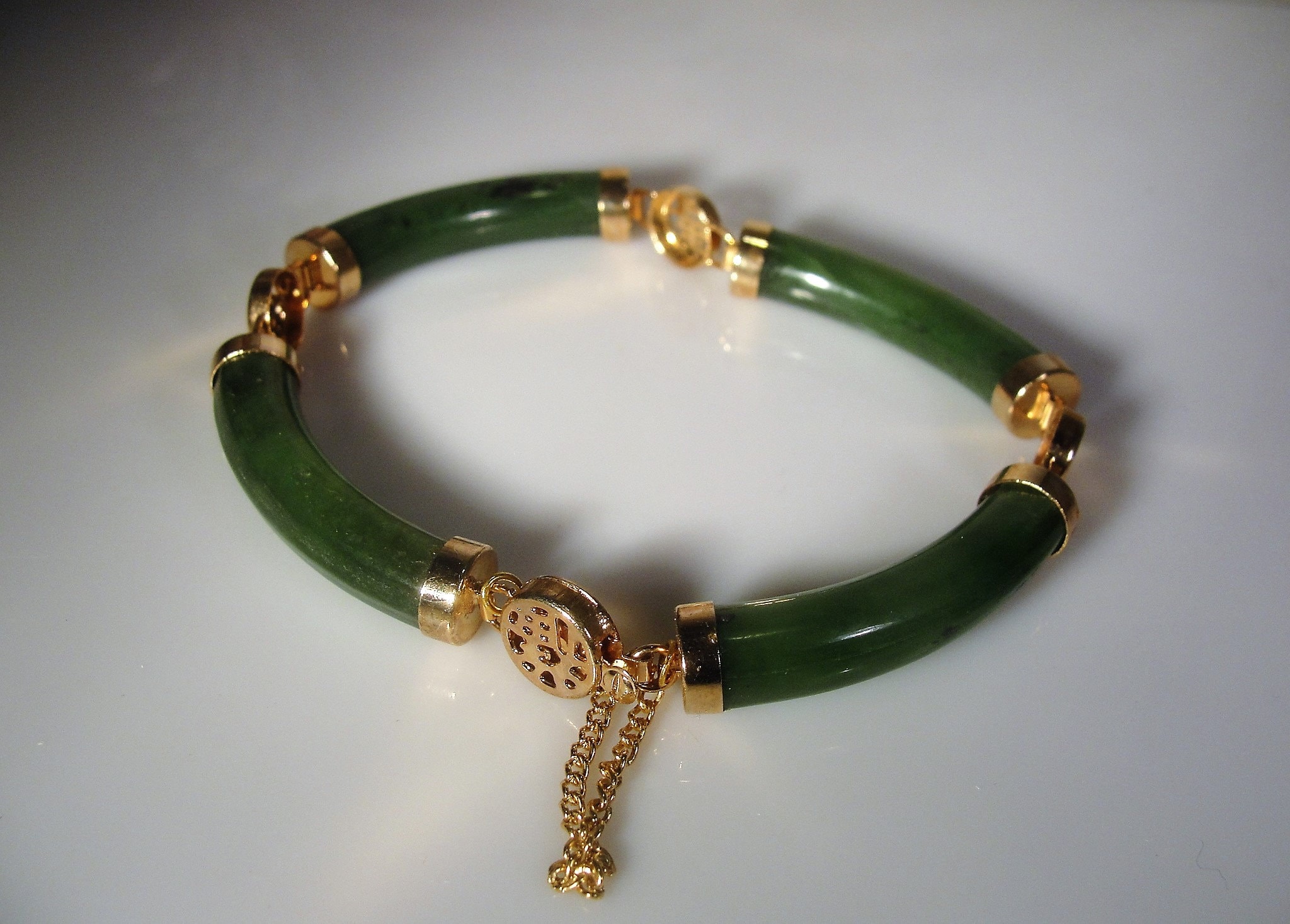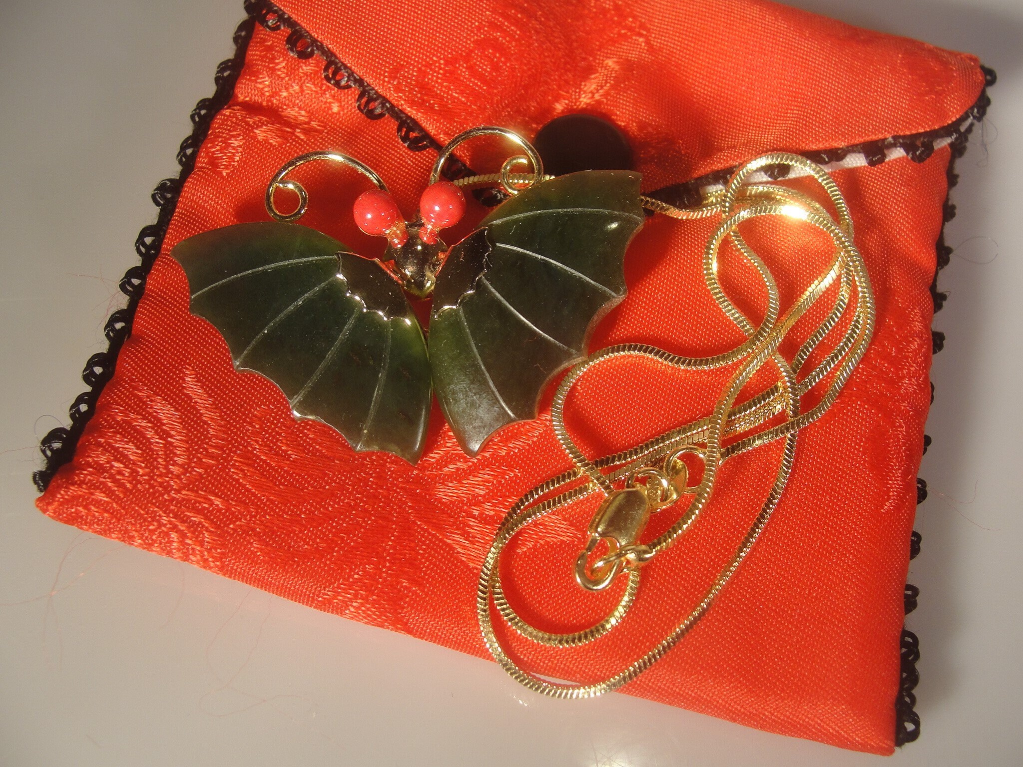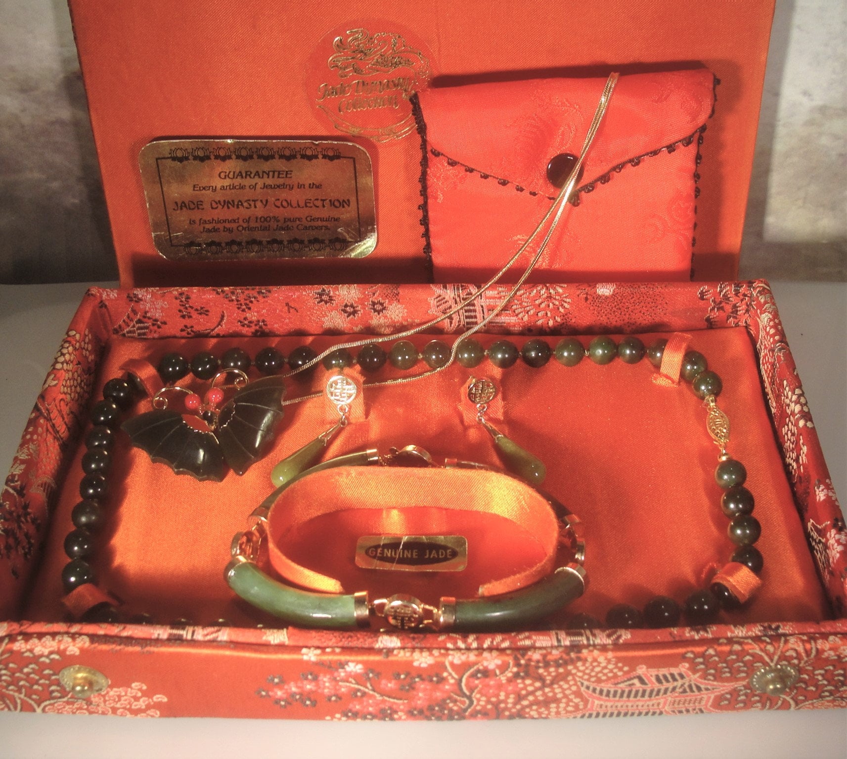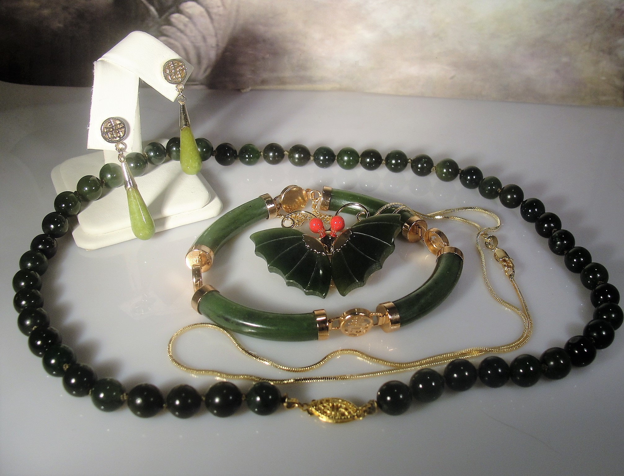 Inside, you will find a lovely collection consisting of a hand knotted spinach green 8mm jade beaded necklace that is 18 inches in length with a gold filled clasp, a pair of gold tone dangle jade earrings with Chinese markings at the top; I believe they may be the signs for prosperity. A beautiful jade tube bracelet with round Chinese emblems set in between each jade tube. This bracelet is also close to a spinach green color with some variations of color in the jade. And finally, a wonderful convertible butterfly brooch that has bright red eyes and dark green jade wings with gold trim.