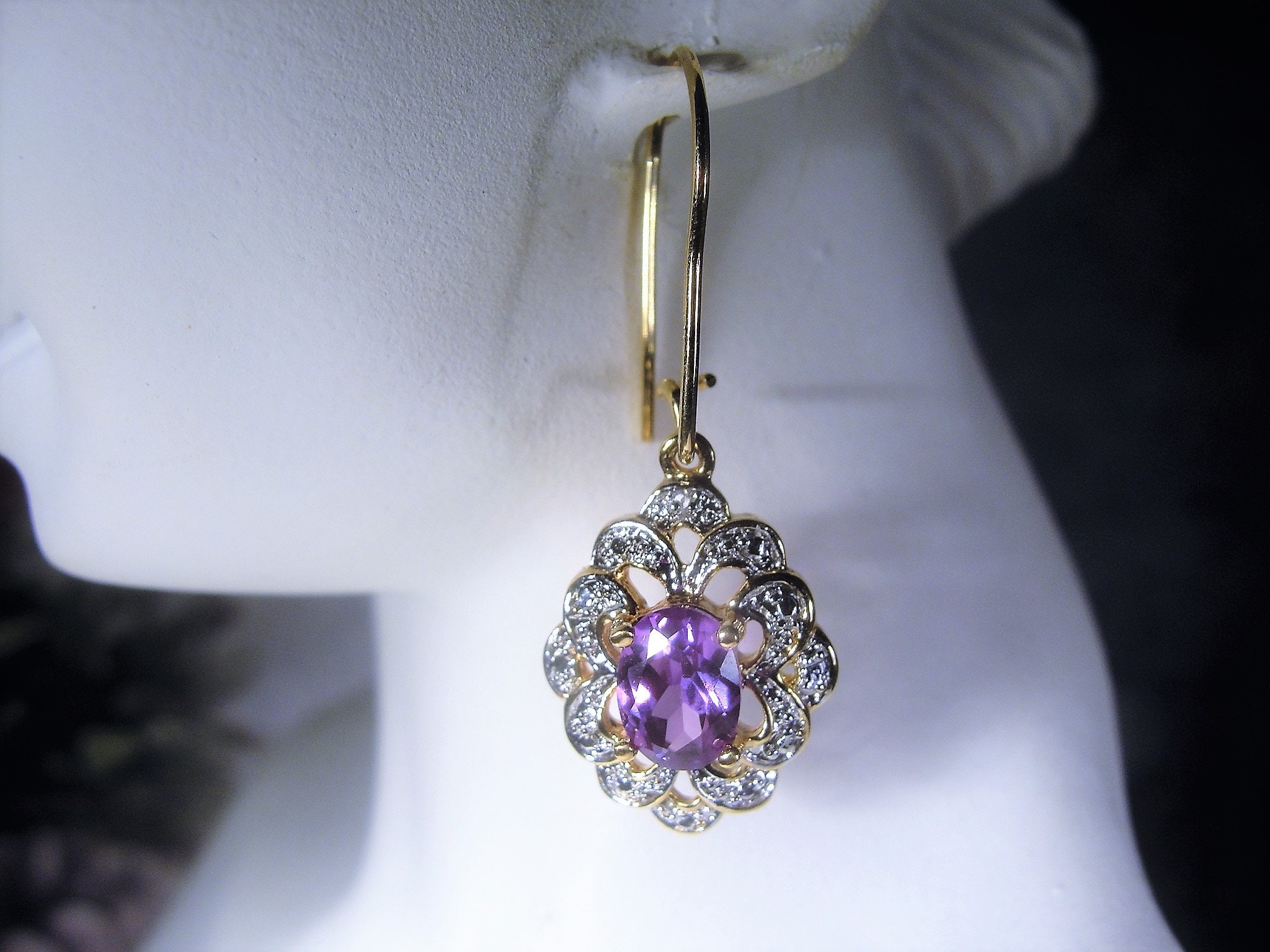 The earrings are a perfect match to the ring except that it only has one oval cut lab created gem in the center of the dangle part of the earrings and it has the same lacy border around the edges as the ring has. These earrings are French hook earrings and are made for pierced ears.