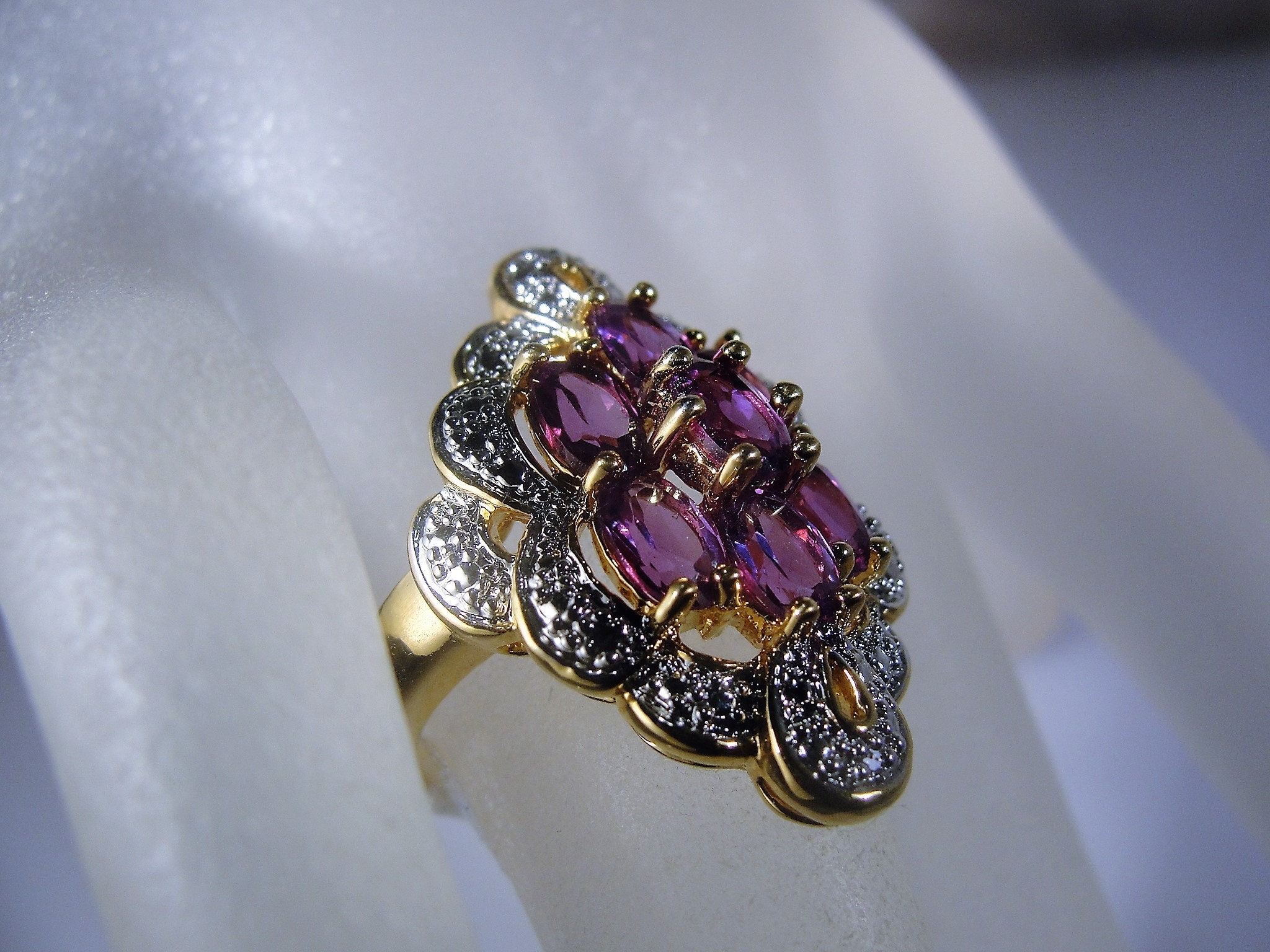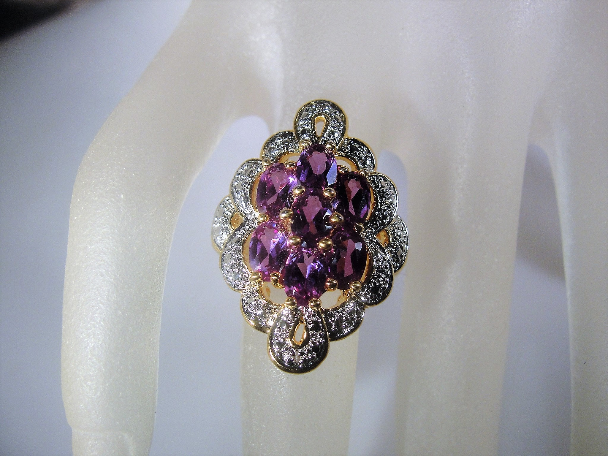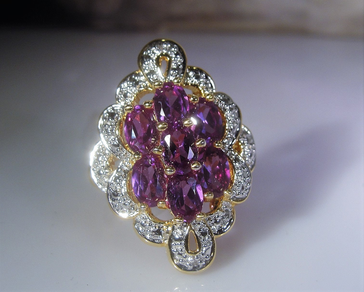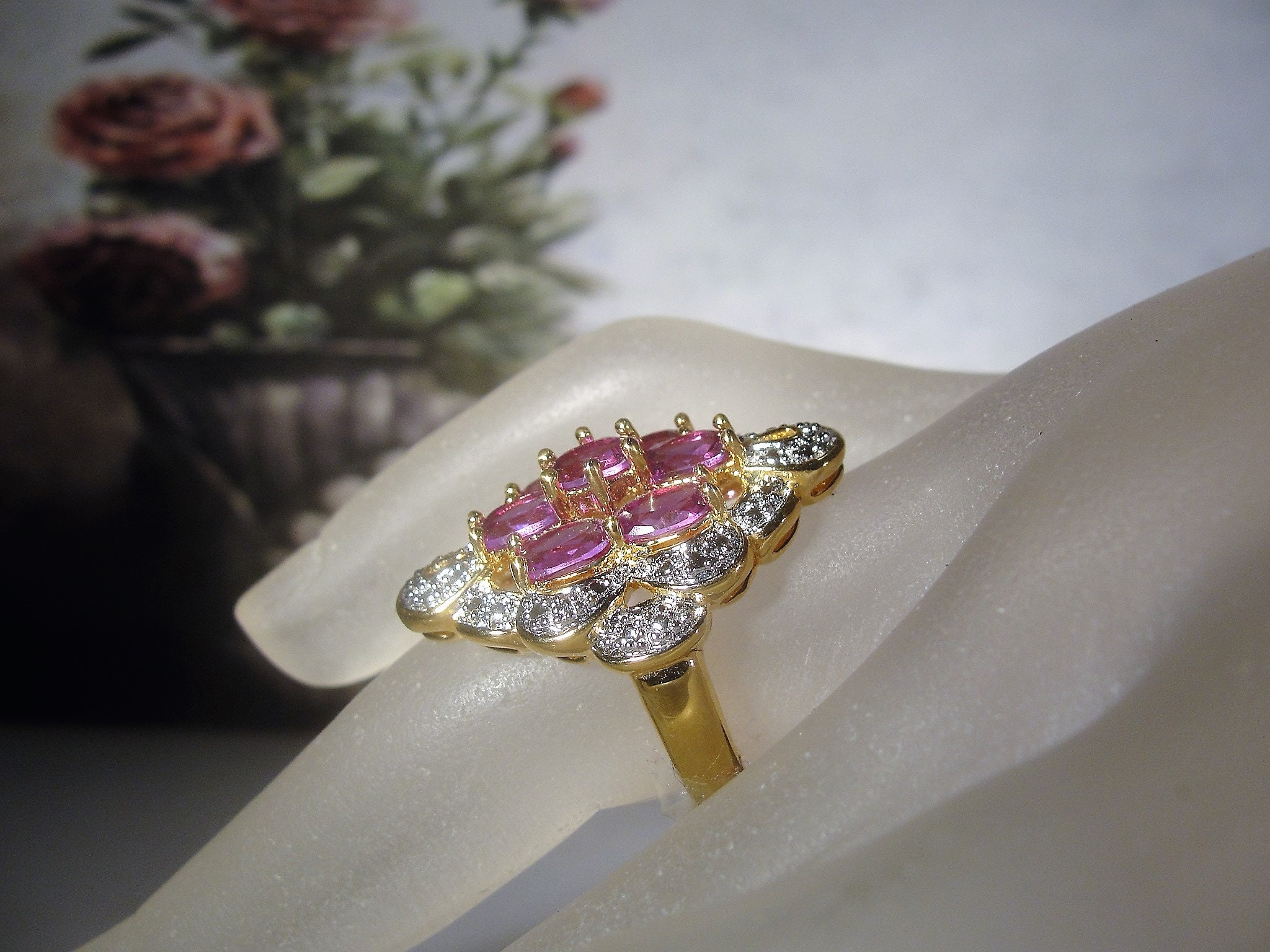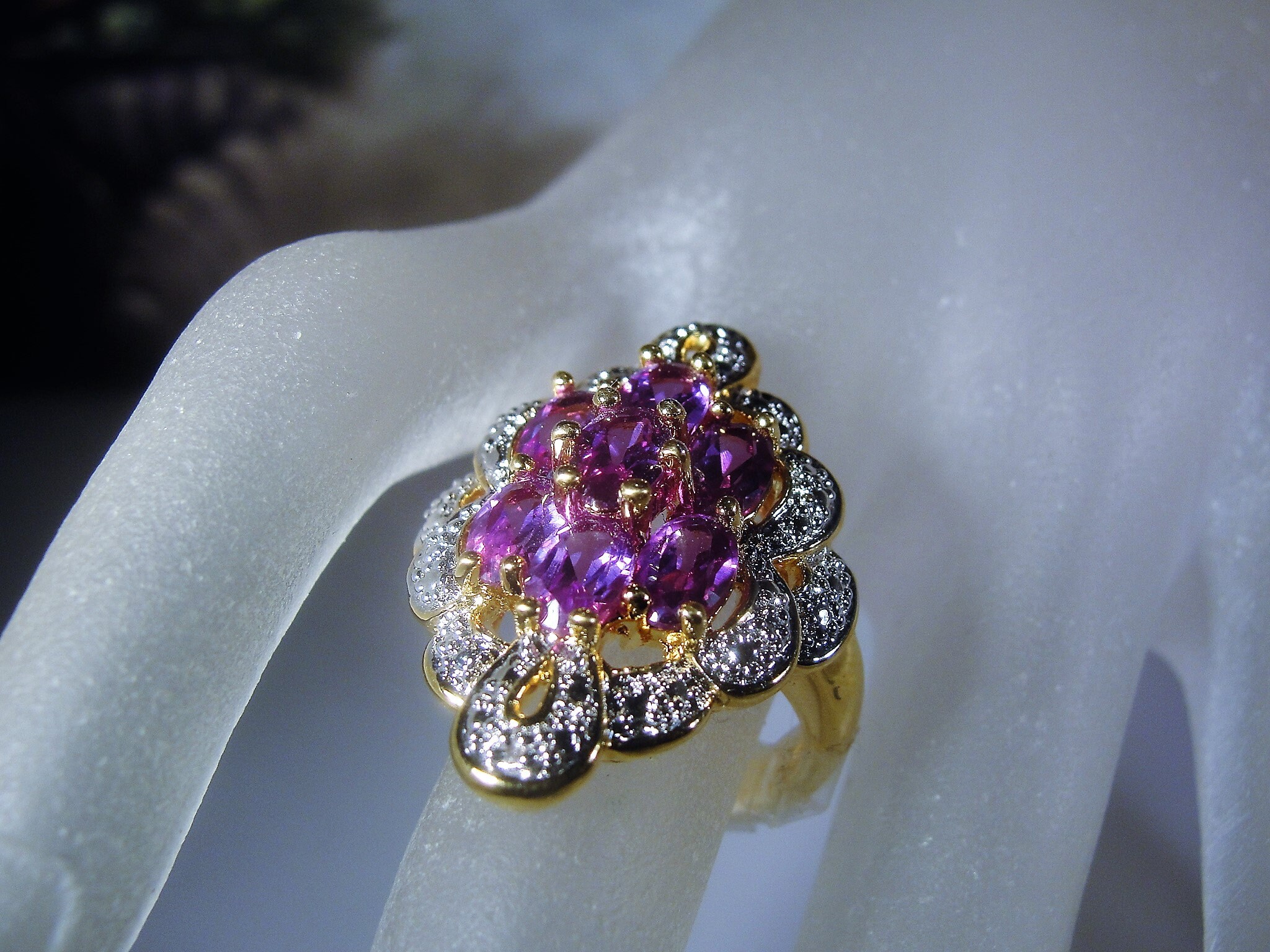 The ring is shaped in Marquise Style Ring. It has 7 oval cut Lab Created Change Sapphires in the center done in a flower motif. Around it is a Sterling Silver lacy design border with scalloped edges and 4 diamond chips strategically set to give the ring a touch of sparkle and bling.