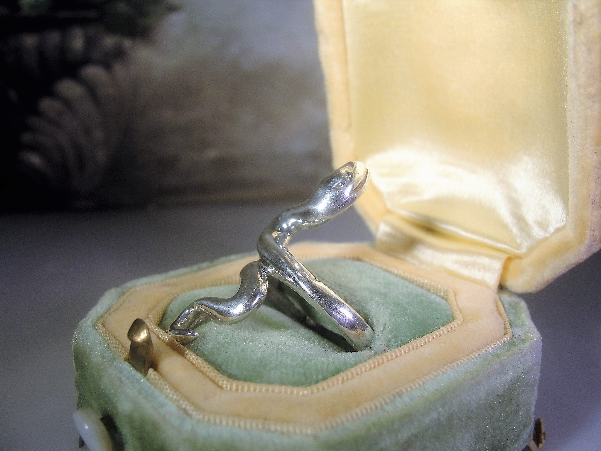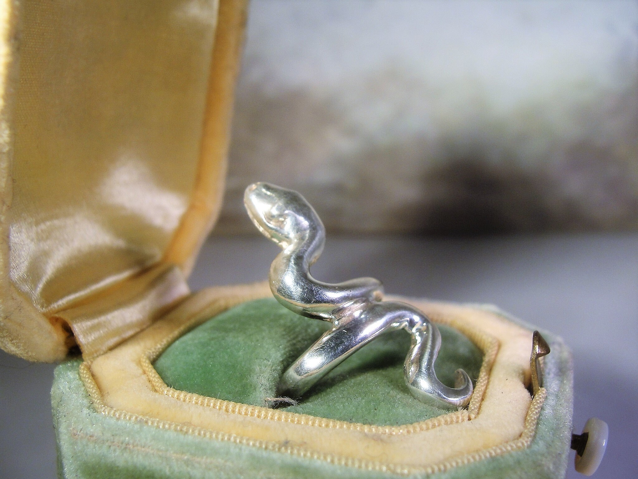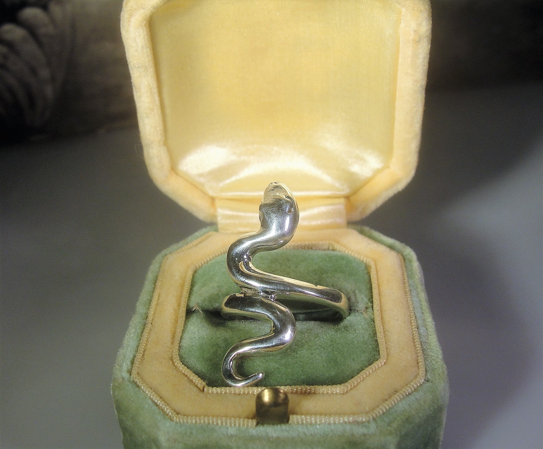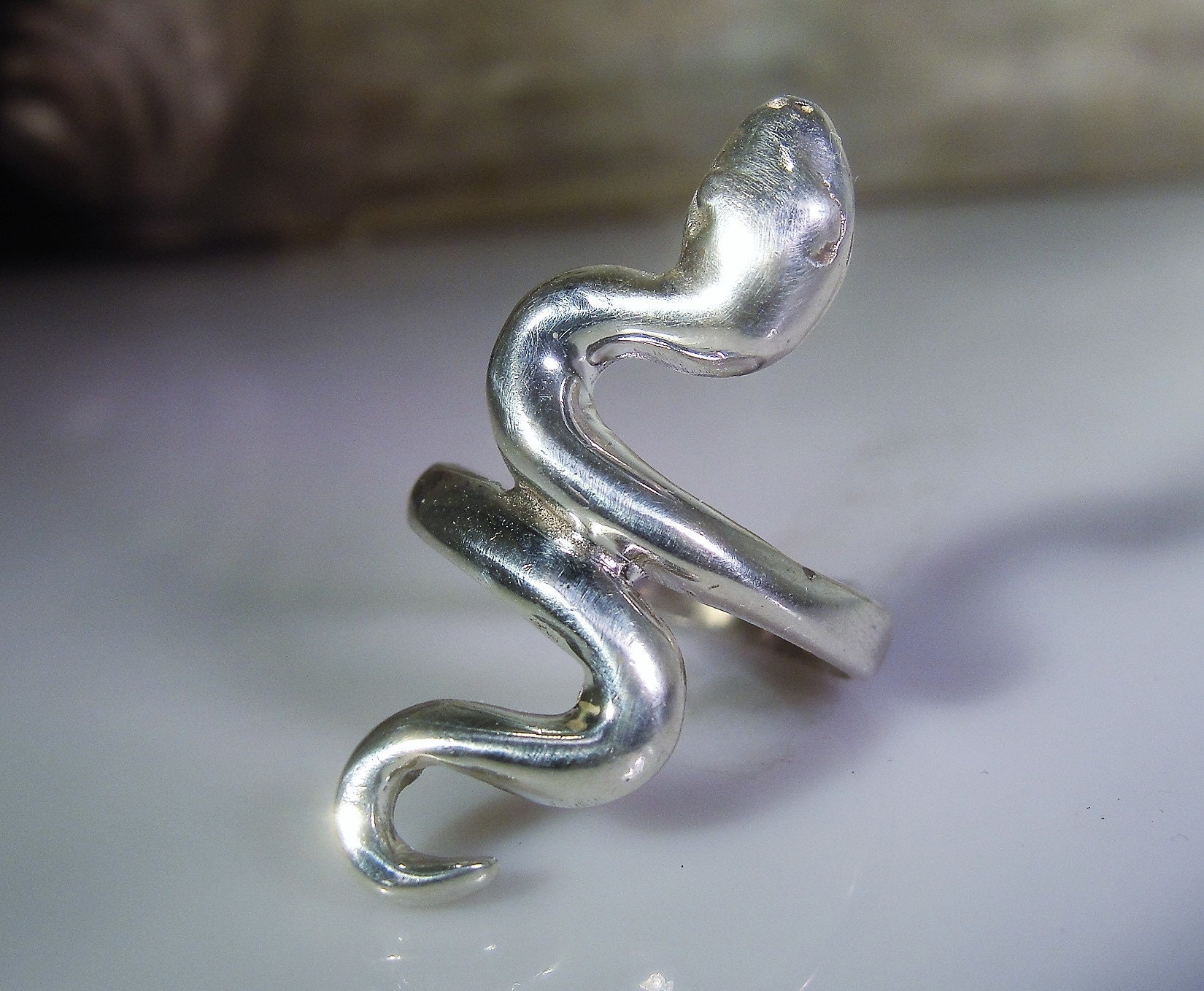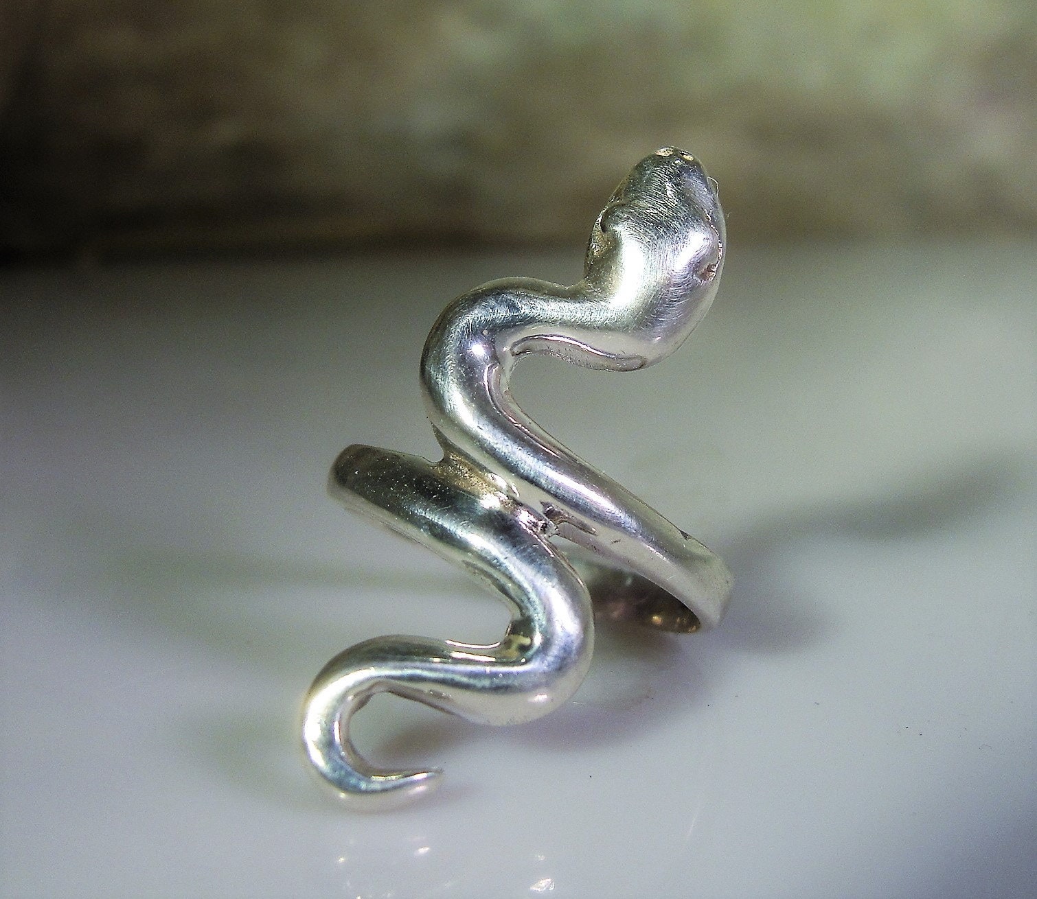This is a very nice, clean Sterling Silver Snake Ring. It has a very sleek, clean design with snake presenting on the top of the ring in a by-pass ring motif. In the center of the snake, the ring is soldered together, so it cannot be adjusted. Sizing can only take place by way of the band. This may be a handmade snake ring, based on how the undercarriage looks. This ring provides a really neat presentation when worn.