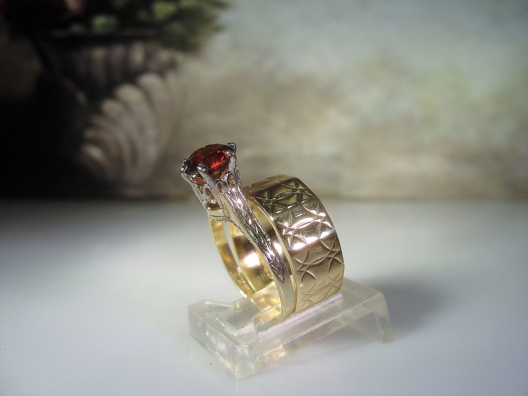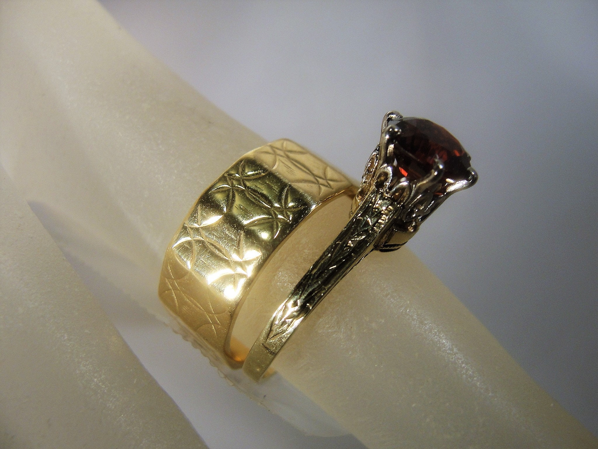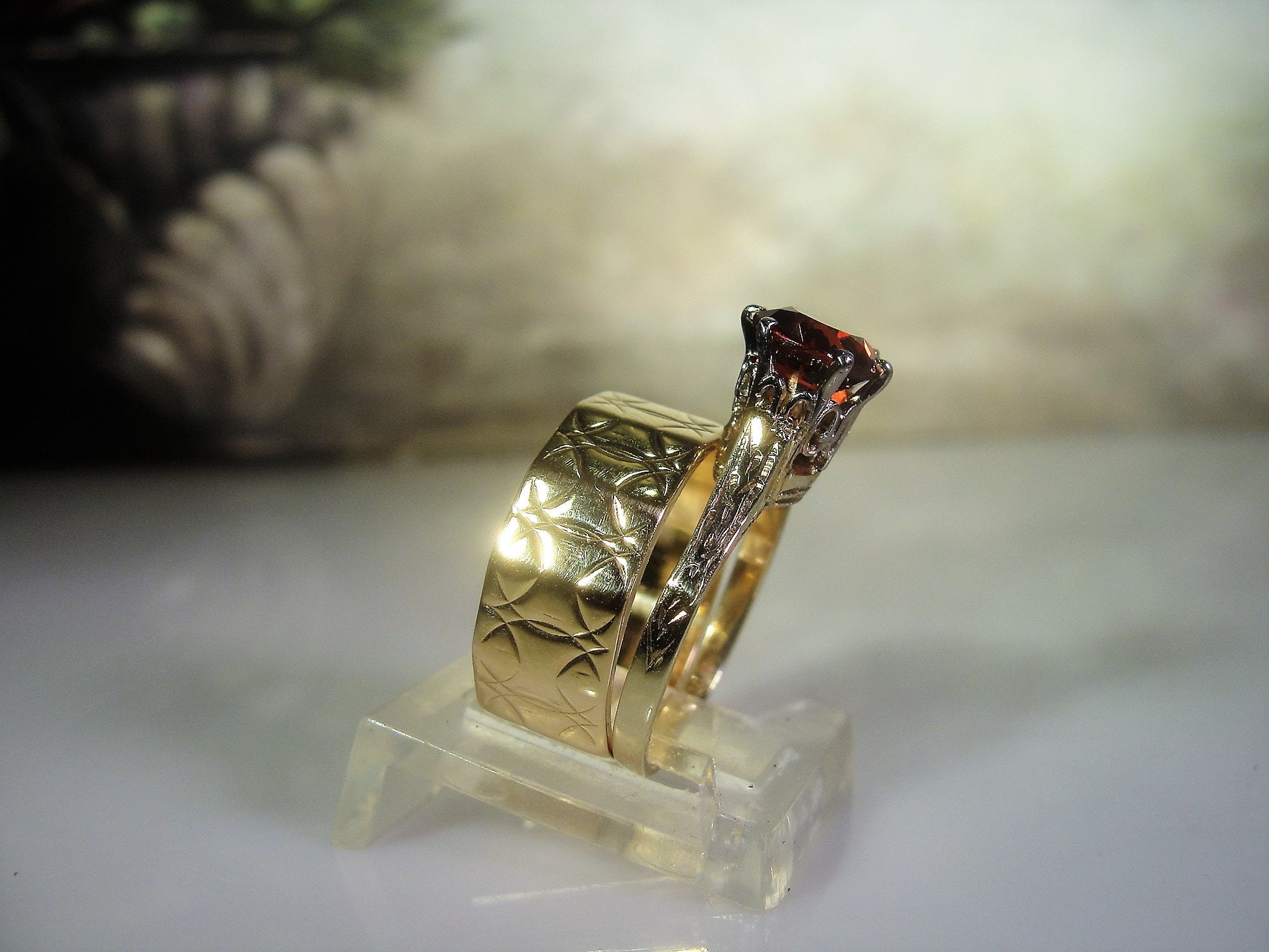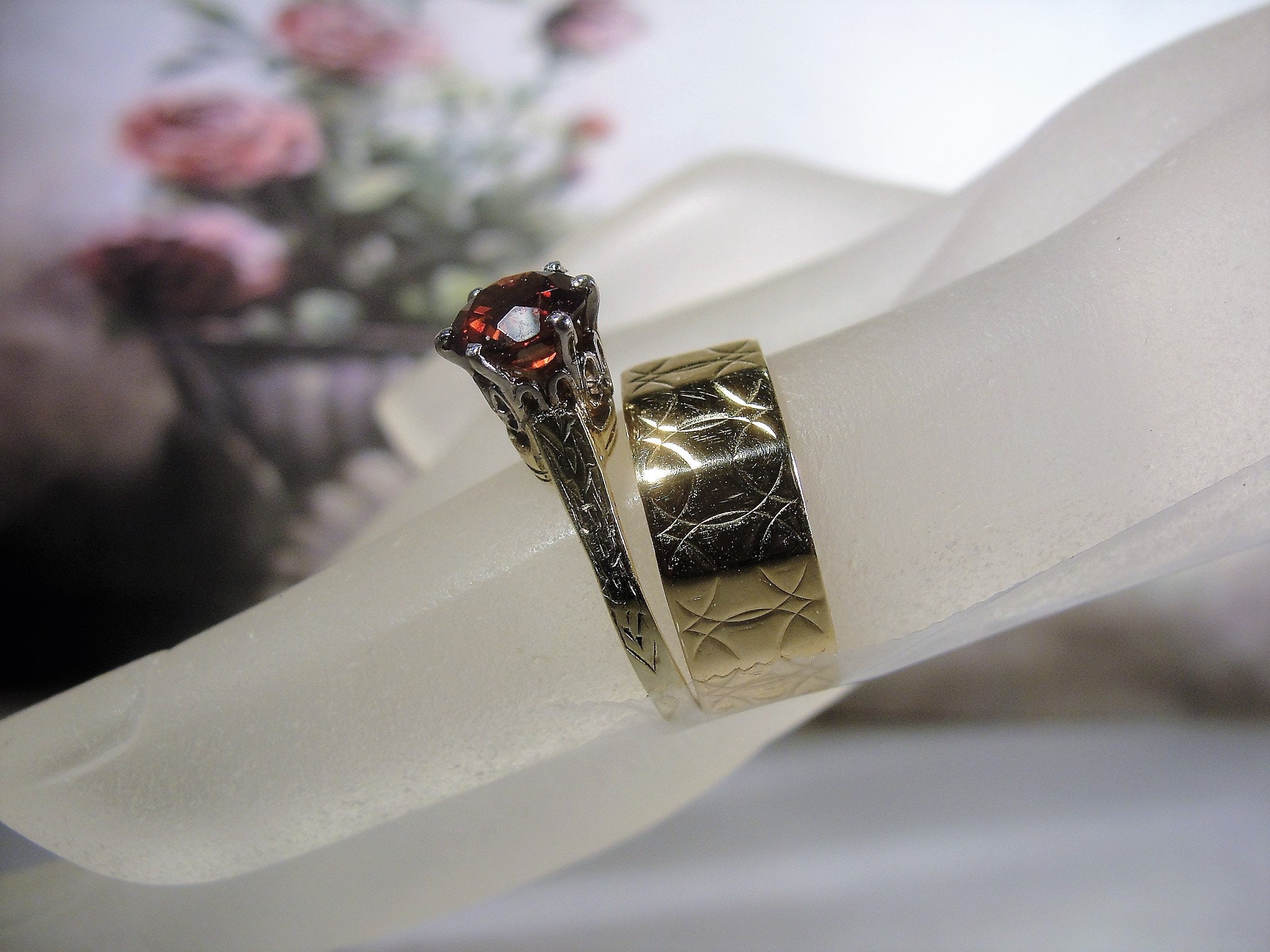 This is a beautiful Victorian Bridal Ring Set. The Engagement ring is a Garnet Solitaire Ring and the Wedding Band is a wide etched design Wedding Ring. These rings are a beautiful combination of elegance and simplicity. So very romantic and feminine.
