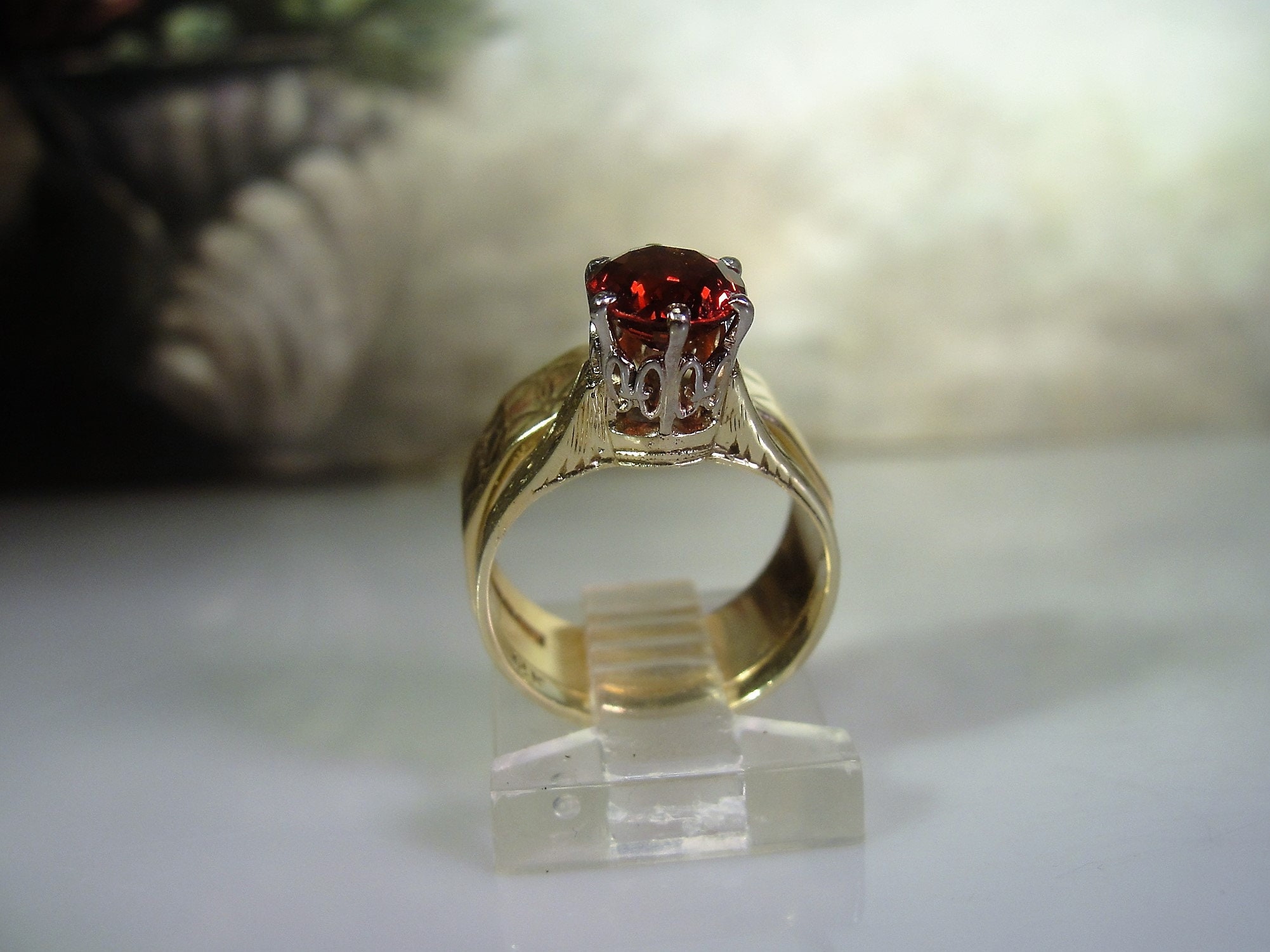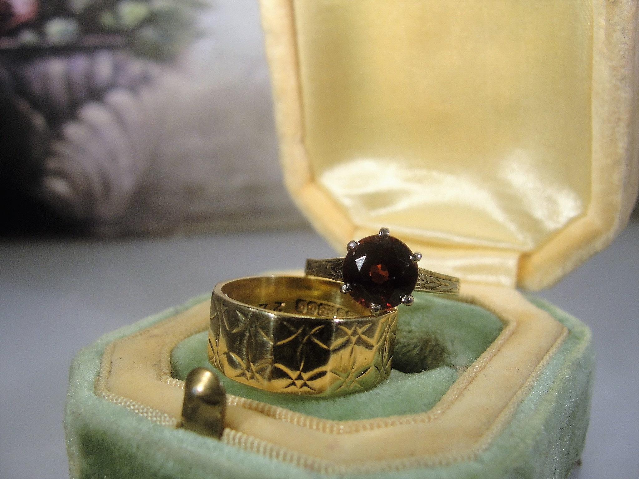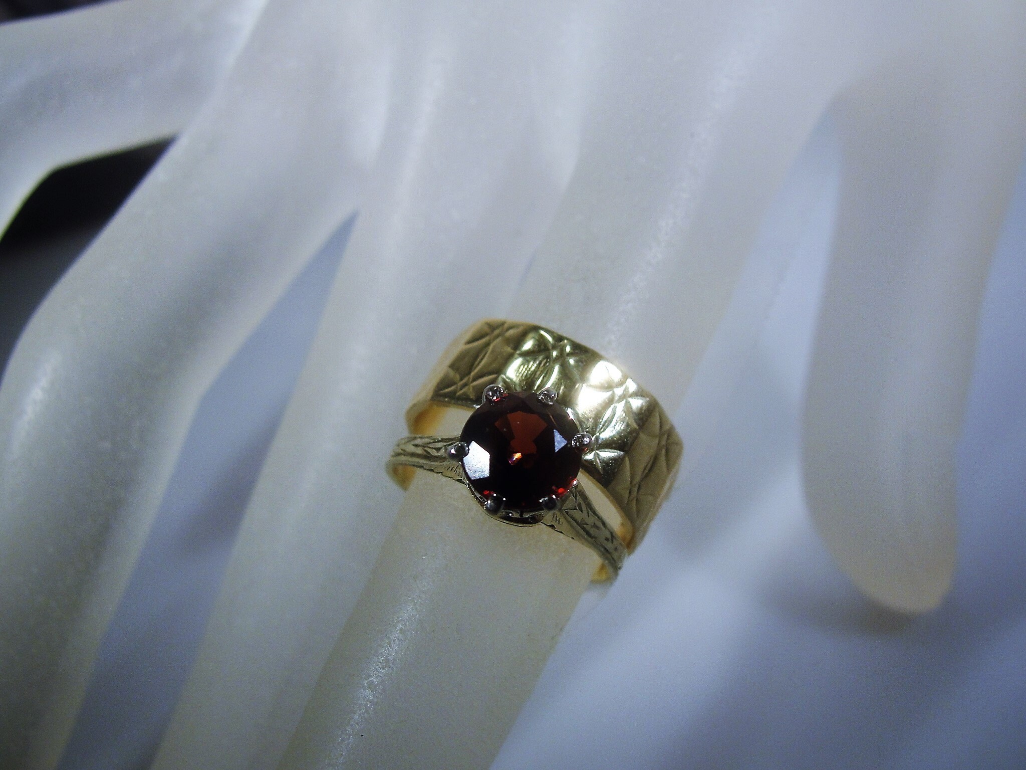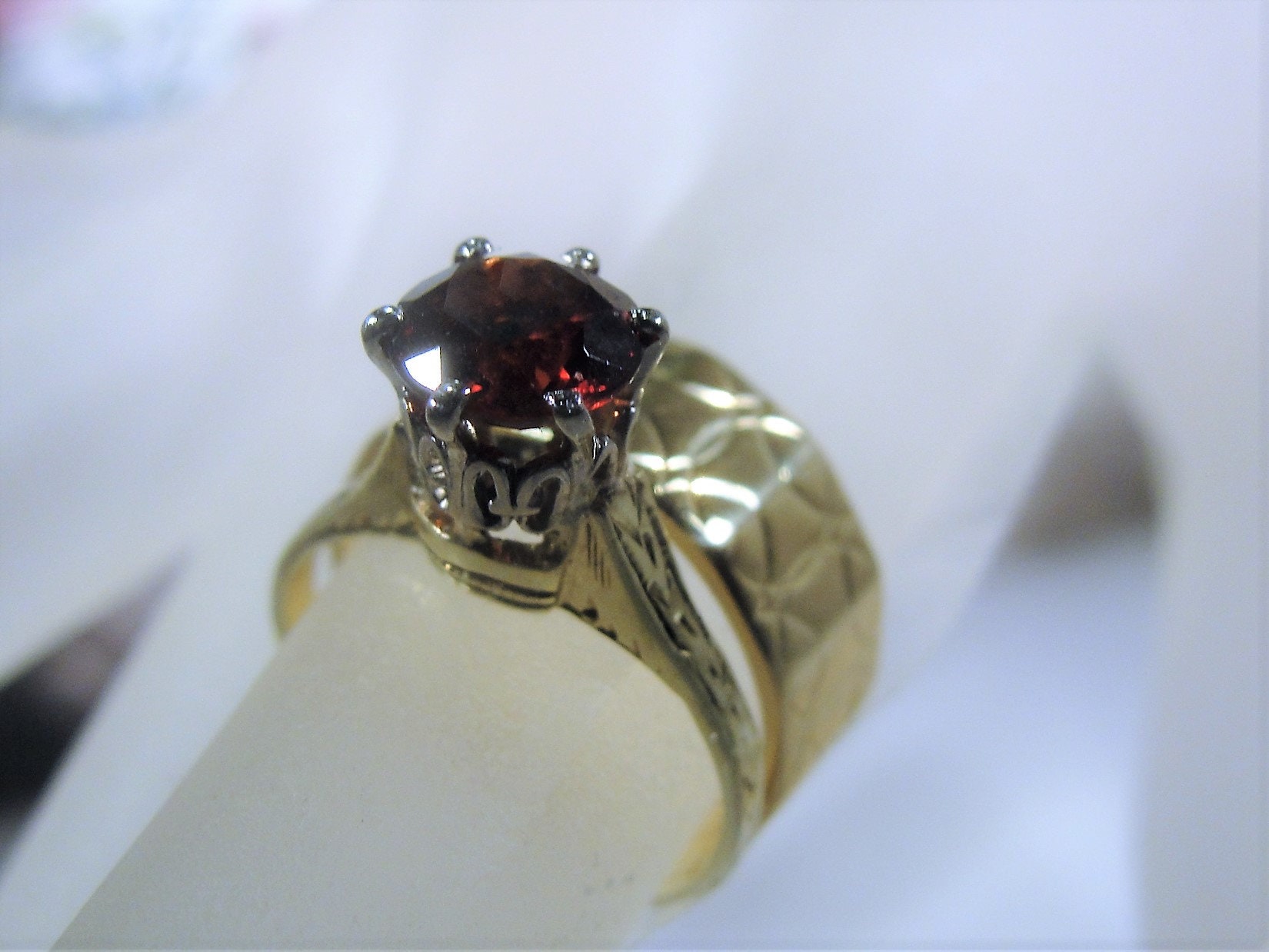 This is a beautiful Victorian Bridal Ring Set. The Engagement ring is a Garnet Solitaire Ring and the Wedding Band is a wide etched design Wedding Ring. These rings are a beautiful combination of elegance and simplicity. So very romantic and feminine.