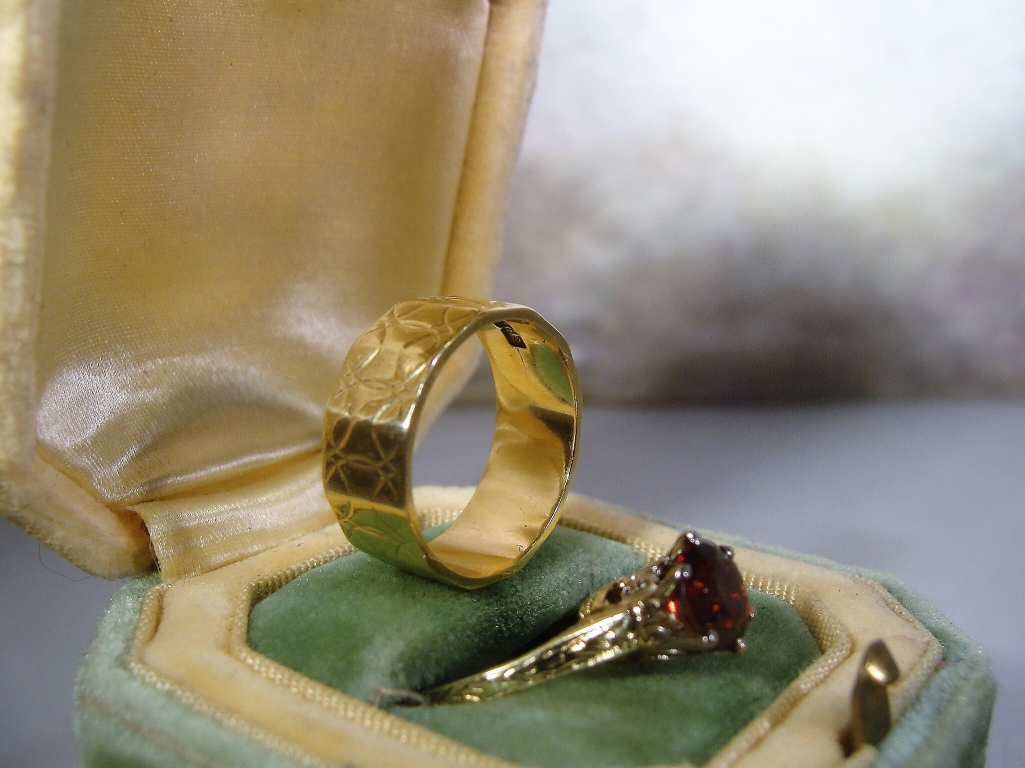 This is a gorgeous old world band that has a lovely etched design work with the band having 10 flat panels that go all the way around. This is a wide band wedding ring and it comes straight from London, England. I just love their vintage items, and this band is a great example of the late 1800s to early 1900s.