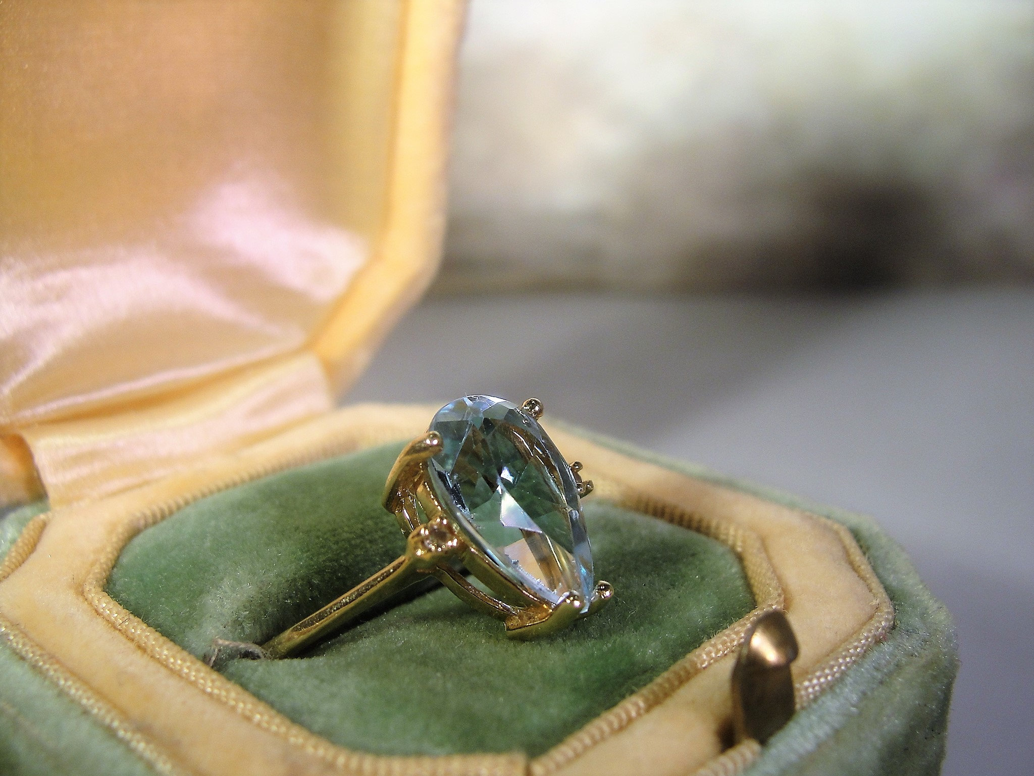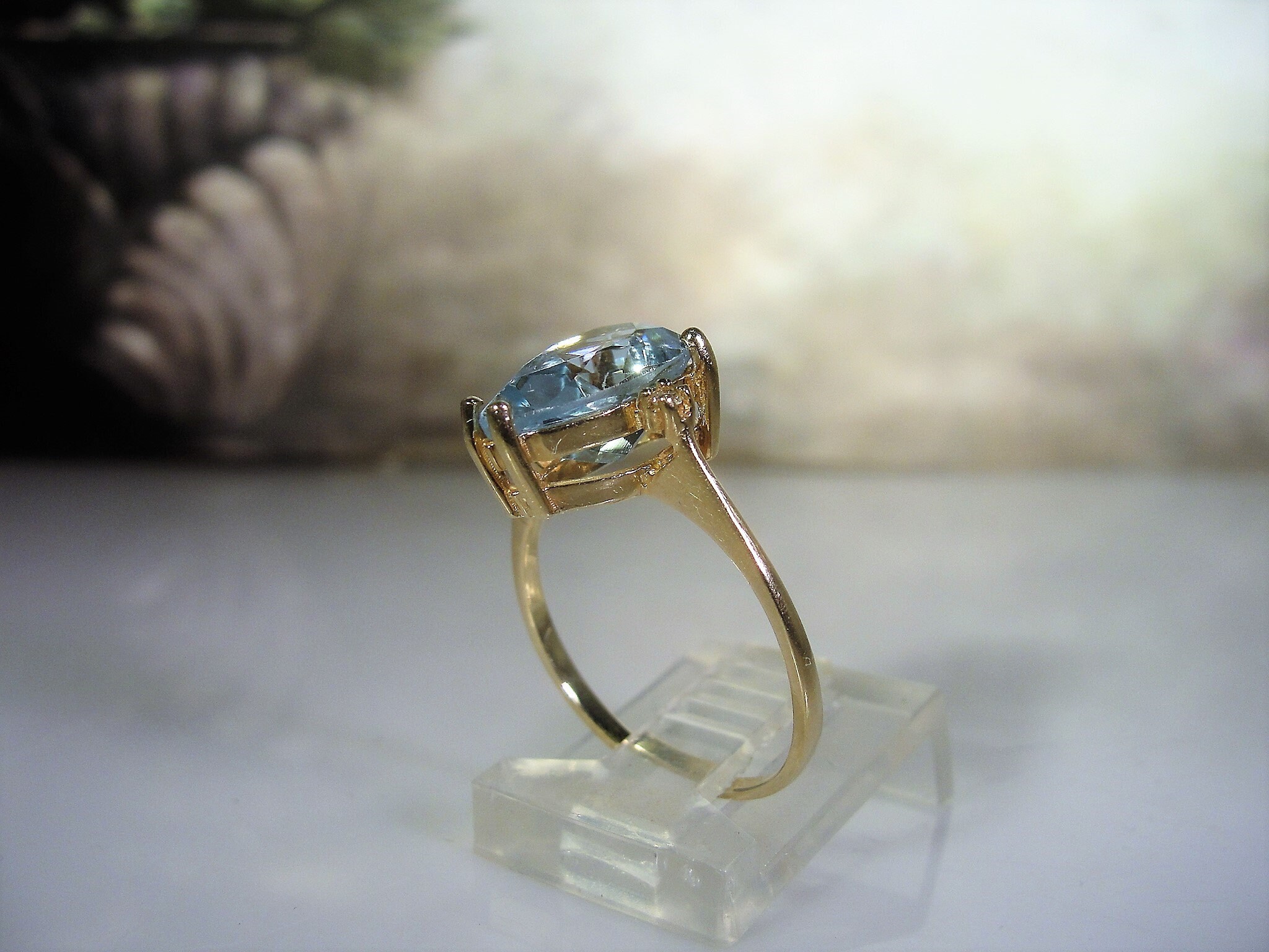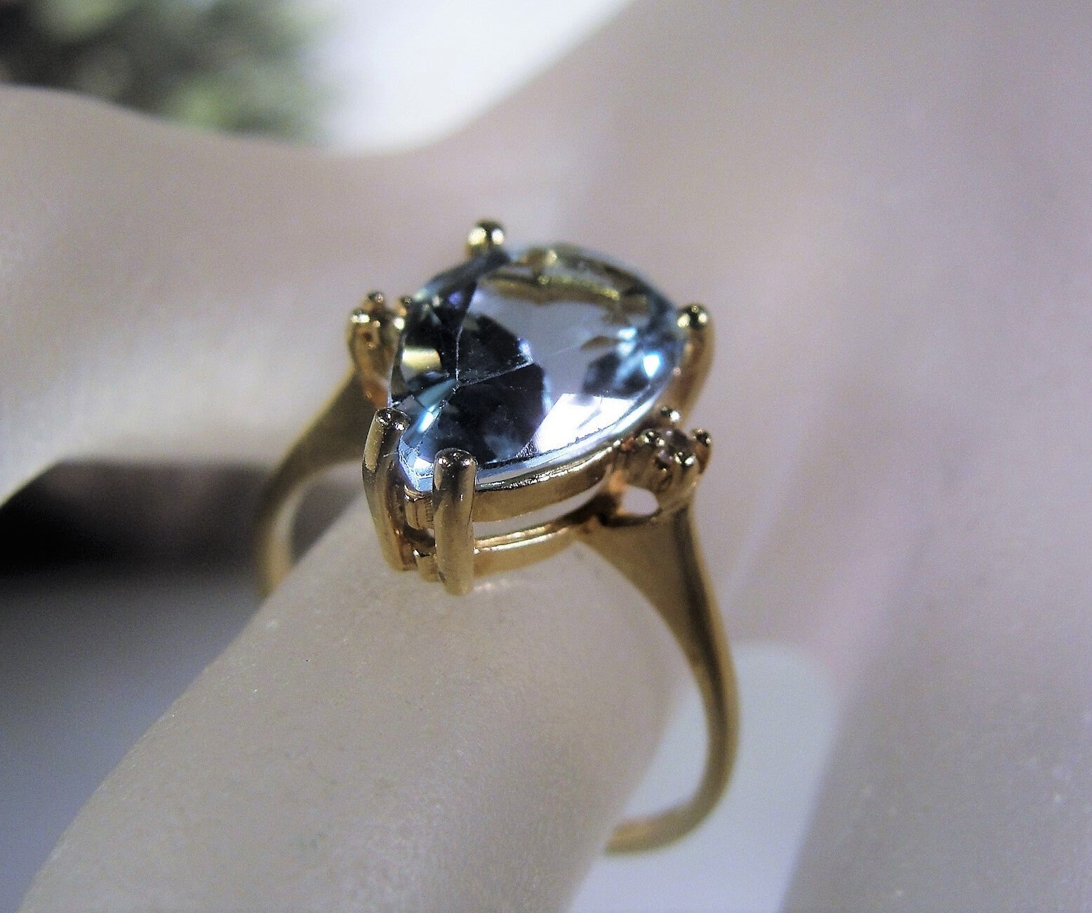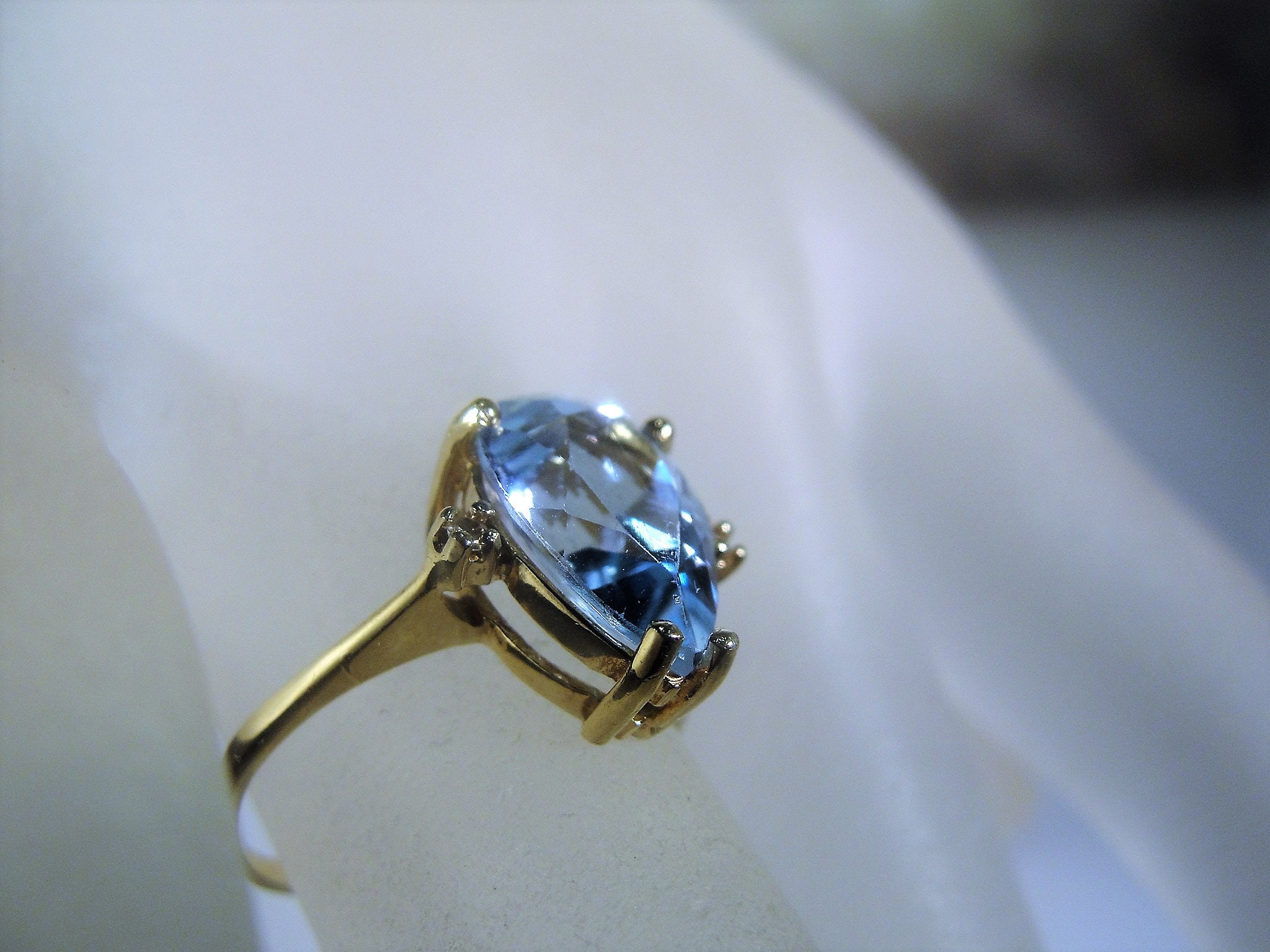 • Gem Information – This is a genuine Light Blue Topaz gem that has the coloring of an Aquamarine Ring, it is quite stunning… the measurements of the stone is 12mm by 8mm = 3 Carats; Please note: on the back side of the gem, at the lowest point, under the mounting is a very small, slight chip or flea bite. It does not appear to be noticeable when wearing, however, I feel it is important to note this… price is being reduced because of this flaw