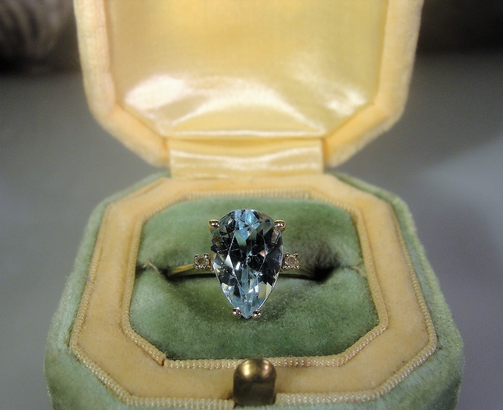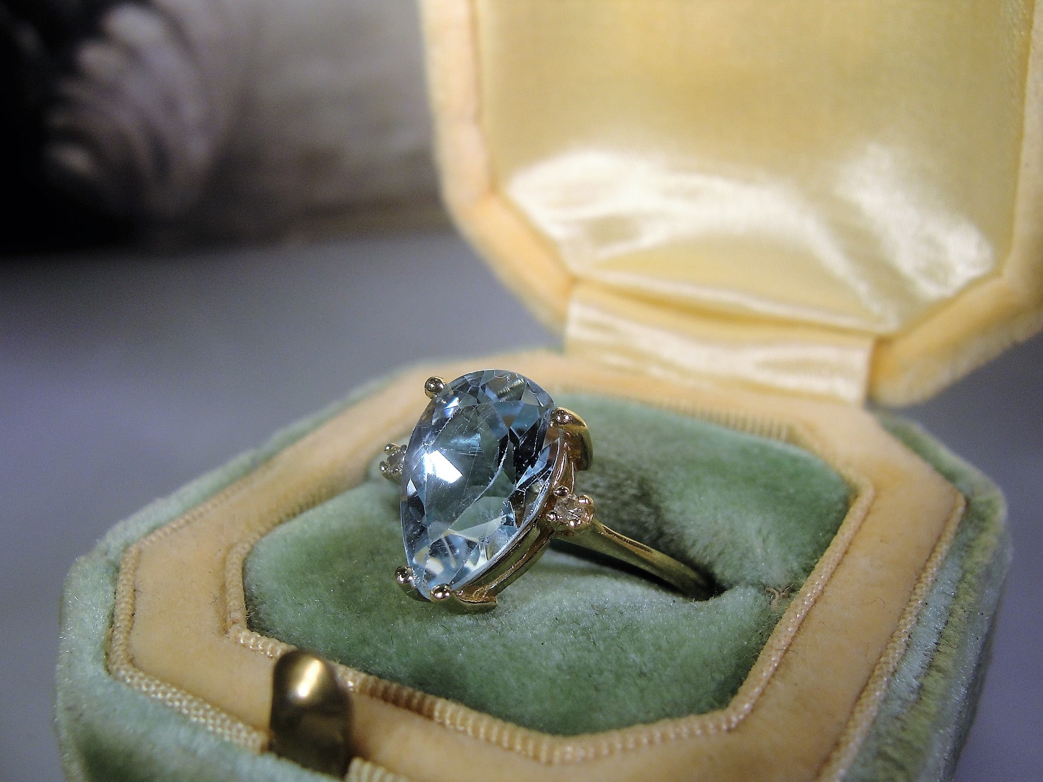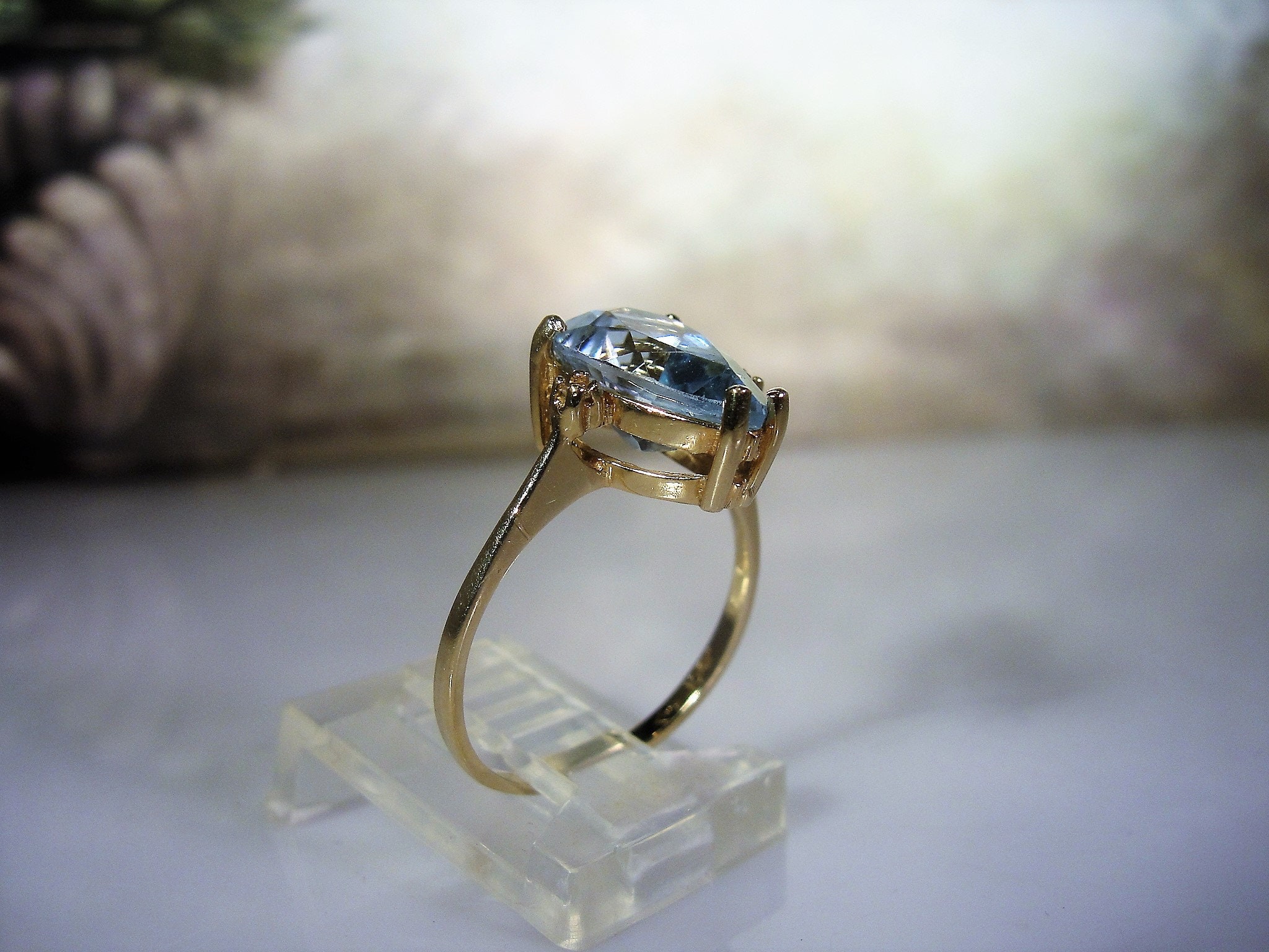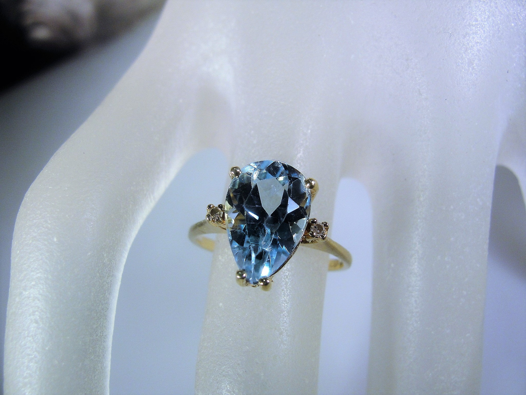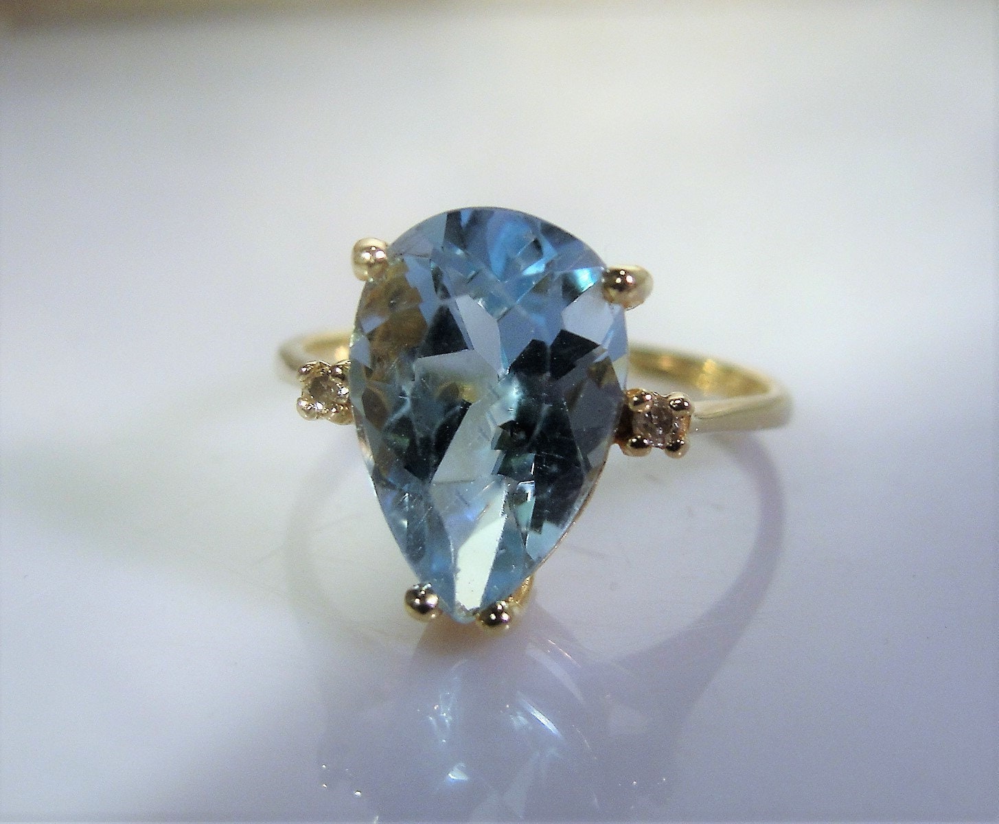 This is a gorgeous 3 Carat Light Blue Pear Shaped Topaz Ring done in 10K Yellow Gold. The color of this gem is extremely close to a rich colored Aquamarine gem. I cannot say that this topaz is a Swiss Blue Topaz because it has a lot more blue in it. It really is a beautiful Light Blue Topaz... I love the color!!