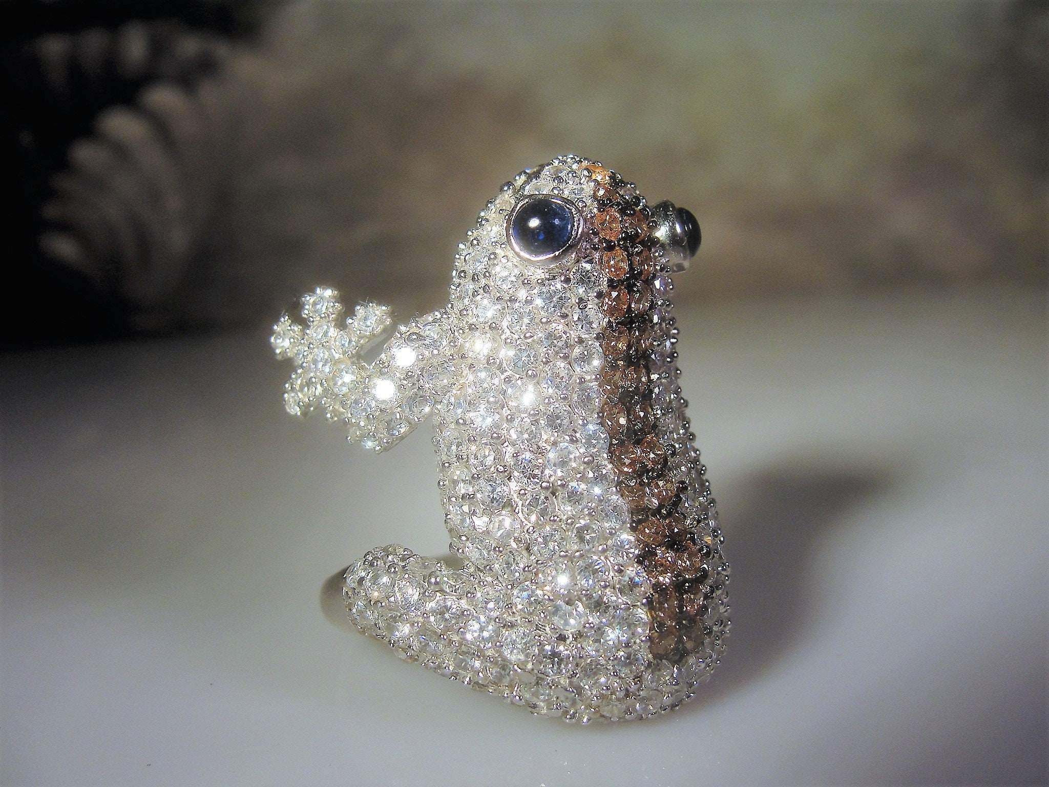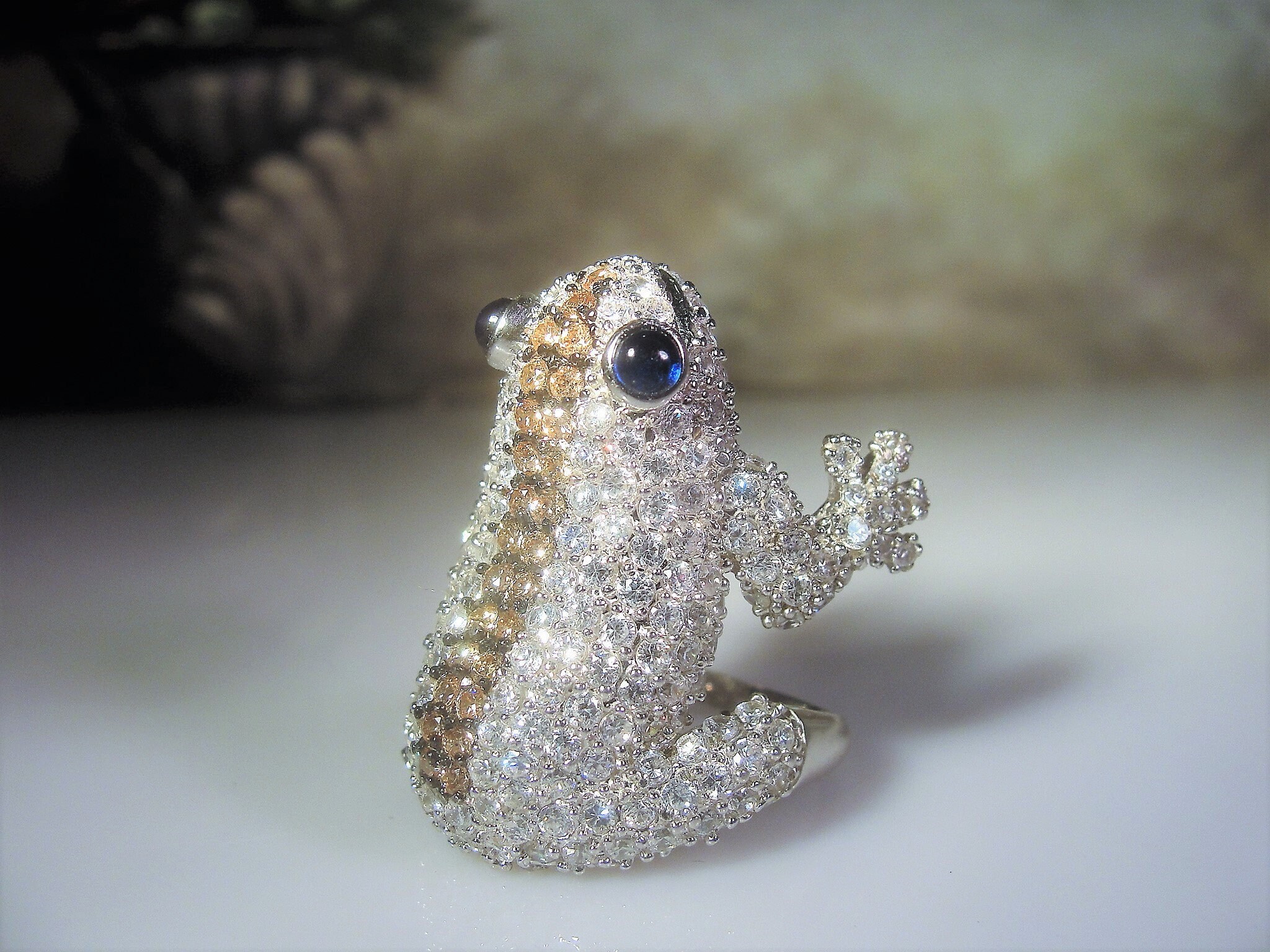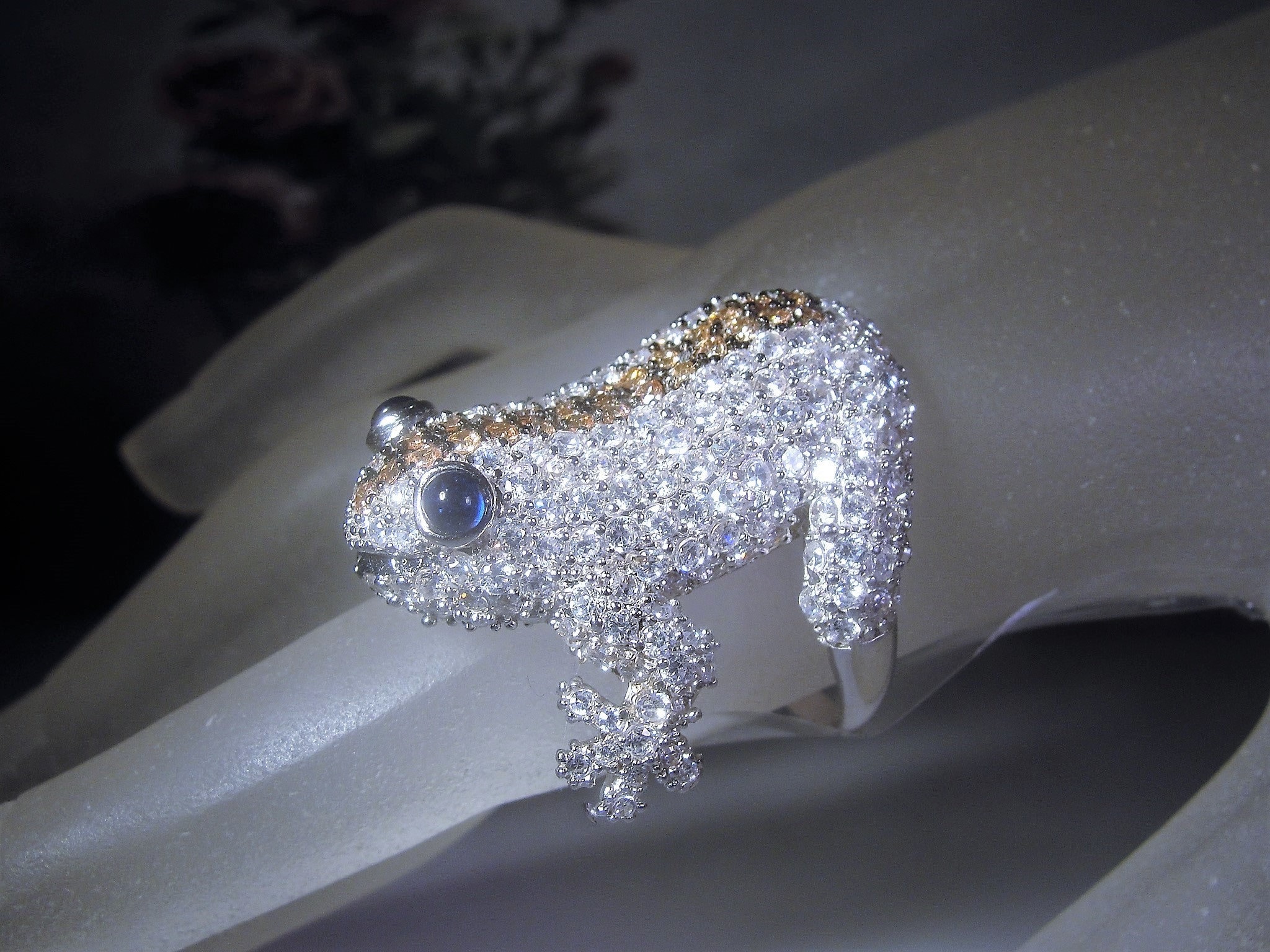 This is just the cutest frog ring ever!! This frog is done in a pave setting style with clear and gold CZ’s. The body is made up of CZ encrusted pave set gems and there is a double row of gold or champagne colored CZ gems that go down the center of the frog’s back. The frog’s eyes are a beautiful deep rich sapphire blue cabochon glass. And he has a great, cute little smile in silver on his face.