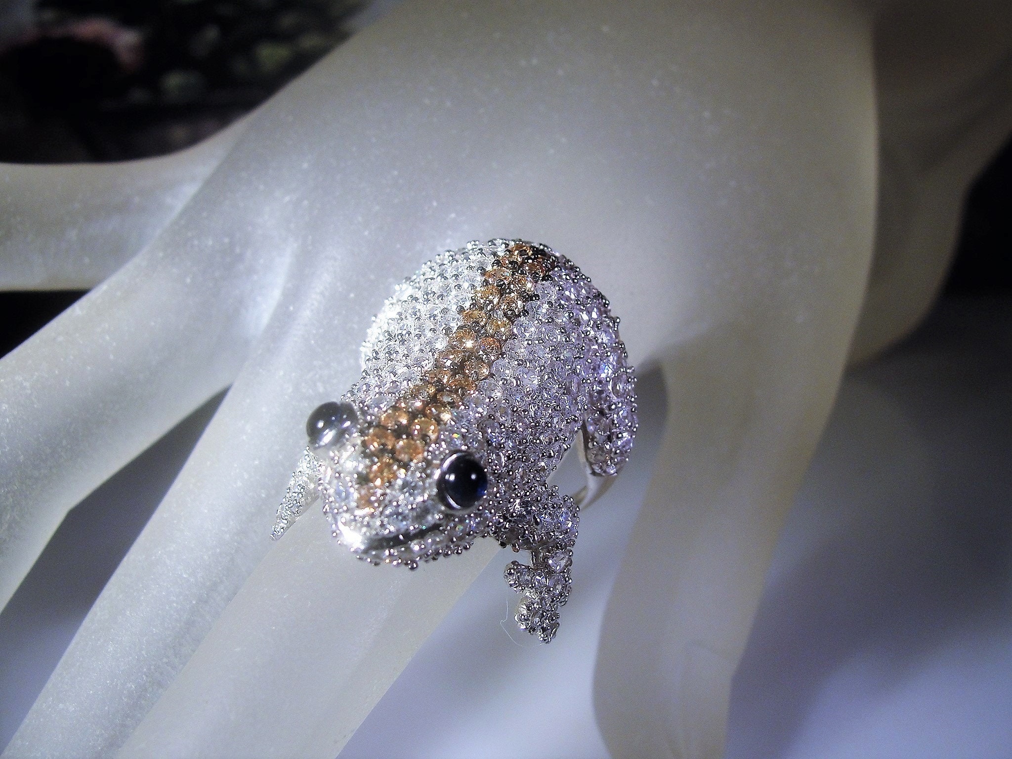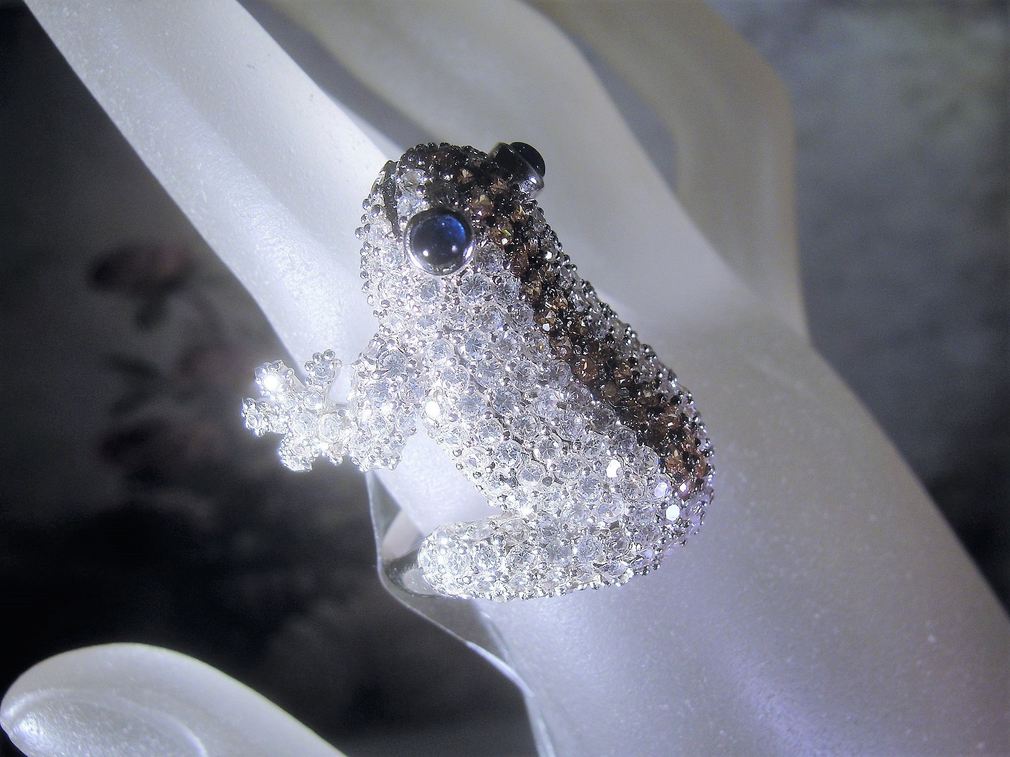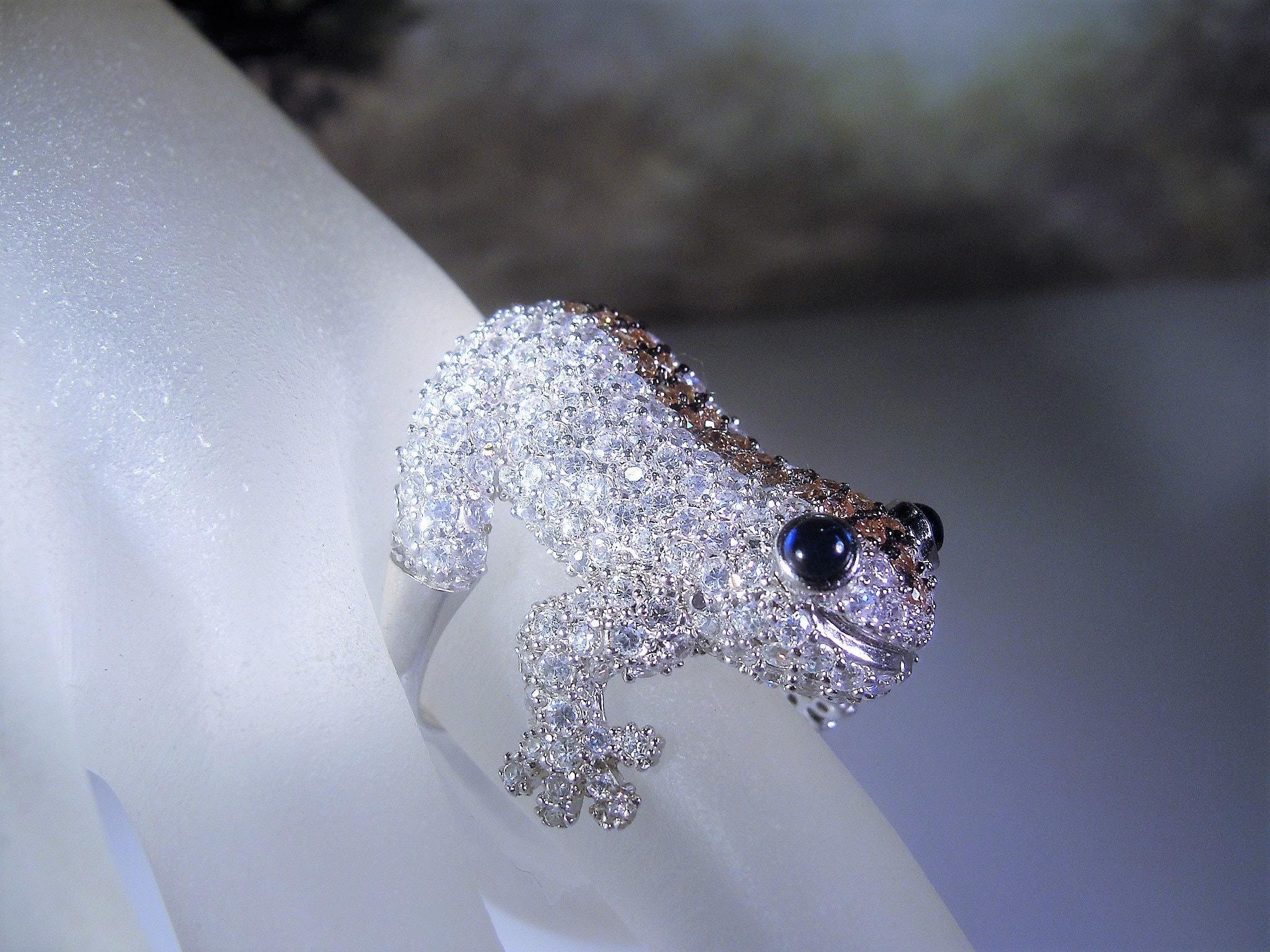 This is just the cutest frog ring ever!! This frog is done in a pave setting style with clear and gold CZ’s. The body is made up of CZ encrusted pave set gems and there is a double row of gold or champagne colored CZ gems that go down the center of the frog’s back. The frog’s eyes are a beautiful deep rich sapphire blue cabochon glass. And he has a great, cute little smile in silver on his face.