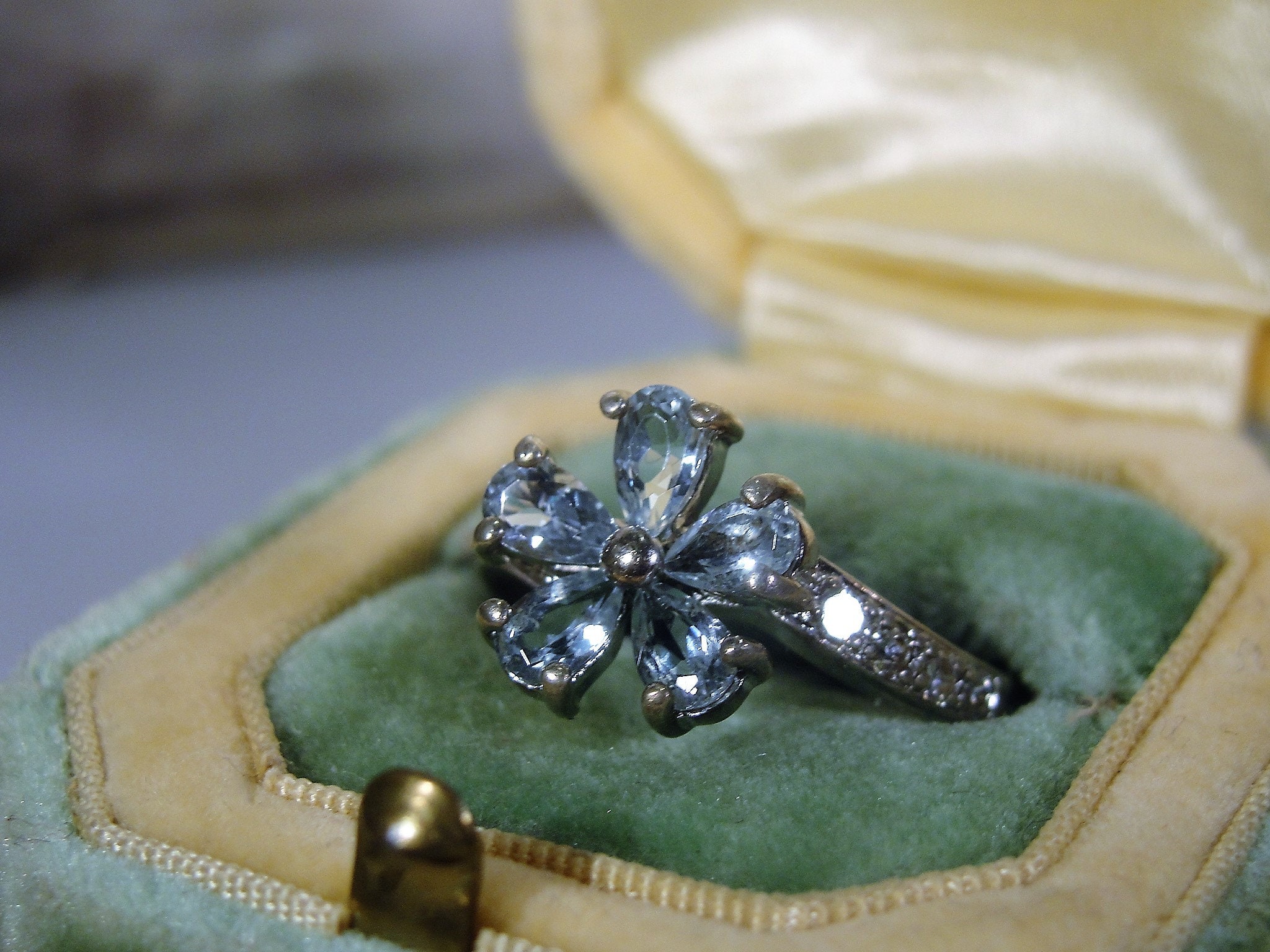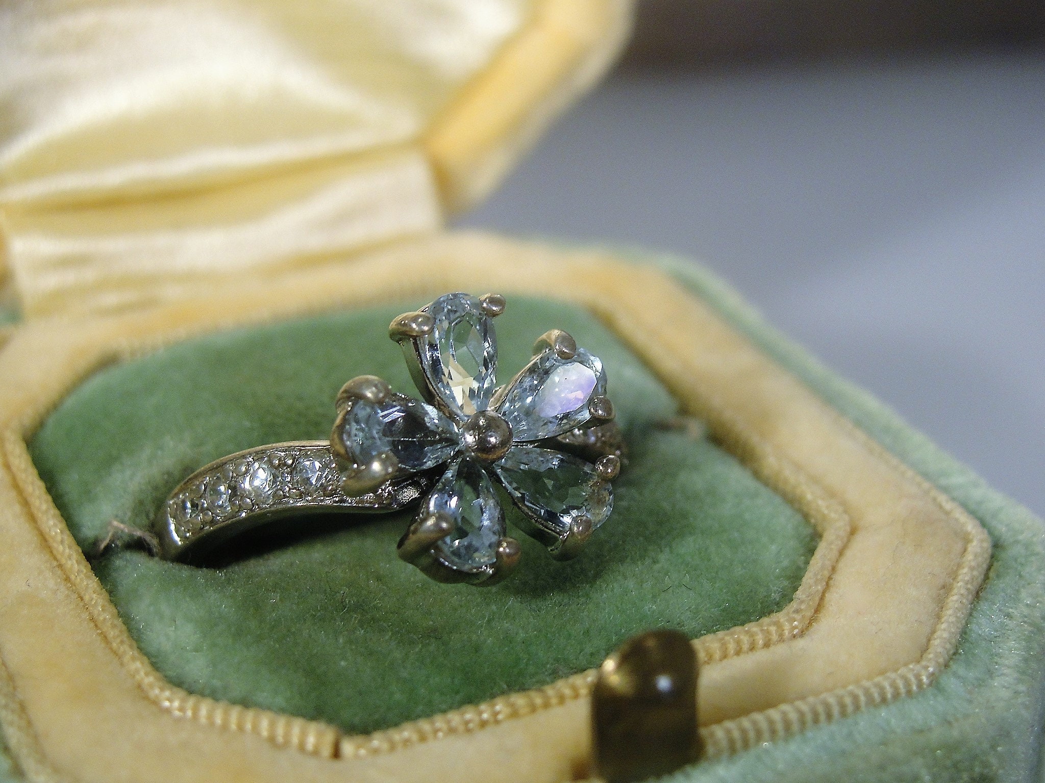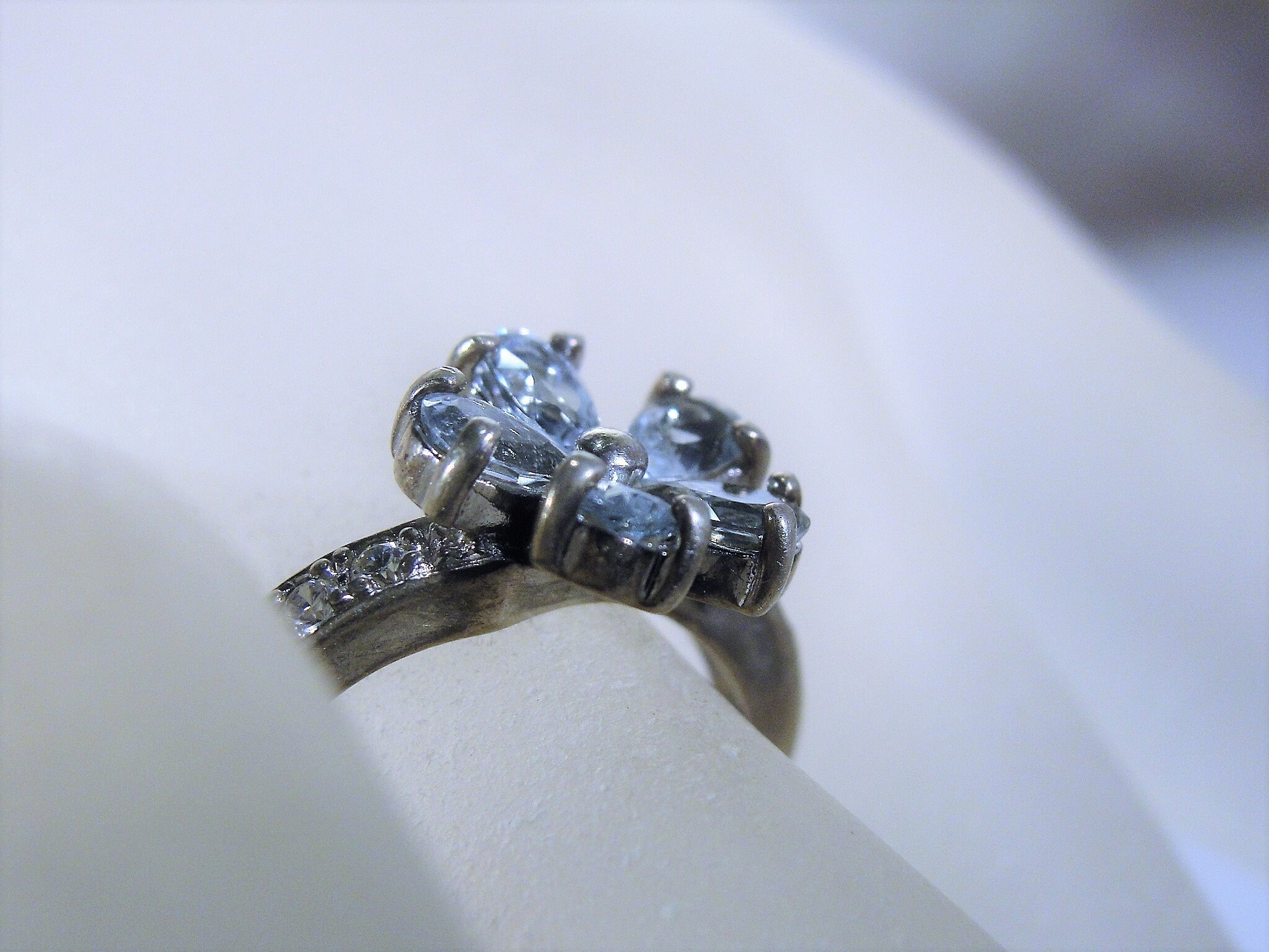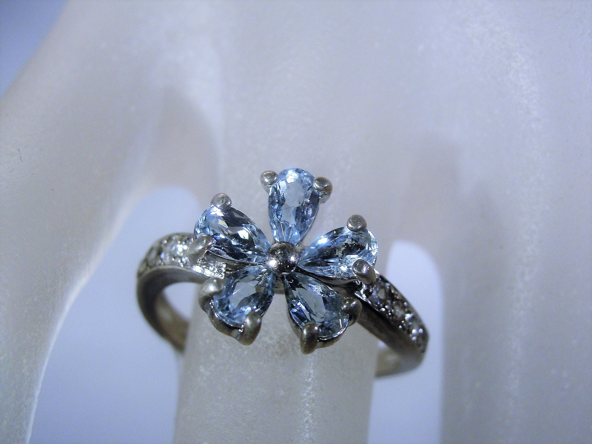• Gem Information: There are 5 genuine Pear Shaped Swiss Blue Topaz Gems prong set in a flower motif; there are 4 round CZ gems that run down each side of the band for a total of 8 CZ gems