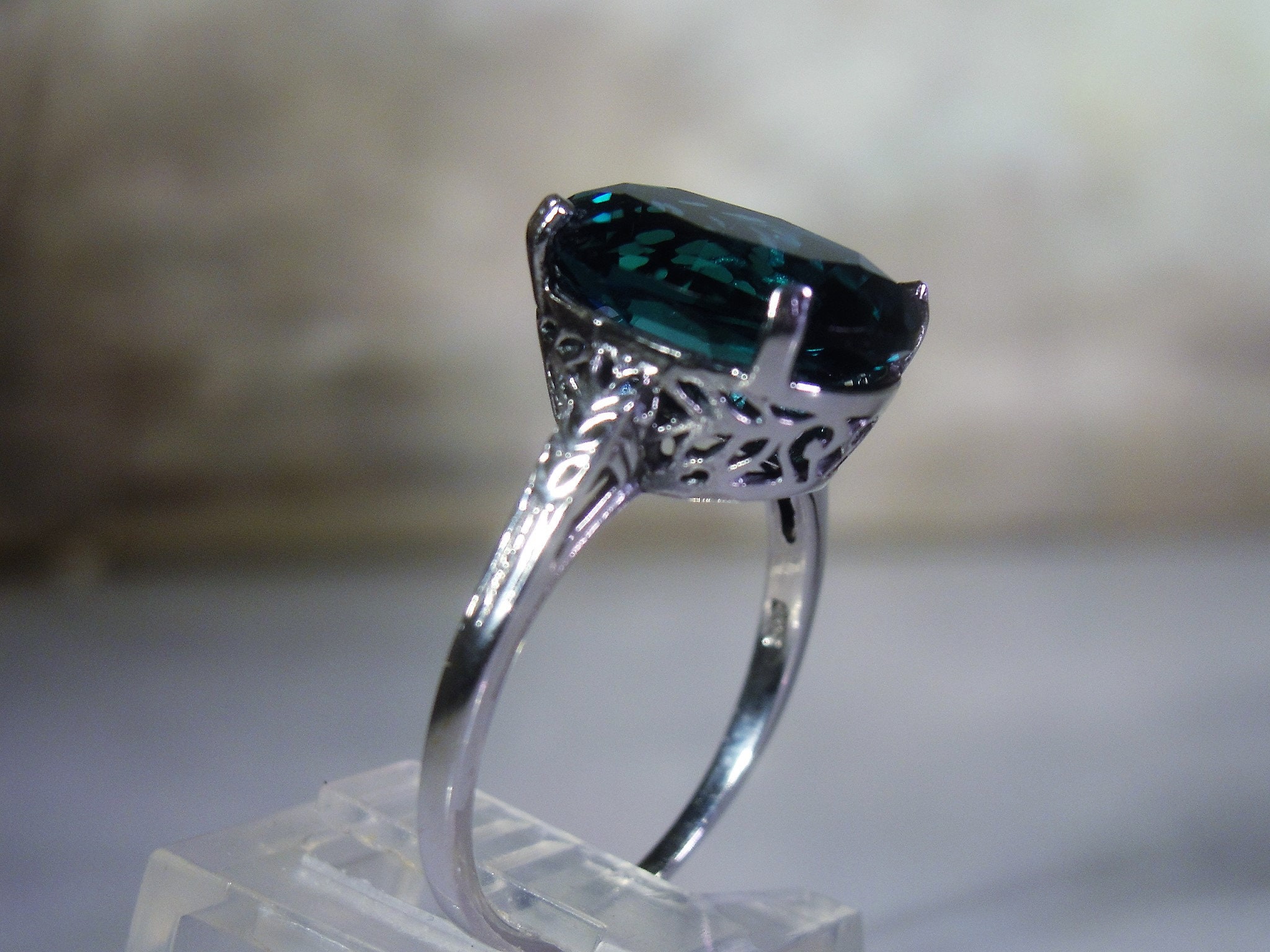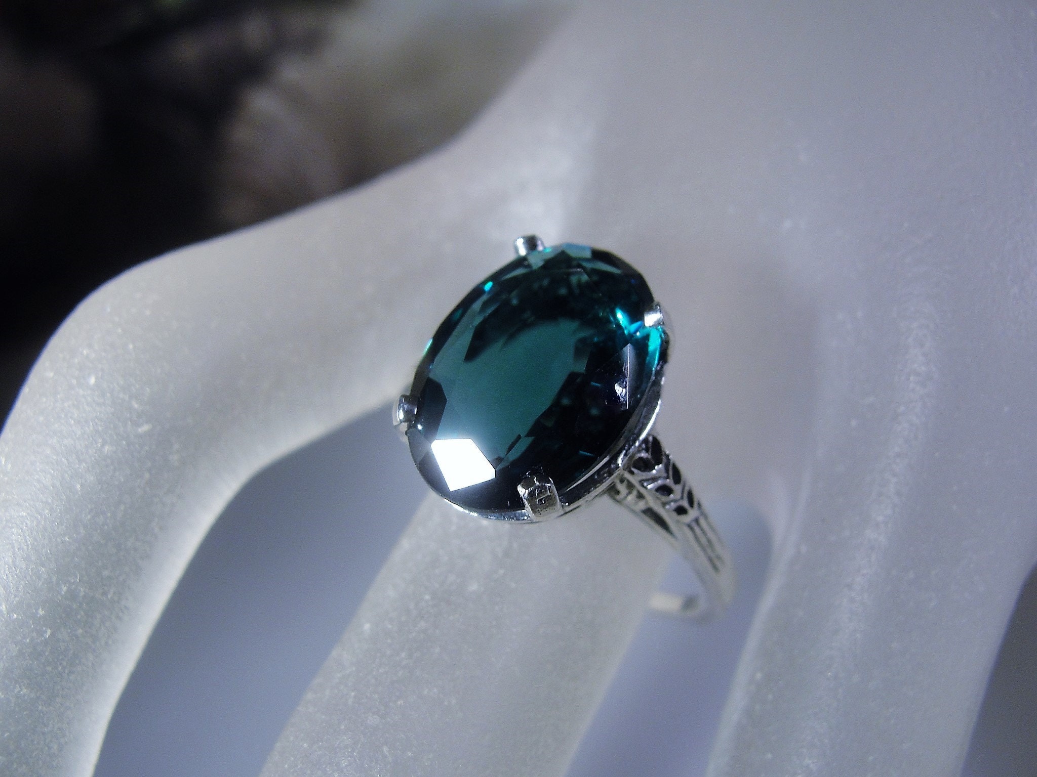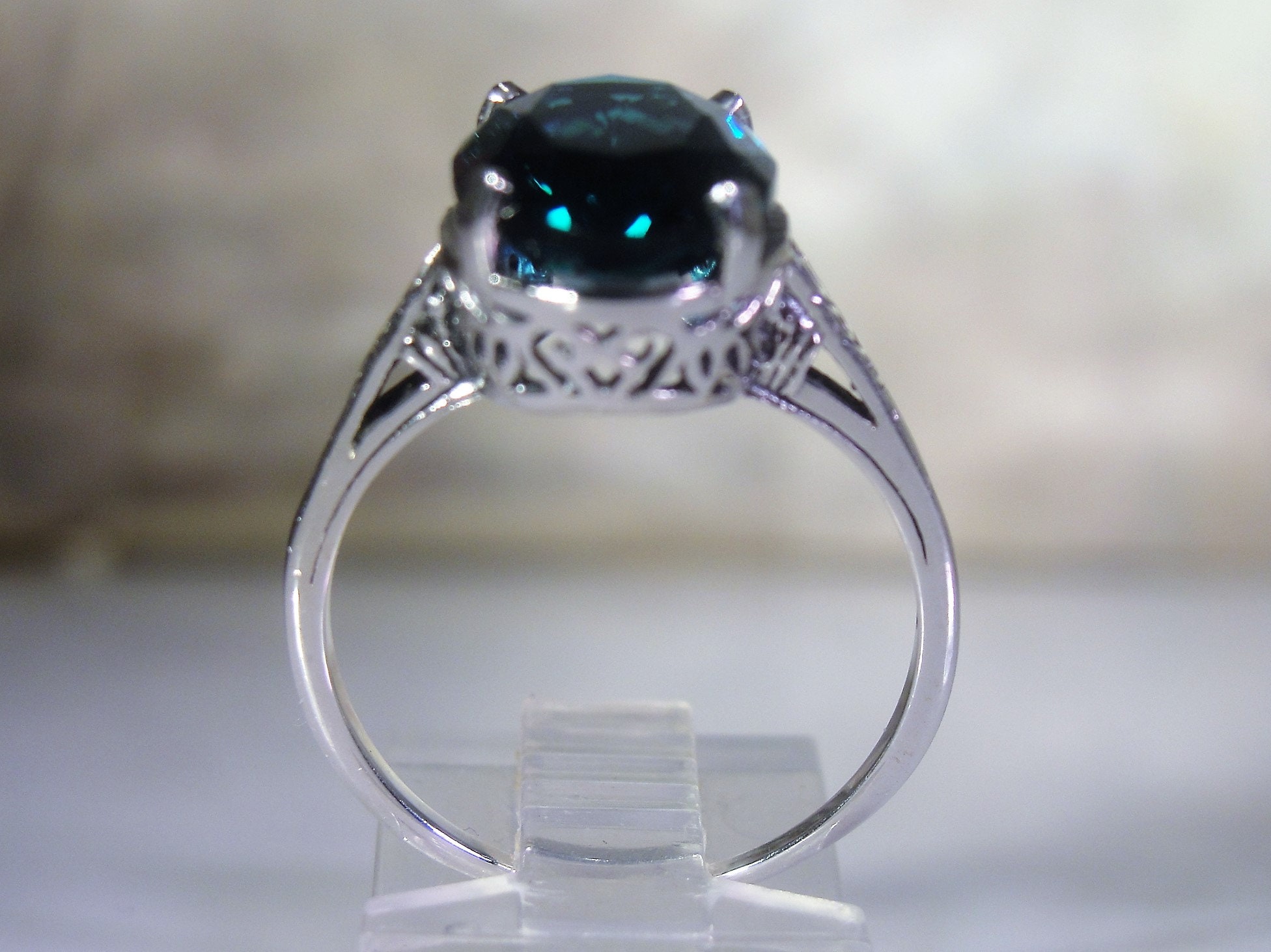 This is a stunning Synthetic London Blue Ring that is done in Sterling Silver. The design of this ring has a beautiful Art Deco Basket with etched design work going down each shoulder of the band. The band is nice and thin so it gives a very feminine presentation when worn. Just a wonderfully made ring that is certain to become your favorite Go-To ring in now time!!