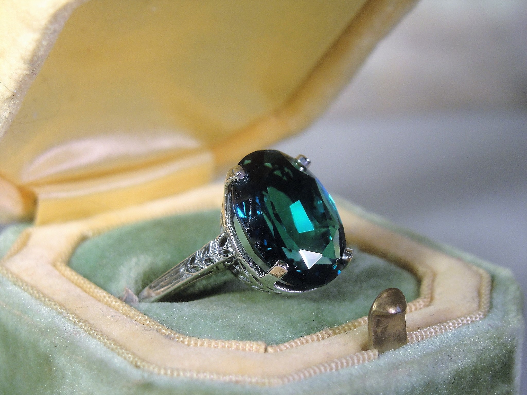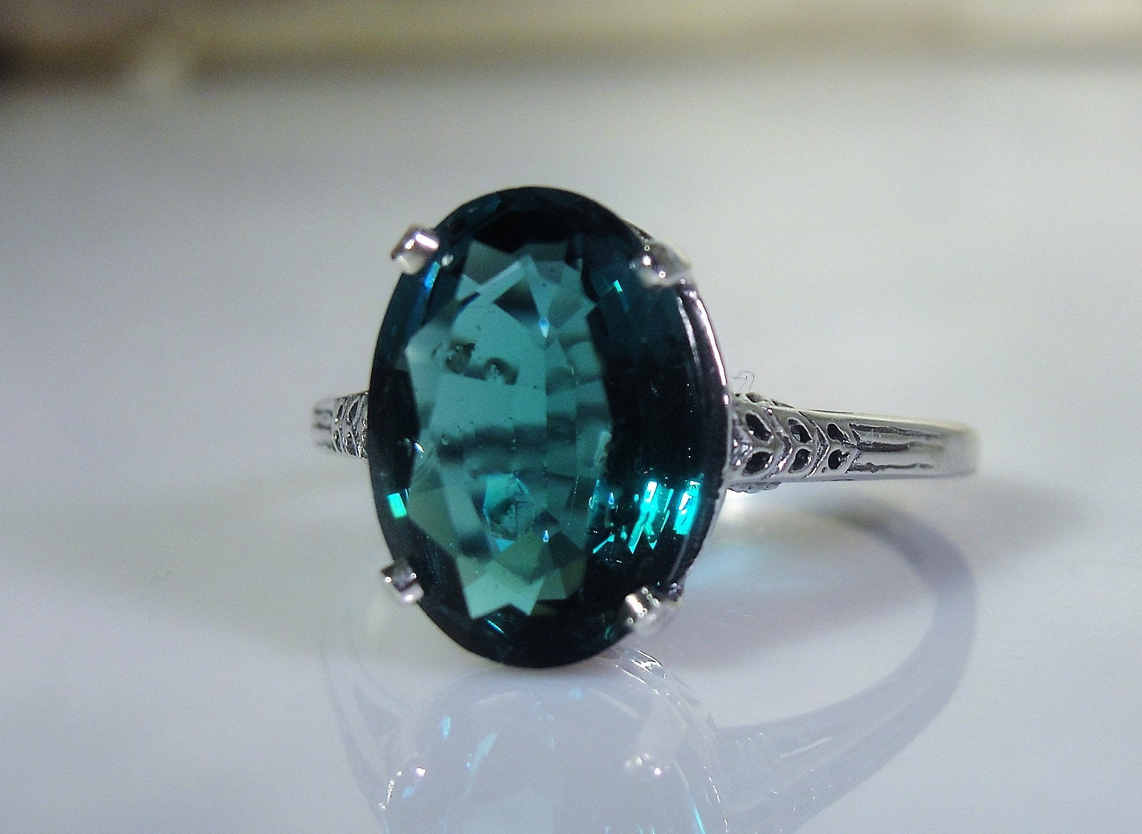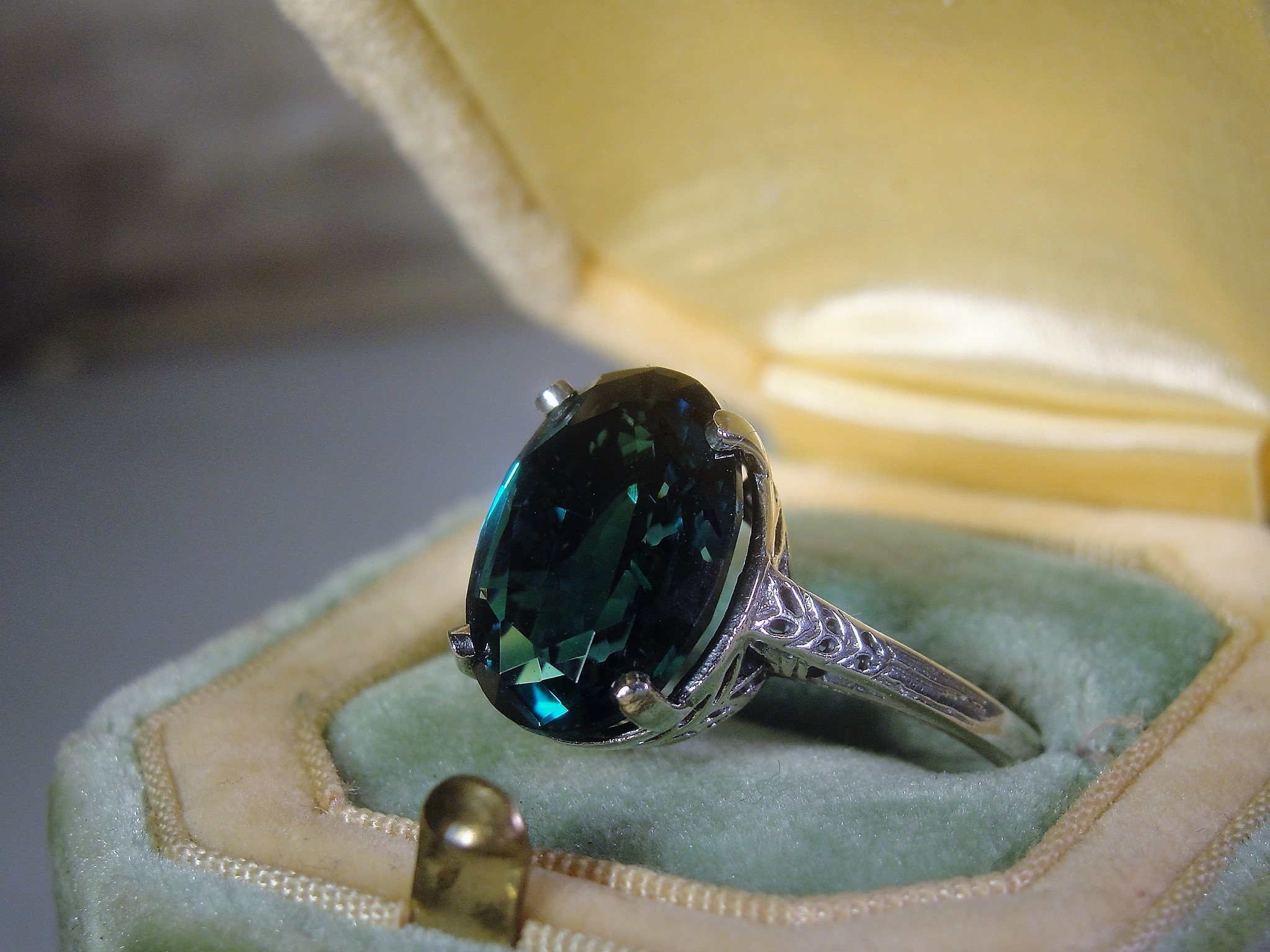 This is a stunning Synthetic London Blue Ring that is done in Sterling Silver. The design of this ring has a beautiful Art Deco Basket with etched design work going down each shoulder of the band. The band is nice and thin so it gives a very feminine presentation when worn. Just a wonderfully made ring that is certain to become your favorite Go-To ring in now time!!