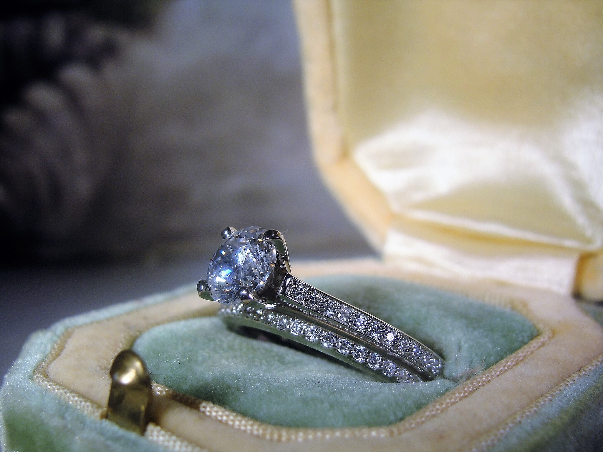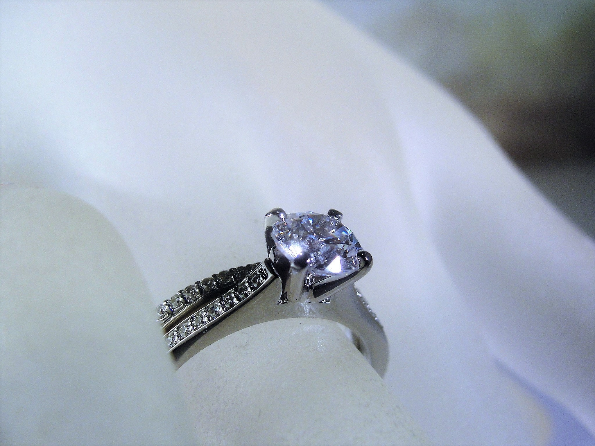 The Engagement Ring has a one carat center gem that has nice cathedral mounting where the one carat gem stands alone in the setting. From the center of the mounting and down each side of the band is a row of small round gems that are all pave set. This ring is very striking and beautiful. This ring is very elegant and classy looking!